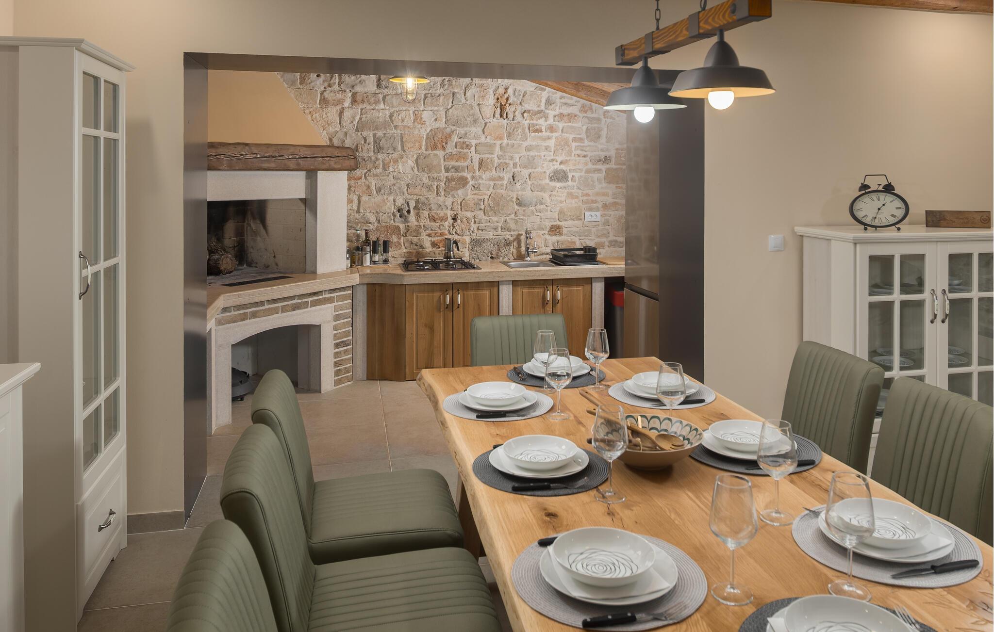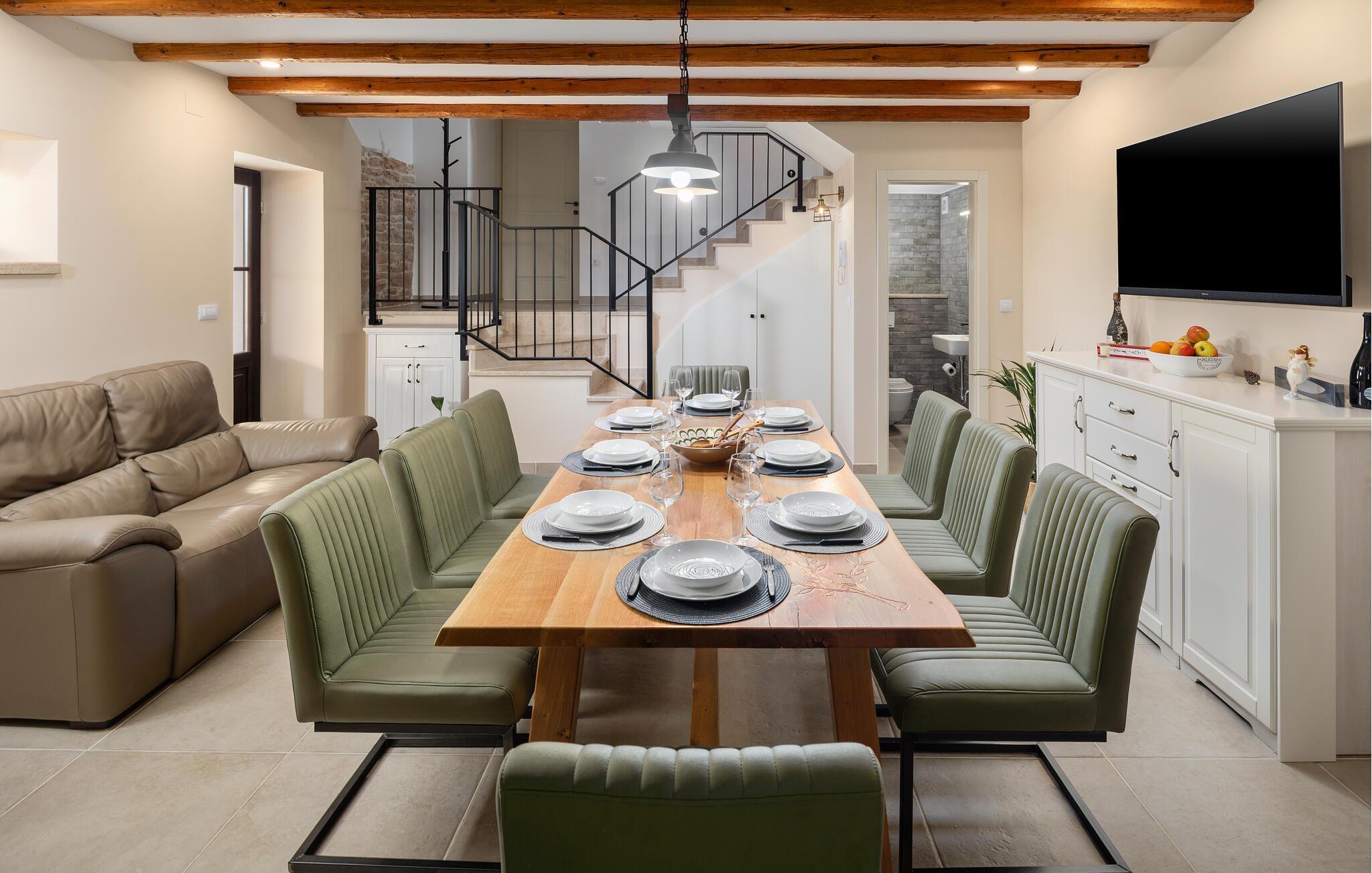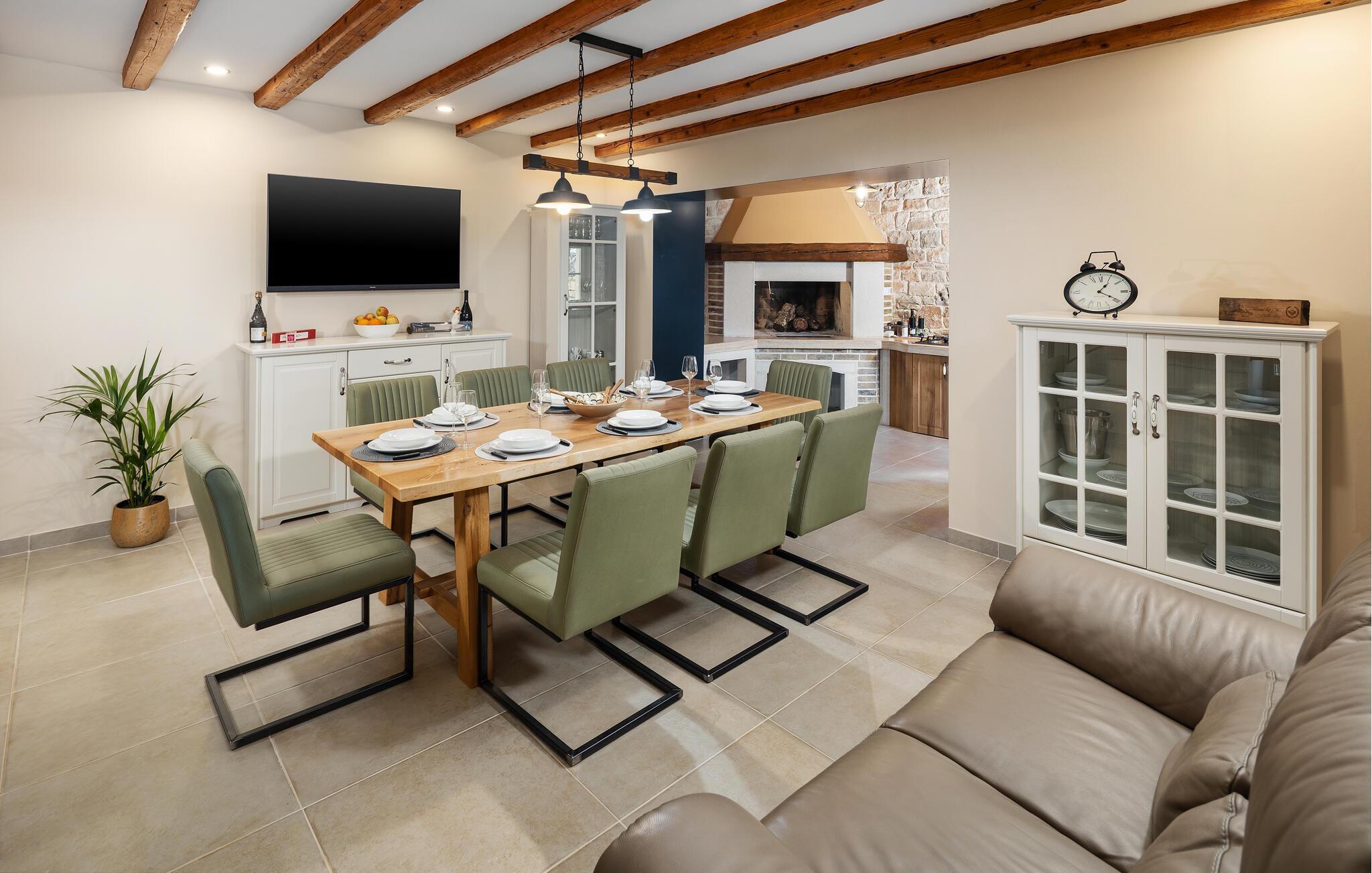 Dette store feriehuset imponerer med sin rustikke stil med murvegger og et sjarmerende kjøkken med åpen grillovn. De komfortable møblene sørger for at du og familien din vil føle dere som hjemme her. På utsiden inviterer to overbygde terrasser til å nyte tiden i skyggen, mens det private bassenget sørger for forfriskninger. Enten det er felles grillmat, avslappende timer på terrassen eller en dukkert i det kjølige vannet, kan du slappe av her.