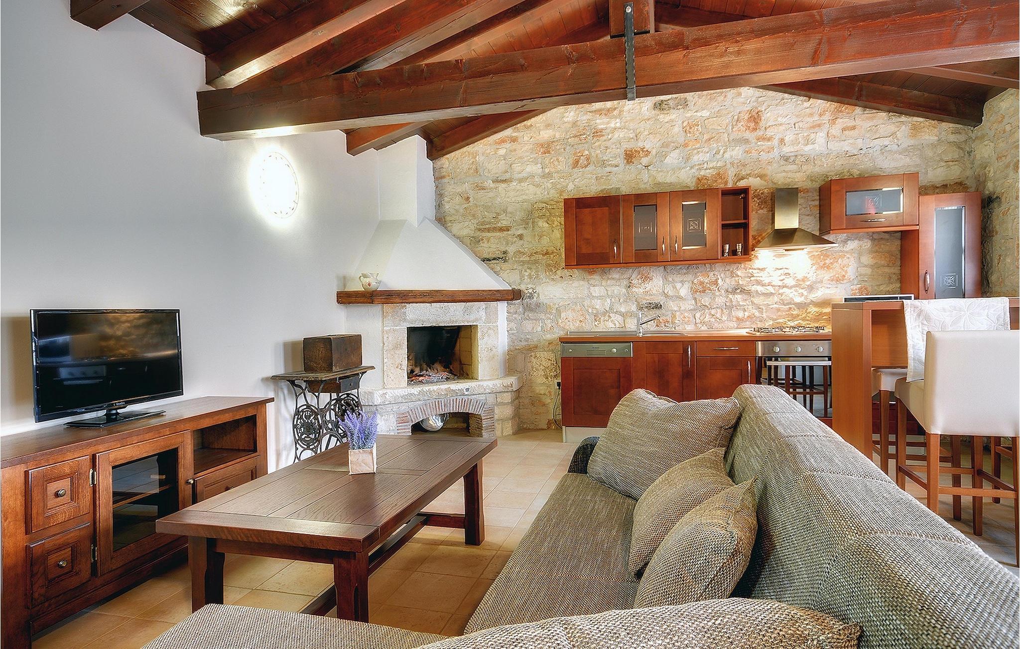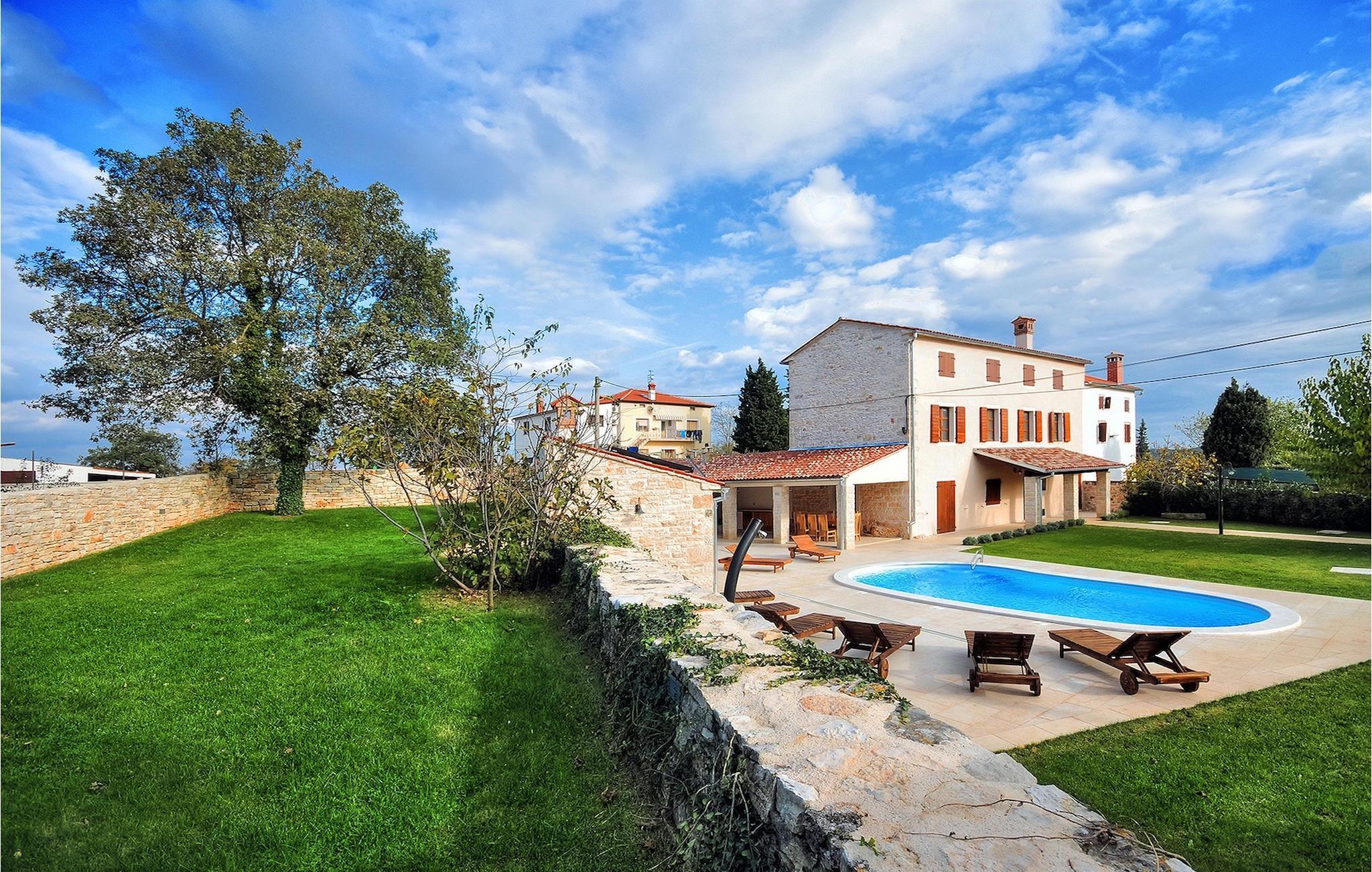 Denne vakre, nyrenoverte eiendommen ligger i en rolig landsby på Istria, bare en kort kjøretur fra kysten av Rovinj. Eiendommen er nennsomt renovert og tilbyr alle fordelene ved et moderne liv: 6 bad med eget bad, klimaanlegg og trådløst internett. Hagen er helt inngjerdet og tilbyr privatliv rundt bassenget. Utenfor er det også en stor overbygd spise- og stueplass med utekjøkken. Grillen i naturstein har også en brødovn og pizzaovn. Eiendommen består av to bygninger i samme hage. I den ene er det et soverom med dobbeltseng, bad, kjøkken og stue - ideelt hvis et par trenger mer privatliv. Den store bygningen har 4 soverom, kjøkken og en stor stue med peis. Alle rommene har eget bad og klimaanlegg. Hagen har et vanningssystem slik at gresset alltid er fint og grønt. Stranden i Limfjorden ligger bare en kort kjøretur unna (5 km), og en god restaurant ligger i umiddelbar nærhet.
