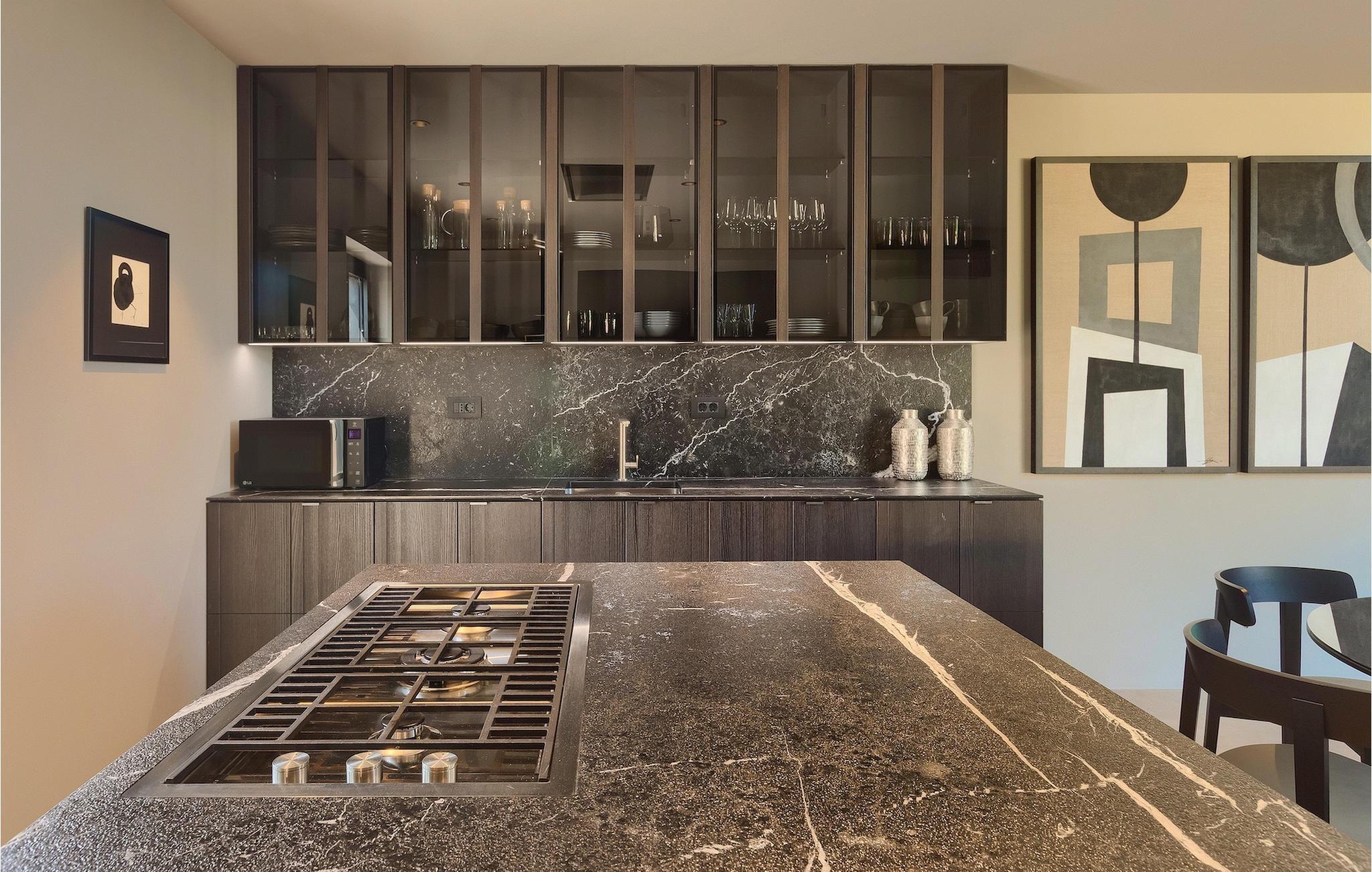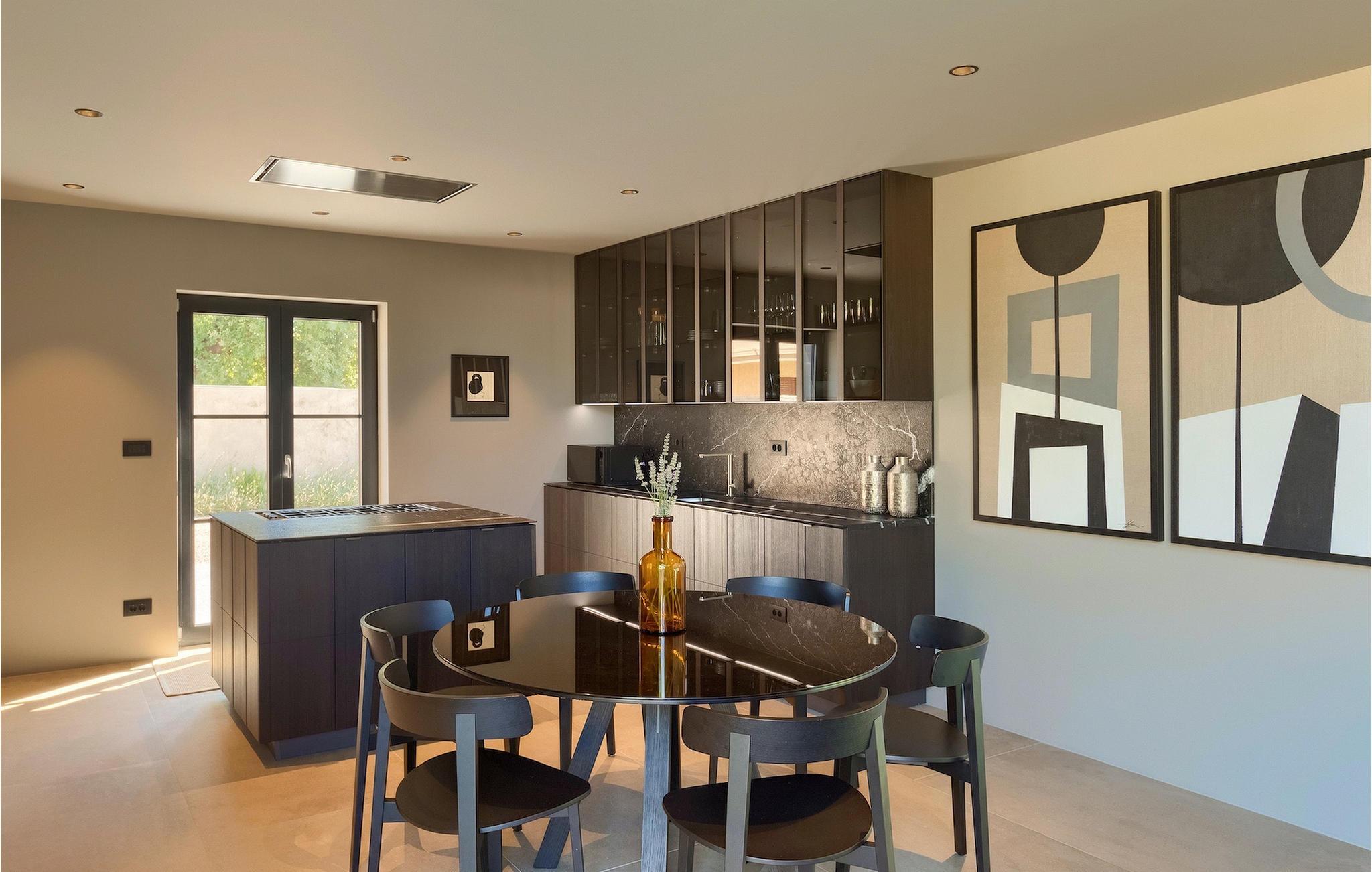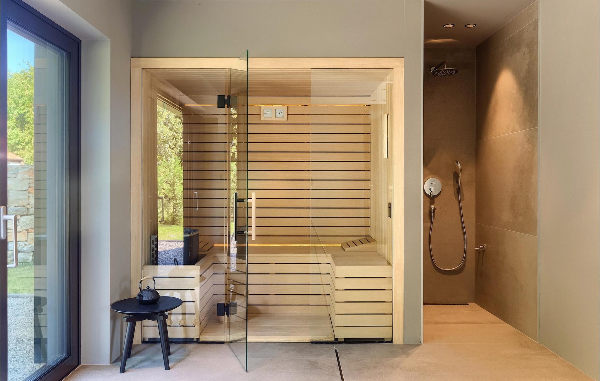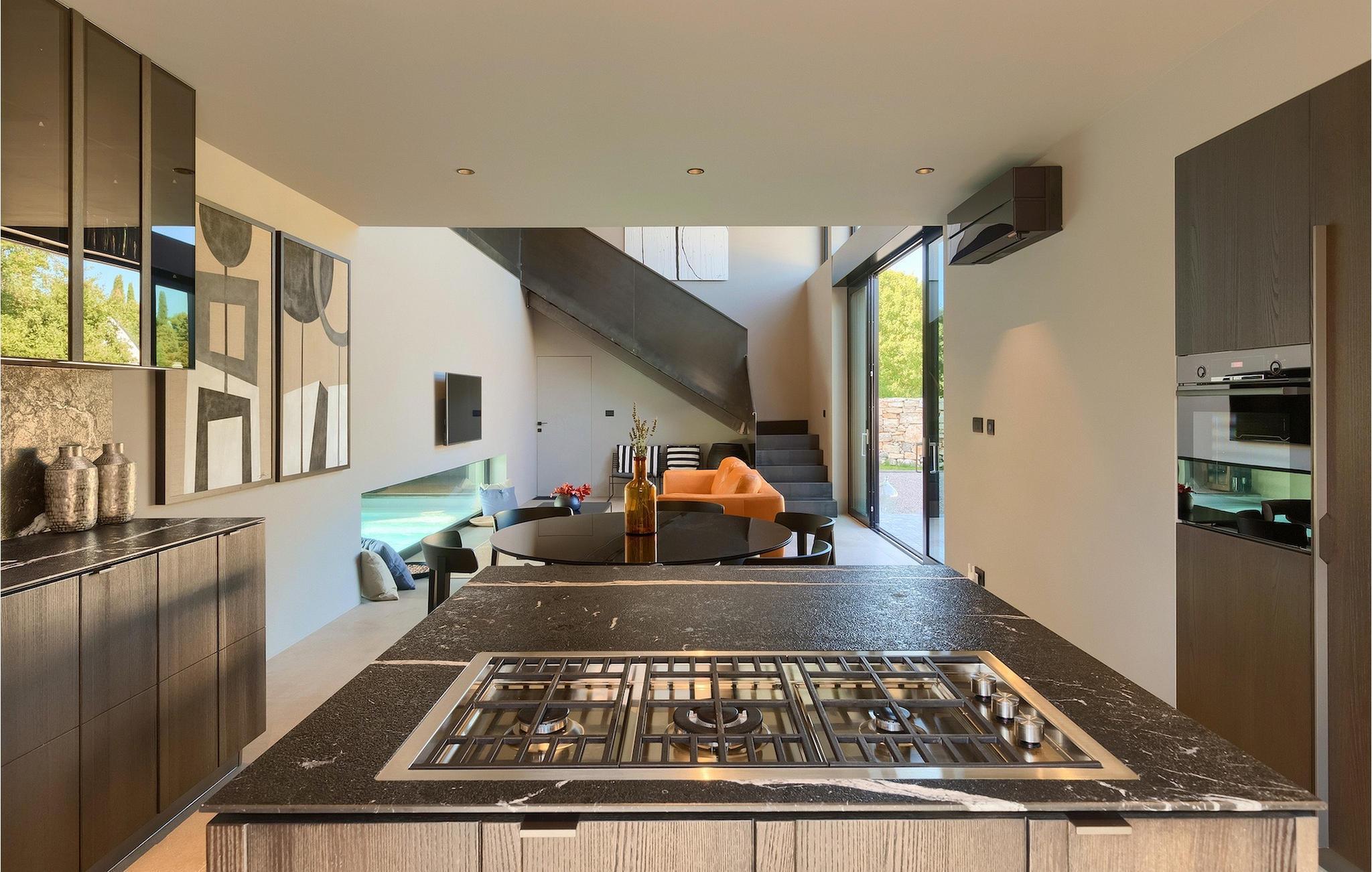 Tar du trappen ned til første etasje, kommer du til stue- og spisestuen og det fullt utstyrte kjøkkenet. Hvis du foretrekker å spise utendørs, er det en gassgrill og et utekjøkken med spisebord for 6 personer bare noen få skritt fra stuen. Et attraktivt trekk ved villaen er glassflaten som skiller stuen og bassenget. Det innbydende bassenget er lett tilgjengelig både fra hagen og fra innsiden via velværeavdelingen, der det finnes en badstue.