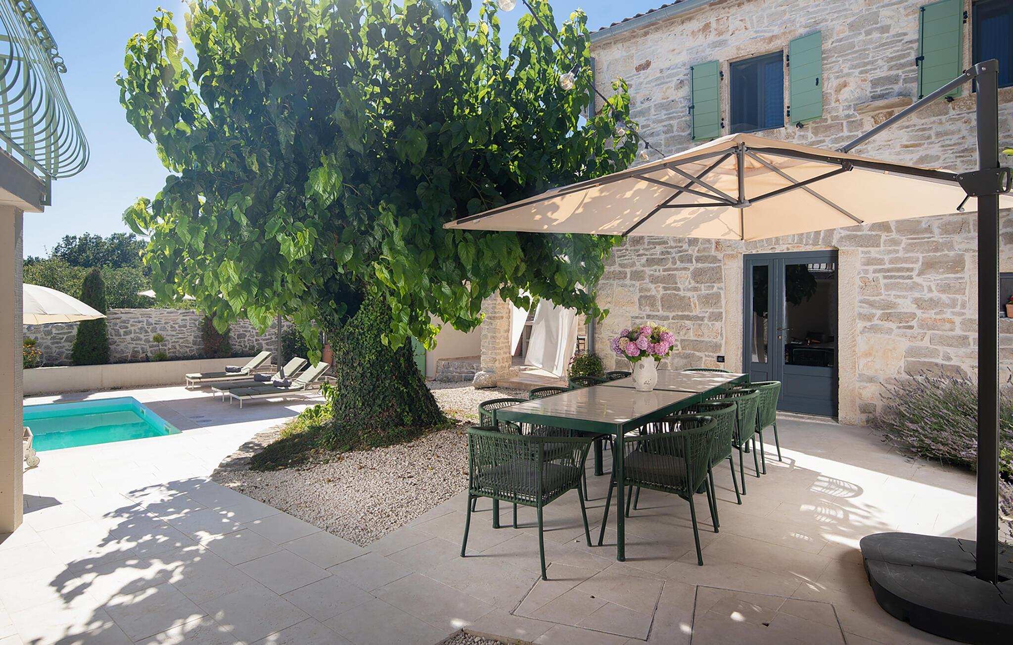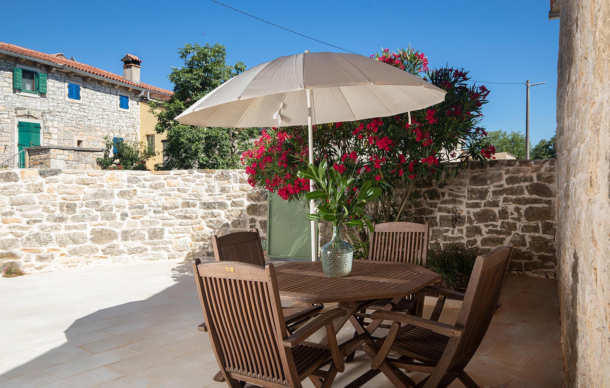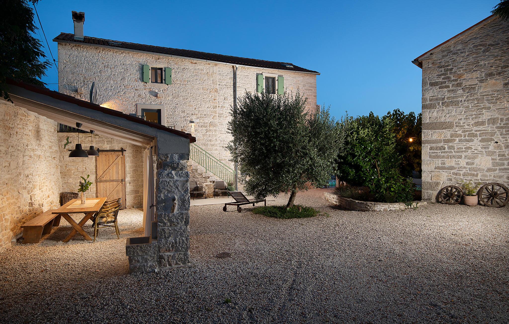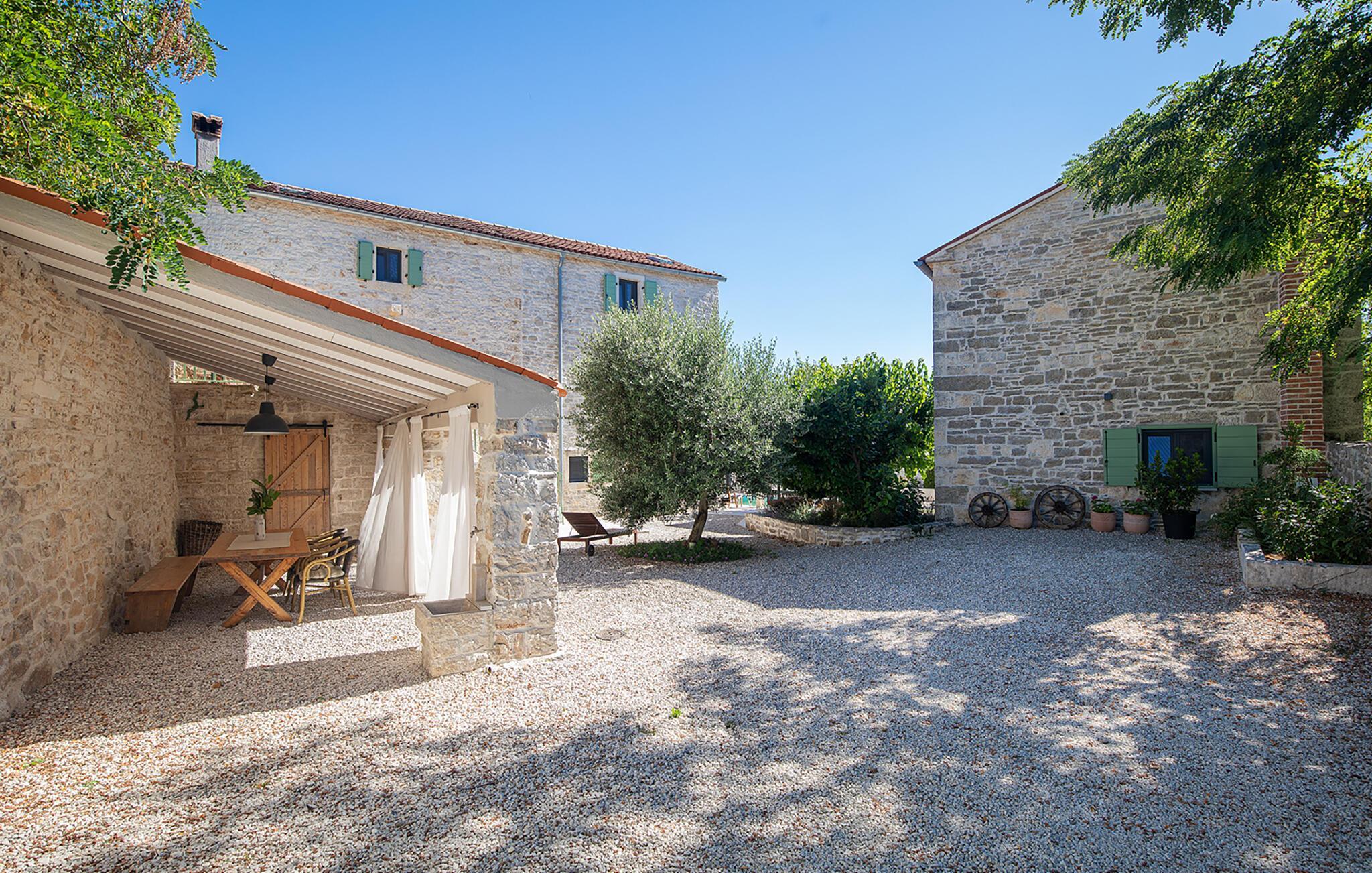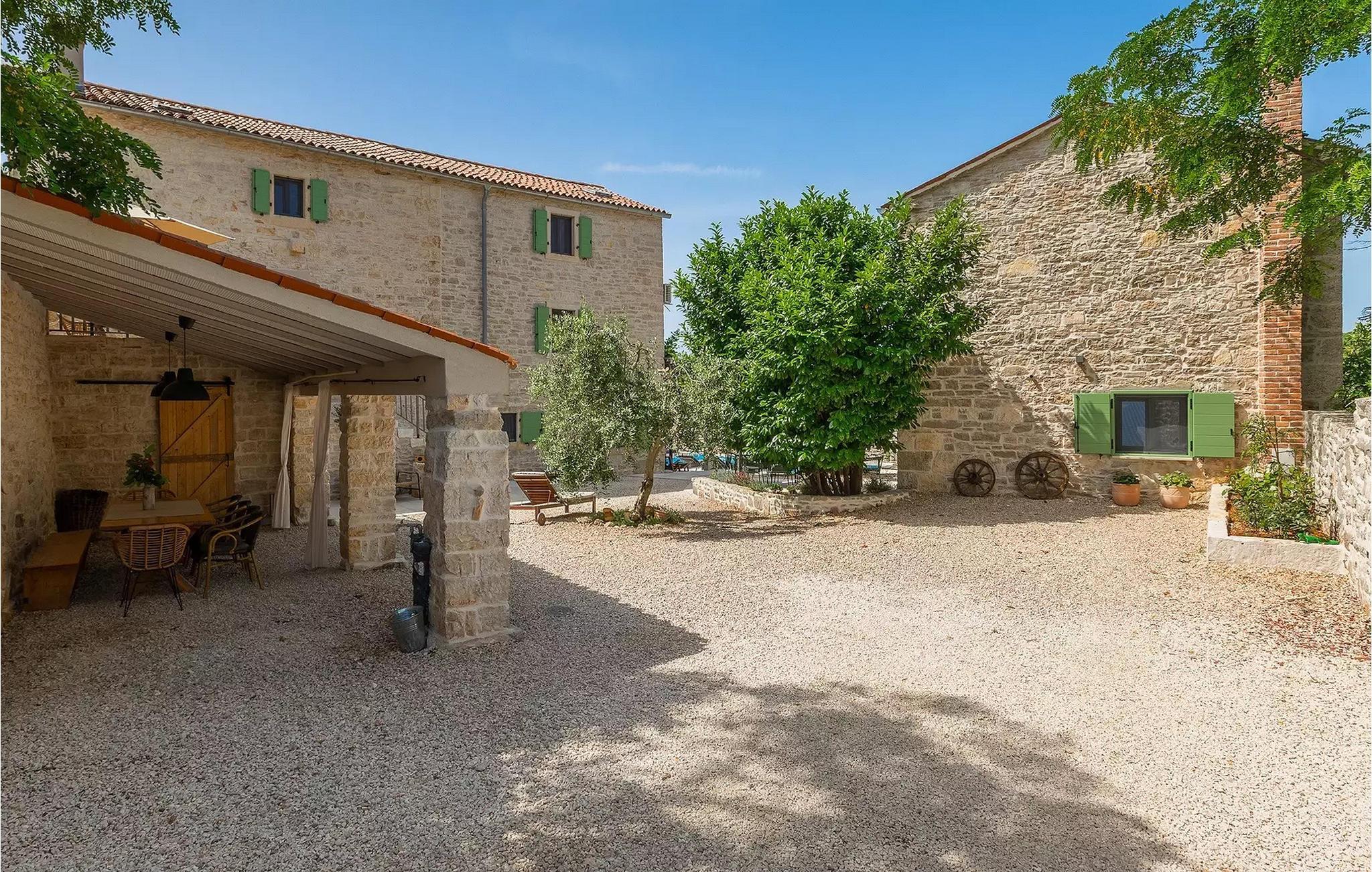 Alle fire husene har en mindre spiseplass for fire personer. Det er basseng og solsenger i husets bakgård. Bassenget gir deg all den forfriskningen du trenger på sommerdagene. På solsengene kan du lese favorittboken din mens du nyter solen og noe kaldt å drikke. På gårdsplassen er det en stor uteservering med plass til 18 personer, perfekt for store måltider med familie og venner. Du har en grill hvor du kan vise frem grillferdighetene du har jobbet med hele året. På gårdsplassen er det flere salongbord og stoler hvor du kan slappe av og bare nyte ferien.Villa Stanza Campitelli ligger i Krmed, en liten og rolig turistlandsby omgitt av vakker natur, frodige grønne åkre og åser, nær den vakre kysten i det vestlige Istria og den gamle byen Rovinj. Tidligere var Rovinj en øy, en liten romersk by, men flere hundre år senere ble den til en halvøy. I dag er Rovinj et av de mest romantiske stedene i Istria, et sted der du vandrer gjennom et nettverk av steingater i gamlebyen som sakte fører deg opp til toppen av åsen som gamlebyen ligger på, der du blir møtt av Eufemia-kirken, som har røtter tilbake til 900-tallet. Hvis du ikke har høydeskrekk og klatrer opp i kirketårnet, vil du bli møtt av en fortryllende utsikt over hele byen og området rundt. Fra fastlandet kan du nyte den vakre utsikten over gamlebyen, spesielt ved solnedgang, når fargene fra den brennende himmelen og det kalde blå havet smelter sammen. Istria er kjent for sitt kjøkken, spesielt for bruken av trøfler i rettene. Med tanke på at noen av de beste trøflene finnes i Istria, og at Rovinj og omegn byr på mange restauranter, vil gastronomientusiaster garantert få valuta for pengene her.
