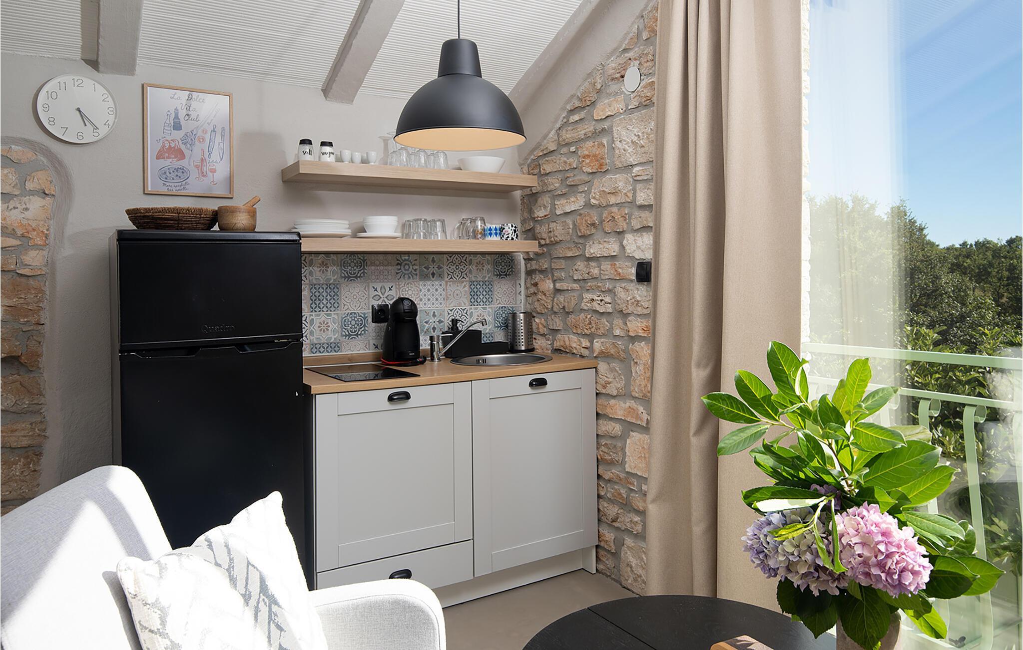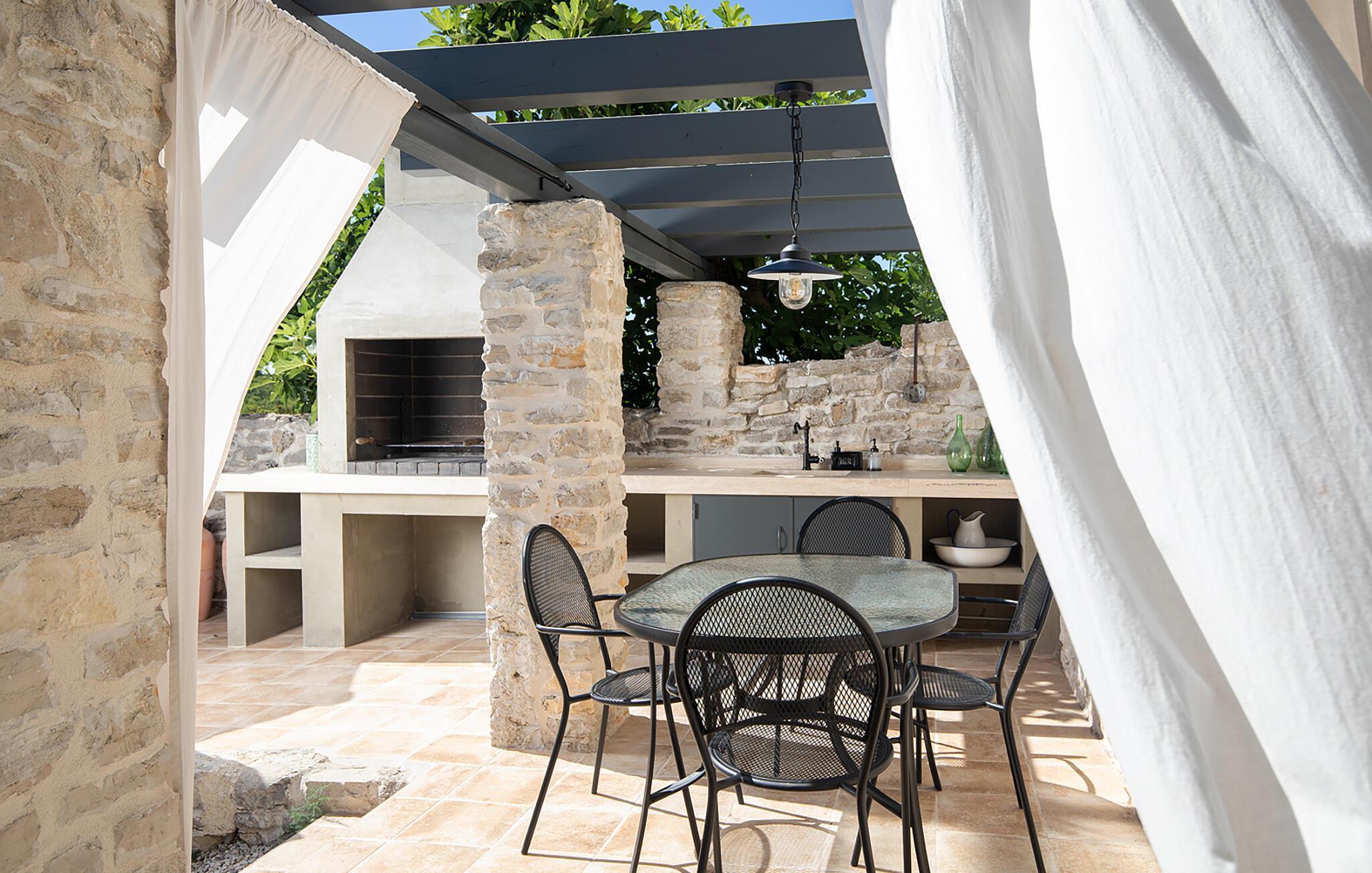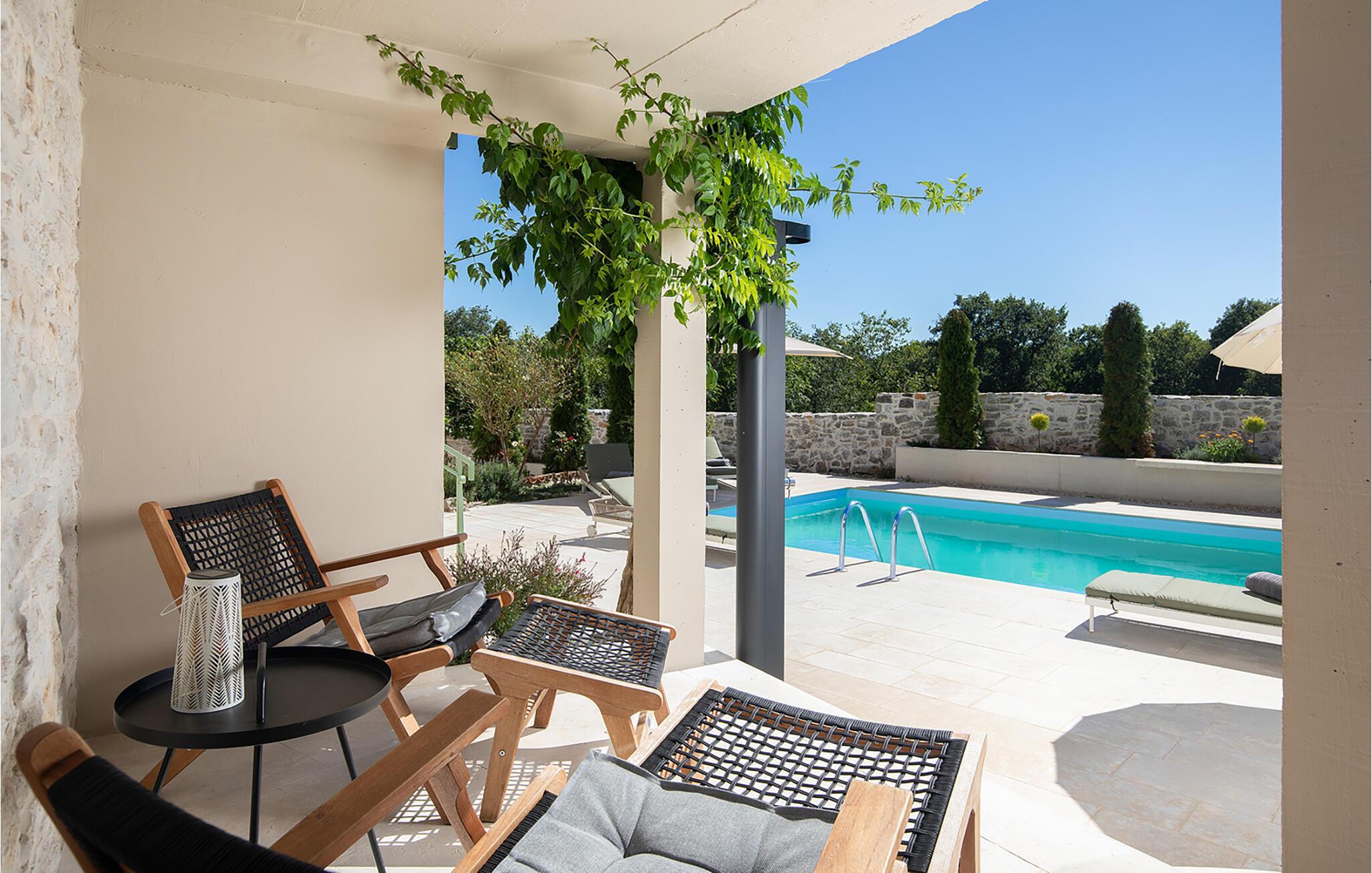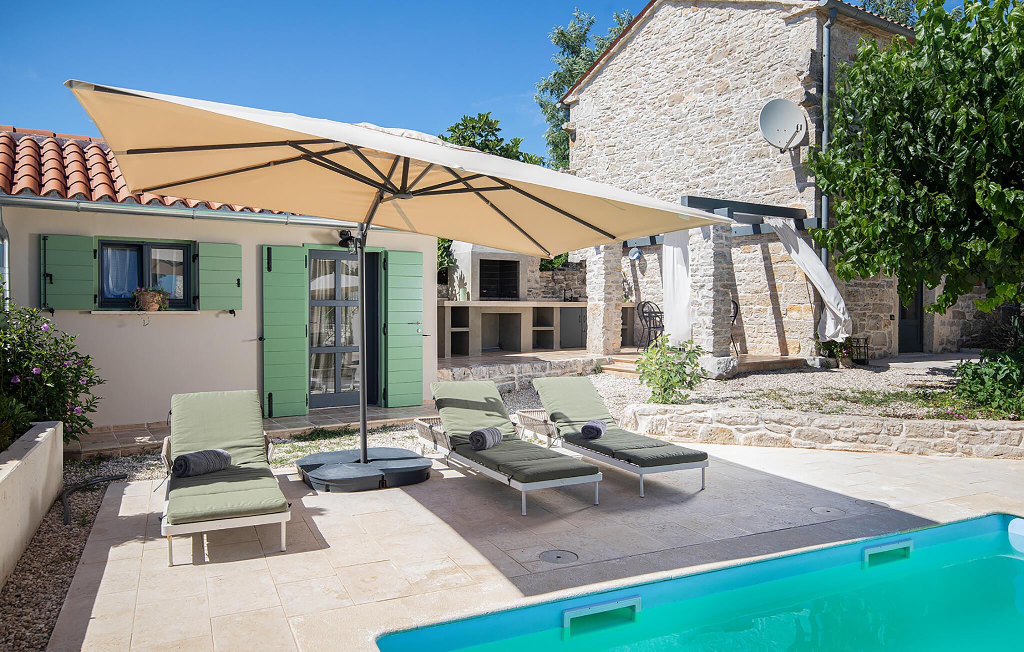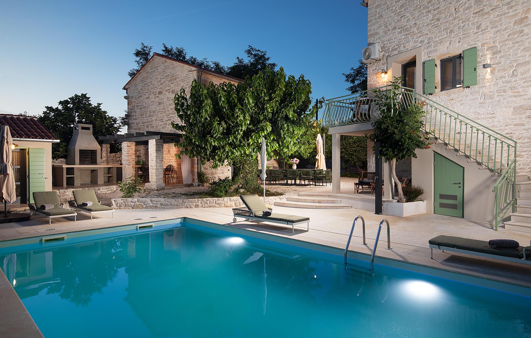 Alle fire husene har en mindre spiseplass for fire personer. Det er basseng og solsenger i husets bakgård. Bassenget gir deg all den forfriskningen du trenger på sommerdagene. På solsengene kan du lese favorittboken din mens du nyter solen og noe kaldt å drikke. På gårdsplassen er det en stor uteservering med plass til 18 personer, perfekt for store måltider med familie og venner. Du har en grill hvor du kan vise frem grillferdighetene du har jobbet med hele året. På gårdsplassen er det flere salongbord og stoler hvor du kan slappe av og bare nyte ferien.Villa Stanza Campitelli ligger i Krmed, en liten og rolig turistlandsby omgitt av vakker natur, frodige grønne åkre og åser, nær den vakre kysten i det vestlige Istria og den gamle byen Rovinj. Tidligere var Rovinj en øy, en liten romersk by, men flere hundre år senere ble den til en halvøy. I dag er Rovinj et av de mest romantiske stedene i Istria, et sted der du vandrer gjennom et nettverk av steingater i gamlebyen som sakte fører deg opp til toppen av åsen som gamlebyen ligger på, der du blir møtt av Eufemia-kirken, som har røtter tilbake til 900-tallet. Hvis du ikke har høydeskrekk og klatrer opp i kirketårnet, vil du bli møtt av en fortryllende utsikt over hele byen og området rundt. Fra fastlandet kan du nyte den vakre utsikten over gamlebyen, spesielt ved solnedgang, når fargene fra den brennende himmelen og det kalde blå havet smelter sammen. Istria er kjent for sitt kjøkken, spesielt for bruken av trøfler i rettene. Med tanke på at noen av de beste trøflene finnes i Istria, og at Rovinj og omegn byr på mange restauranter, vil gastronomientusiaster garantert få valuta for pengene her.