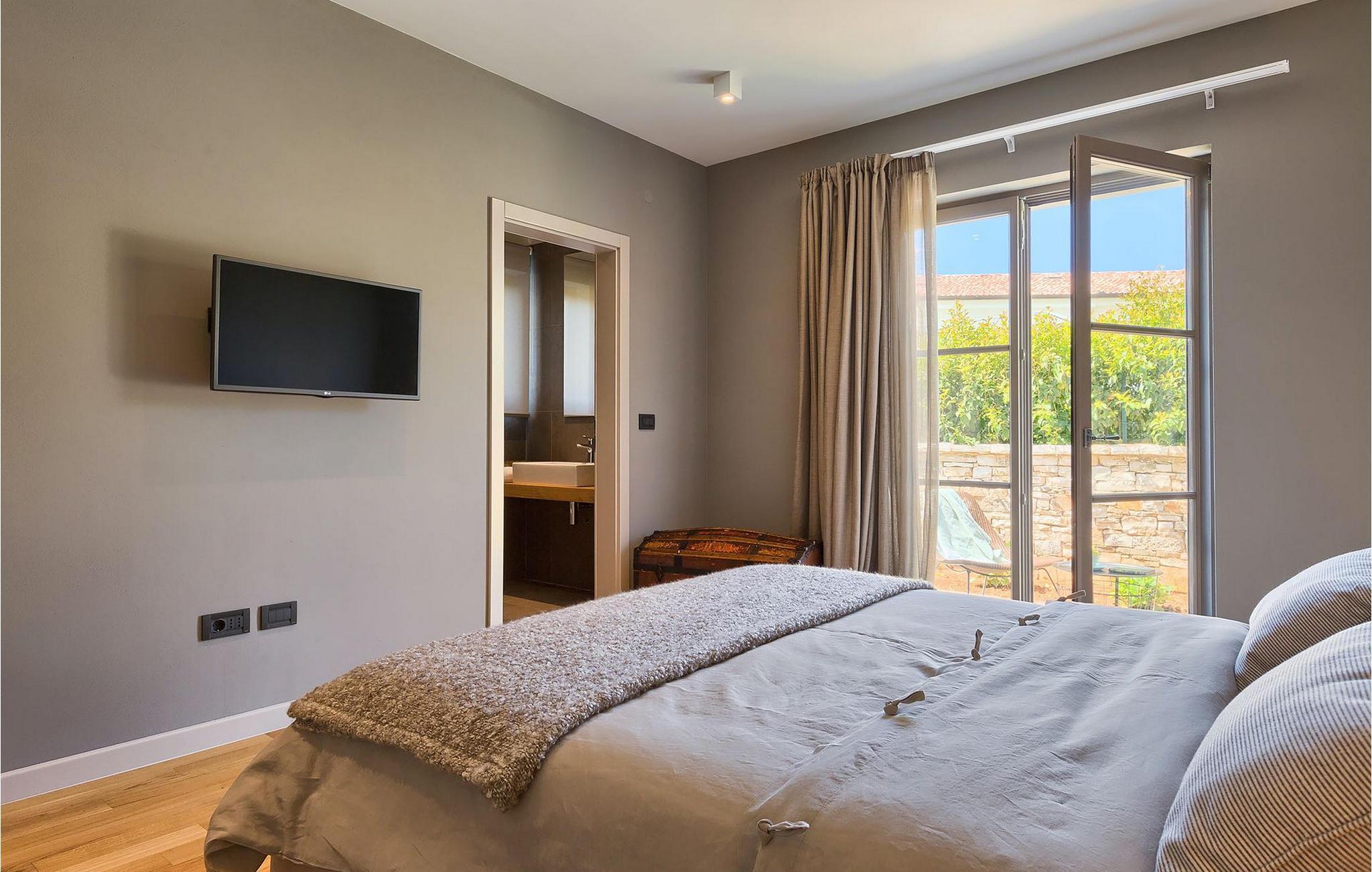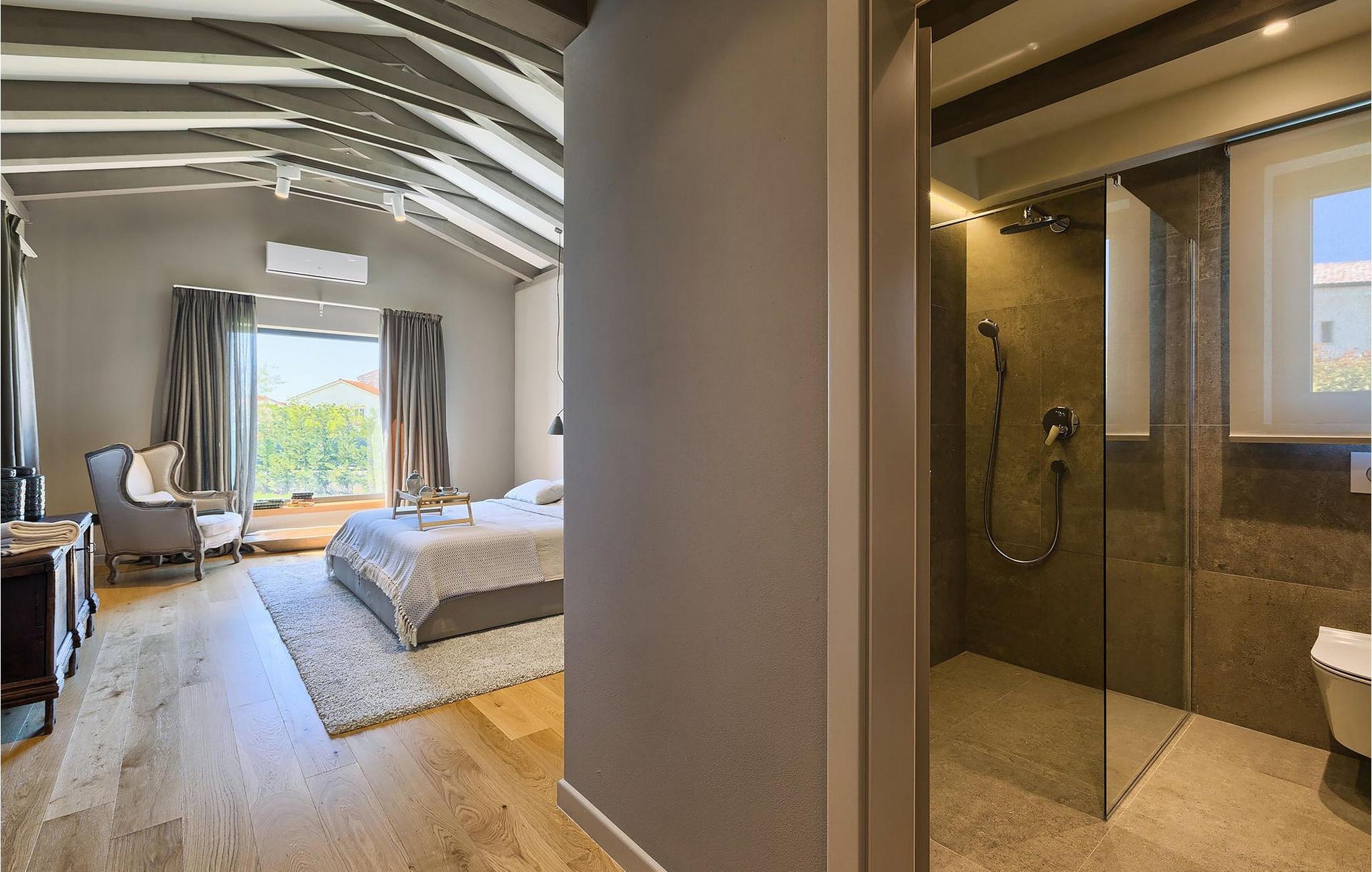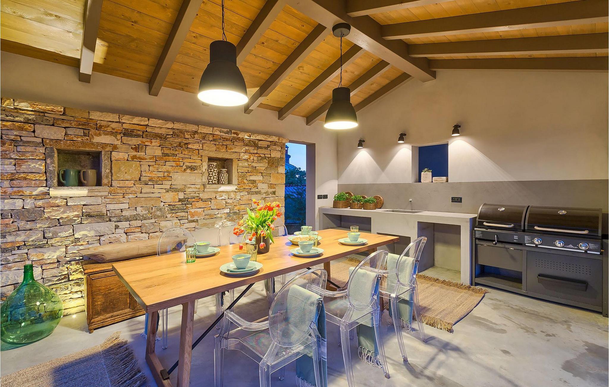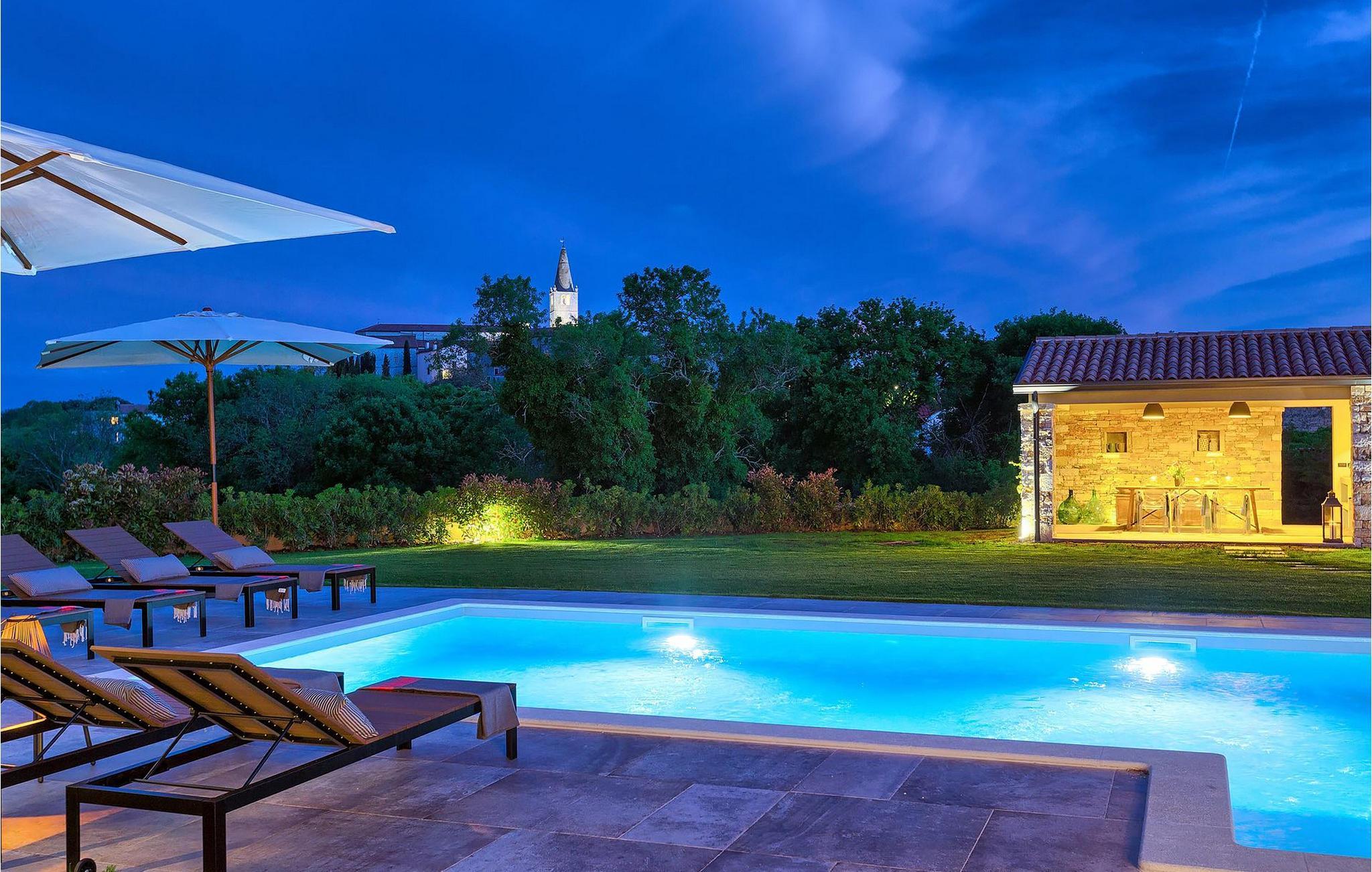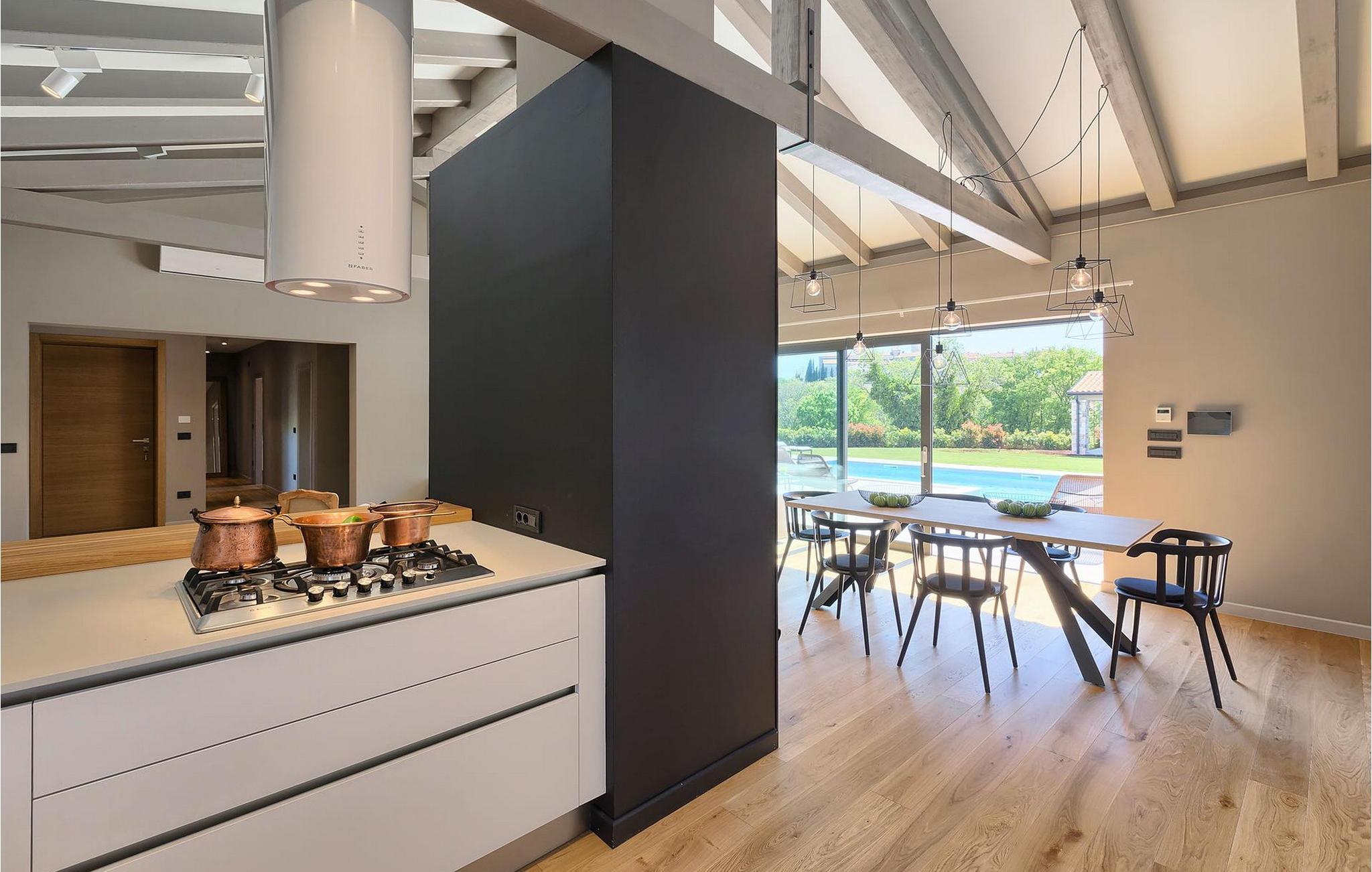 Du vil bli begeistret over den åpne stue- og spisestuen med takbjelker og peis som skaper en varm atmosfære. Villaens fullt utstyrte kjøkken og 4 store soverom med gallerilignende vinduer er ikke mindre imponerende. Fra første etasje i Villa Grotte har du tilgang til bassengområdet, der du kan tilbringe dagene med å nyte den varme istriske solen eller svømme i det innbydende bassenget mens du nyter utsikten over en liten, men fantastisk sjarmerende istrisk by.