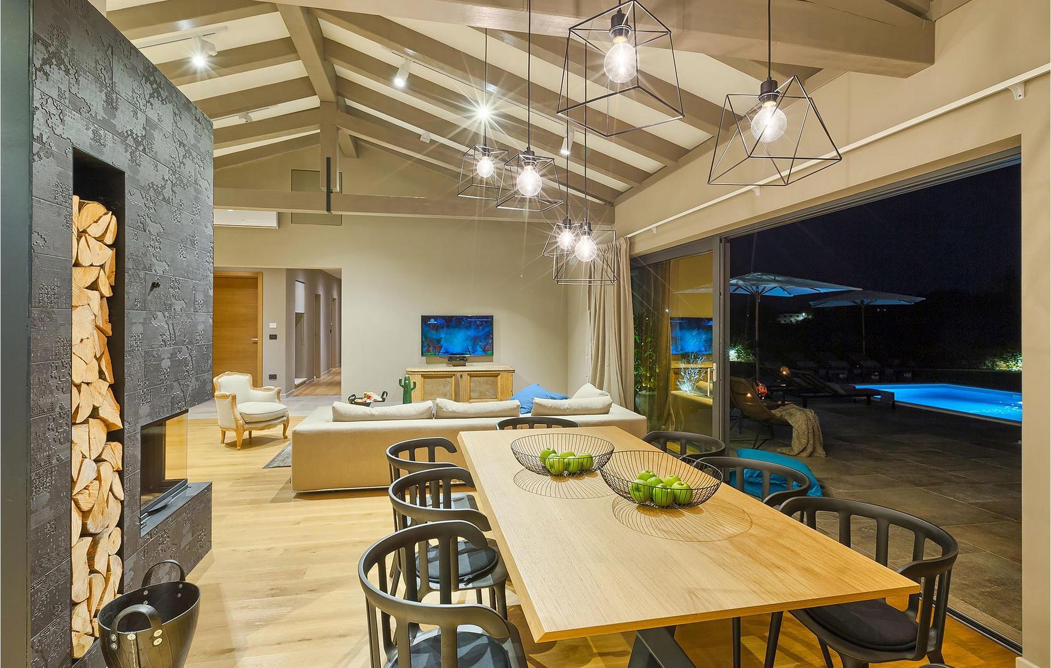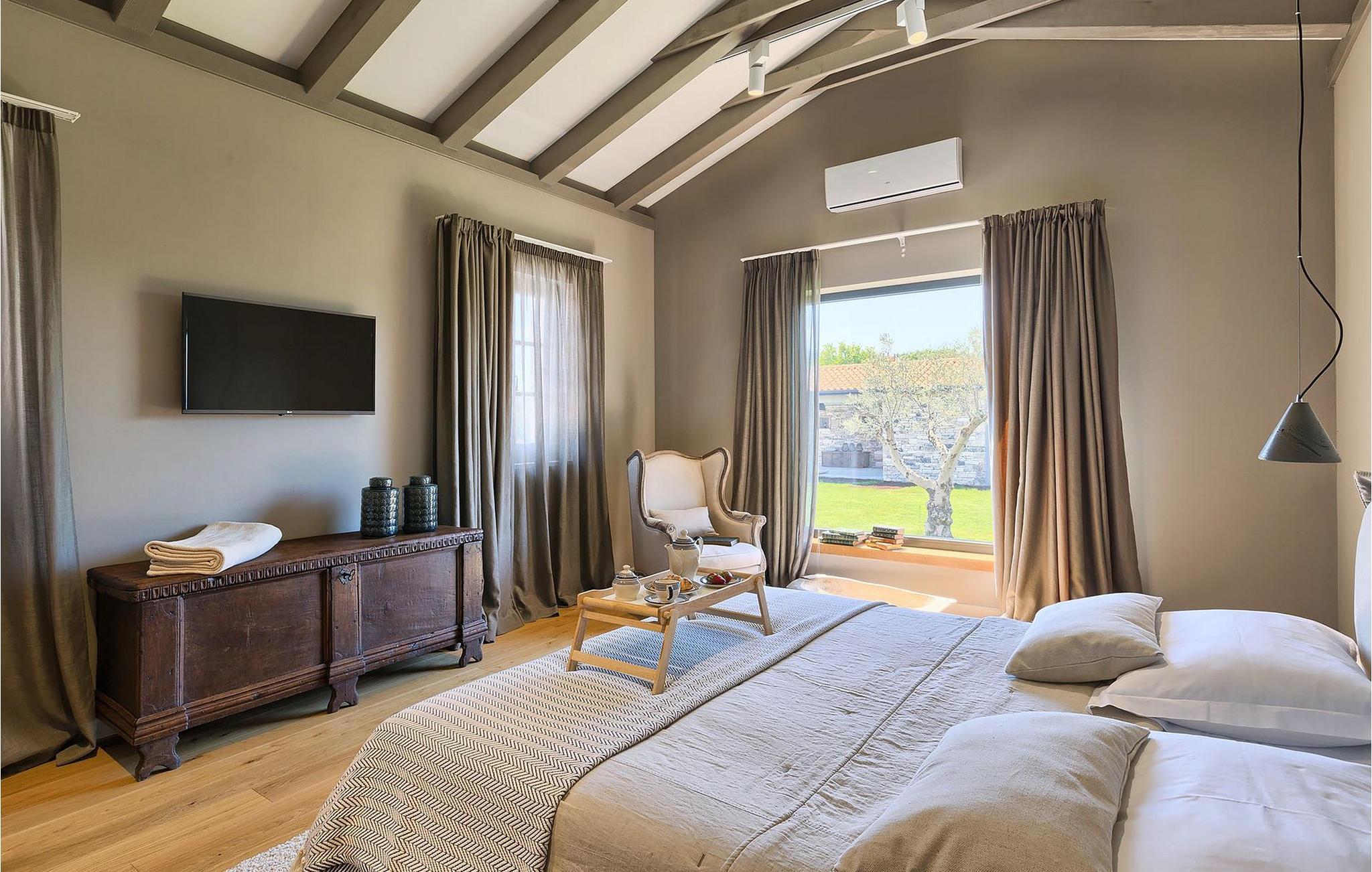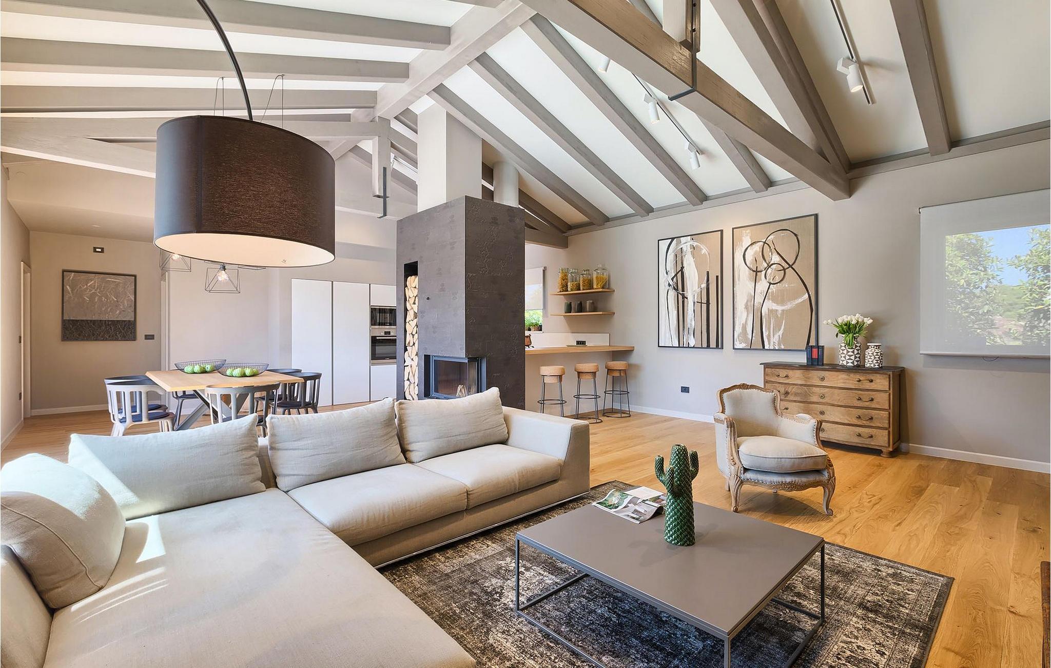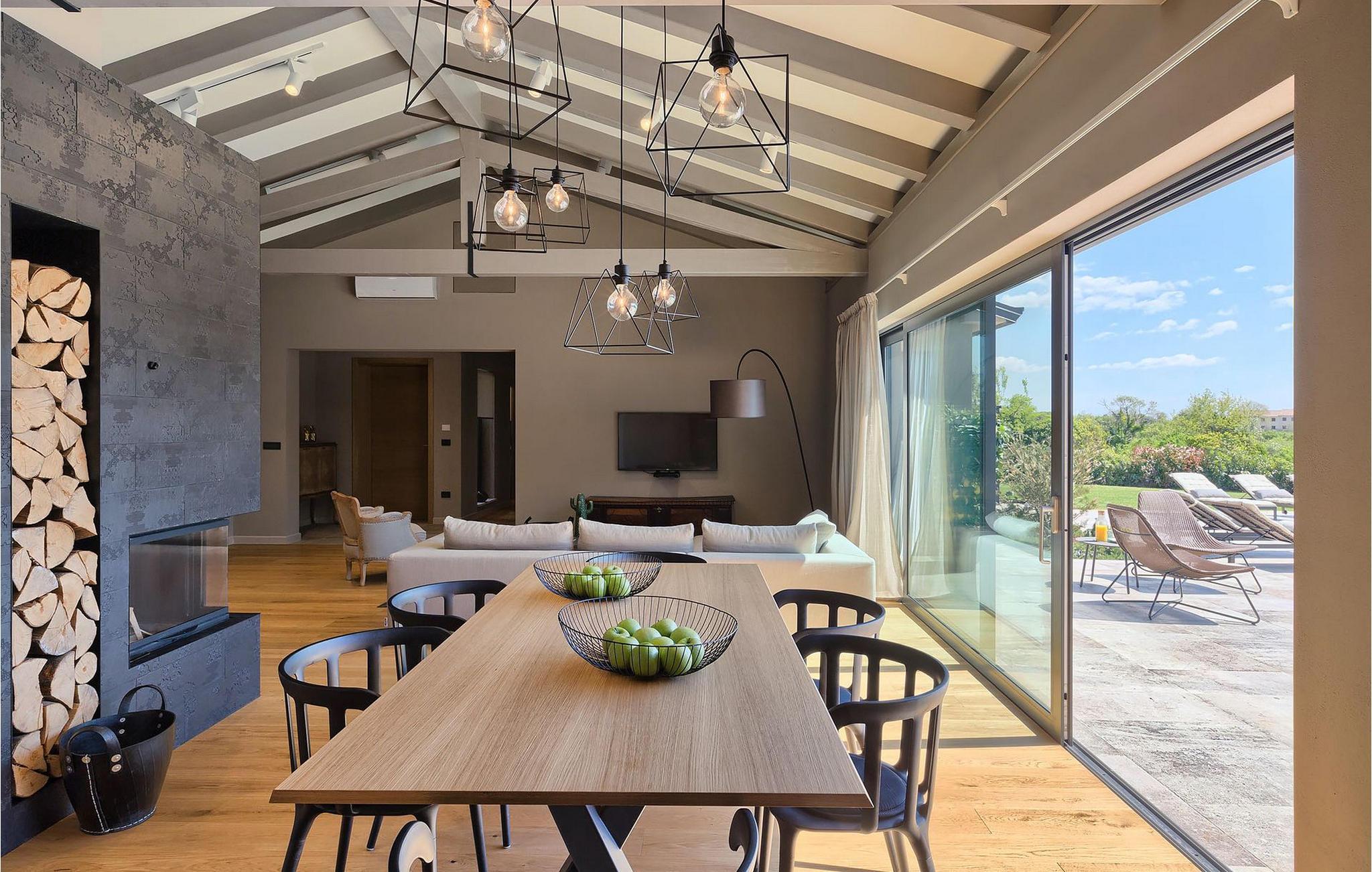 Villaens romslige og luftige interiør kombinerer rustikke detaljer med elegante møbler og moderne fasiliteter (WiFi, klimaanlegg).