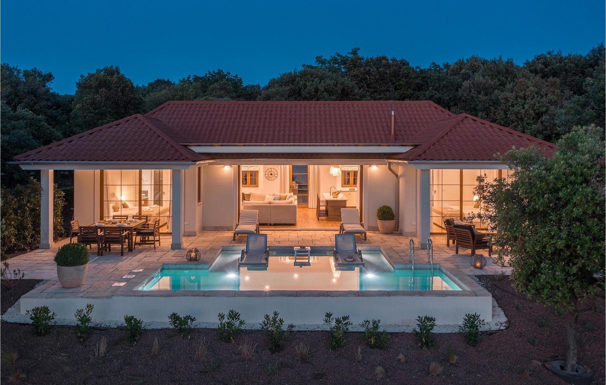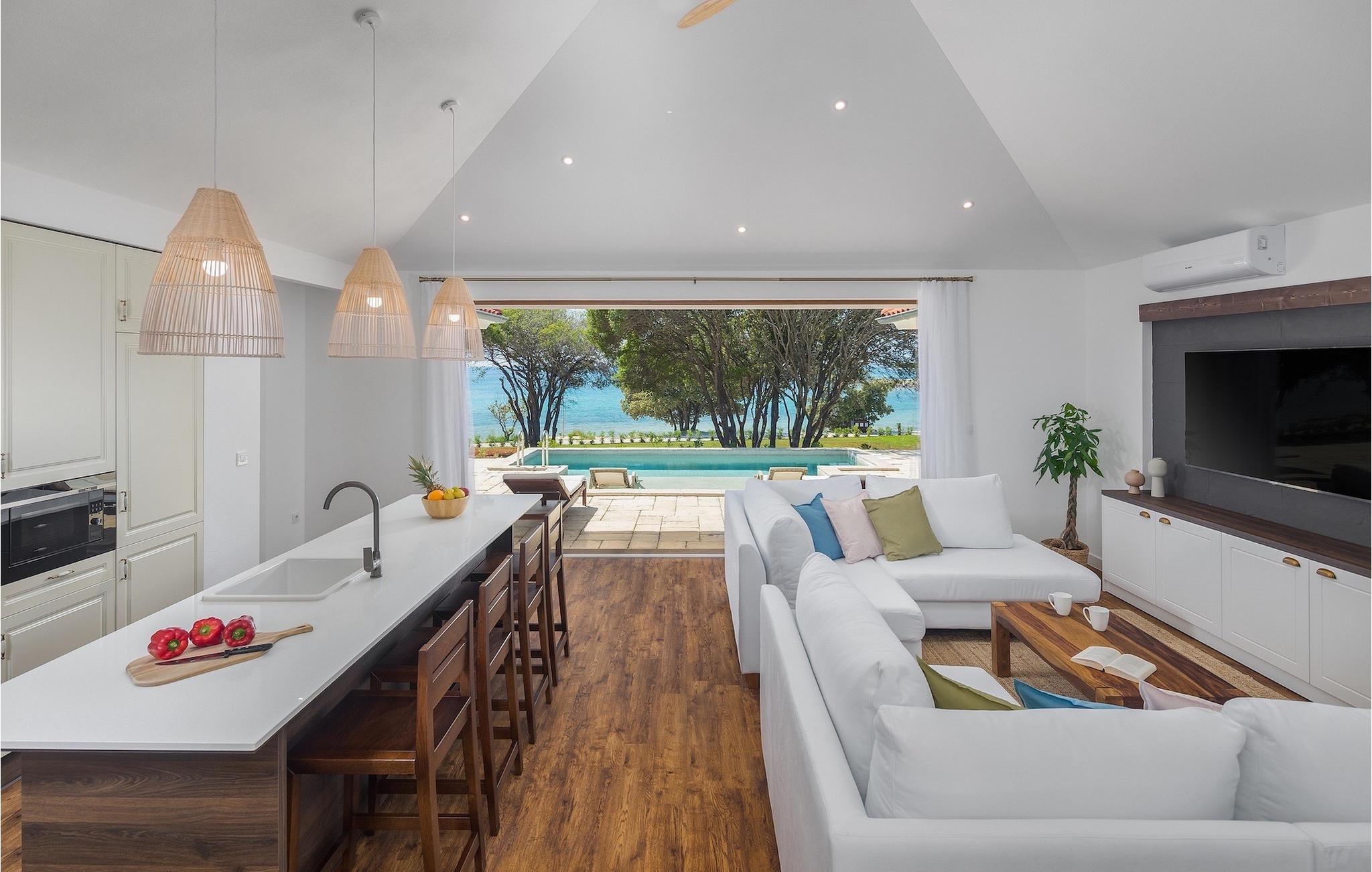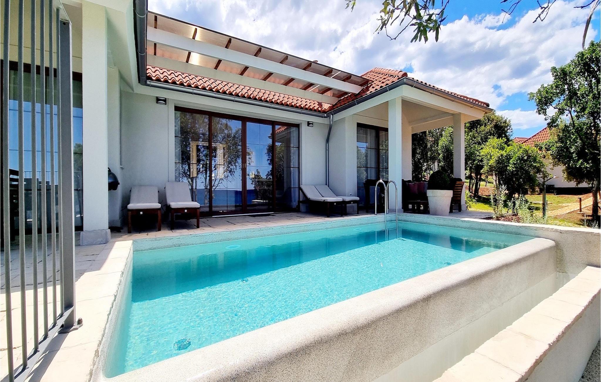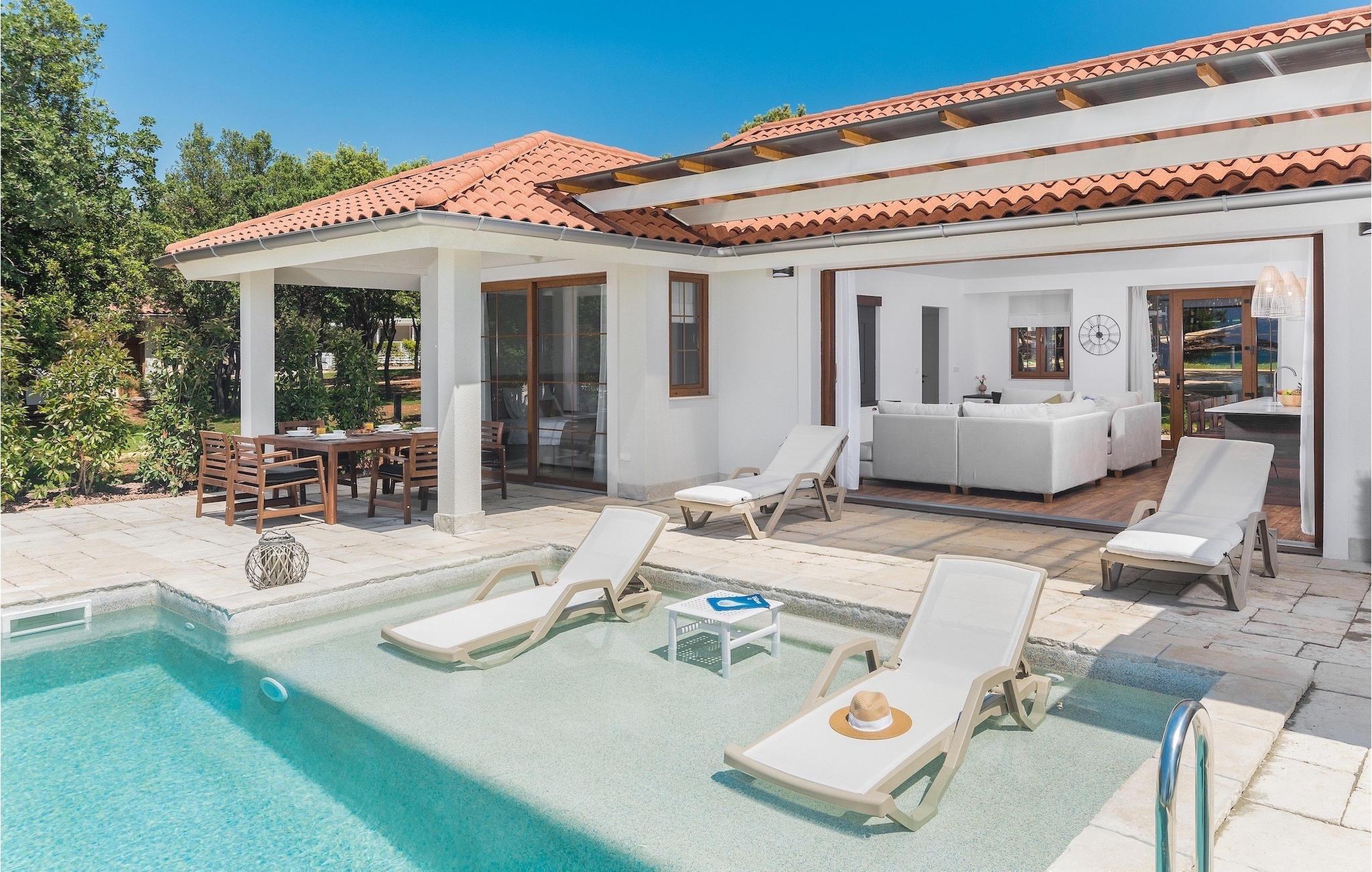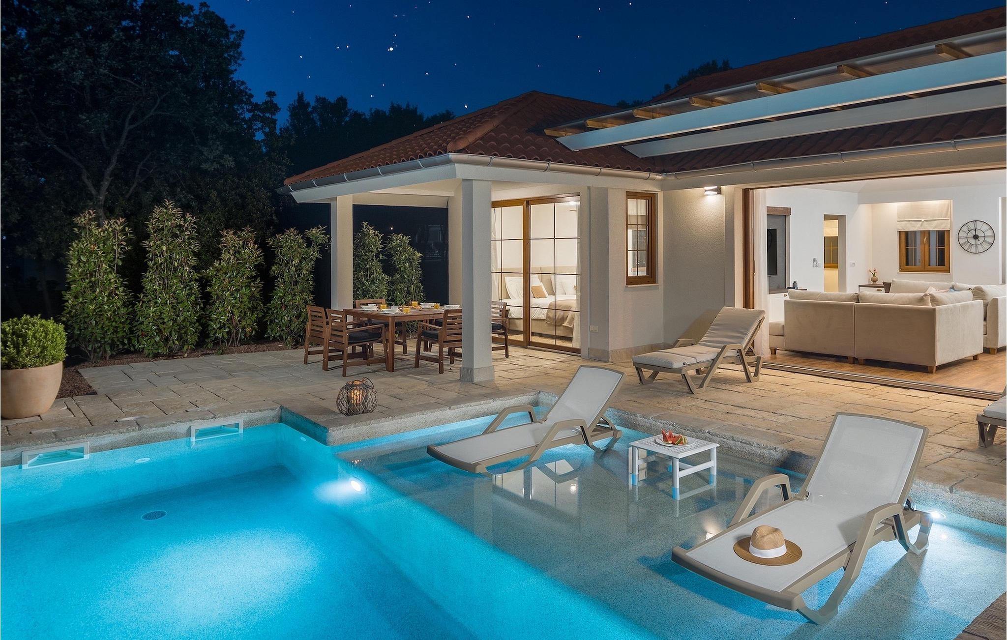 Den fortryllende Villa Luxury Villas Porto Bus Sea View er et ideelt valg for en fredelig familieferie ved sjøen. Denne villaen ligger på en campingplass på vestkysten av Istria, hvor du finner alt du trenger for en avslappende ferie. Luxury Villas Porto Bus Sea View er en av luksusvillaene med privat basseng i første rekke mot sjøen. Foran villaen er det et privat basseng med havutsikt. Utenfor er det også en terrasse med spisebord, slik at du kan nyte de varme sommerkveldene og den romantiske atmosfæren ved havet i fulle drag.