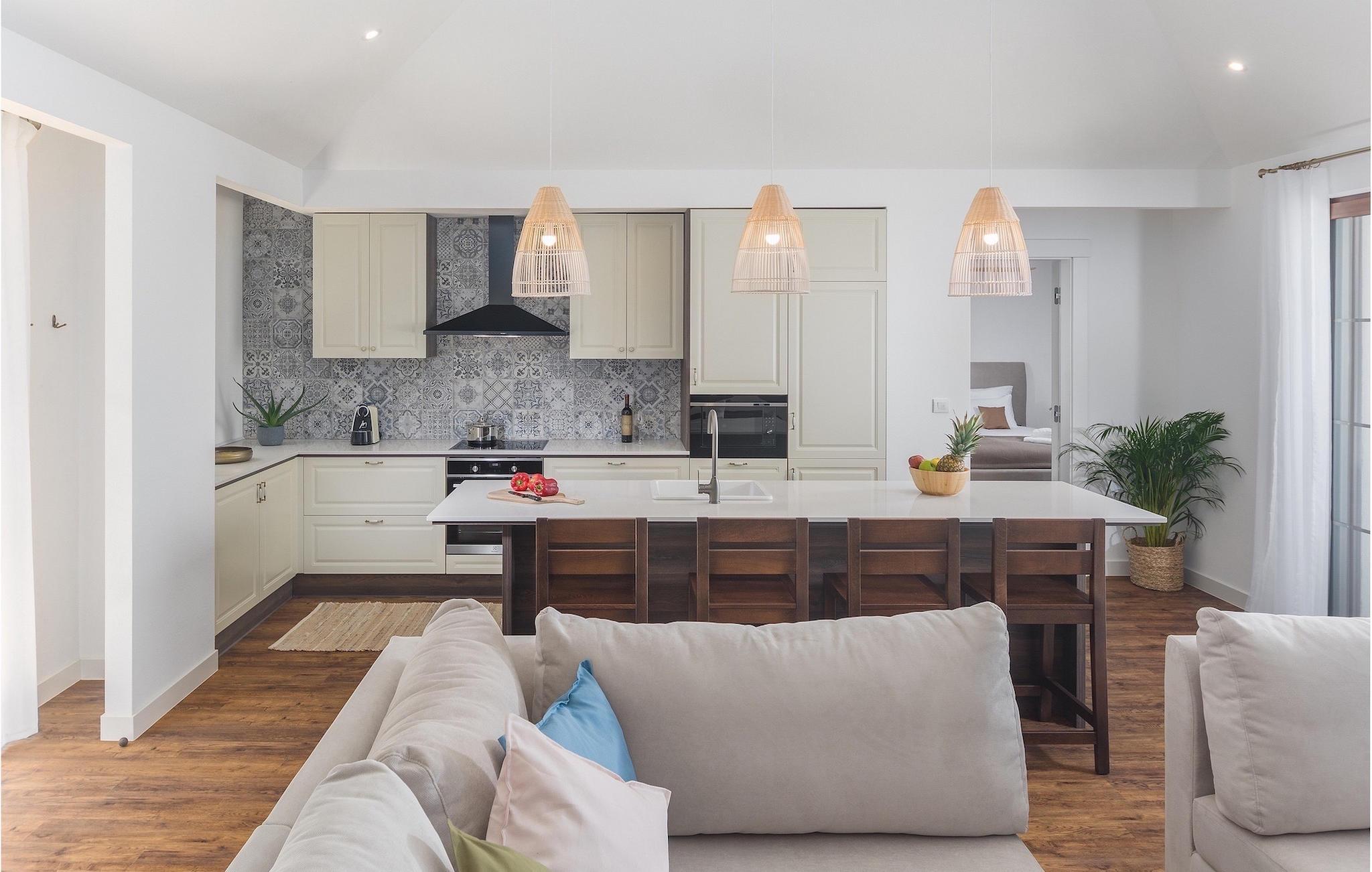 Interiøret i villaen er innredet i moderne stil. I denne enetasjes villaen finner du en vakker stue, et fullt utstyrt kjøkken med spisestue og to elegant innredede soverom med eget bad.