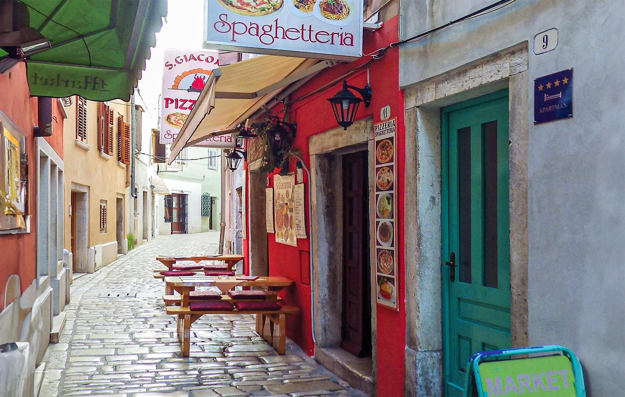 Disse vakkert møblerte og funksjonelt utstyrte ferieleilighetene (CIV556 og CIV557) ligger i sentrum av den romantiske gamlebyen i Rovinj, i gågaten. De ligger i første etasje i et bolighus, i første etasje ligger en pizzeria og rett overfor ligger et lite supermarked. CIV556 strekker seg over to etasjer. Her kan du spasere gjennom smugene i gamlebyen og bade på strendene i nærheten. Vær oppmerksom på at disse ferieleilighetene ikke har parkeringsplass. Besøk også de omkringliggende pittoreske byene og prøv lokale spesialiteter på en av de mange restaurantene.