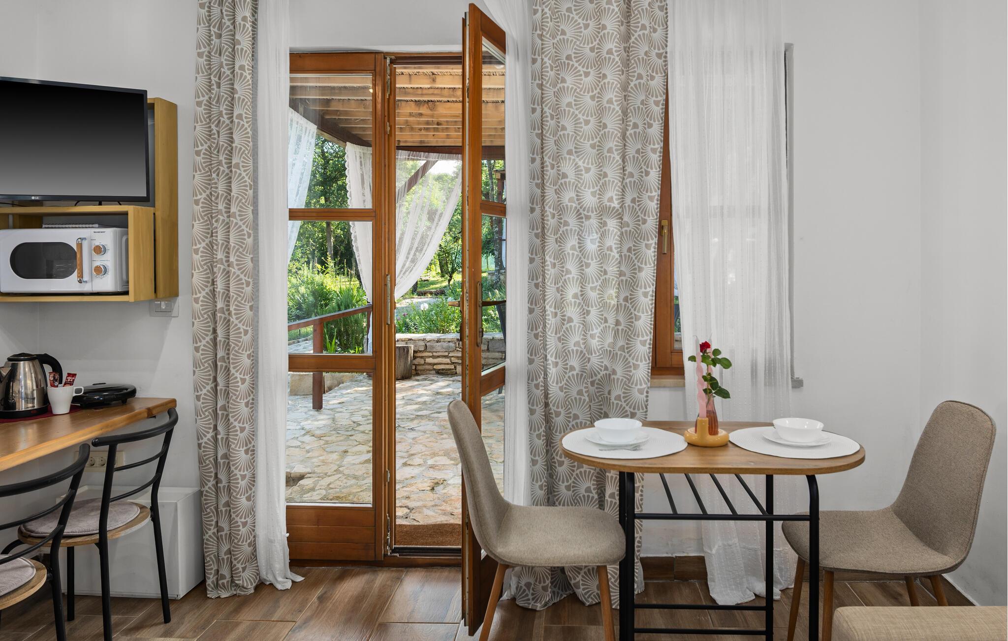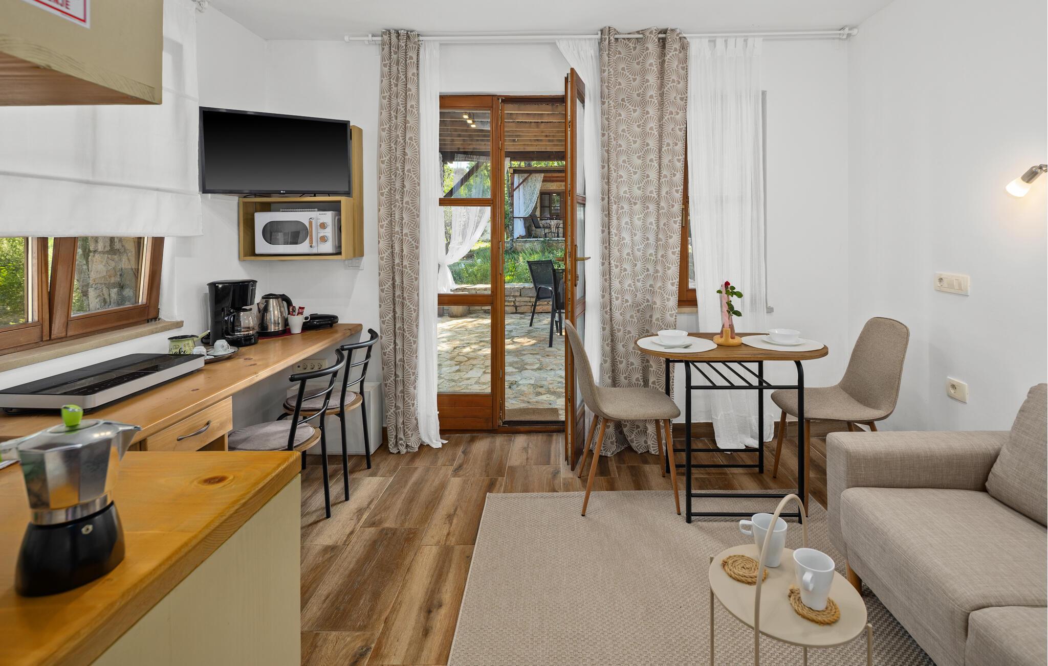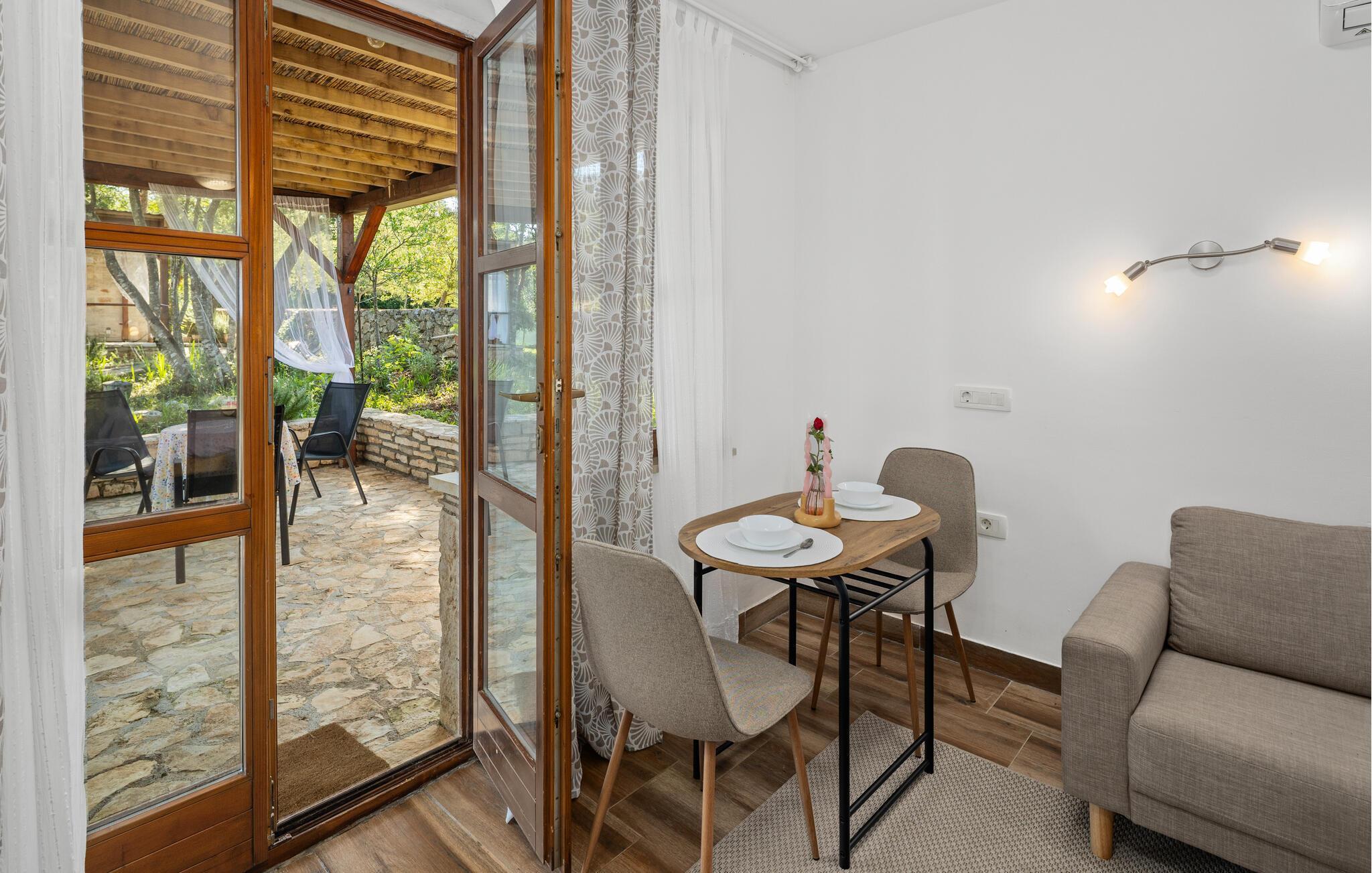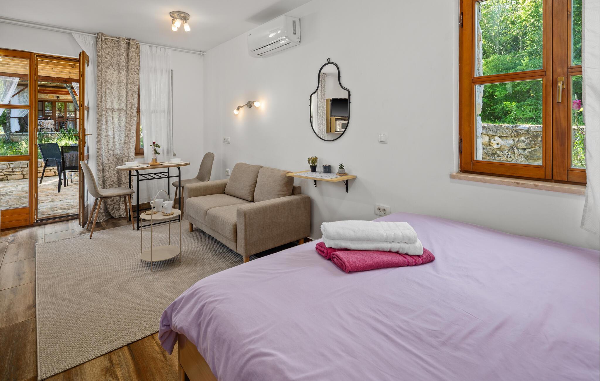 Dette koselig innredede steinhuset ønsker deg velkommen som en del av et velholdt kompleks, og inviterer deg til å lytte til sirissene som kvitrer under en solfylt pause. Planlegg dagens aktiviteter over en avslappet frokost, og slå dere ned i den innbydende sofaen om kvelden for å se en film eller spille et brettspill sammen.