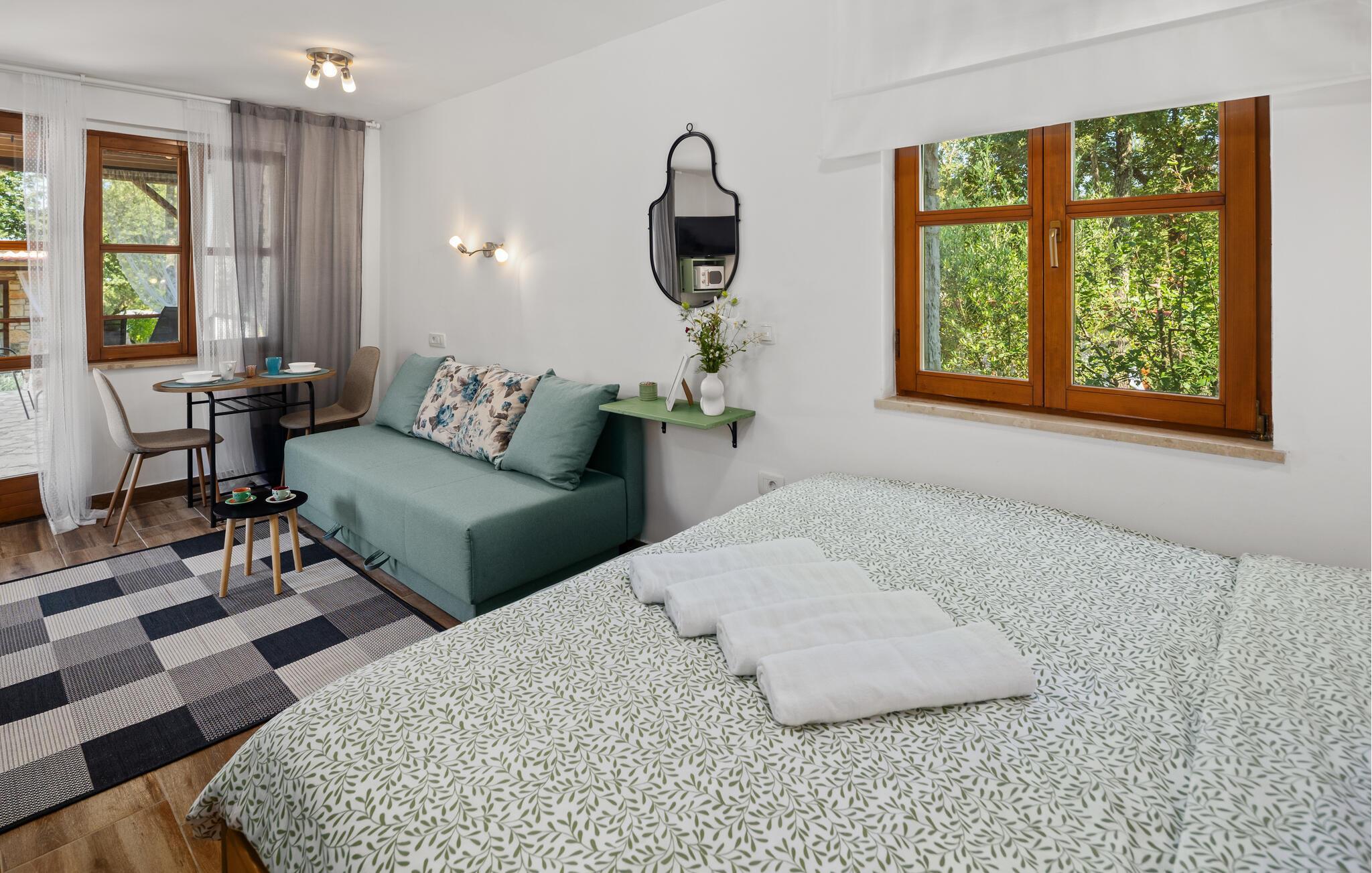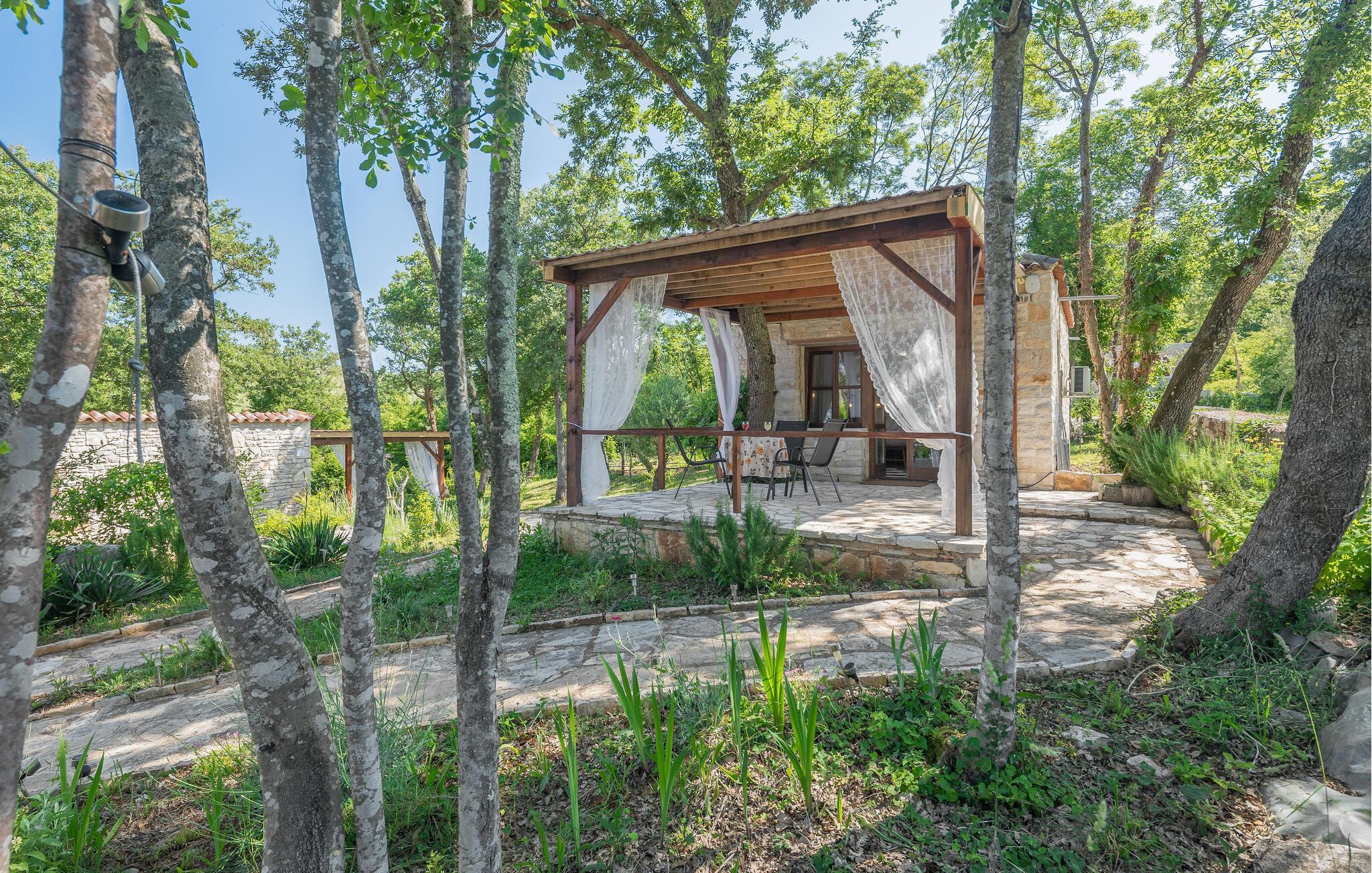 Dette koselig innredede steinhuset er en del av et velholdt kompleks og inviterer deg til avslappende dager i naturen. Planlegg dagens aktiviteter over en god frokost, og avslutt kvelden i den innbydende sofaen med å se en film eller spille et brettspill sammen.