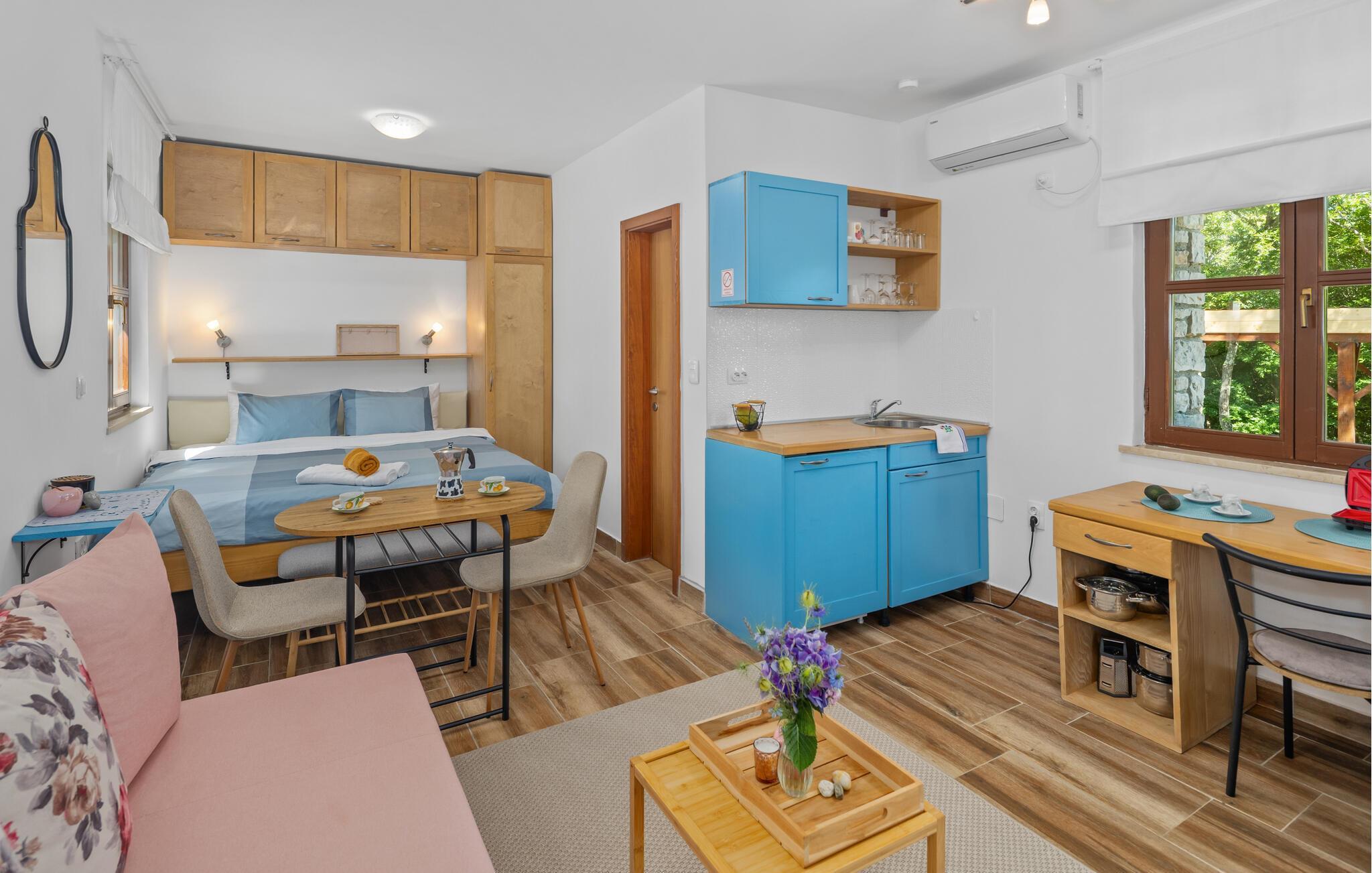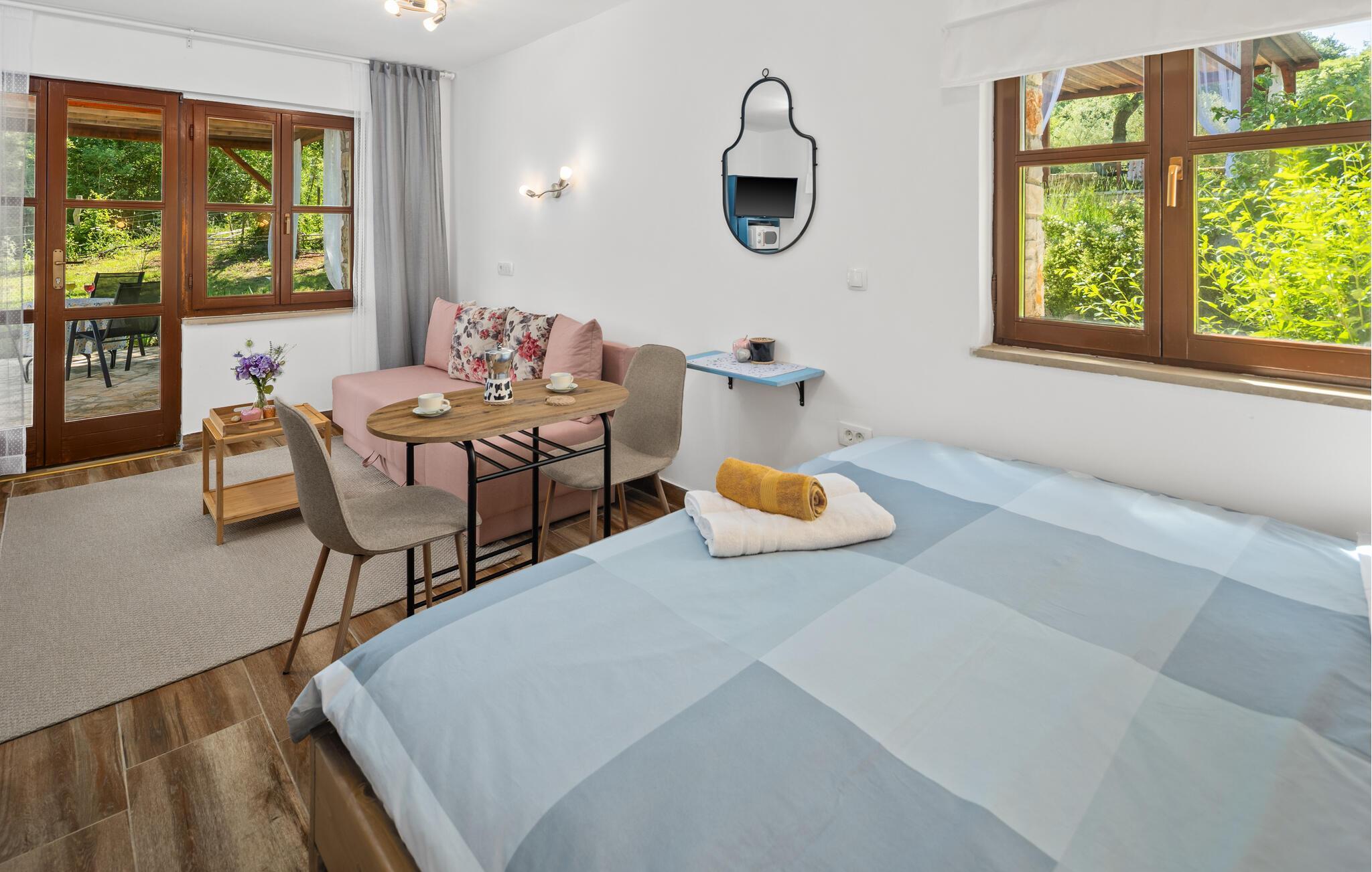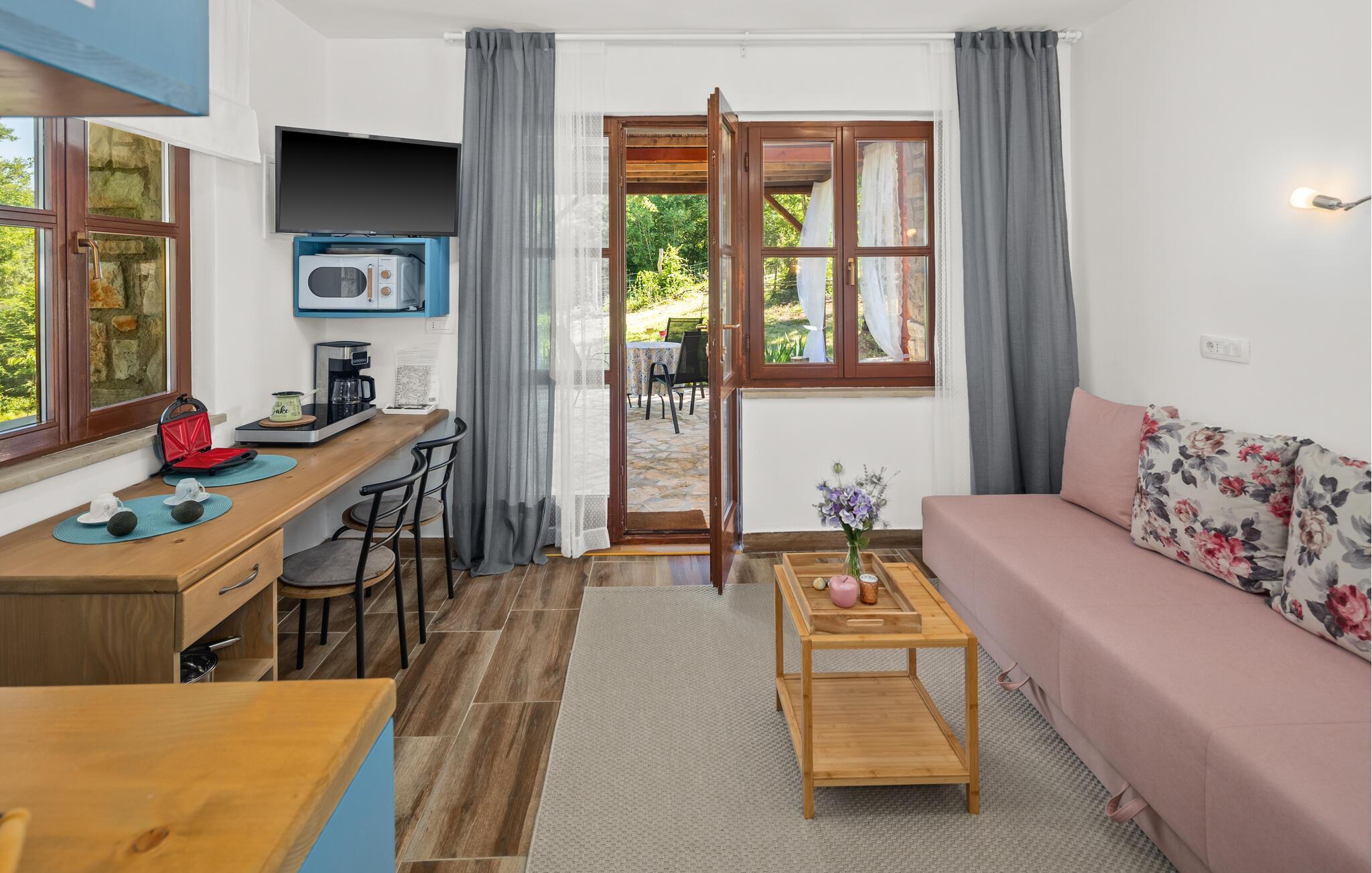 Denne smakfullt og koselig innredede ettromsleiligheten er en del av et velholdt kompleks og inviterer deg til en fredelig pause midt i naturen. Planlegg dagens aktiviteter over en avslappet frokost, og slå dere ned i den innbydende sofaen om kvelden for å se en film eller spille et brettspill sammen.