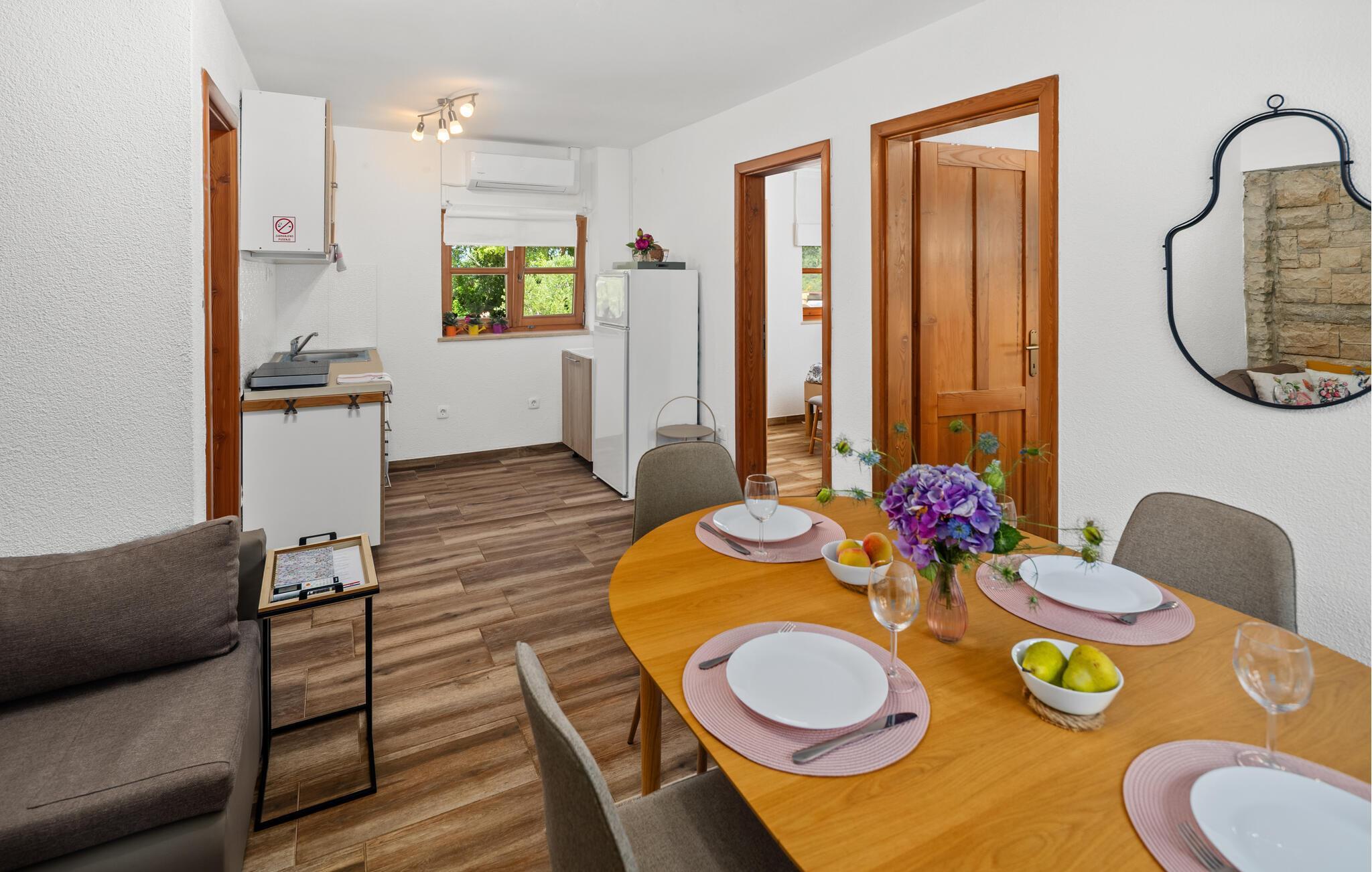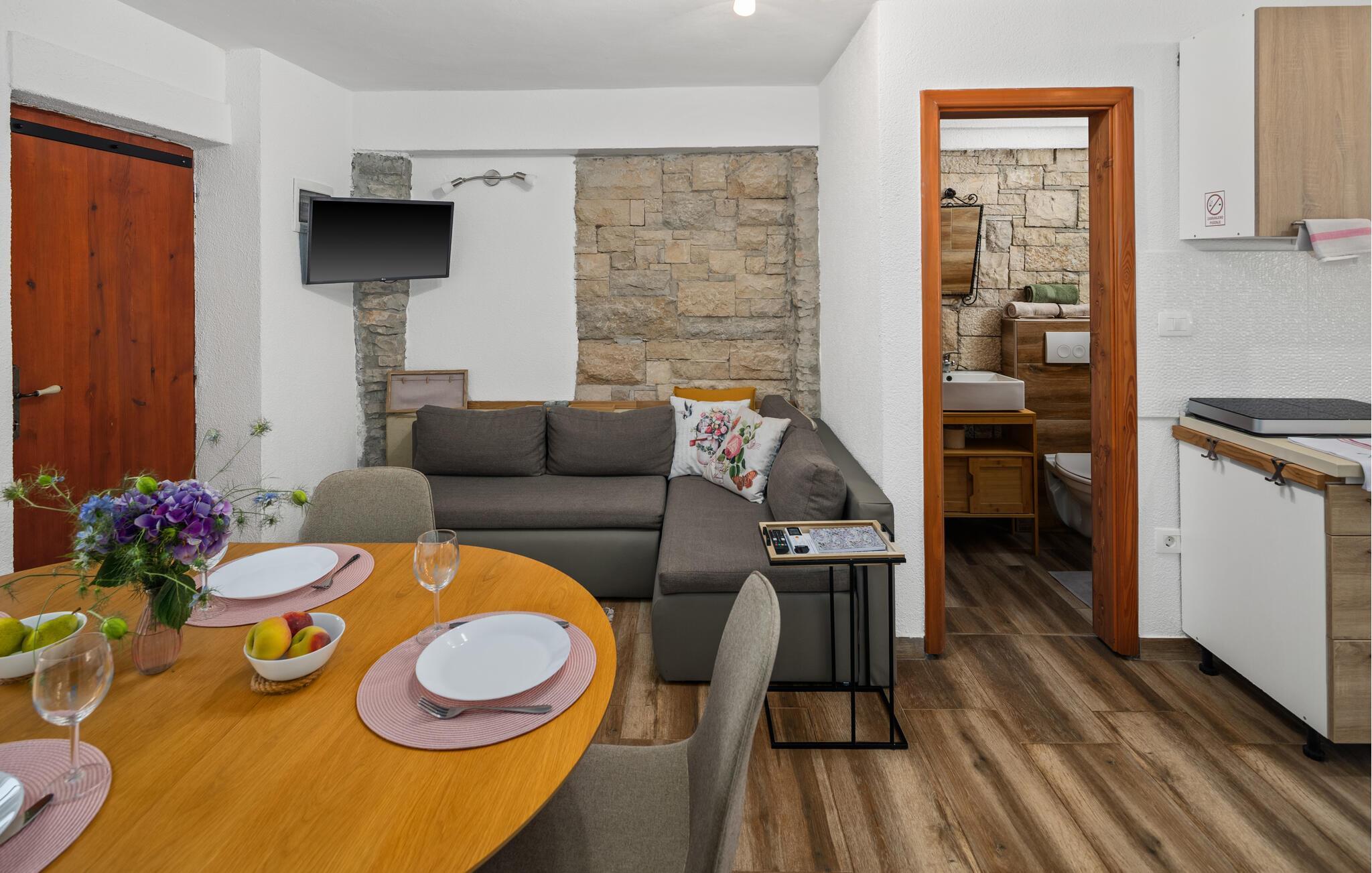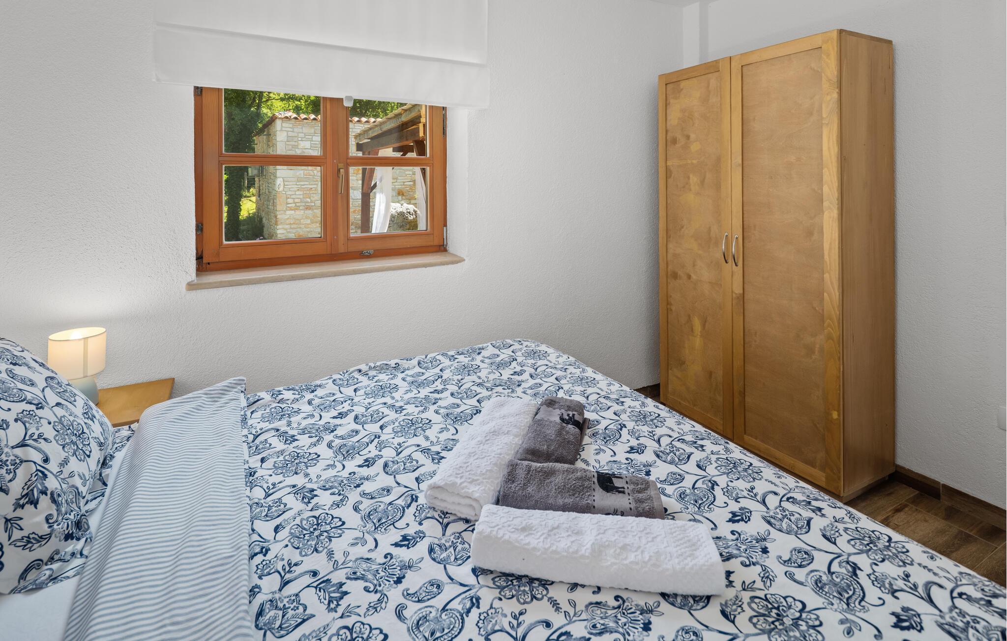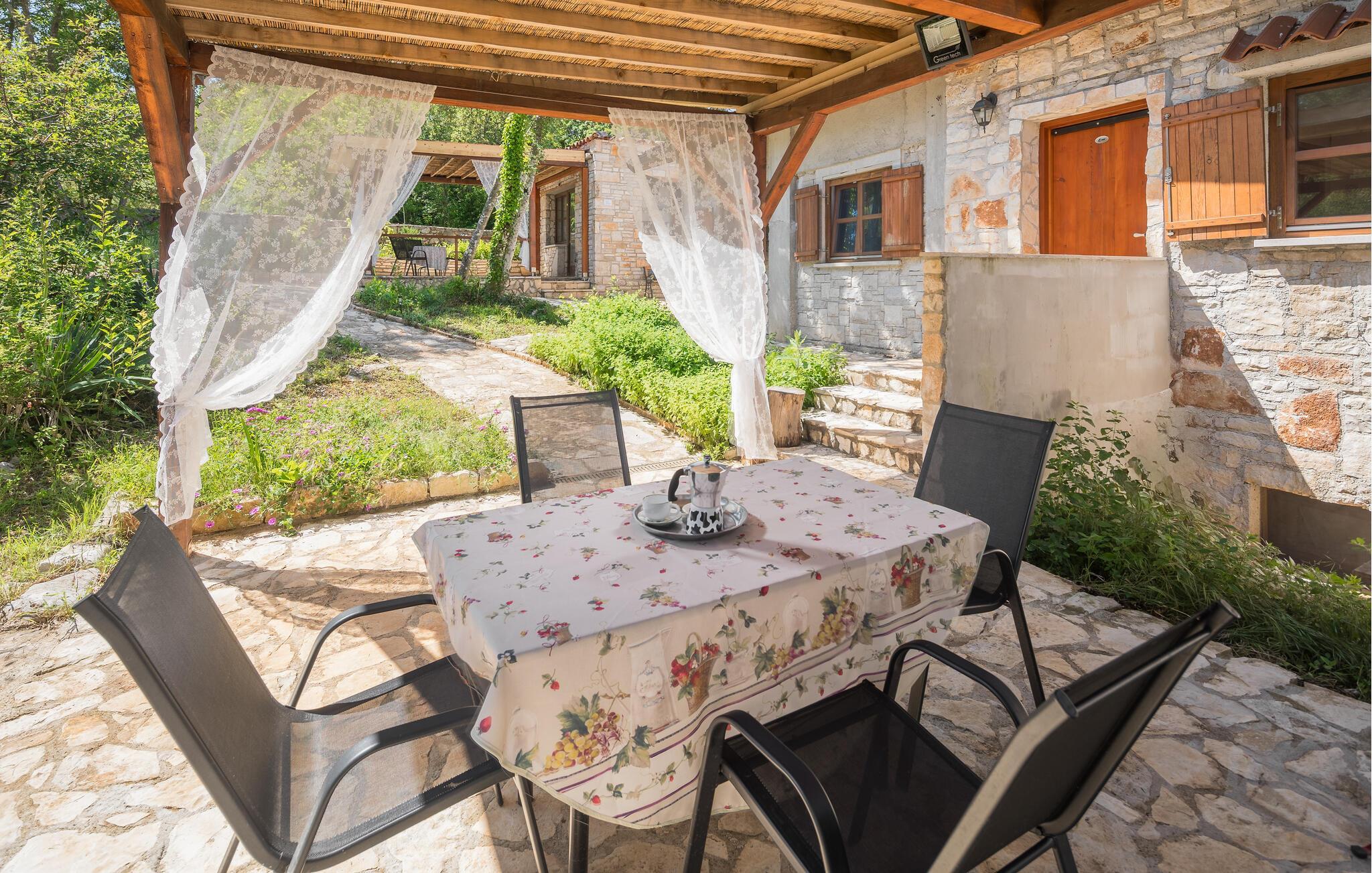 Dette koselig innredede steinhuset ønsker deg velkommen som en del av et velholdt kompleks, og inviterer deg til å lytte til sirissene som kvitrer under en solfylt pause. Planlegg dagens aktiviteter over en avslappet frokost, og slå dere ned i den innbydende sofaen om kvelden for å se en film eller spille et brettspill sammen.