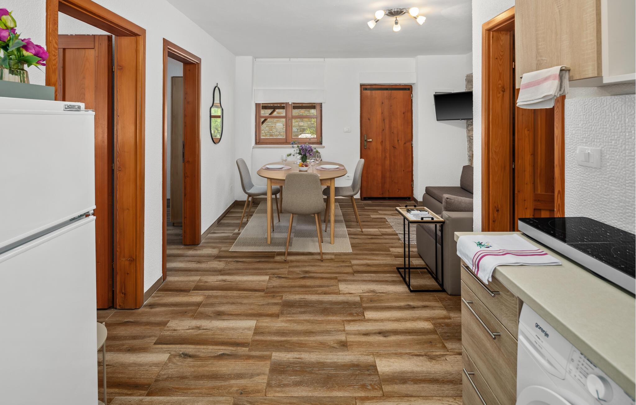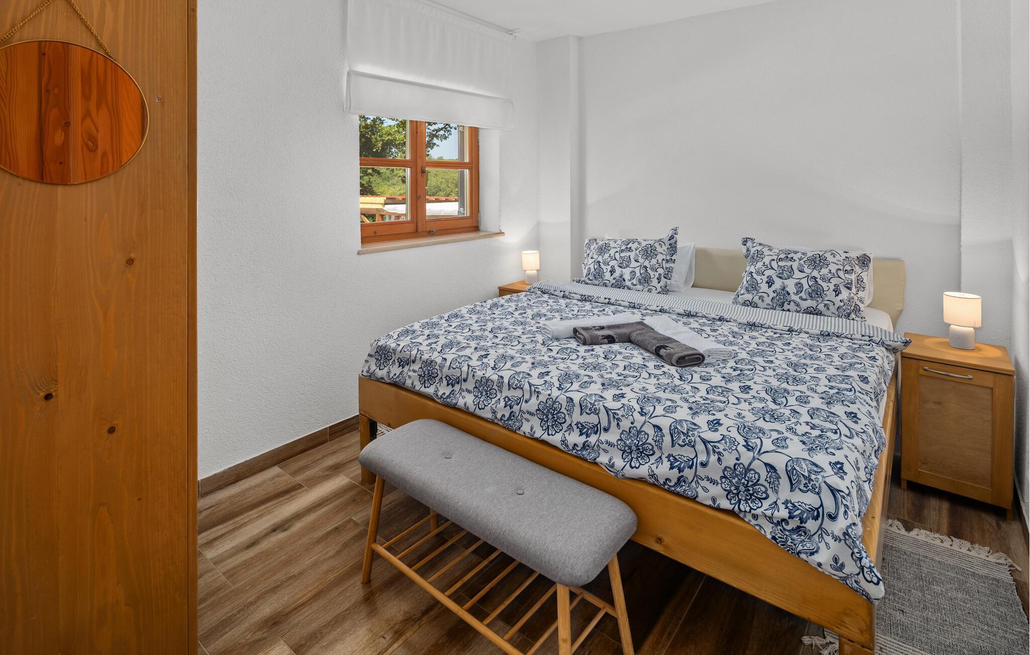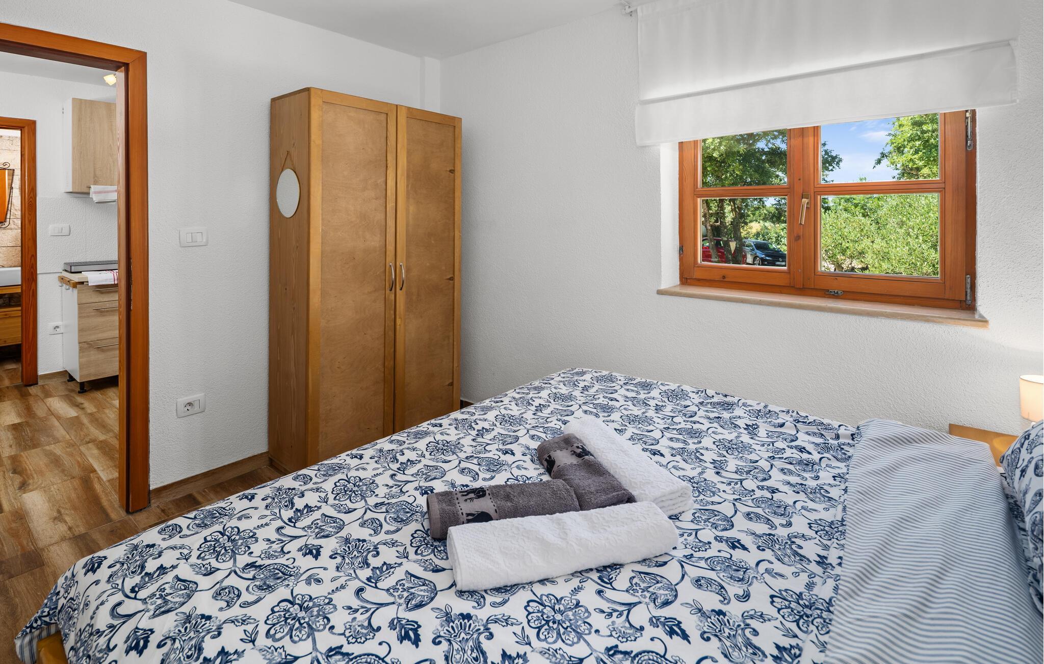 Dette koselig innredede steinhuset ønsker deg velkommen som en del av et velholdt kompleks, og inviterer deg til å lytte til sirissene som kvitrer under en solfylt pause. Planlegg dagens aktiviteter over en avslappet frokost, og slå dere ned i den innbydende sofaen om kvelden for å se en film eller spille et brettspill sammen.