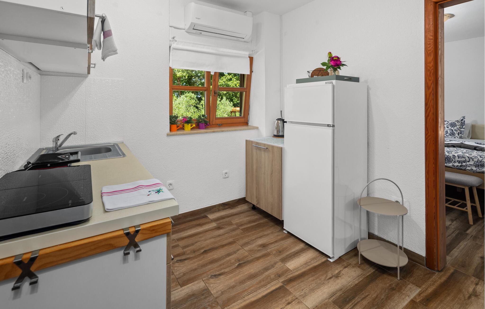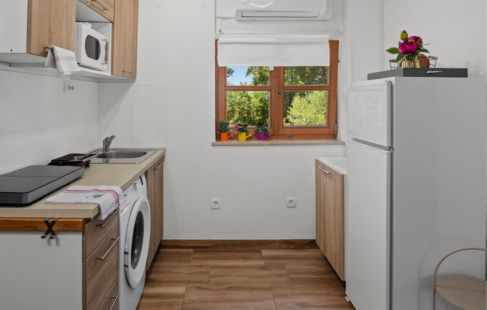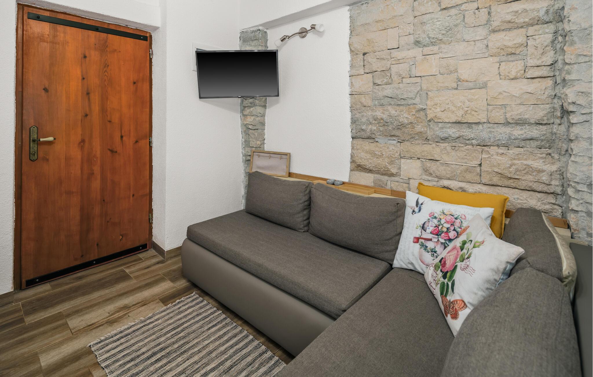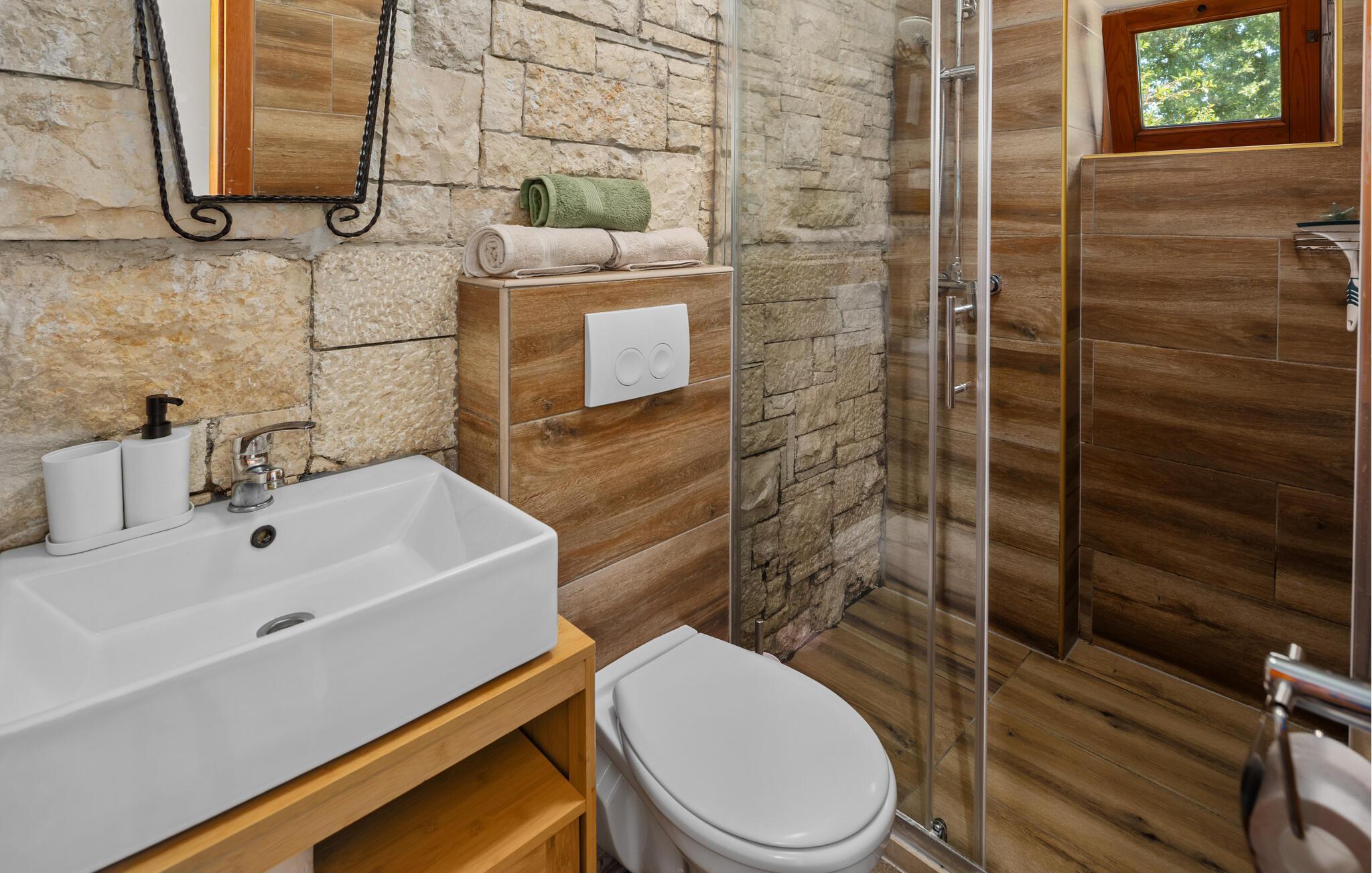 Dette koselig innredede steinhuset ønsker deg velkommen som en del av et velholdt kompleks, og inviterer deg til å lytte til sirissene som kvitrer under en solfylt pause. Planlegg dagens aktiviteter over en avslappet frokost, og slå dere ned i den innbydende sofaen om kvelden for å se en film eller spille et brettspill sammen.