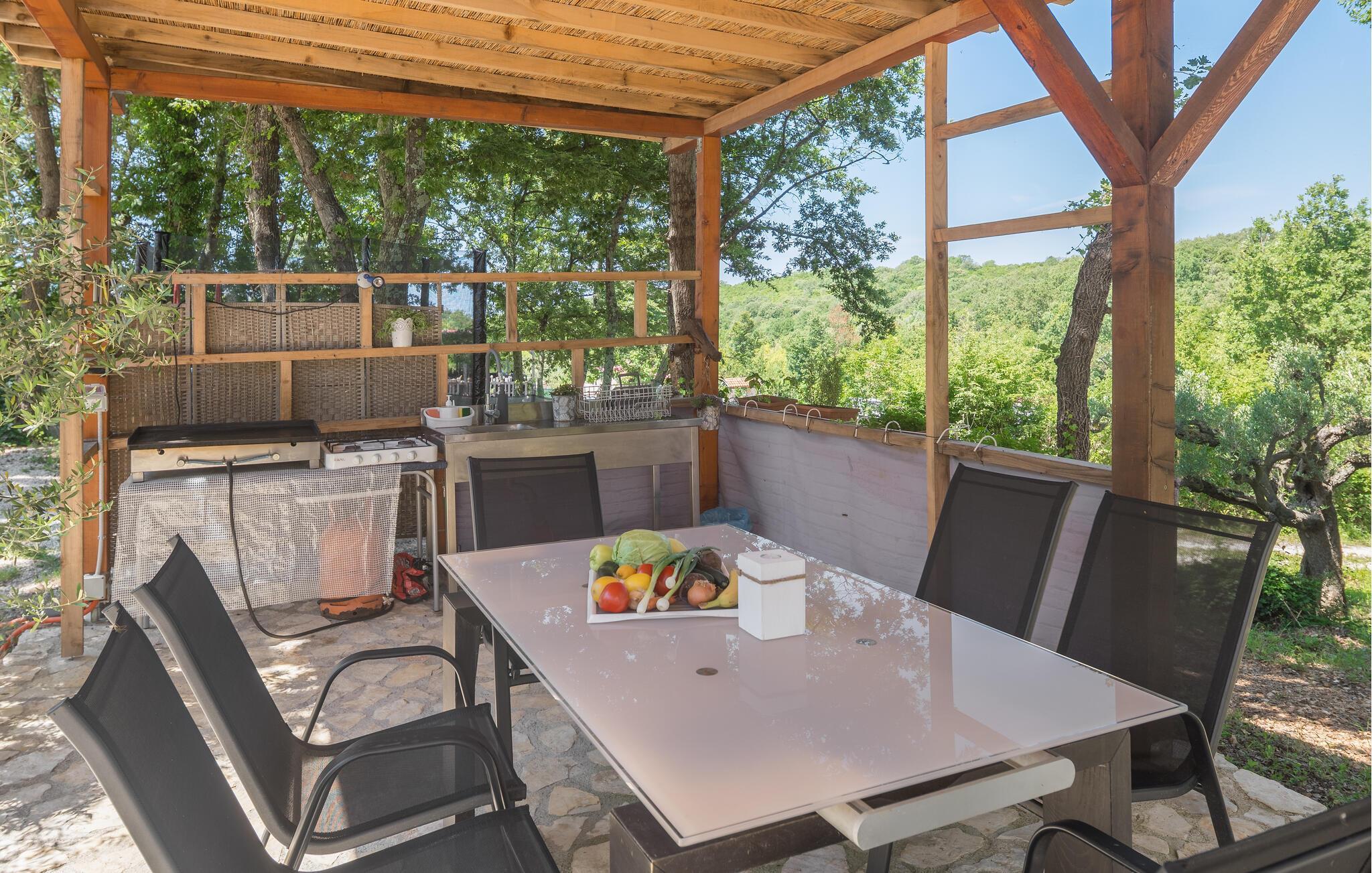 Den romslige, inngjerdede tomten er en ekte oase av fred. Se frem til avslappende stunder i boblebadet mens barna får nye venner på trampolinen. Lad batteriene på solsengen, og la den fredelige atmosfæren fortrylle deg om kvelden med et glass vin under åpen himmel.