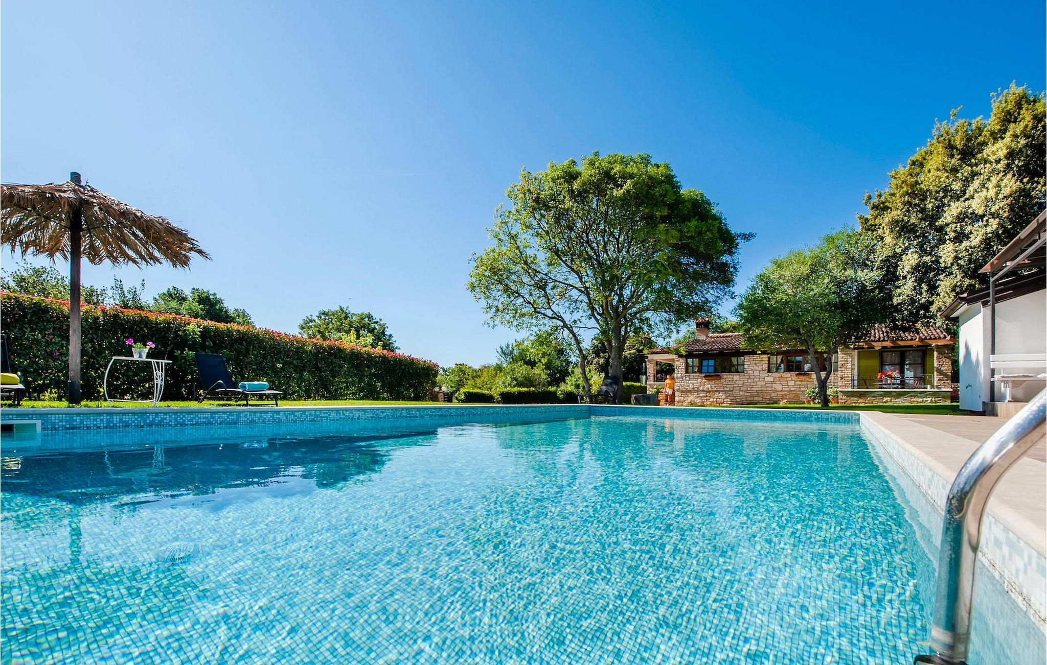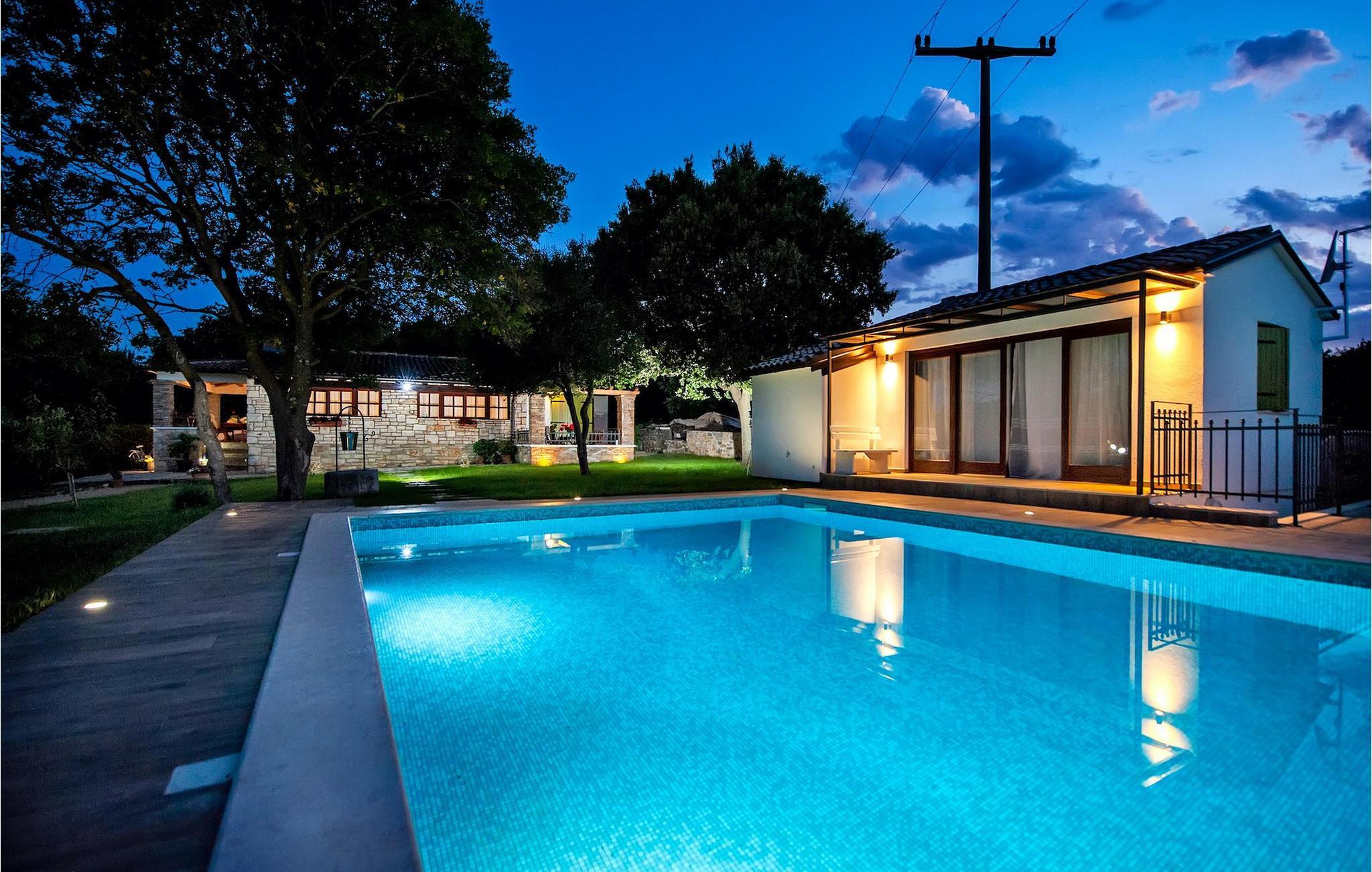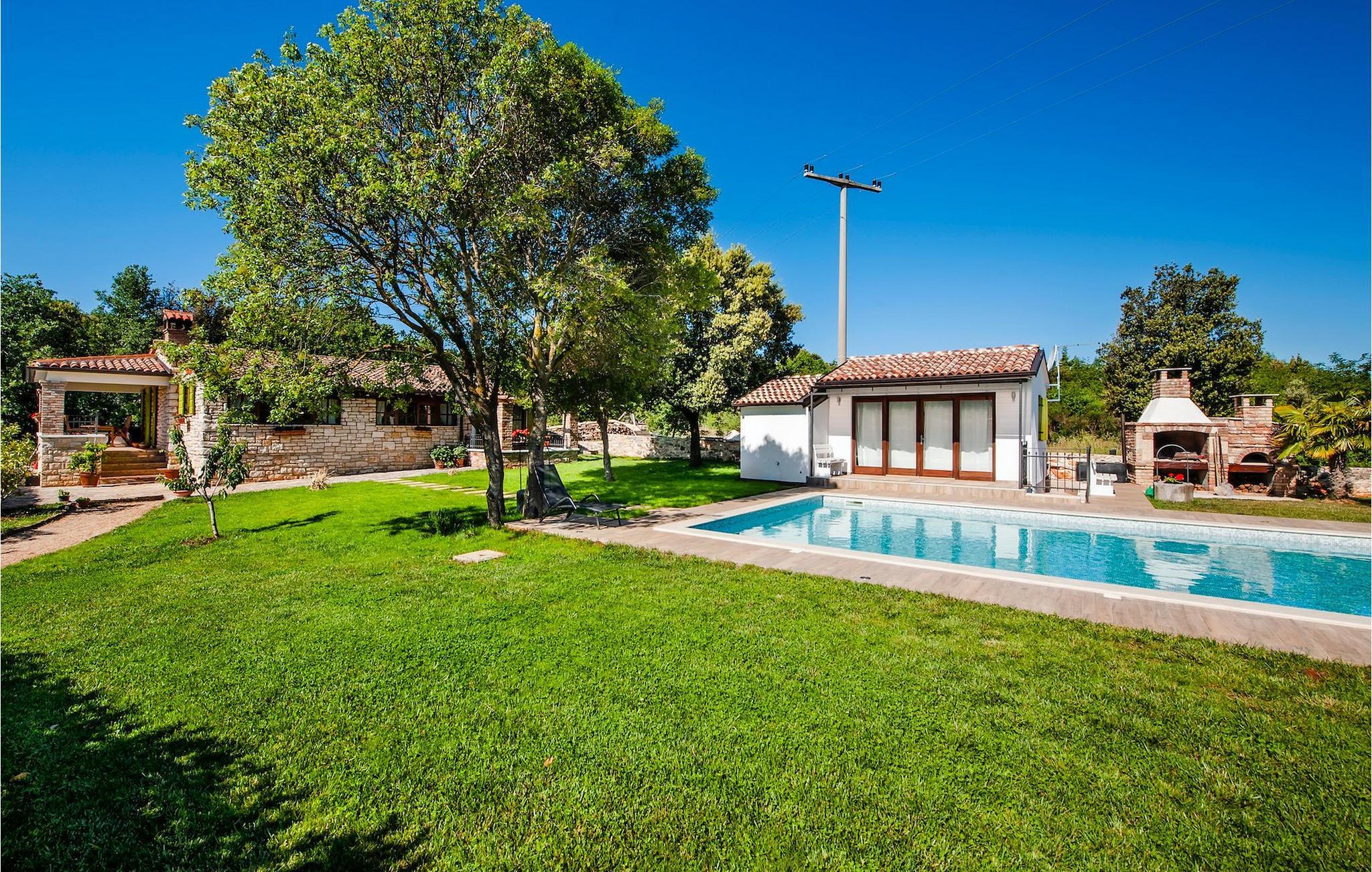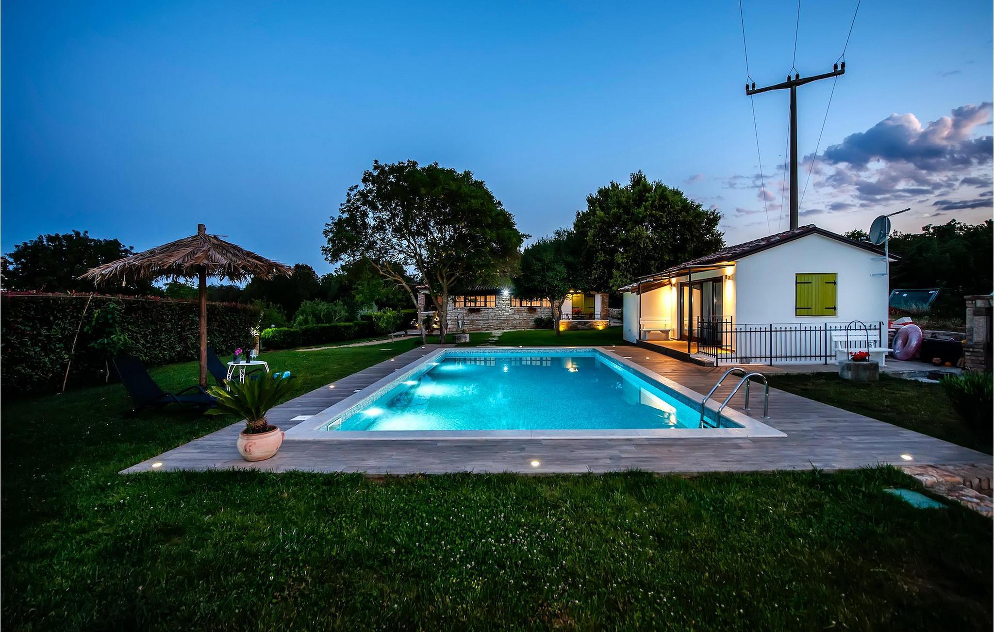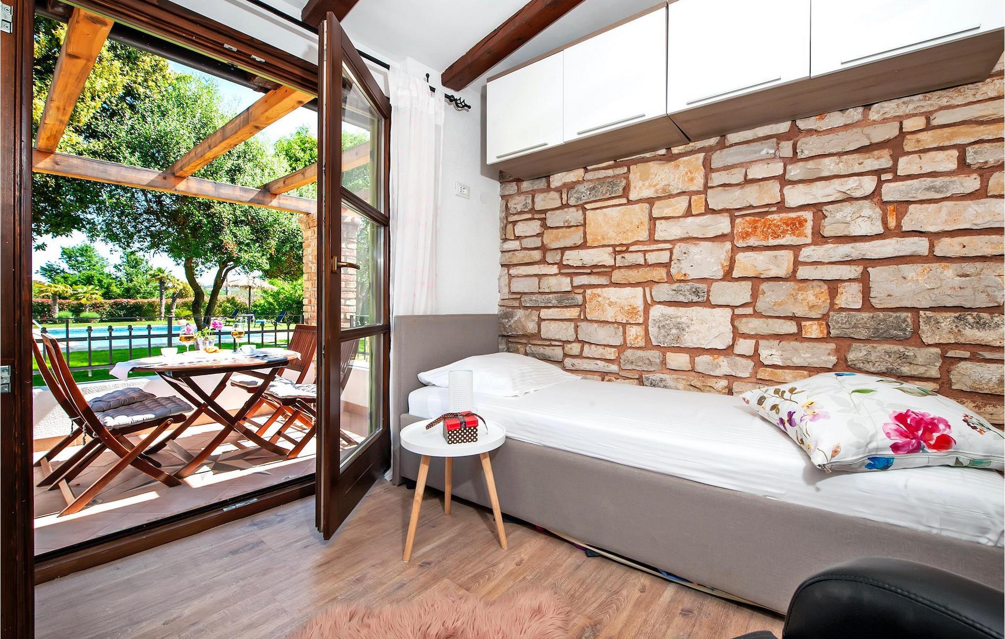 Den vakre, moderne Villa Antica ligger nær sjøen i utkanten av gamle Rovinj. En av de vakreste funksjonene er det store bassenget på gårdsplassen. Selve villaen har plass til opptil syv personer. Den består av to hus, hovedhuset og en studioleilighet. Hovedhuset har en åpen stue- og spisestue, samt tre soverom. Det ene soverommet er innredet med en dobbeltseng, mens de to andre rommene har en enkeltseng hver. Det er også et stort bad med badekar hvor du kan slappe av. Utenfor kan du slappe av med en kald drink på terrassen eller på solsengene ved bassenget, eller du kan svømme i det 72 m² store bassenget. Det er også en grill hvor du kan tilberede gode måltider. Ettromsleiligheten tilbyr litt mer privatliv sammenlignet med hovedhuset. Den består av en stue med en dobbeltseng for to personer og har et bad med dusj. Bestill Villa Antica for en avslappende ferie! Villa Antica ligger i en forstad til den gamle byen Rovinj, en av de vakreste og mest romantiske byene i Kroatia. Det er bare noen minutters gange fra Polari-stranden og noen minutters kjøring fra sentrum. I sentrum kan du utforske det gamle nettverket av steingater som fører til toppen av åsen der den vakre, gamle kirken St. Fra toppen av kirketårnet kan du nyte utsikten som strekker seg over hele byen og ikke etterlater noen likegyldig. Fra sentrum kan du spasere mot Zlatni Rt-parken, et av de vakreste landskapene i det vestlige Istria. Gå ikke glipp av en tur til Lim-kanalen, en av de mest attraktive naturressursene i det vestlige Istria, som ligger bare 15 kilometer utenfor Rovinj.