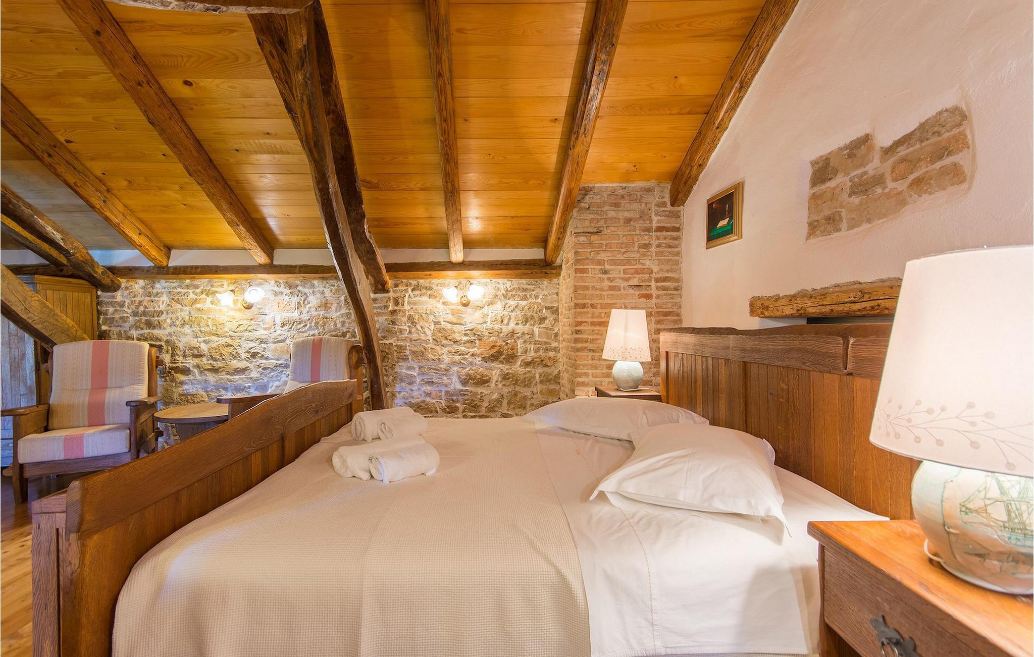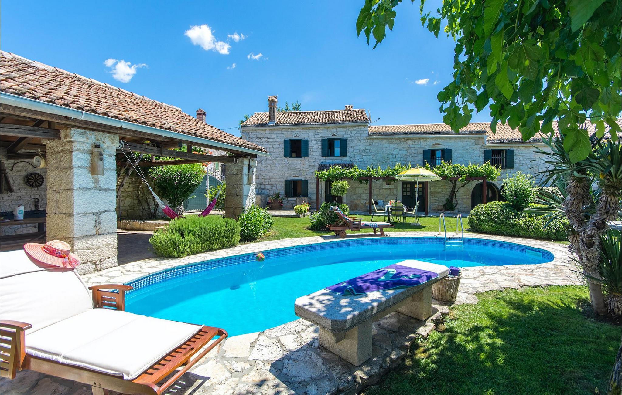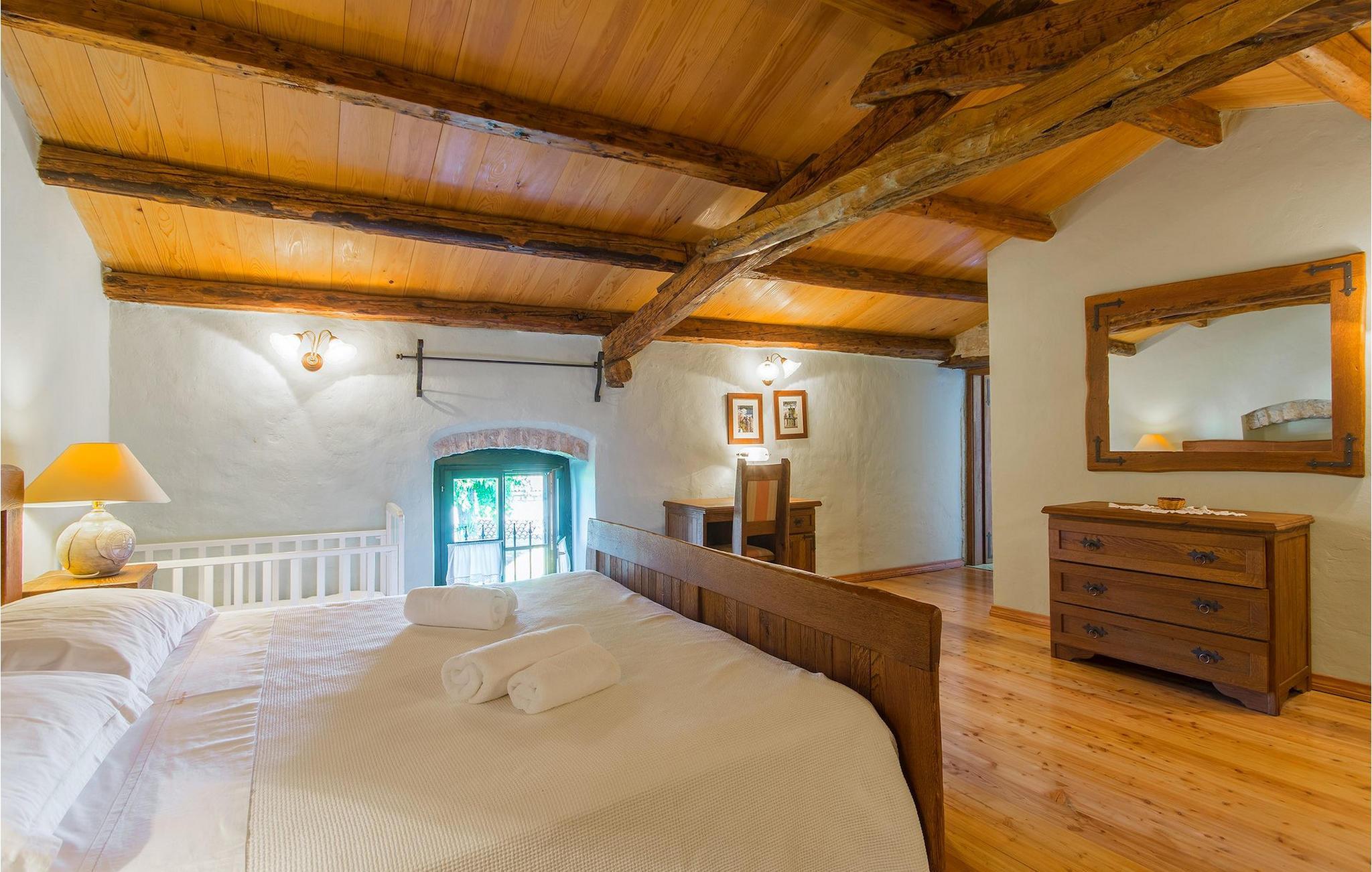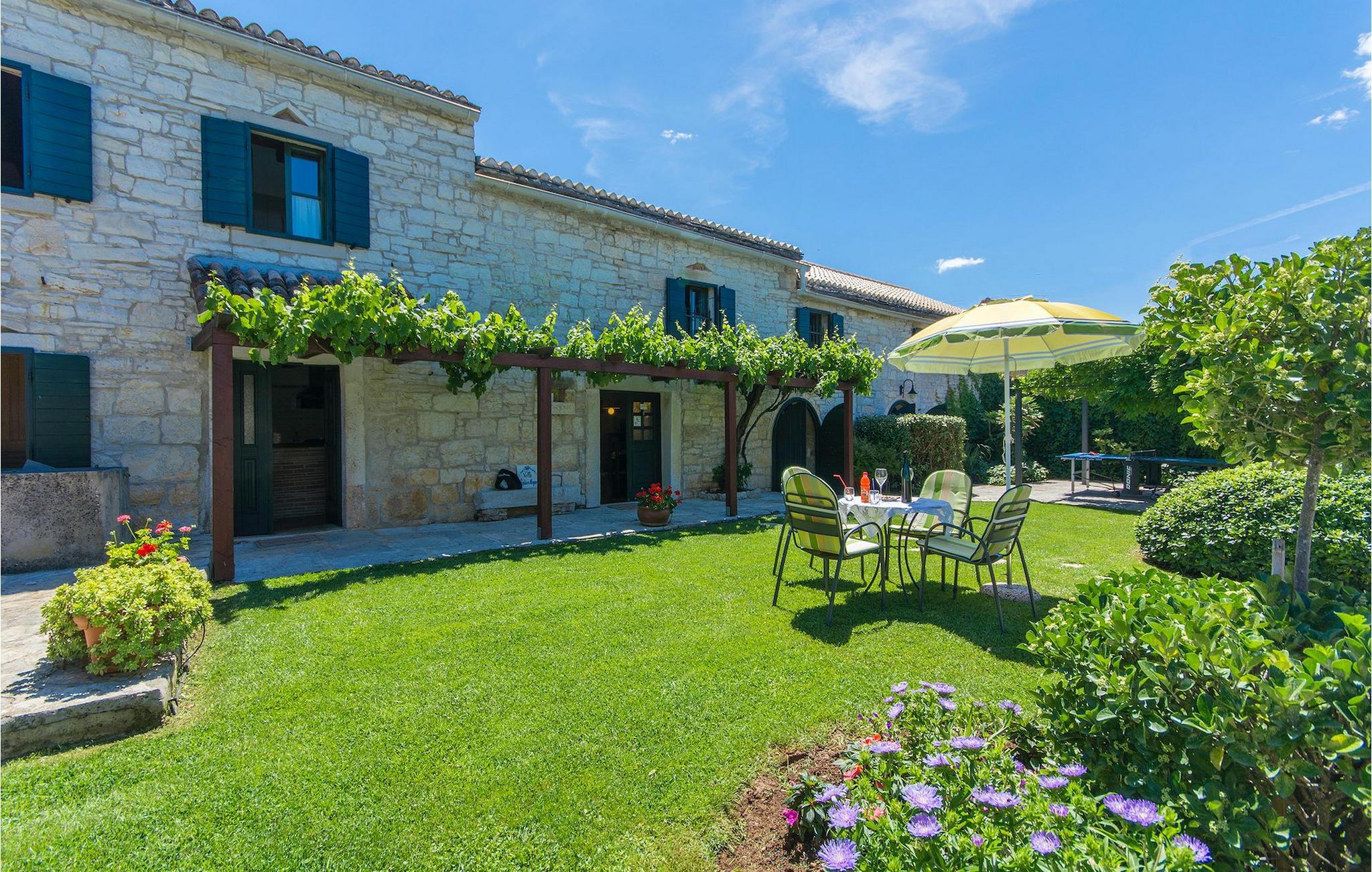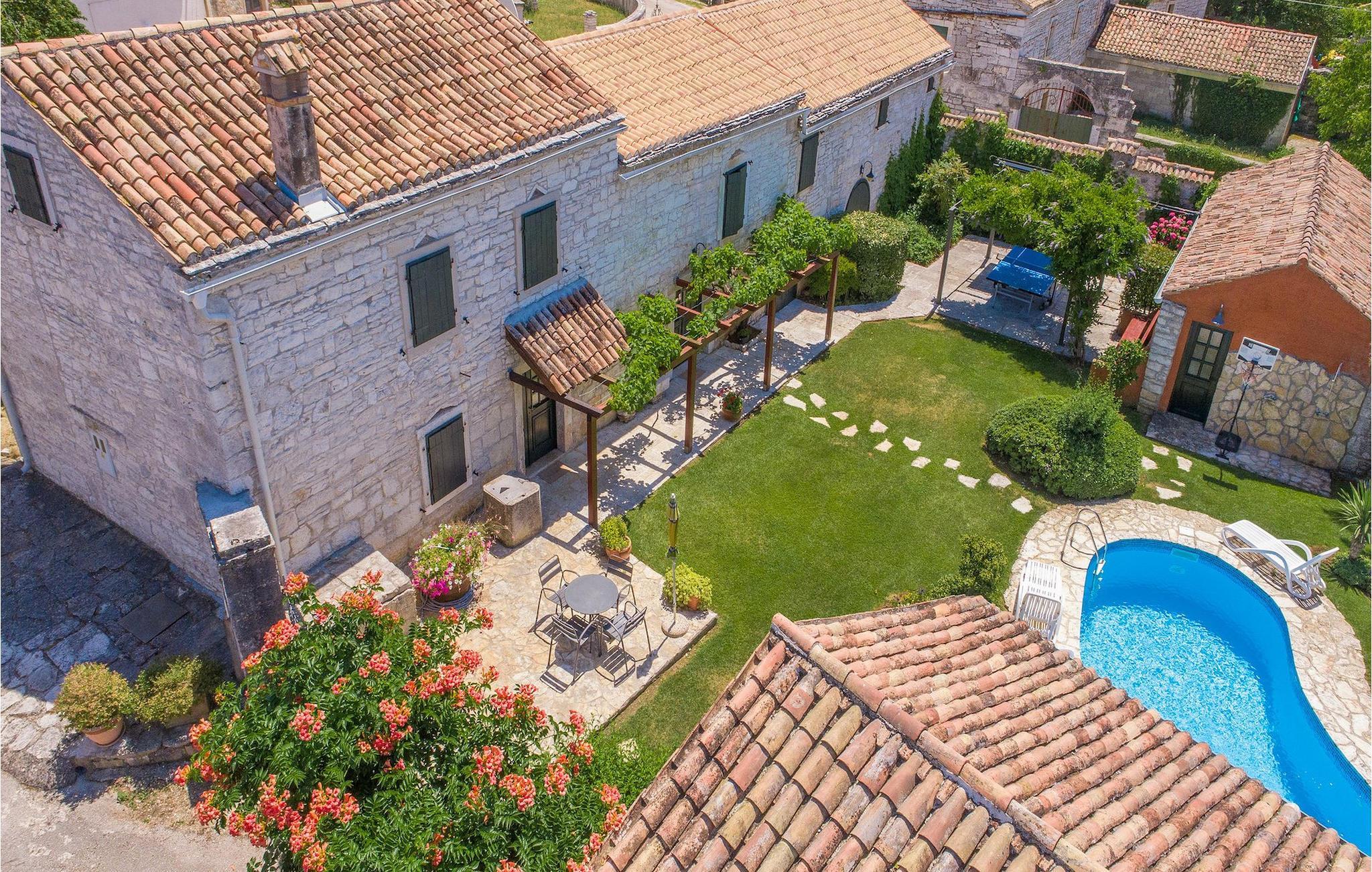 Det fortelles at sjørøverkapteinen Sir Henry Morgan på 1600-tallet plyndret Karibia, og på flukt fra loven seilte han så langt som til Lim Bay og landsbyen Mrgani, der han gjemte skatten sin. Den over hundre år gamle, ombygde villaen bærer fortsatt preg av den gamle kapteinen med sine steinvegger, bevisst avskallet murstein og puss på innerveggene, eikebjelker og antikk innredning og møbler. Kanskje er historien om kaptein Morgan og skatten hans bare et eventyr, men ferien du drømmer om kan bli virkelighet når du bestiller Villa Capt Morgan. I villaens første etasje er det en romslig stue med peis, kjøkken og spisestue i åpen planløsning. I første etasje er det et soverom med dobbeltseng og eget bad. Første etasje er delt i to deler, hver med separate trapper. Den venstre delen inneholder to soverom, ett med enkeltseng og ett med dobbeltseng, begge med eget bad. I den høyre delen av øverste etasje er det et stort hovedsoverom kalt "Captain's Room", som har eget bad med boblebad. På utsiden av villaen er det en stor uteplass med svømmebasseng og mye middelhavsgrønt. I hagen vokser det også et hundre år gammelt morbærtre som gir behagelig skygge på varme sommerdager. Hvis du reiser med barn, vil du sette stor pris på denne gårdsplassen, som byr på rikelig med plass til ubekymret lek. For ekstra moro har villaen bordtennis, bordfotball, basketballkurv og dart. På gårdsplassen er det også en stor, overbygd spiseplass med en stor peis der du kan tilberede et herlig familiemåltid og nyte det sammen. Her kan du virkelig slappe av og nyte freden og roen du drømmer om. Gjør drømmene til virkelighet ved å bestille Villa Capt Morgan med en gang, og unn deg selv den ferien du fortjener.Mrgani er en liten, rolig landsby over det istriske geologiske området Limkanalen, bare noen få kilometer fra kystbyen Rovinj. Dette fredelige og avslappende området er omgitt av grønne jorder og skoger, langt unna de store turistsentrene, men likevel nært nok hvis du vil utforske. Rovinj ligger bare 30 minutter unna med bil, og du vil nyte hvert minutt av kjøreturen gjennom det pittoreske, kuperte landskapet. Når du nærmer deg Rovinj, vil du umiddelbart bli fortryllet av byens skjønnhet, spesielt i solnedgangen, når du kan se fargerike hus på en kupert halvøy omgitt av varme farger fra den solkyssede sommerhimmelen og det krystallblå havet. Rovinj er en virkelig romantisk by. Ta en spasertur gjennom de smale steingatene som slynger seg sakte oppover til toppen av åsen der den gamle Eufemia-kirken fra 900-tallet ligger. Kirkeplatået byr på en vakker utsikt. Hvis du klatrer opp til toppen av kirketårnet, har du fri utsikt over hele byen og området rundt. I Rovinj finner du mange flotte restauranter og bistroer som vil tilfredsstille enhver gastronomisk entusiast. Istrien er godt forbundet med landeveier, slik at du enkelt kan utforske området. Planlegg dagsturer til kyst- og innlandsbyer som Pula, Groznjan, Motovun, Vodnjan, Porec og Novigrad, og benytt anledningen til å besøke Birjuni nasjonalpark med båt.