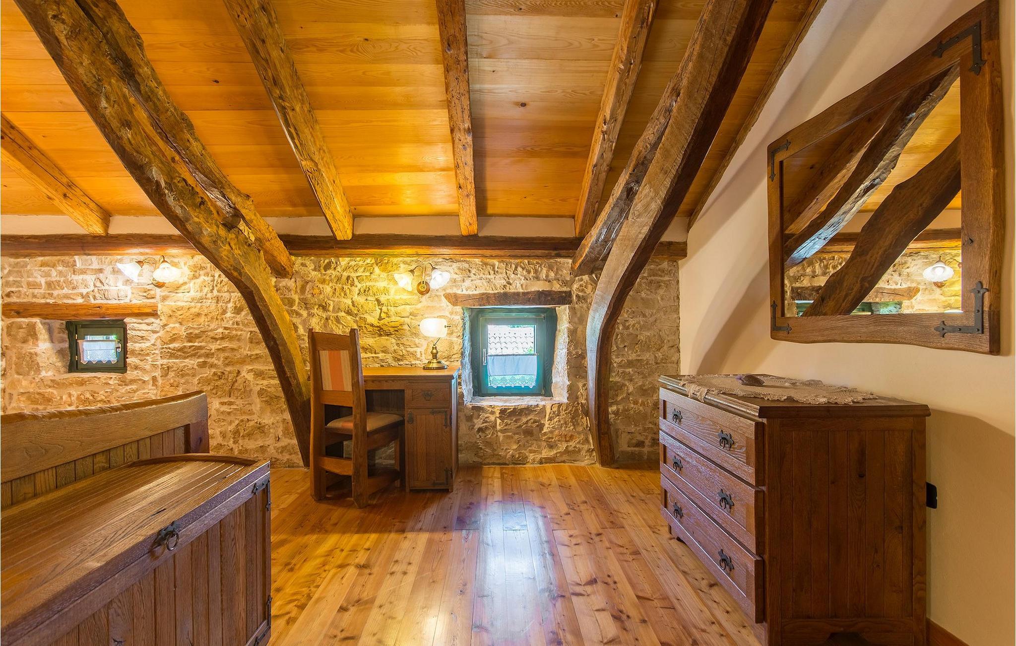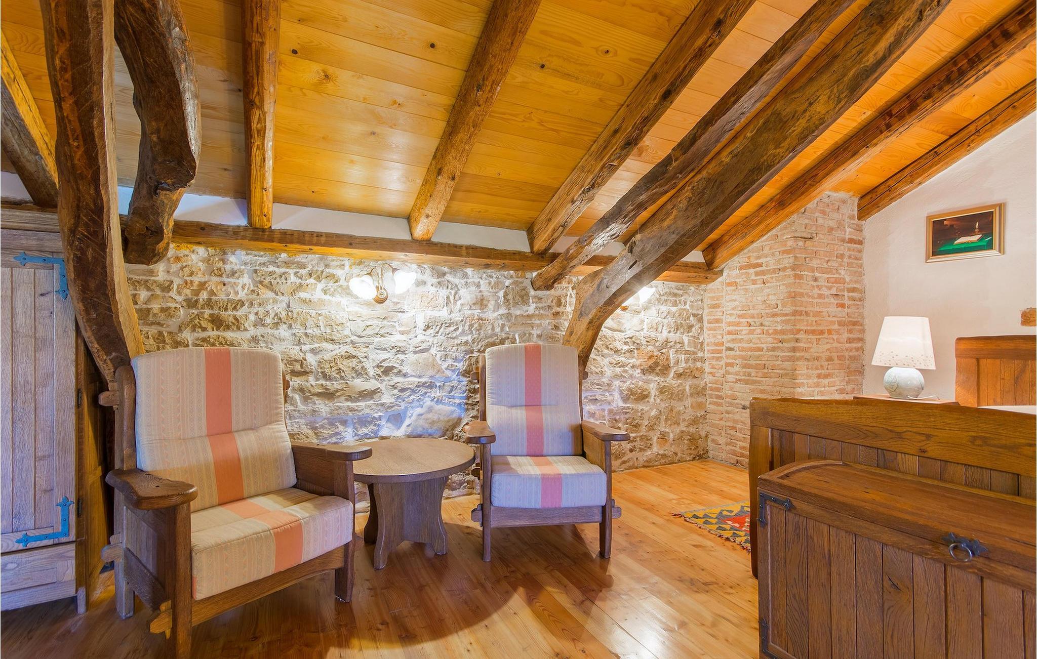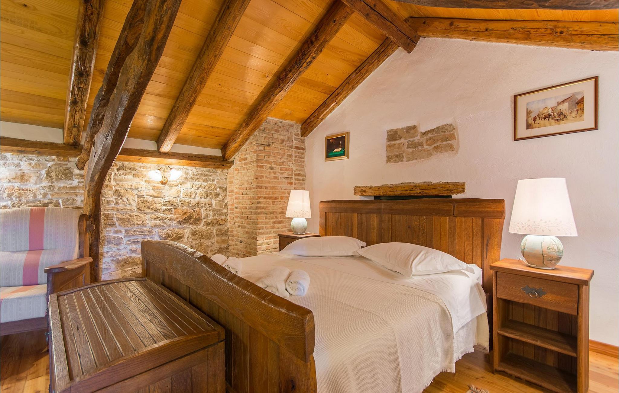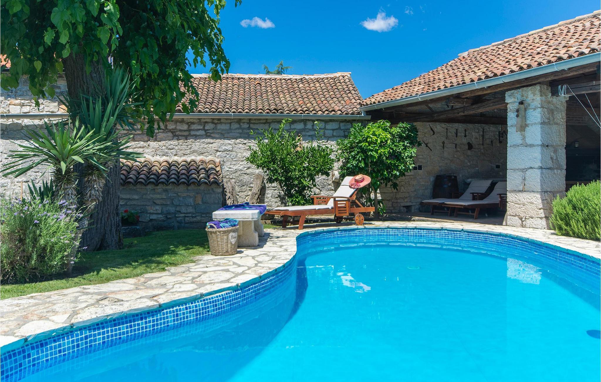 Det fortelles at sjørøverkapteinen Sir Henry Morgan på 1600-tallet plyndret Karibia, og på flukt fra loven seilte han så langt som til Lim Bay og landsbyen Mrgani, der han gjemte skatten sin. Den over hundre år gamle, ombygde villaen bærer fortsatt preg av den gamle kapteinen med sine steinvegger, bevisst avskallet murstein og puss på innerveggene, eikebjelker og antikk innredning og møbler. Kanskje er historien om kaptein Morgan og skatten hans bare et eventyr, men ferien du drømmer om kan bli virkelighet når du bestiller Villa Capt Morgan. I villaens første etasje er det en romslig stue med peis, kjøkken og spisestue i åpen planløsning. I første etasje er det et soverom med dobbeltseng og eget bad. Første etasje er delt i to deler, hver med separate trapper. Den venstre delen inneholder to soverom, ett med enkeltseng og ett med dobbeltseng, begge med eget bad. I den høyre delen av øverste etasje er det et stort hovedsoverom kalt "Captain's Room", som har eget bad med boblebad. På utsiden av villaen er det en stor uteplass med svømmebasseng og mye middelhavsgrønt. I hagen vokser det også et hundre år gammelt morbærtre som gir behagelig skygge på varme sommerdager. Hvis du reiser med barn, vil du sette stor pris på denne gårdsplassen, som byr på rikelig med plass til ubekymret lek. For ekstra moro har villaen bordtennis, bordfotball, basketballkurv og dart. På gårdsplassen er det også en stor, overbygd spiseplass med en stor peis der du kan tilberede et herlig familiemåltid og nyte det sammen. Her kan du virkelig slappe av og nyte freden og roen du drømmer om. Gjør drømmene til virkelighet ved å bestille Villa Capt Morgan med en gang, og unn deg selv den ferien du fortjener.Mrgani er en liten, rolig landsby over det istriske geologiske området Limkanalen, bare noen få kilometer fra kystbyen Rovinj. Dette fredelige og avslappende området er omgitt av grønne jorder og skoger, langt unna de store turistsentrene, men likevel nært nok hvis du vil utforske. Rovinj ligger bare 30 minutter unna med bil, og du vil nyte hvert minutt av kjøreturen gjennom det pittoreske, kuperte landskapet. Når du nærmer deg Rovinj, vil du umiddelbart bli fortryllet av byens skjønnhet, spesielt i solnedgangen, når du kan se fargerike hus på en kupert halvøy omgitt av varme farger fra den solkyssede sommerhimmelen og det krystallblå havet. Rovinj er en virkelig romantisk by. Ta en spasertur gjennom de smale steingatene som slynger seg sakte oppover til toppen av åsen der den gamle Eufemia-kirken fra 900-tallet ligger. Kirkeplatået byr på en vakker utsikt. Hvis du klatrer opp til toppen av kirketårnet, har du fri utsikt over hele byen og området rundt. I Rovinj finner du mange flotte restauranter og bistroer som vil tilfredsstille enhver gastronomisk entusiast. Istrien er godt forbundet med landeveier, slik at du enkelt kan utforske området. Planlegg dagsturer til kyst- og innlandsbyer som Pula, Groznjan, Motovun, Vodnjan, Porec og Novigrad, og benytt anledningen til å besøke Birjuni nasjonalpark med båt.