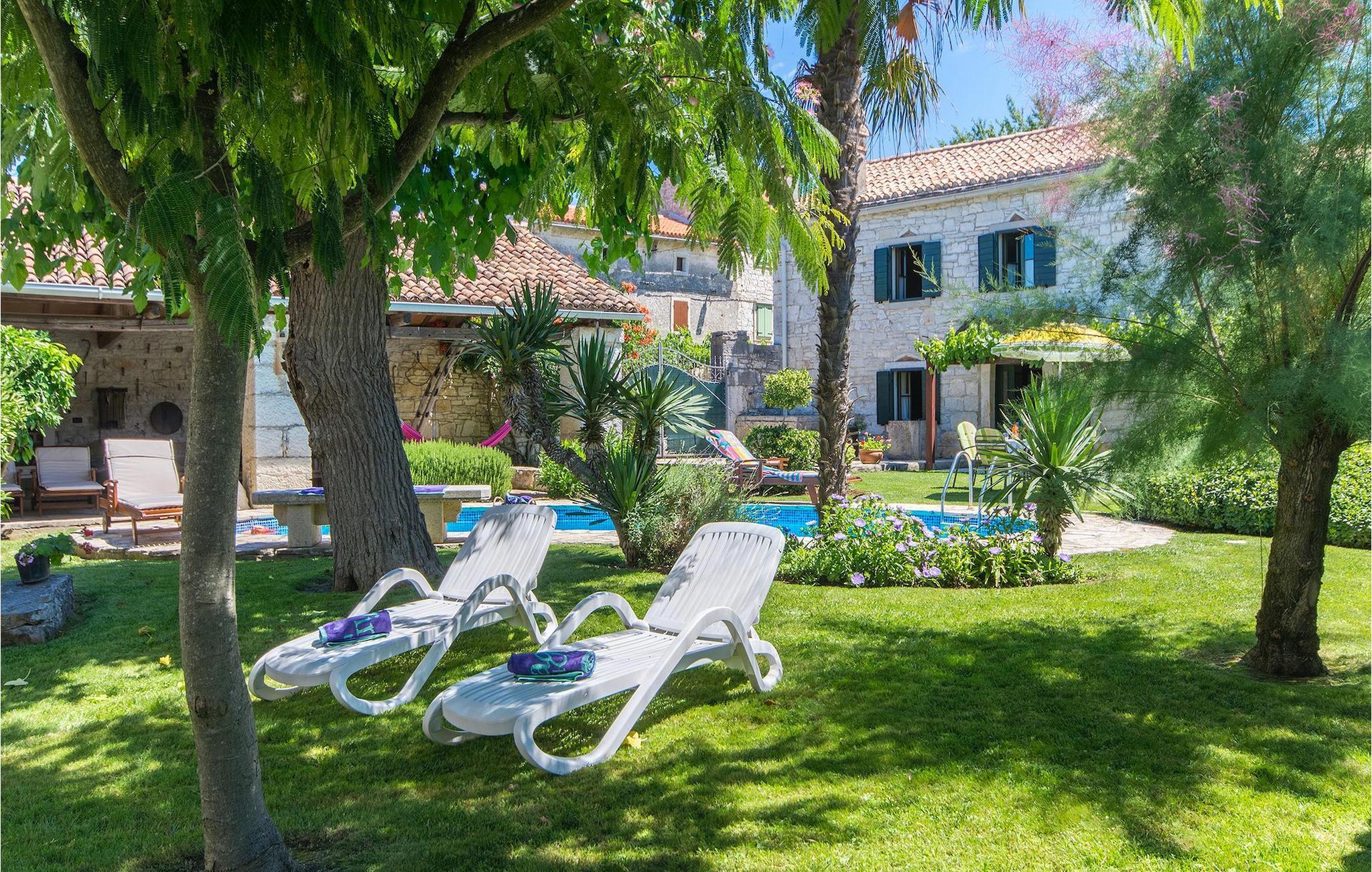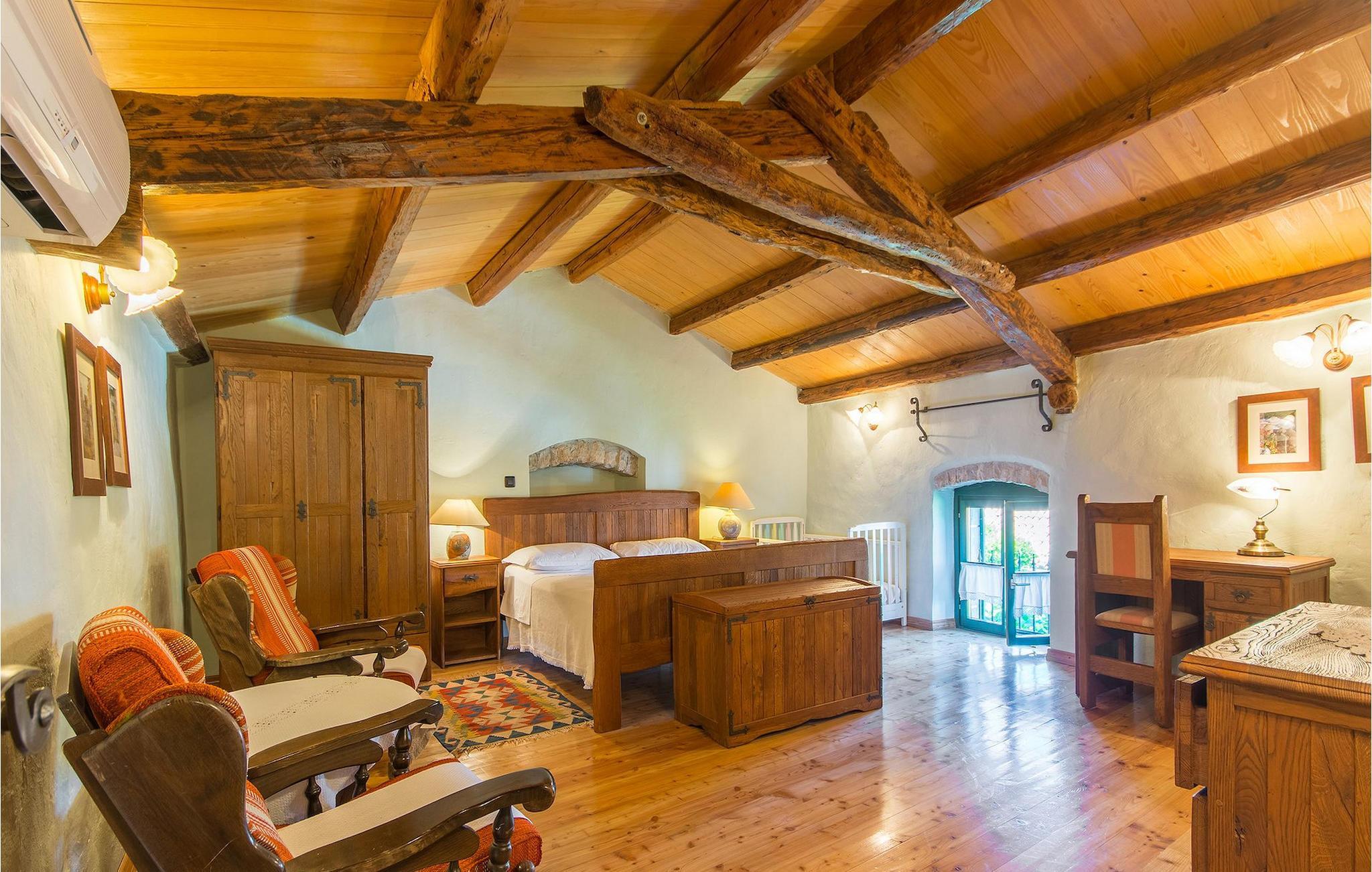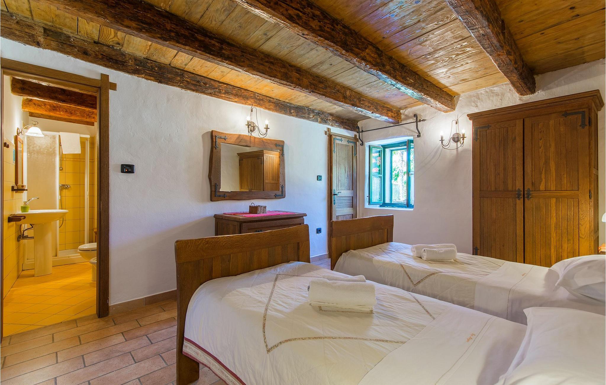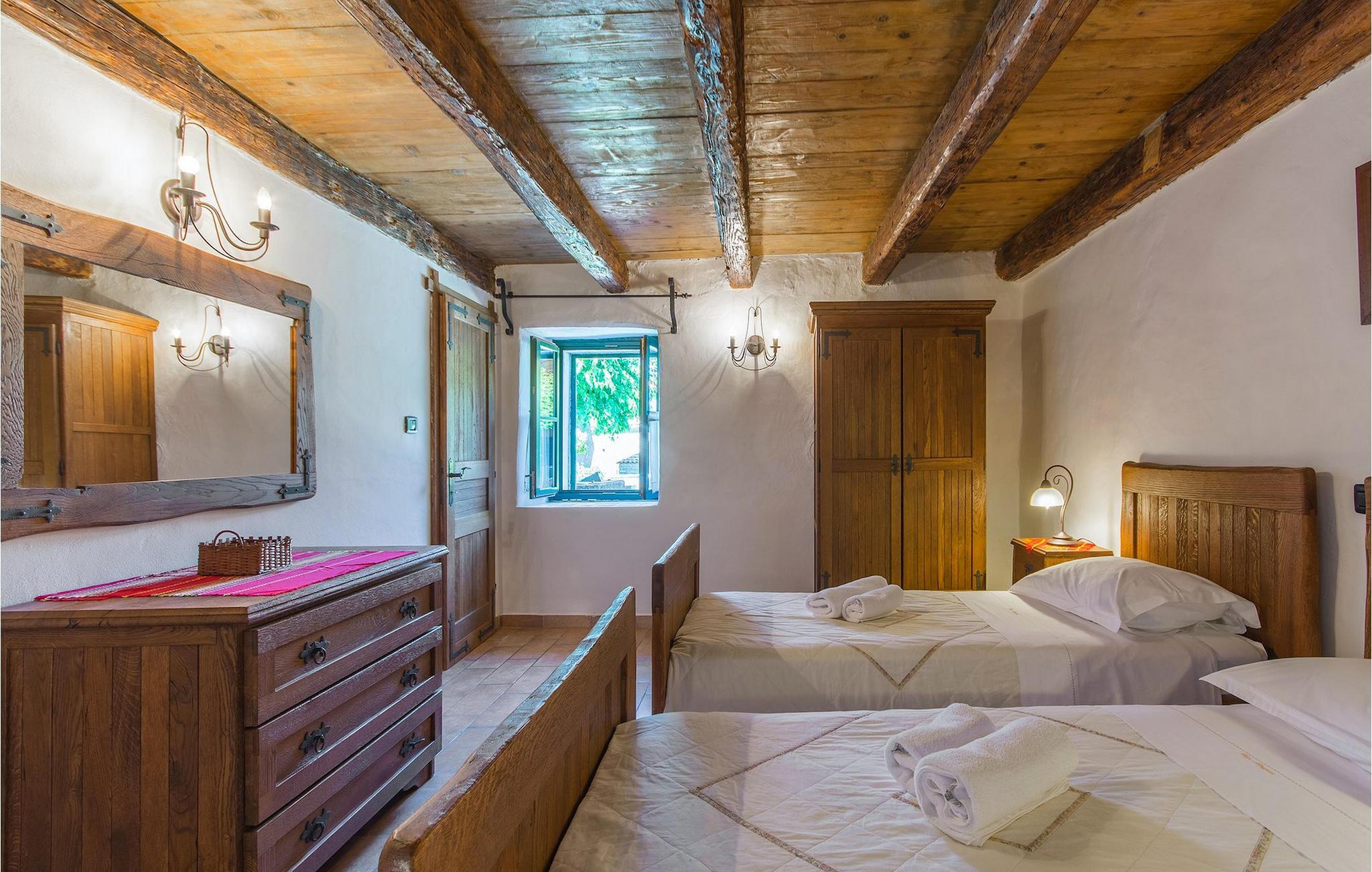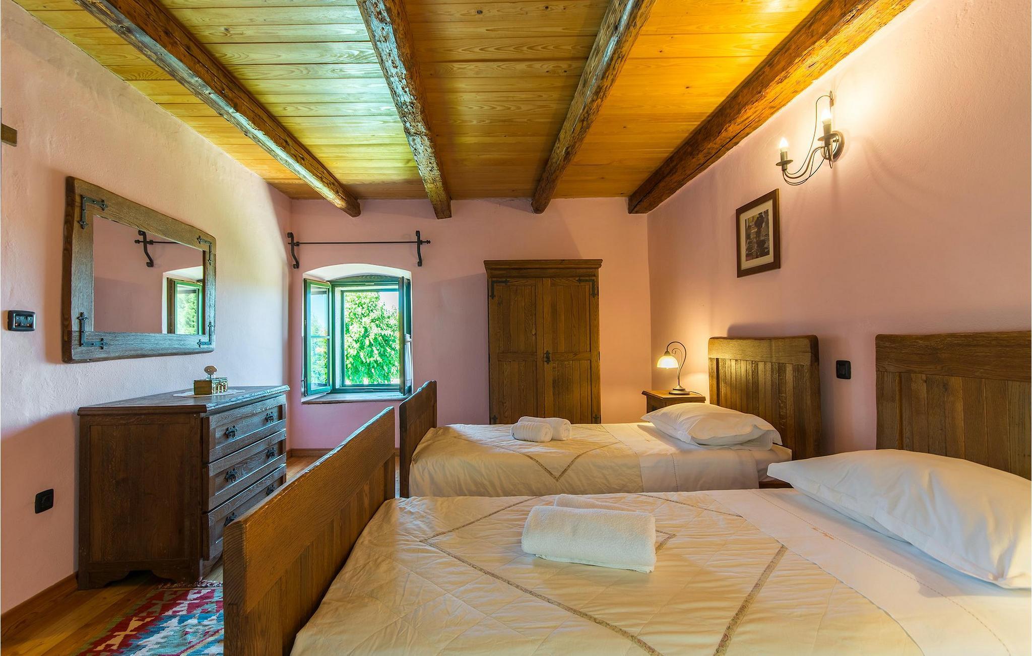 Det fortelles at sjørøverkapteinen Sir Henry Morgan på 1600-tallet plyndret Karibia, og på flukt fra loven seilte han så langt som til Lim Bay og landsbyen Mrgani, der han gjemte skatten sin. Den over hundre år gamle, ombygde villaen bærer fortsatt preg av den gamle kapteinen med sine steinvegger, bevisst avskallet murstein og puss på innerveggene, eikebjelker og antikk innredning og møbler. Kanskje er historien om kaptein Morgan og skatten hans bare et eventyr, men ferien du drømmer om kan bli virkelighet når du bestiller Villa Capt Morgan. I villaens første etasje er det en romslig stue med peis, kjøkken og spisestue i åpen planløsning. I første etasje er det et soverom med dobbeltseng og eget bad. Første etasje er delt i to deler, hver med separate trapper. Den venstre delen inneholder to soverom, ett med enkeltseng og ett med dobbeltseng, begge med eget bad. I den høyre delen av øverste etasje er det et stort hovedsoverom kalt "Captain's Room", som har eget bad med boblebad. På utsiden av villaen er det en stor uteplass med svømmebasseng og mye middelhavsgrønt. I hagen vokser det også et hundre år gammelt morbærtre som gir behagelig skygge på varme sommerdager. Hvis du reiser med barn, vil du sette stor pris på denne gårdsplassen, som byr på rikelig med plass til ubekymret lek. For ekstra moro har villaen bordtennis, bordfotball, basketballkurv og dart. På gårdsplassen er det også en stor, overbygd spiseplass med en stor peis der du kan tilberede et herlig familiemåltid og nyte det sammen. Her kan du virkelig slappe av og nyte freden og roen du drømmer om. Gjør drømmene til virkelighet ved å bestille Villa Capt Morgan med en gang, og unn deg selv den ferien du fortjener.Mrgani er en liten, rolig landsby over det istriske geologiske området Limkanalen, bare noen få kilometer fra kystbyen Rovinj. Dette fredelige og avslappende området er omgitt av grønne jorder og skoger, langt unna de store turistsentrene, men likevel nært nok hvis du vil utforske. Rovinj ligger bare 30 minutter unna med bil, og du vil nyte hvert minutt av kjøreturen gjennom det pittoreske, kuperte landskapet. Når du nærmer deg Rovinj, vil du umiddelbart bli fortryllet av byens skjønnhet, spesielt i solnedgangen, når du kan se fargerike hus på en kupert halvøy omgitt av varme farger fra den solkyssede sommerhimmelen og det krystallblå havet. Rovinj er en virkelig romantisk by. Ta en spasertur gjennom de smale steingatene som slynger seg sakte oppover til toppen av åsen der den gamle Eufemia-kirken fra 900-tallet ligger. Kirkeplatået byr på en vakker utsikt. Hvis du klatrer opp til toppen av kirketårnet, har du fri utsikt over hele byen og området rundt. I Rovinj finner du mange flotte restauranter og bistroer som vil tilfredsstille enhver gastronomisk entusiast. Istrien er godt forbundet med landeveier, slik at du enkelt kan utforske området. Planlegg dagsturer til kyst- og innlandsbyer som Pula, Groznjan, Motovun, Vodnjan, Porec og Novigrad, og benytt anledningen til å besøke Birjuni nasjonalpark med båt.