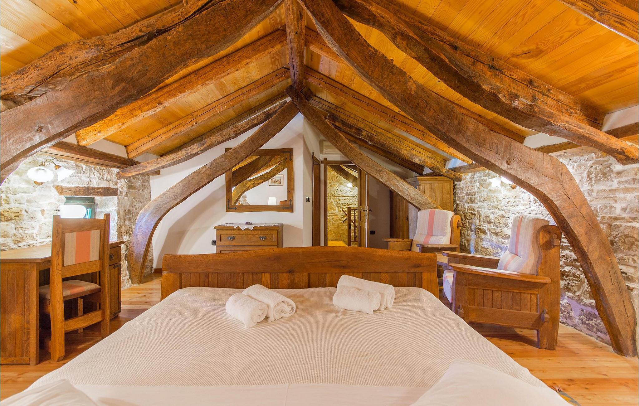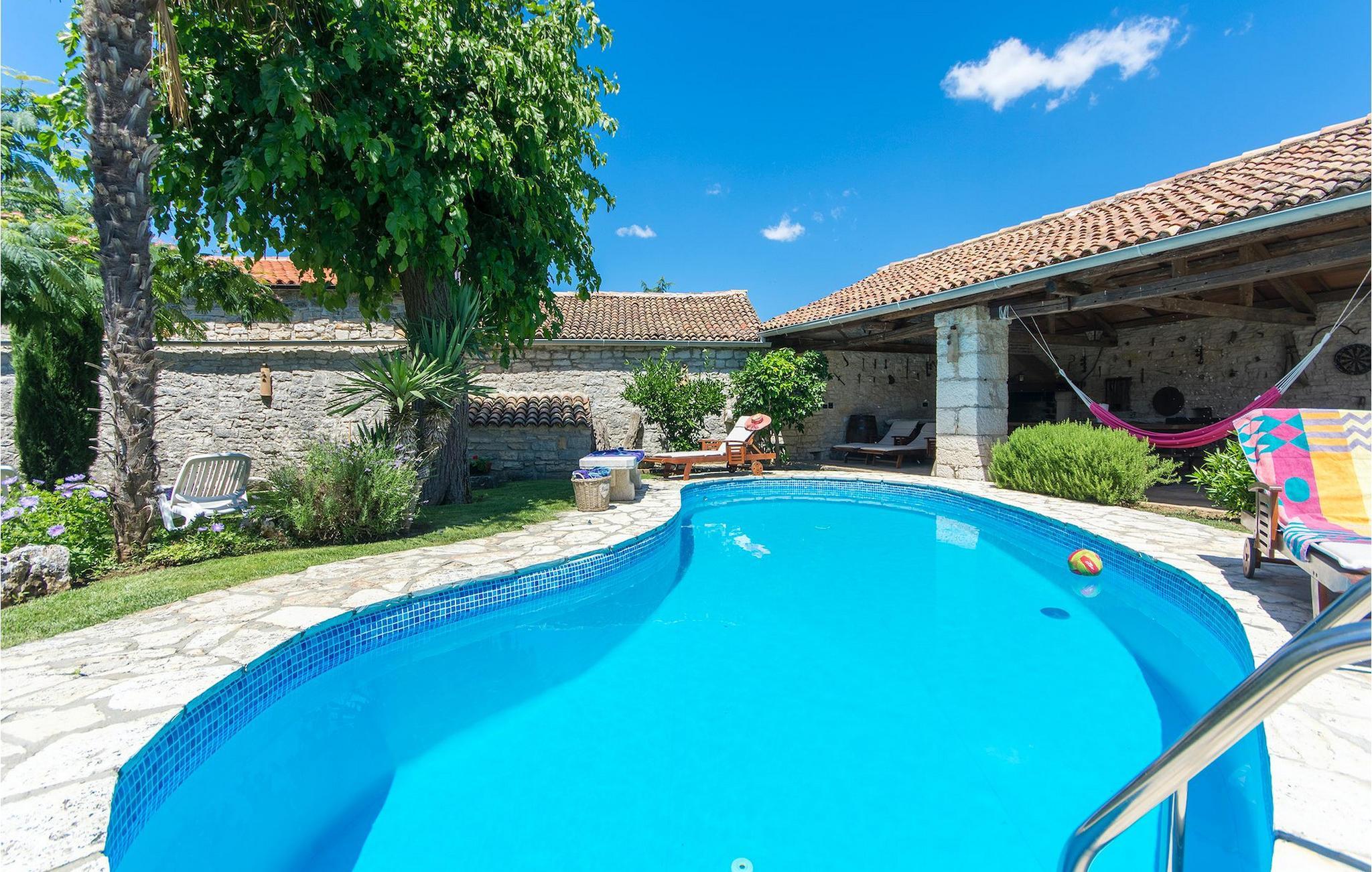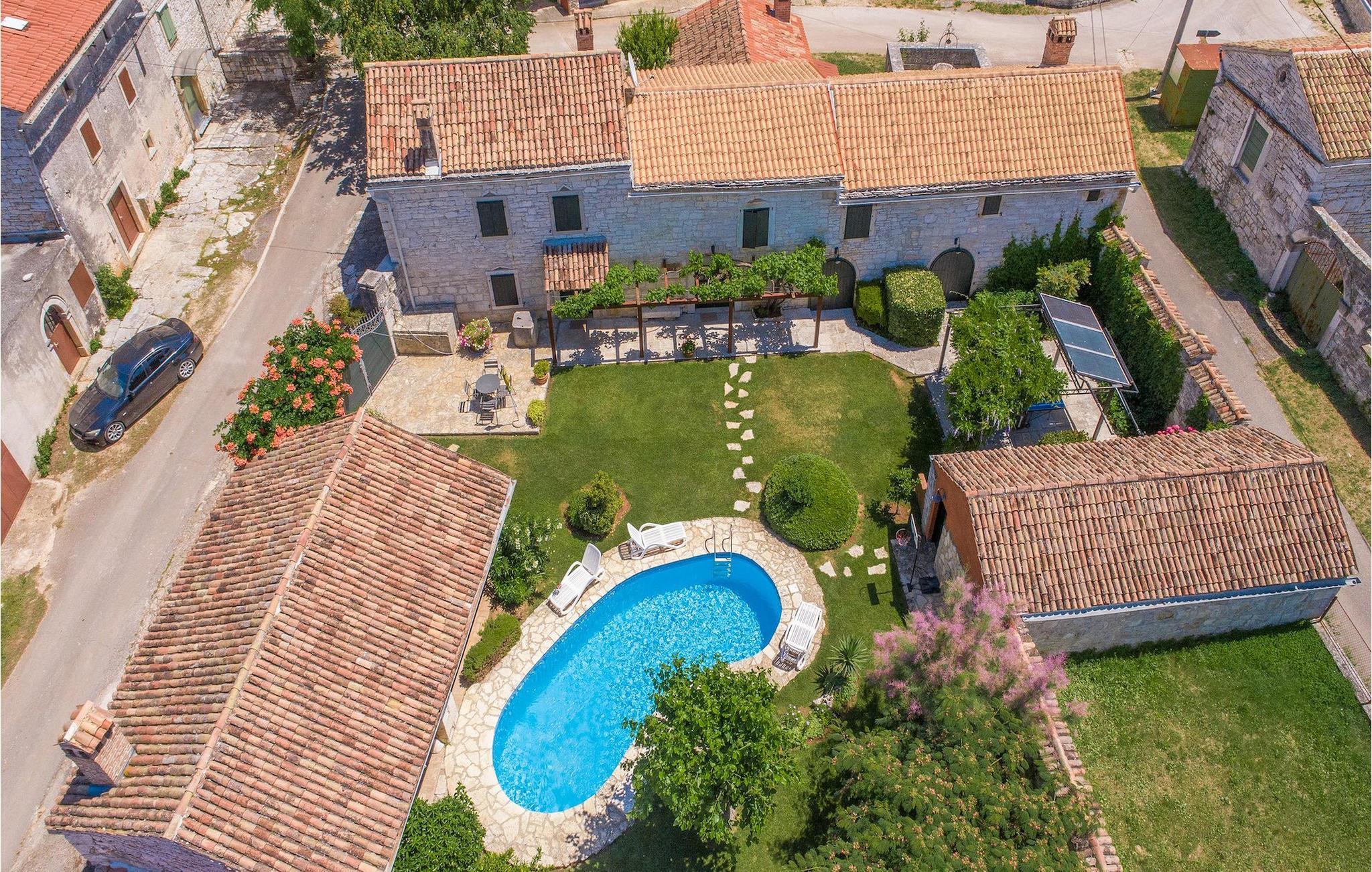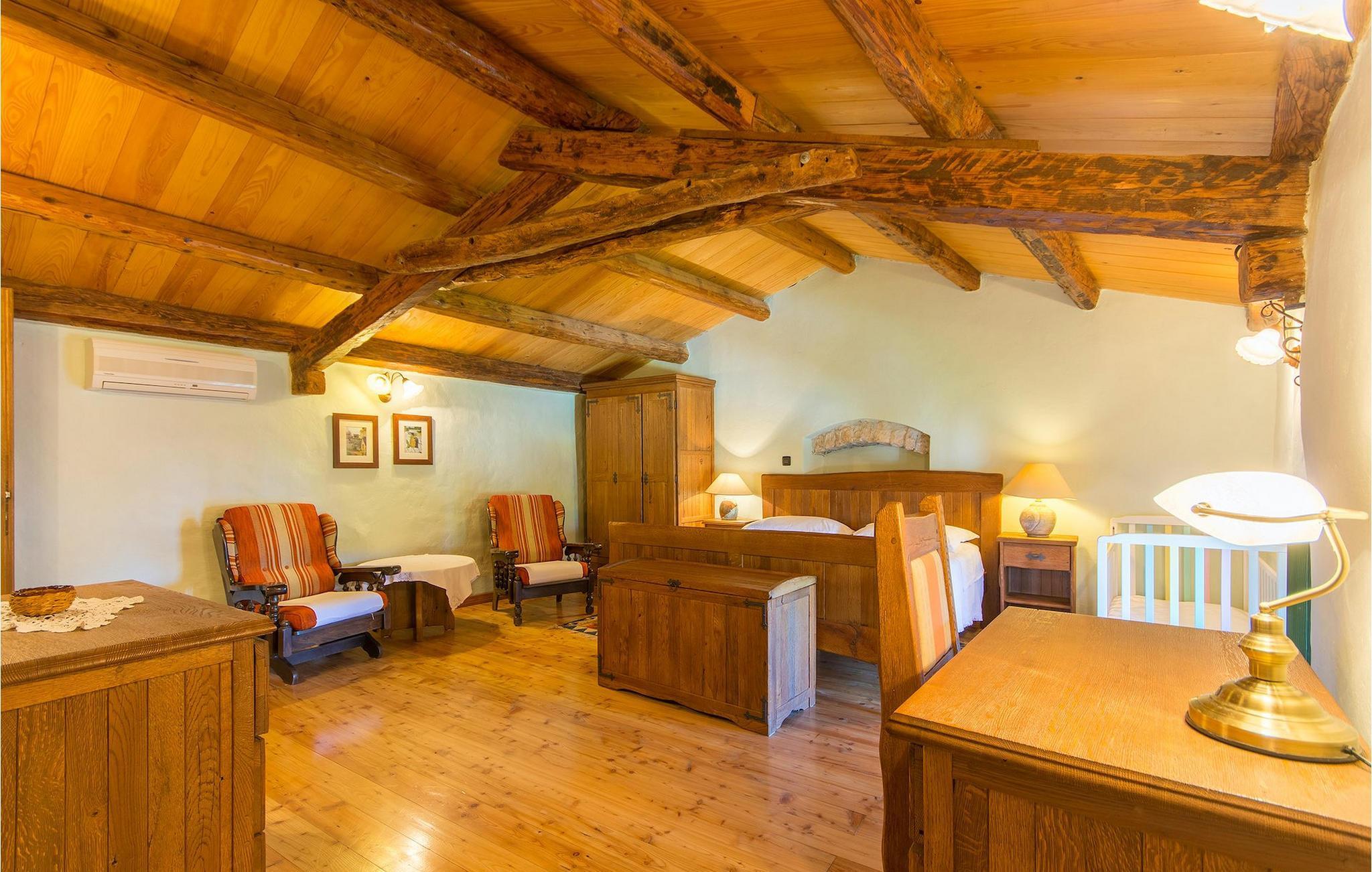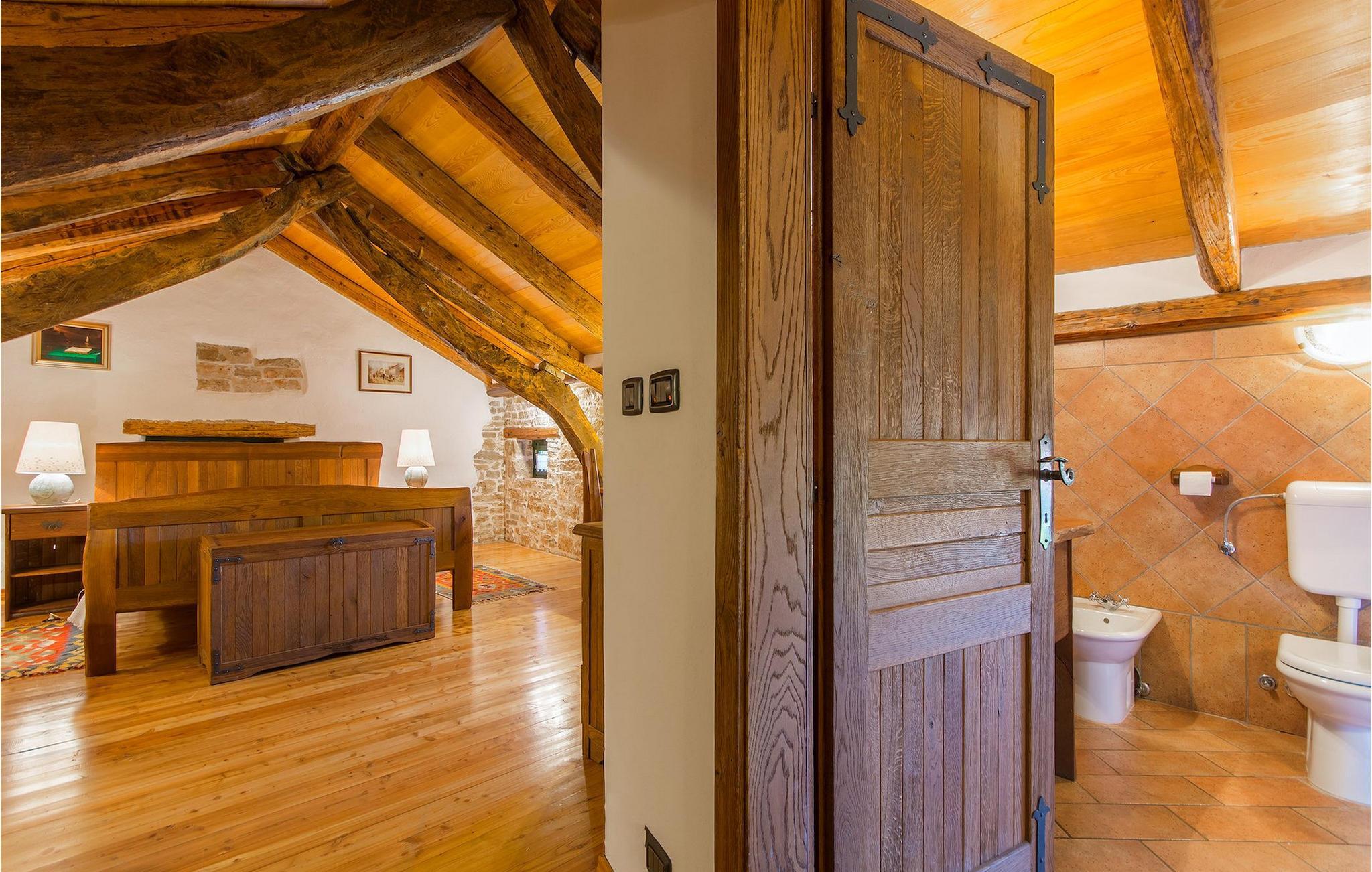 Det fortelles at sjørøverkapteinen Sir Henry Morgan på 1600-tallet plyndret Karibia, og på flukt fra loven seilte han så langt som til Lim Bay og landsbyen Mrgani, der han gjemte skatten sin. Den over hundre år gamle, ombygde villaen bærer fortsatt preg av den gamle kapteinen med sine steinvegger, bevisst avskallet murstein og puss på innerveggene, eikebjelker og antikk innredning og møbler. Kanskje er historien om kaptein Morgan og skatten hans bare et eventyr, men ferien du drømmer om kan bli virkelighet når du bestiller Villa Capt Morgan. I villaens første etasje er det en romslig stue med peis, kjøkken og spisestue i åpen planløsning. I første etasje er det et soverom med dobbeltseng og eget bad. Første etasje er delt i to deler, hver med separate trapper. Den venstre delen inneholder to soverom, ett med enkeltseng og ett med dobbeltseng, begge med eget bad. I den høyre delen av øverste etasje er det et stort hovedsoverom kalt "Captain's Room", som har eget bad med boblebad. På utsiden av villaen er det en stor uteplass med svømmebasseng og mye middelhavsgrønt. I hagen vokser det også et hundre år gammelt morbærtre som gir behagelig skygge på varme sommerdager. Hvis du reiser med barn, vil du sette stor pris på denne gårdsplassen, som byr på rikelig med plass til ubekymret lek. For ekstra moro har villaen bordtennis, bordfotball, basketballkurv og dart. På gårdsplassen er det også en stor, overbygd spiseplass med en stor peis der du kan tilberede et herlig familiemåltid og nyte det sammen. Her kan du virkelig slappe av og nyte freden og roen du drømmer om. Gjør drømmene til virkelighet ved å bestille Villa Capt Morgan med en gang, og unn deg selv den ferien du fortjener.Mrgani er en liten, rolig landsby over det istriske geologiske området Limkanalen, bare noen få kilometer fra kystbyen Rovinj. Dette fredelige og avslappende området er omgitt av grønne jorder og skoger, langt unna de store turistsentrene, men likevel nært nok hvis du vil utforske. Rovinj ligger bare 30 minutter unna med bil, og du vil nyte hvert minutt av kjøreturen gjennom det pittoreske, kuperte landskapet. Når du nærmer deg Rovinj, vil du umiddelbart bli fortryllet av byens skjønnhet, spesielt i solnedgangen, når du kan se fargerike hus på en kupert halvøy omgitt av varme farger fra den solkyssede sommerhimmelen og det krystallblå havet. Rovinj er en virkelig romantisk by. Ta en spasertur gjennom de smale steingatene som slynger seg sakte oppover til toppen av åsen der den gamle Eufemia-kirken fra 900-tallet ligger. Kirkeplatået byr på en vakker utsikt. Hvis du klatrer opp til toppen av kirketårnet, har du fri utsikt over hele byen og området rundt. I Rovinj finner du mange flotte restauranter og bistroer som vil tilfredsstille enhver gastronomisk entusiast. Istrien er godt forbundet med landeveier, slik at du enkelt kan utforske området. Planlegg dagsturer til kyst- og innlandsbyer som Pula, Groznjan, Motovun, Vodnjan, Porec og Novigrad, og benytt anledningen til å besøke Birjuni nasjonalpark med båt.