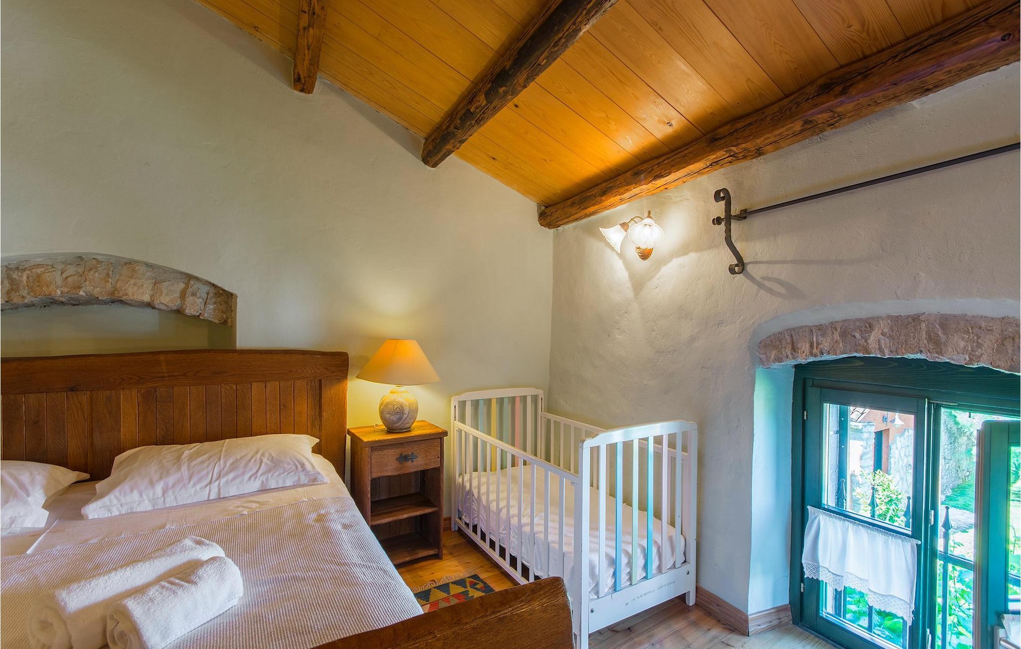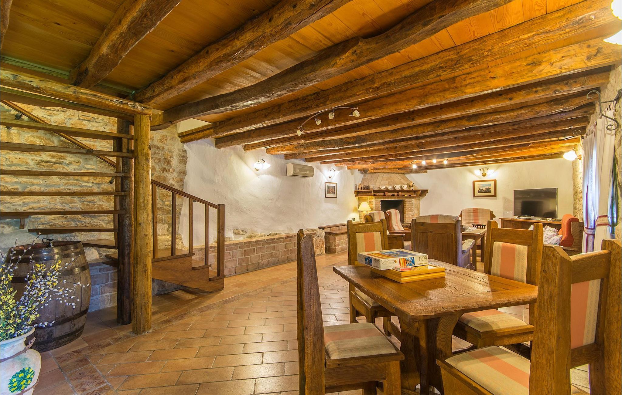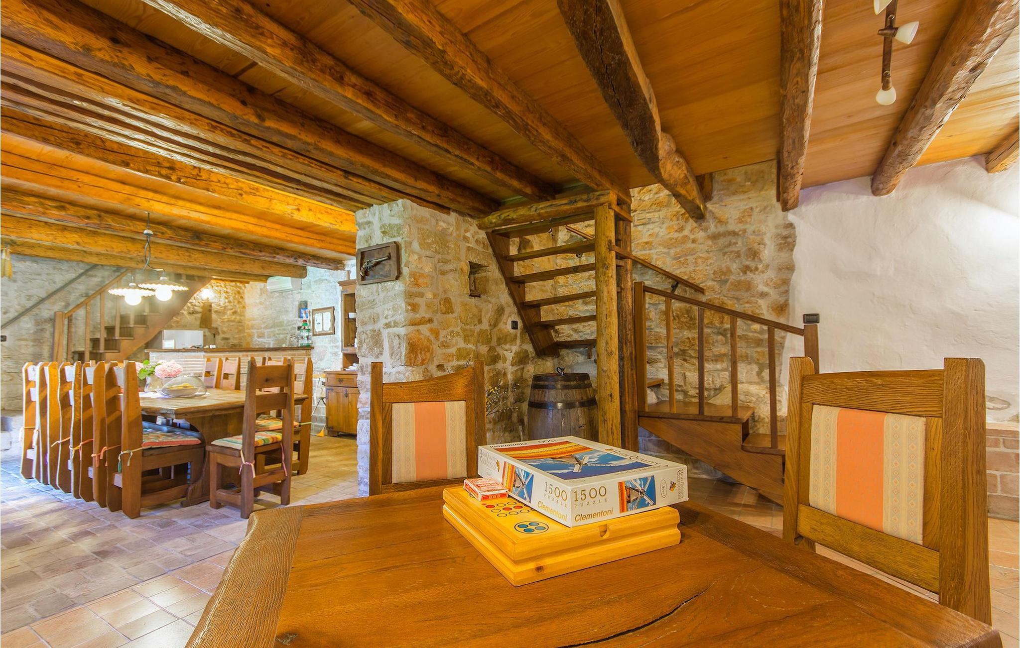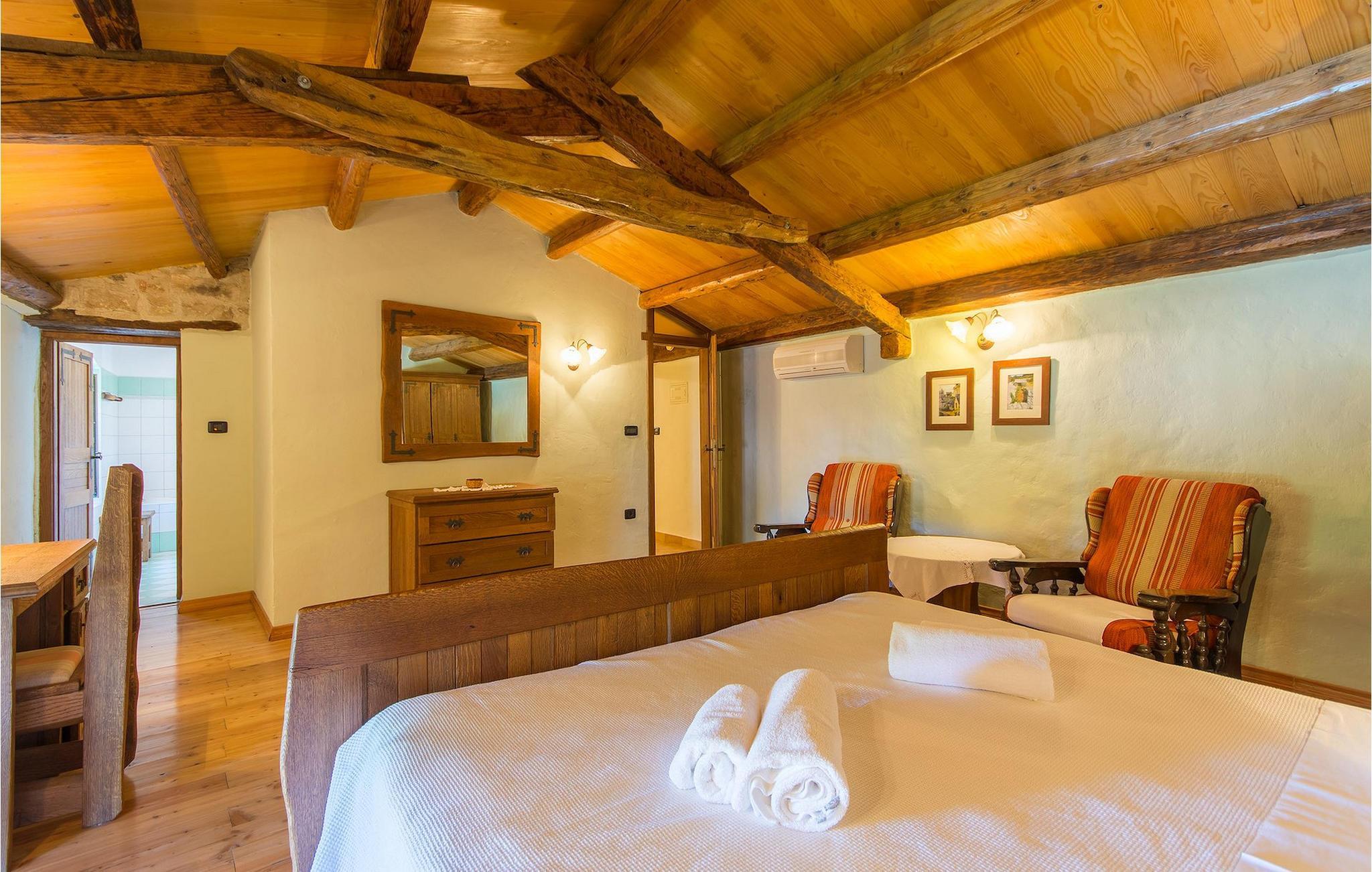 Det fortelles at sjørøverkapteinen Sir Henry Morgan på 1600-tallet plyndret Karibia, og på flukt fra loven seilte han så langt som til Lim Bay og landsbyen Mrgani, der han gjemte skatten sin. Den over hundre år gamle, ombygde villaen bærer fortsatt preg av den gamle kapteinen med sine steinvegger, bevisst avskallet murstein og puss på innerveggene, eikebjelker og antikk innredning og møbler. Kanskje er historien om kaptein Morgan og skatten hans bare et eventyr, men ferien du drømmer om kan bli virkelighet når du bestiller Villa Capt Morgan. I villaens første etasje er det en romslig stue med peis, kjøkken og spisestue i åpen planløsning. I første etasje er det et soverom med dobbeltseng og eget bad. Første etasje er delt i to deler, hver med separate trapper. Den venstre delen inneholder to soverom, ett med enkeltseng og ett med dobbeltseng, begge med eget bad. I den høyre delen av øverste etasje er det et stort hovedsoverom kalt "Captain's Room", som har eget bad med boblebad. På utsiden av villaen er det en stor uteplass med svømmebasseng og mye middelhavsgrønt. I hagen vokser det også et hundre år gammelt morbærtre som gir behagelig skygge på varme sommerdager. Hvis du reiser med barn, vil du sette stor pris på denne gårdsplassen, som byr på rikelig med plass til ubekymret lek. For ekstra moro har villaen bordtennis, bordfotball, basketballkurv og dart. På gårdsplassen er det også en stor, overbygd spiseplass med en stor peis der du kan tilberede et herlig familiemåltid og nyte det sammen. Her kan du virkelig slappe av og nyte freden og roen du drømmer om. Gjør drømmene til virkelighet ved å bestille Villa Capt Morgan med en gang, og unn deg selv den ferien du fortjener.Mrgani er en liten, rolig landsby over det istriske geologiske området Limkanalen, bare noen få kilometer fra kystbyen Rovinj. Dette fredelige og avslappende området er omgitt av grønne jorder og skoger, langt unna de store turistsentrene, men likevel nært nok hvis du vil utforske. Rovinj ligger bare 30 minutter unna med bil, og du vil nyte hvert minutt av kjøreturen gjennom det pittoreske, kuperte landskapet. Når du nærmer deg Rovinj, vil du umiddelbart bli fortryllet av byens skjønnhet, spesielt i solnedgangen, når du kan se fargerike hus på en kupert halvøy omgitt av varme farger fra den solkyssede sommerhimmelen og det krystallblå havet. Rovinj er en virkelig romantisk by. Ta en spasertur gjennom de smale steingatene som slynger seg sakte oppover til toppen av åsen der den gamle Eufemia-kirken fra 900-tallet ligger. Kirkeplatået byr på en vakker utsikt. Hvis du klatrer opp til toppen av kirketårnet, har du fri utsikt over hele byen og området rundt. I Rovinj finner du mange flotte restauranter og bistroer som vil tilfredsstille enhver gastronomisk entusiast. Istrien er godt forbundet med landeveier, slik at du enkelt kan utforske området. Planlegg dagsturer til kyst- og innlandsbyer som Pula, Groznjan, Motovun, Vodnjan, Porec og Novigrad, og benytt anledningen til å besøke Birjuni nasjonalpark med båt.
