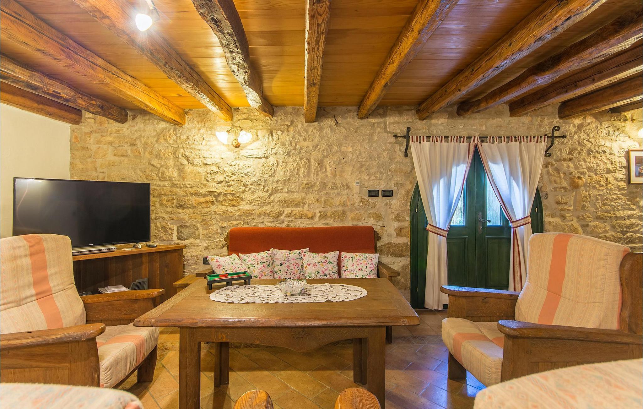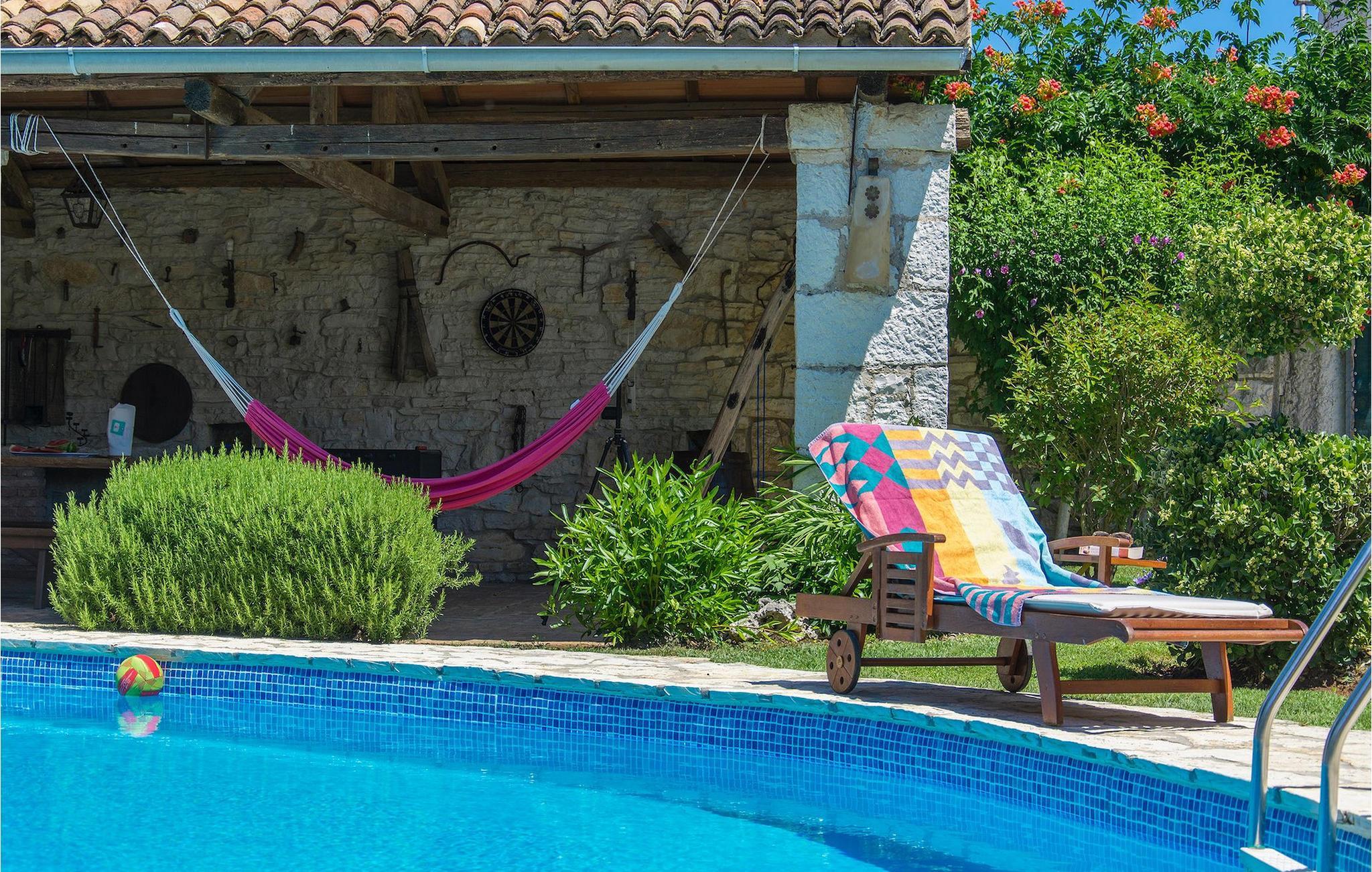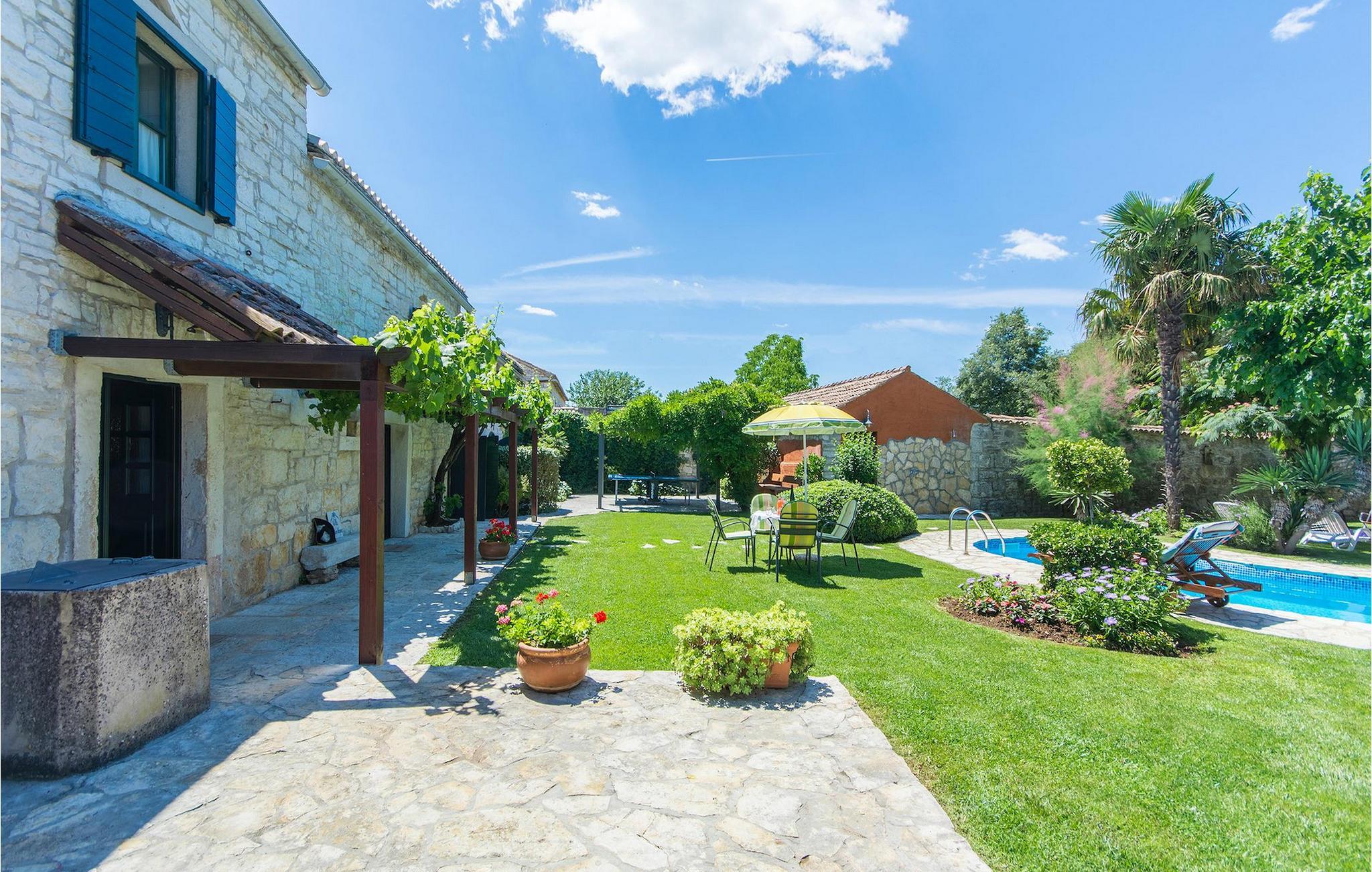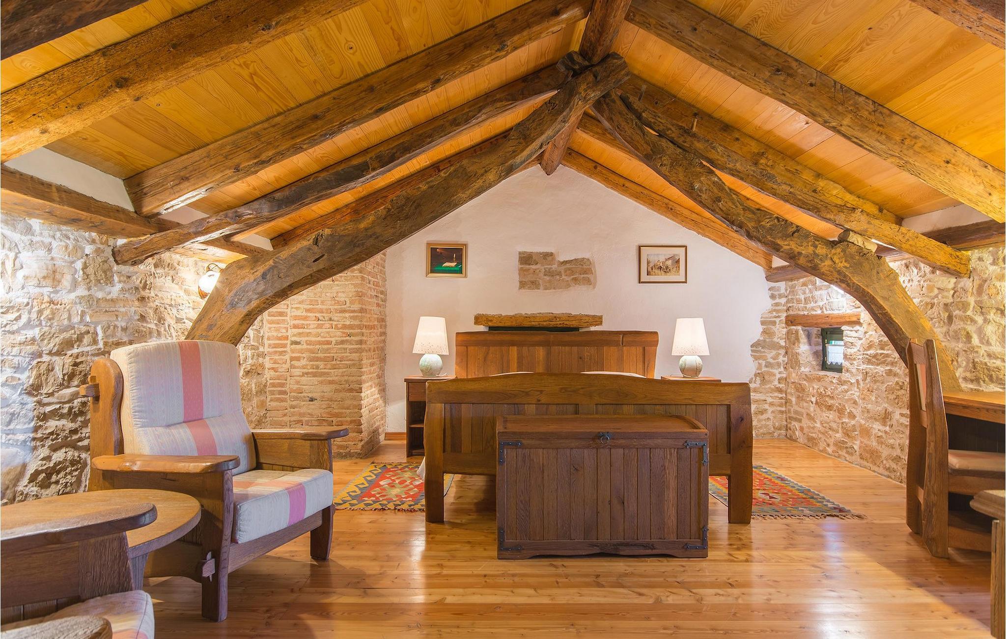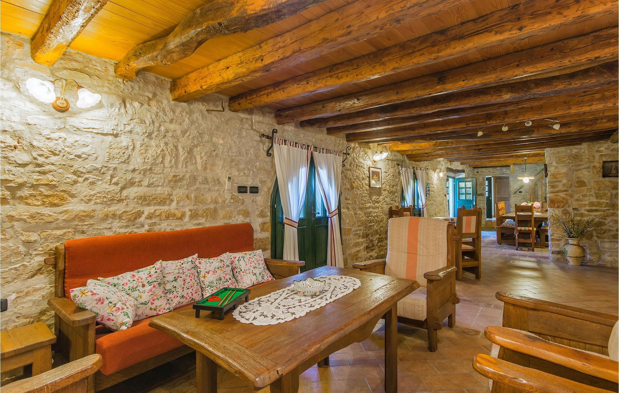 Det fortelles at sjørøverkapteinen Sir Henry Morgan på 1600-tallet plyndret Karibia, og på flukt fra loven seilte han så langt som til Lim Bay og landsbyen Mrgani, der han gjemte skatten sin. Den over hundre år gamle, ombygde villaen bærer fortsatt preg av den gamle kapteinen med sine steinvegger, bevisst avskallet murstein og puss på innerveggene, eikebjelker og antikk innredning og møbler. Kanskje er historien om kaptein Morgan og skatten hans bare et eventyr, men ferien du drømmer om kan bli virkelighet når du bestiller Villa Capt Morgan. I villaens første etasje er det en romslig stue med peis, kjøkken og spisestue i åpen planløsning. I første etasje er det et soverom med dobbeltseng og eget bad. Første etasje er delt i to deler, hver med separate trapper. Den venstre delen inneholder to soverom, ett med enkeltseng og ett med dobbeltseng, begge med eget bad. I den høyre delen av øverste etasje er det et stort hovedsoverom kalt "Captain's Room", som har eget bad med boblebad. På utsiden av villaen er det en stor uteplass med svømmebasseng og mye middelhavsgrønt. I hagen vokser det også et hundre år gammelt morbærtre som gir behagelig skygge på varme sommerdager. Hvis du reiser med barn, vil du sette stor pris på denne gårdsplassen, som byr på rikelig med plass til ubekymret lek. For ekstra moro har villaen bordtennis, bordfotball, basketballkurv og dart. På gårdsplassen er det også en stor, overbygd spiseplass med en stor peis der du kan tilberede et herlig familiemåltid og nyte det sammen. Her kan du virkelig slappe av og nyte freden og roen du drømmer om. Gjør drømmene til virkelighet ved å bestille Villa Capt Morgan med en gang, og unn deg selv den ferien du fortjener.Mrgani er en liten, rolig landsby over det istriske geologiske området Limkanalen, bare noen få kilometer fra kystbyen Rovinj. Dette fredelige og avslappende området er omgitt av grønne jorder og skoger, langt unna de store turistsentrene, men likevel nært nok hvis du vil utforske. Rovinj ligger bare 30 minutter unna med bil, og du vil nyte hvert minutt av kjøreturen gjennom det pittoreske, kuperte landskapet. Når du nærmer deg Rovinj, vil du umiddelbart bli fortryllet av byens skjønnhet, spesielt i solnedgangen, når du kan se fargerike hus på en kupert halvøy omgitt av varme farger fra den solkyssede sommerhimmelen og det krystallblå havet. Rovinj er en virkelig romantisk by. Ta en spasertur gjennom de smale steingatene som slynger seg sakte oppover til toppen av åsen der den gamle Eufemia-kirken fra 900-tallet ligger. Kirkeplatået byr på en vakker utsikt. Hvis du klatrer opp til toppen av kirketårnet, har du fri utsikt over hele byen og området rundt. I Rovinj finner du mange flotte restauranter og bistroer som vil tilfredsstille enhver gastronomisk entusiast. Istrien er godt forbundet med landeveier, slik at du enkelt kan utforske området. Planlegg dagsturer til kyst- og innlandsbyer som Pula, Groznjan, Motovun, Vodnjan, Porec og Novigrad, og benytt anledningen til å besøke Birjuni nasjonalpark med båt.