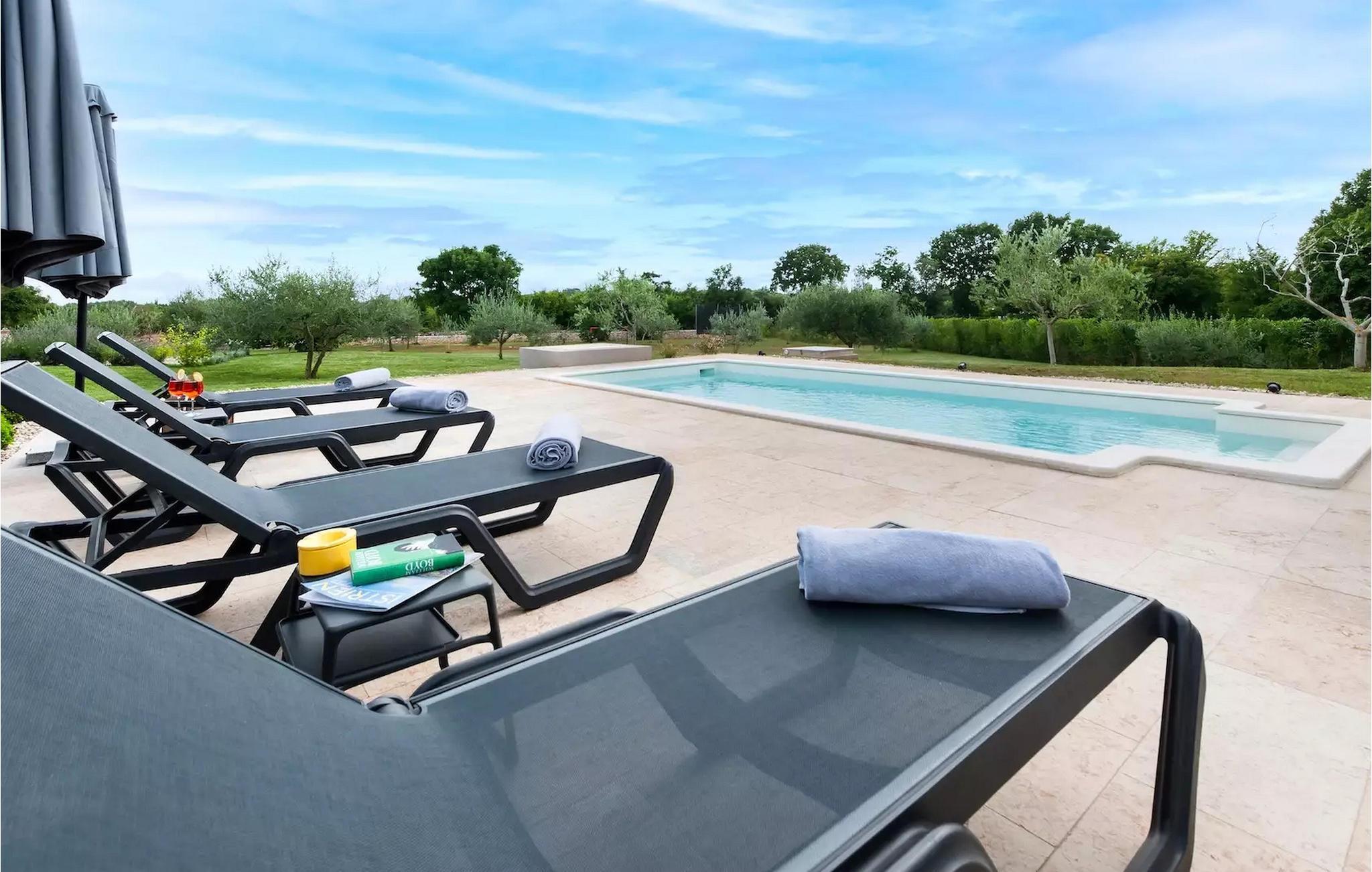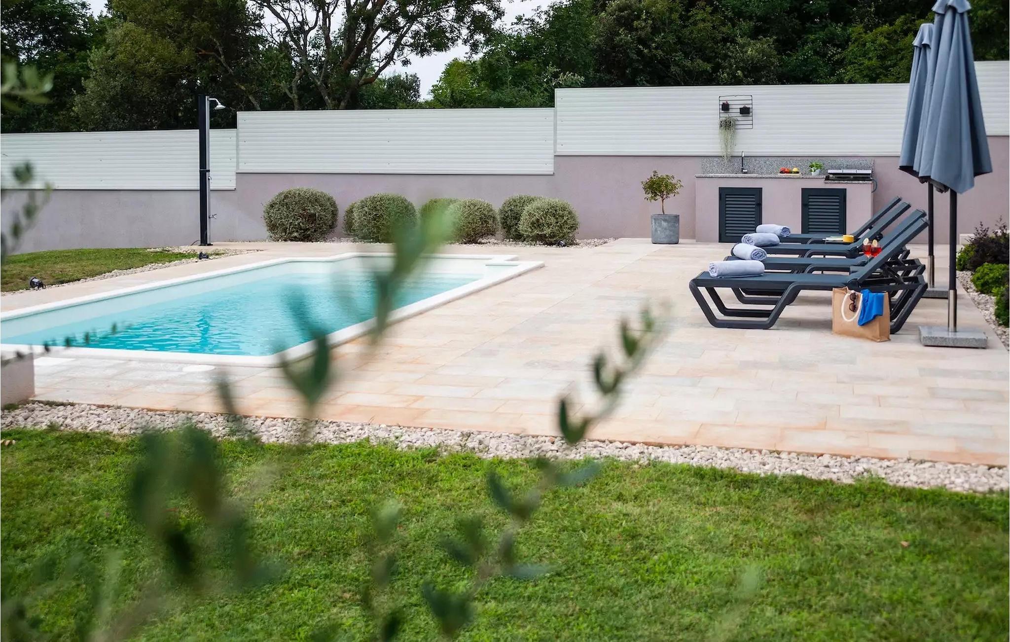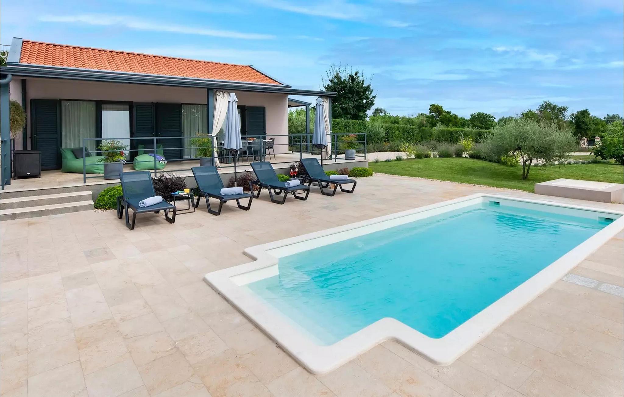 Villa Jolanda Rovinj ligger i den fortryllende byen Rovinj på vestkysten av Istria. Denne vakre villaen i første etasje er ideell for 4 personer som ønsker å tilbringe en herlig ferie nær sjøen og byen. Det forfriskende bassenget er husets hjerte og stedet der du kan slappe av og ha det gøy. Nyt den kroatiske solen på en av solsengene ved bassenget, hopp i det kjølige vannet for å friske deg opp og få en sommerbrun farge som du kan ta med deg hjem som en suvenir. På den overbygde terrassen med spisebord kan du spise frokost eller grille. En gassgrill er tilgjengelig for dette formålet. I hagen er det trampoline, minifotballmål og badminton for å holde de minste underholdt. Når du kommer inn i villaen fra terrassen, befinner du deg i en åpen, smakfullt innredet stue med fullt utstyrt kjøkken og spiseplass. Her er det mange små detaljer som fanger blikket. De to komfortable soverommene med koselige dobbeltsenger innbyr til avslappende netter, og de to moderne badene blir din egen lille velværeoase.