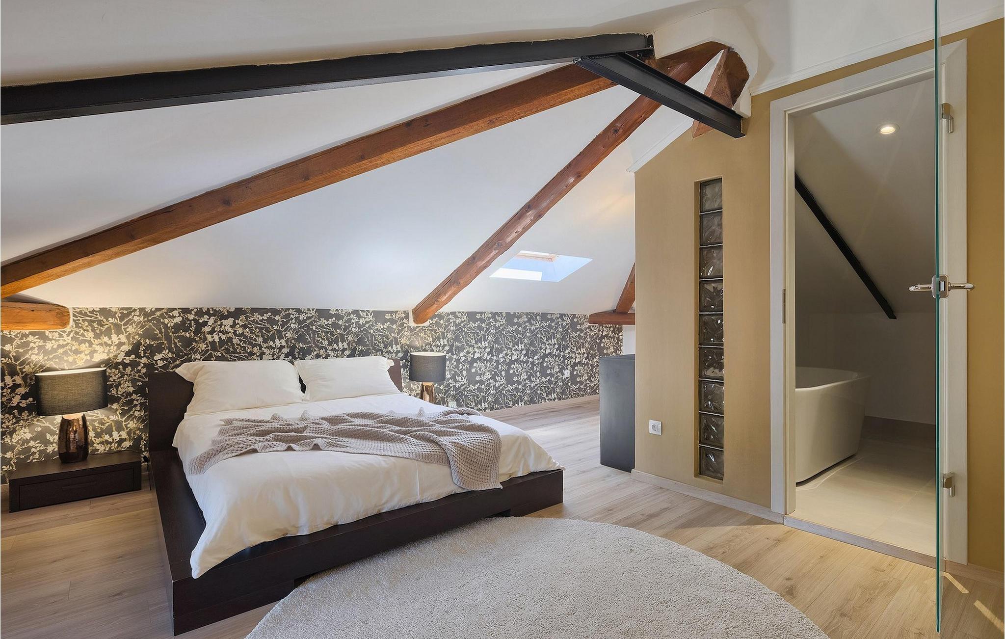 Den innvendige trappen fører opp til første etasje, hvor de 4 vakkert innredede hovedsoverommene ligger. 2 av soverommene har eget bad og dobbeltseng. De to andre soverommene har hver to enkeltsenger. Det er ytterligere 2 bad i samme etasje. En annen trapp fører deg opp til loftet, hvor det er et ekstra flott rom med dobbeltseng som har plass til +2 gjester. Ved siden av ligger et eget bad.