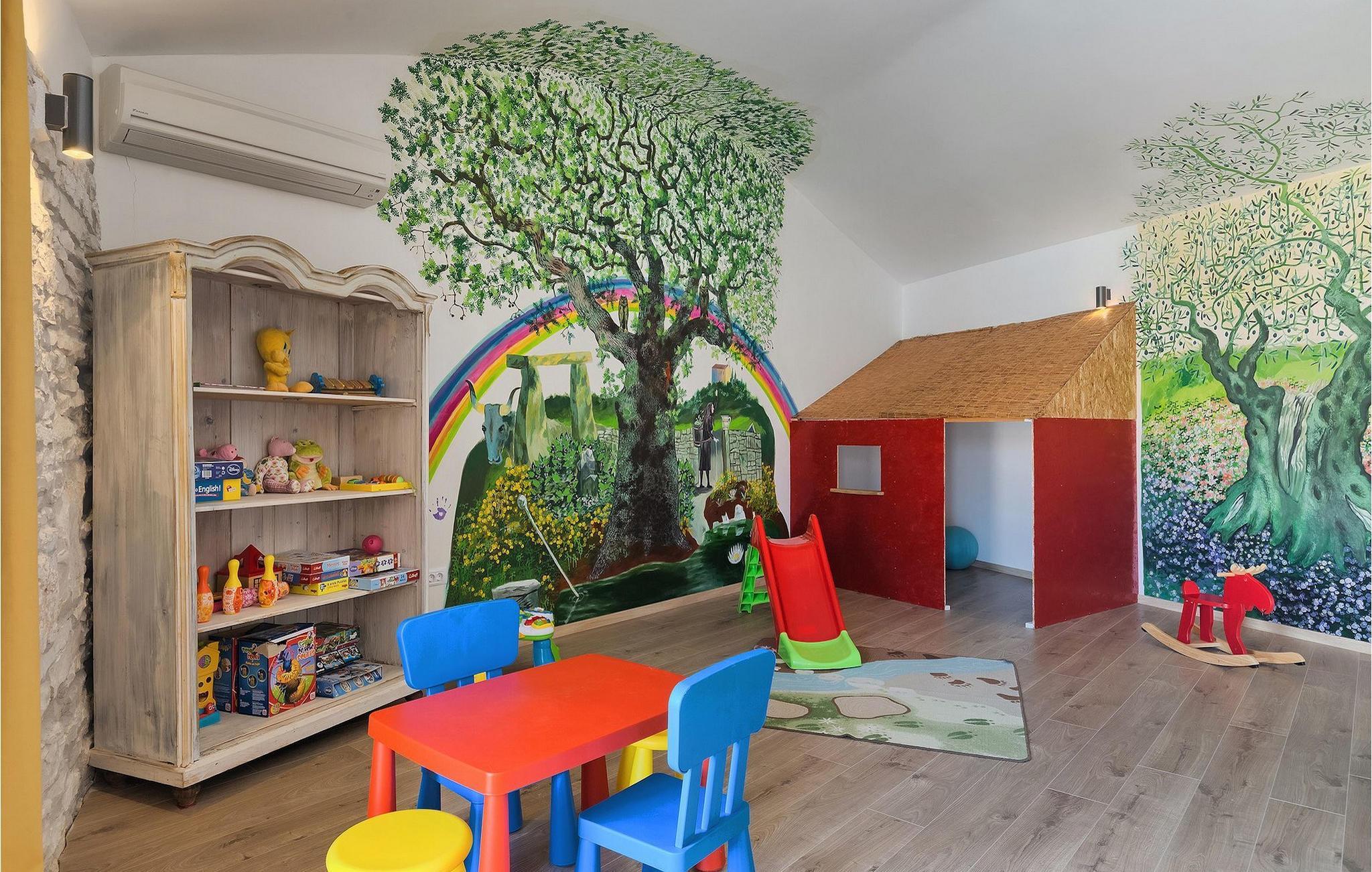 I første etasje er det et eget rom kun for barn - et fargerikt lekerom for de minste gjestene, fullt av forskjellige leker. Det er et ekstra gjestetoalett i første etasje samt en garasje med 2 parkeringsplasser og ytterligere 2 parkeringsplasser i hagen.