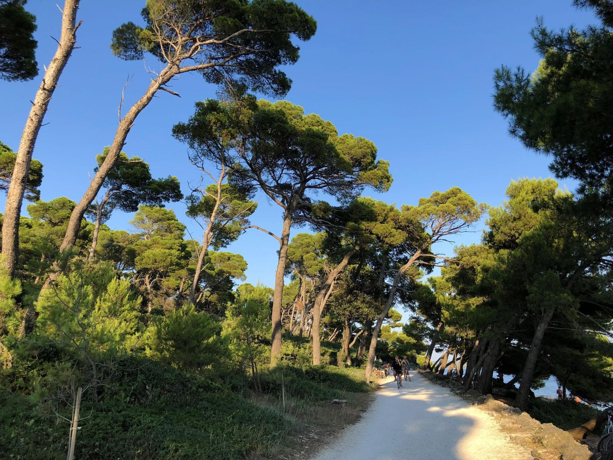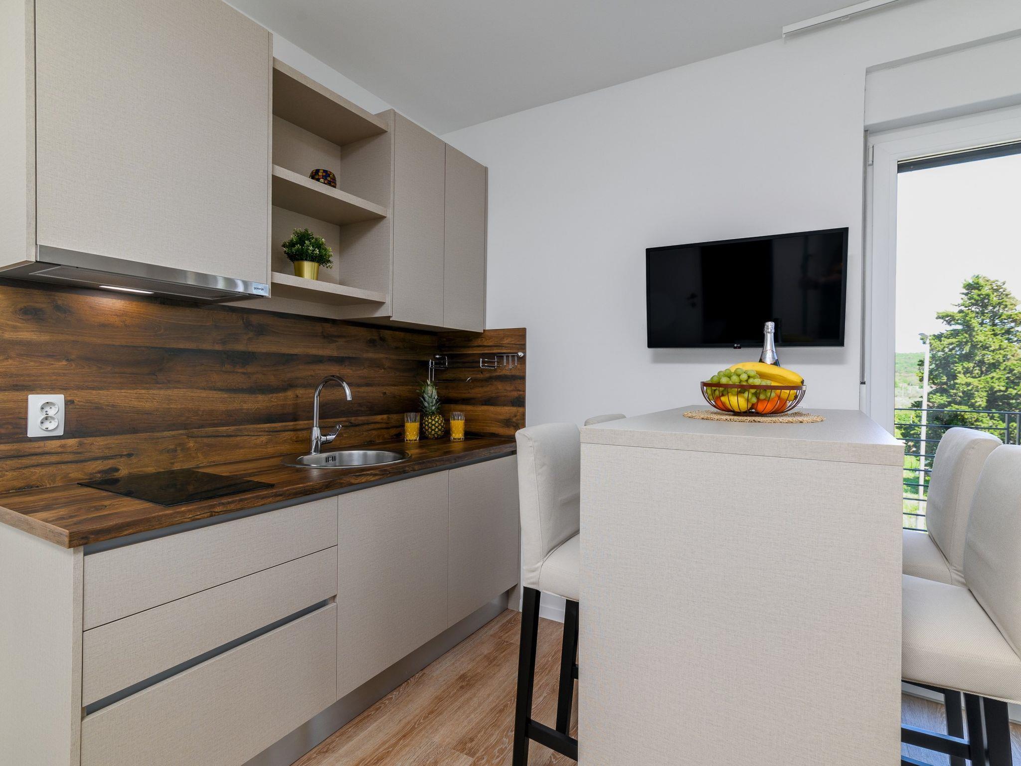 "Prinz", 2-room apartment 30 m2, on the upper floor. Simple and cosy furnishings: living/dining room 18 m2 with 1 double sofabed (160 cm, length 200 cm), satellite TV and air conditioning. Exit to the terrace. 1 room with 1 french bed (160 cm, length 200 cm). Small, open kitchen (2 ceramic glass hob hotplates, kettle, microwave). Shower/WC. Forced-air heating. Terrace furniture. Facilities: safe, mosquito net. Internet (WiFi, free). Parking (1 car). Please note: fridge without freezer. 1 small pet/ dog allowed. Terrace (45 m2) for shared use with apartment HR2500.500.6.