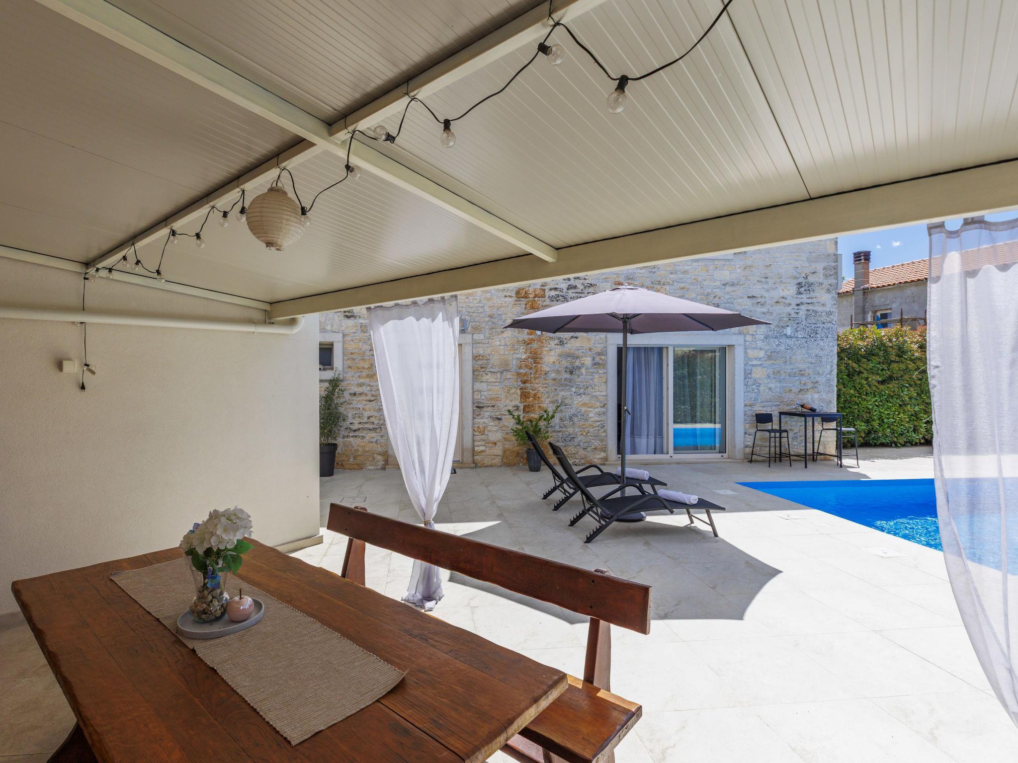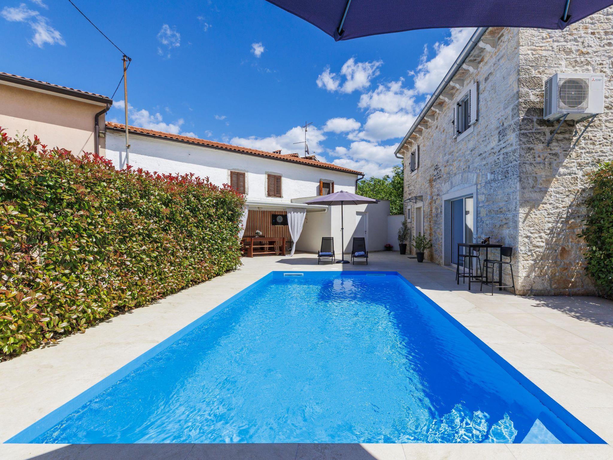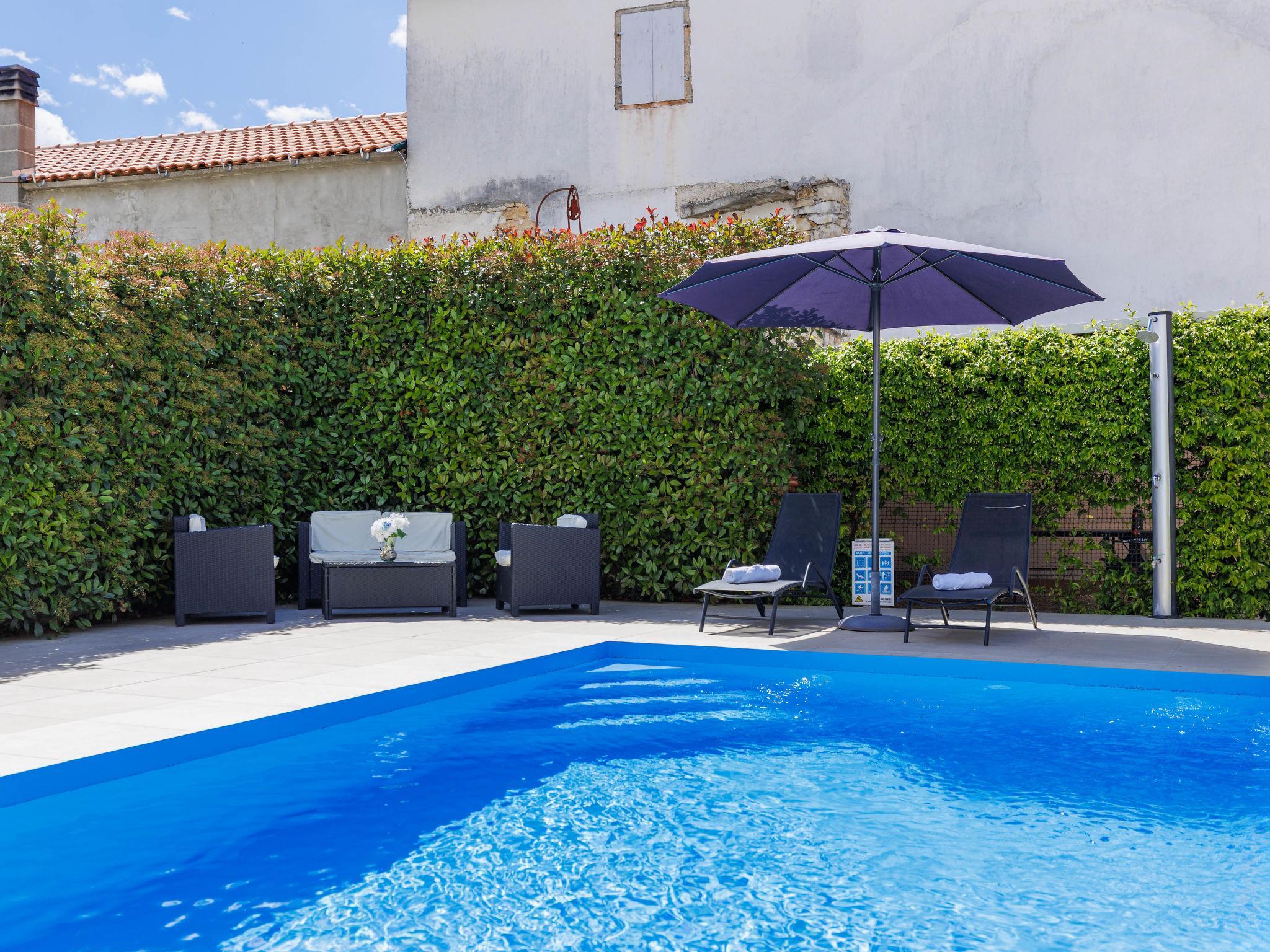 Single-family house "Villa Karmen", 2 storeys, renovated in 2019. In the hamlet Gljušcici 6 km from the centre of Žminj, 30 km from the centre of Rovinj, 28 km from the sea. Private: property 400 m2 (fenced), swimming pool angular (7 x 3 m, 24 m2, depth 130 cm, seasonal availability: 01.May. - 14.Oct.) with internal staircase. Outdoor shower, table tennis, terrace, garden furniture. In the house: internet access, washing machine. Parking (for 3 cars) on the premises. Shop 500 m, restaurant 1 km, bus stop 6.1 km, rocky beach 28 km.