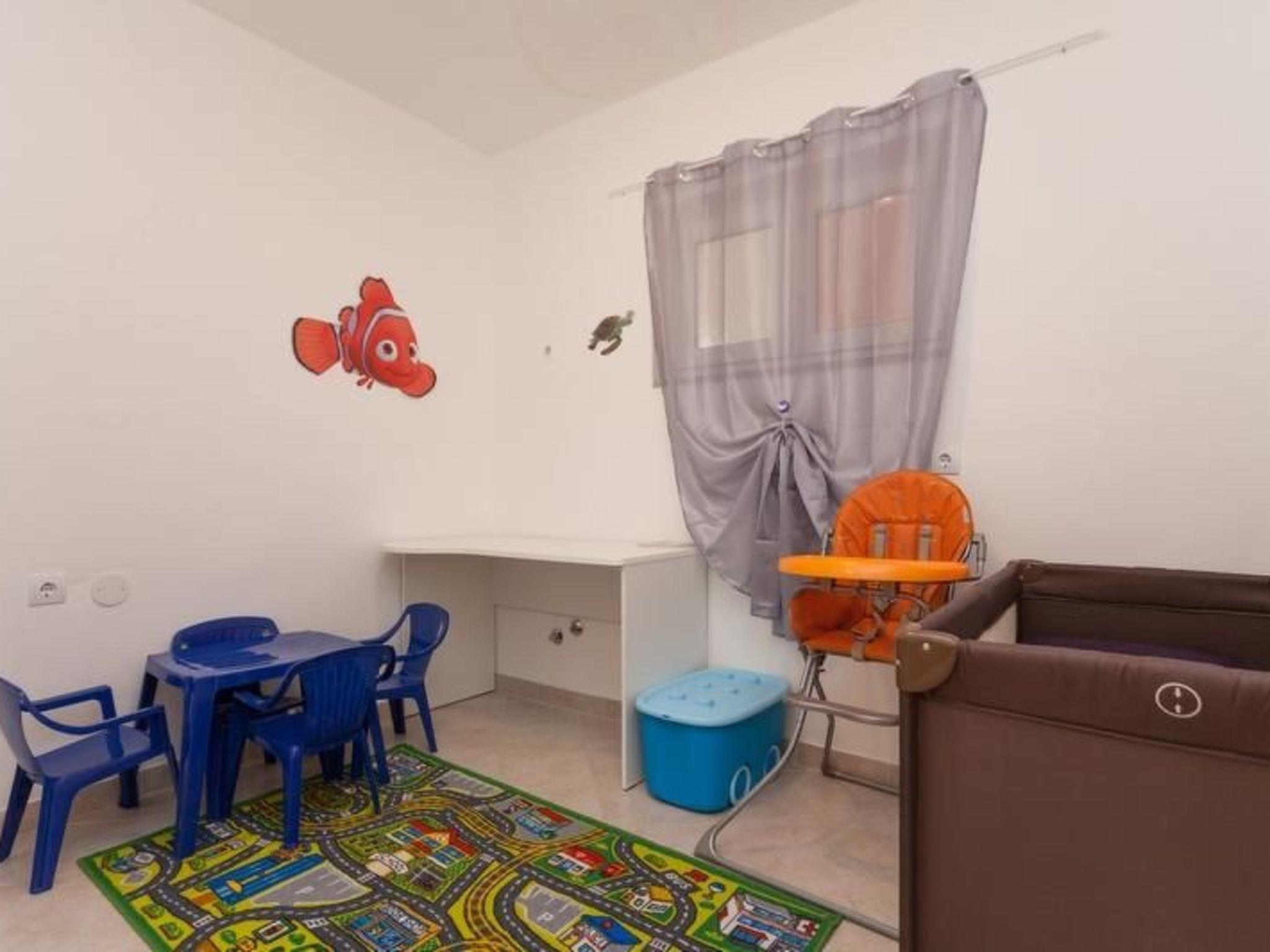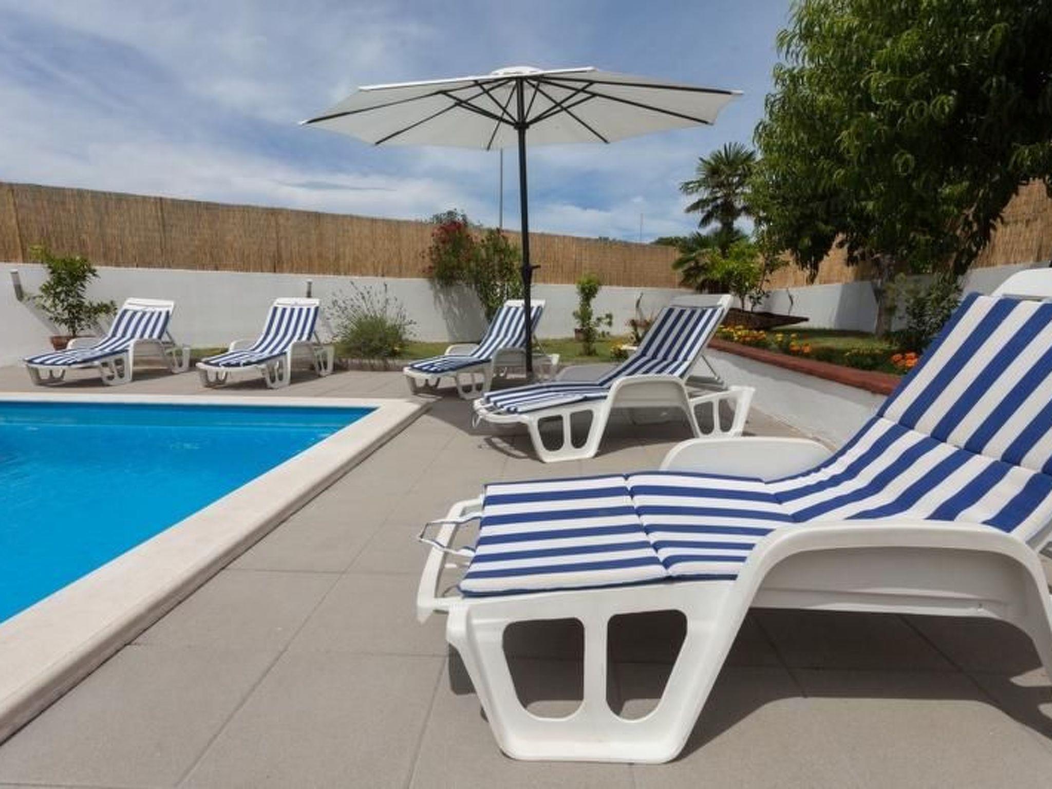 Set in a fully enclosed plot of land measuring 1100 m², the villa features 160 m² of living space and can accommodate up to 12 persons. It was built in 1975 and has only recently been renovated in 2012, when it was decorated with much attention to detail. Each room has its own identity with individual colour schemes. The villa is spread over two floors which are connected by outdoor staircases. The ground floor hosts the air conditioned living-/dining area, the kitchen, one of the three bathrooms and two of the five bedrooms. The living area has a comfortable cream leather couch with two matching armchairs, coffee table, cable and satellite TV, and DVD player. From the dining area furnished with a large wooden table and twelve chairs you can walk straight into the modern kitchen. The bright and airy kitchen is complete with fridge, oven, dishwasher, gas cooker, coffee machine, microwave and toaster. The two bedrooms are furnished with double beds (160cm x 200cm) and the bathroom, like all the bathrooms in the villa, is complete with shower, wash basin with mirror cabinet and toilet. On the first floor you will find the three remaining bedrooms with double beds (160cm x 200cm), and the two remaining bathrooms. The first floor also hosts a children’s playroom with TV and playstation and a small living room with two sofa beds offering sleeping area of 120cm x 190cm and 90cm x 190cm. The villa has two guest toilets, one on each floor. A bed for a child and a highchair are available. Internet access via WLAN is free of charge.