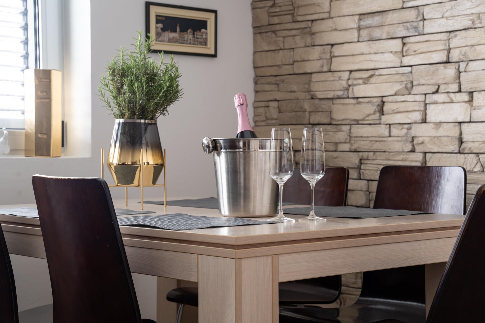 Tildelt det istriske leilighetsgodkjenningsmerket "Domus Bonus": moderne rekkehusvilla med seks lyse og svært smakfullt innredede leiligheter. Disse er utstyrt med WiFi, satellitt-TV og klimaanlegg, og alle har balkong. Du bor i et rolig område i et inngjerdet område og hver av leilighetene har en parkeringsplass. Stranden ligger kun 900 meter unna, og du er like rask i gamlebyen - her kan du virkelig nyte den varme istriske solen! Rovinj - en gang en fiskerlandsby - er en av de mest fotogene byene i Middelhavet. Det ble tidlig fastslått at de klimatiske egenskapene til regionen er gunstige for helsen. Naturen i seg selv sørger for et rent miljø her, for hele kyststripen med sine 22 øyer er et naturreservat. Byen vil glede deg med sine trange middelaldergater og sin middelhavsvarme. Mens du rusler gjennom byen, kan du besøke den barokke kirken St. Euphemia med relikviene til helgenene. Fra kirken har du en vakker utsikt over havet og de omkringliggende små øyene. Detaljer: Forbruksbaserte energikostnader, sengetøy, håndklær, sluttrengjøring, WiFi-registreringsavgift Turistskatt Aktiviteter i nærheten: Kystområdet mellom Rovinj-Rovigno og Limfjorden, med en skjærgård av små øyer og den beskyttede furuskogen, danner en mangefasettert grønn oase, som også inkluderer den naturlige hagen til Zlatni rt. Paludbukta er et ornitologisk reservat med over 200 forskjellige fuglearter, mens Monfiorenzo-bruddet er et beskyttet geologisk monument av verdenskjent verdi. Området byr på en rekke rekreasjons-, sykling-, ridnings- og turstier. Men det som virkelig gjør denne regionen så attraktiv er det faktum at vannsport som seiling og dykking med det kulinariske og terapeutiske tilbudet til byen Rovinj.