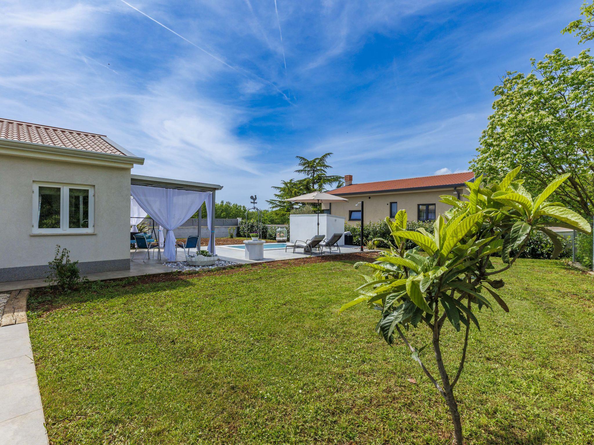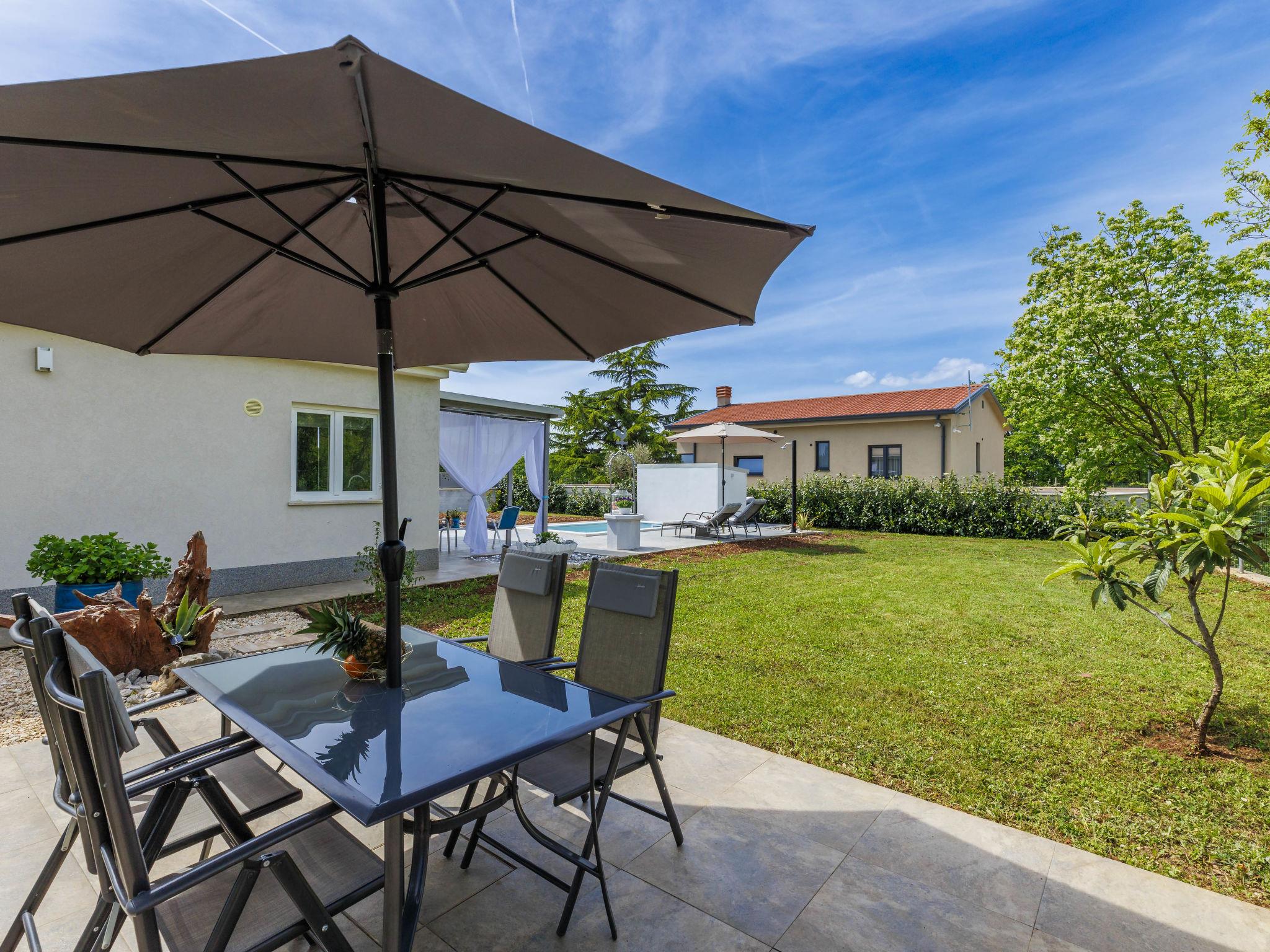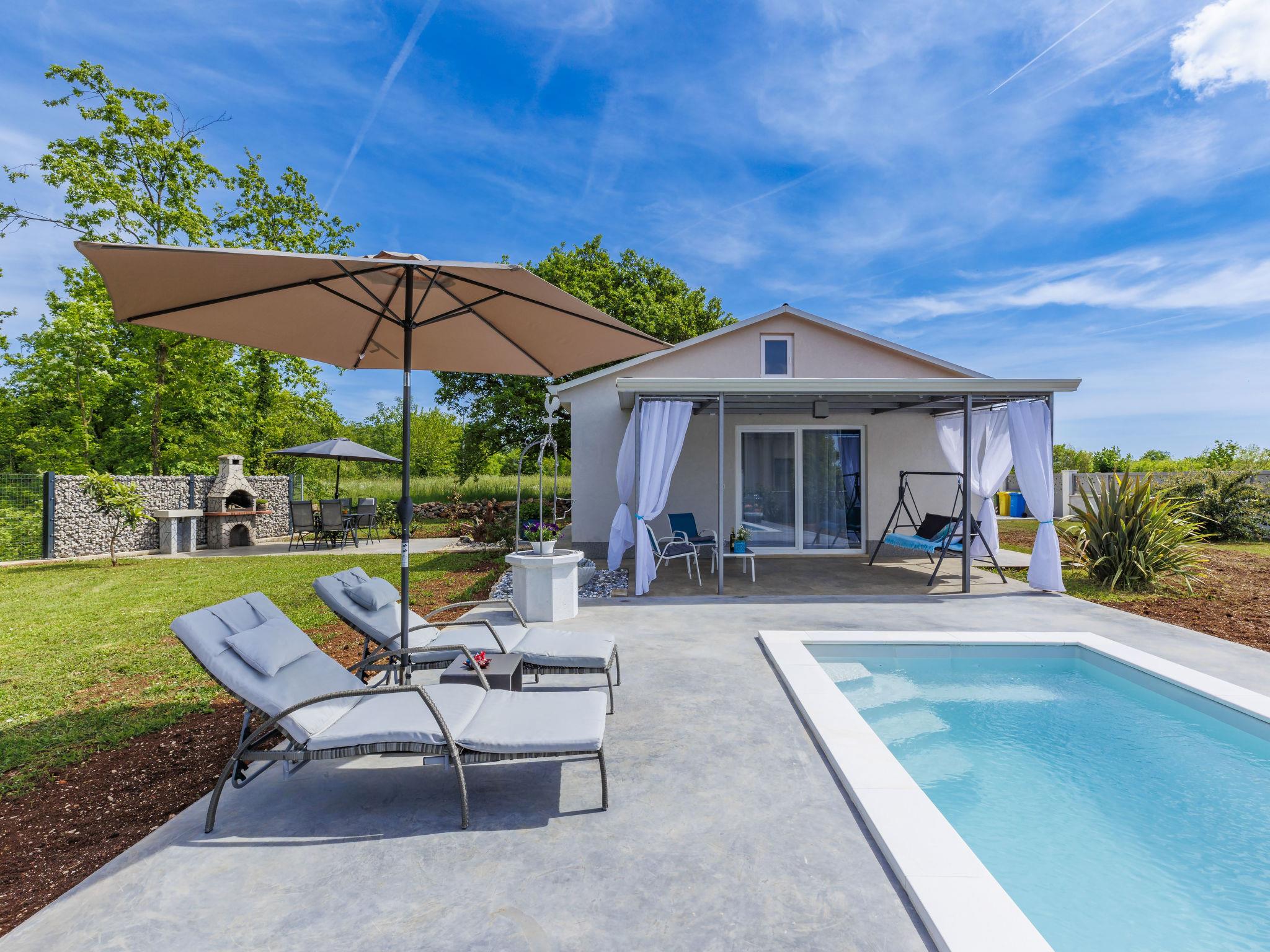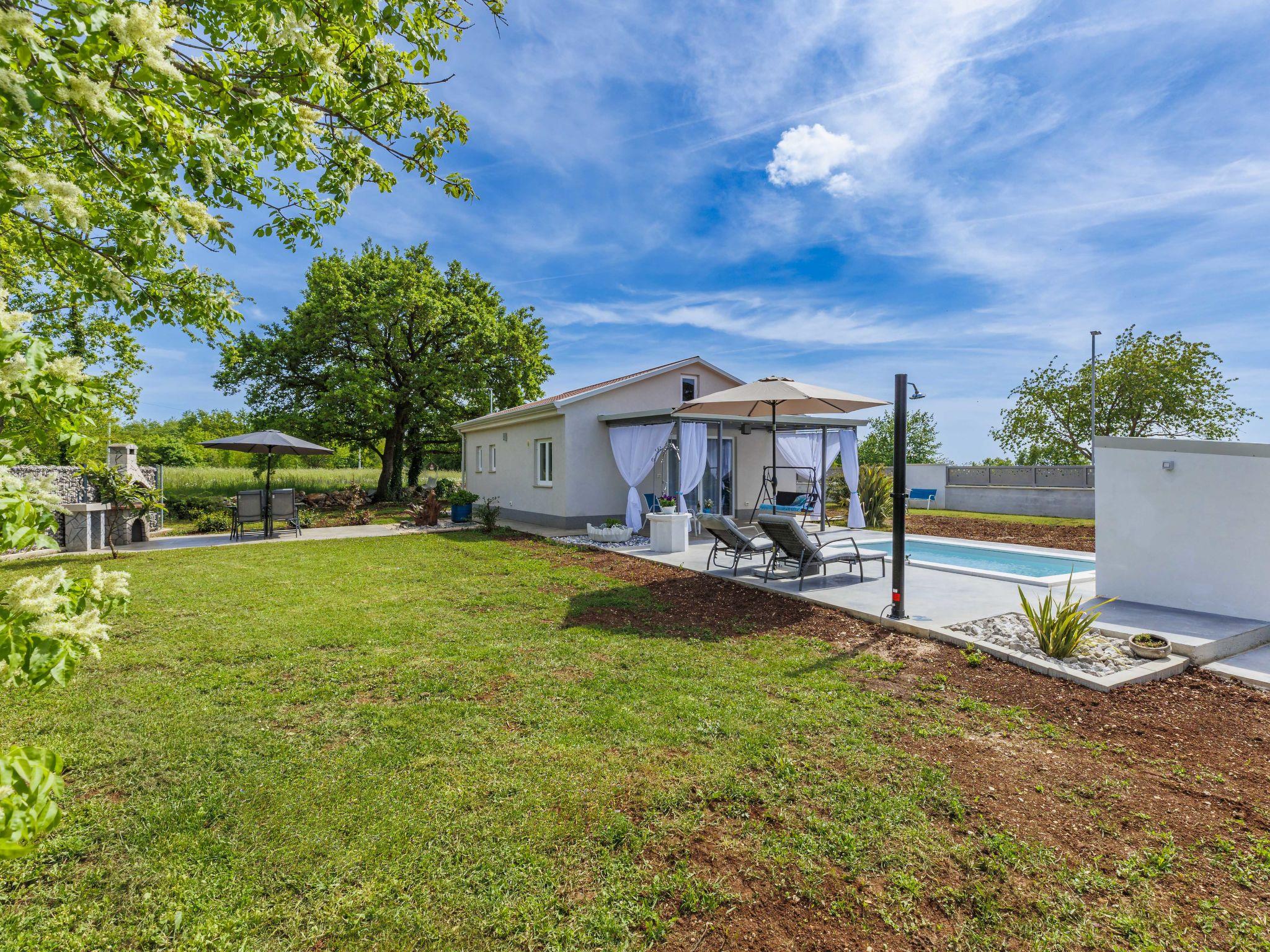 Cosy single-family house "Villa Fenix". In the hamlet Križanci 2.5 km from the centre of Žminj, 26 km from the centre of Rovinj, 26 km from the sea. Private: property 856 m2 (fenced), garden with lawn and wildlife garden, swimming pool angular, heated (5 x 2 m, 10 m2, depth 140 cm, seasonal availability: 01.May. - 21.Oct.) with internal staircase. Outdoor shower, barbecue. In the house: internet access, washing machine. Parking (for 2 cars) at the house on the premises. Supermarket 1.5 km, restaurant 2 km, bus stop 2.6 km, pebble beach 26 km. Riding stable 10 km, walking paths from the house 100 m, cycle lane 150 m. Nearby attractions: adventure park 20 km, zip line 15 km. Swimming pool heated (extra).