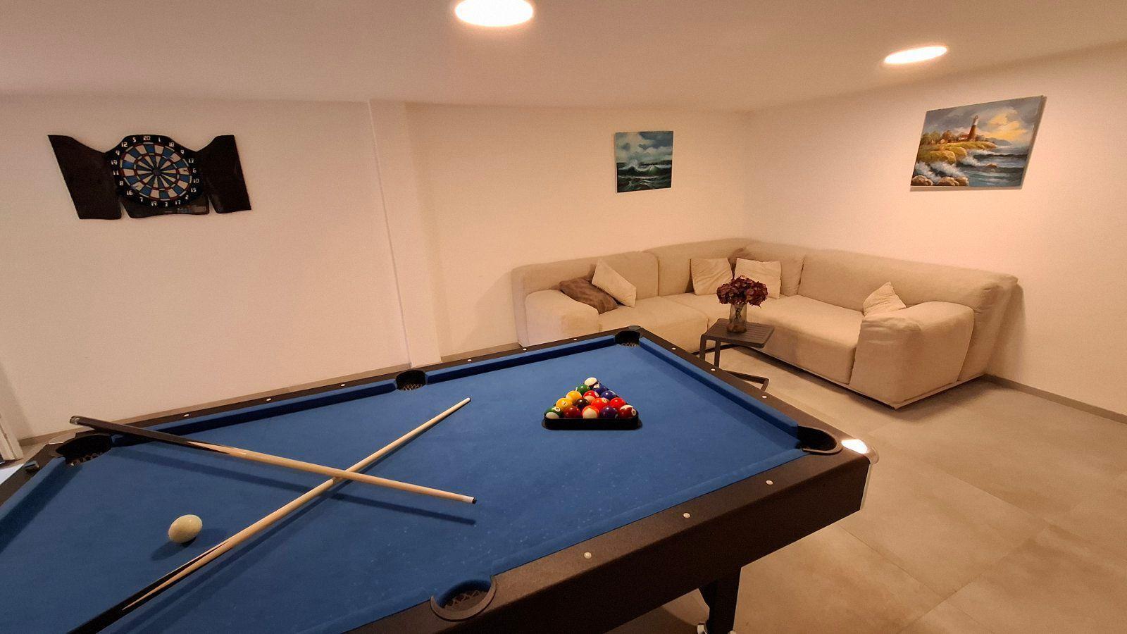 In the basement, you’ll find an entertainment room with billiards, darts, and extra sleeping options—ideal for relaxed evenings with friends or family.