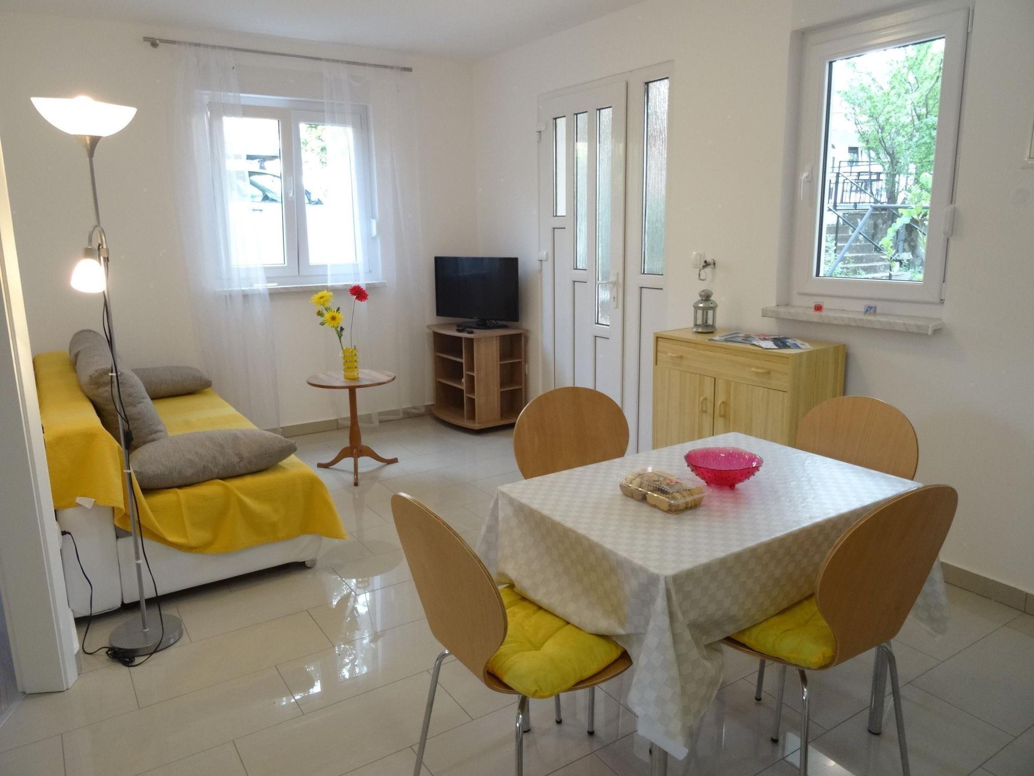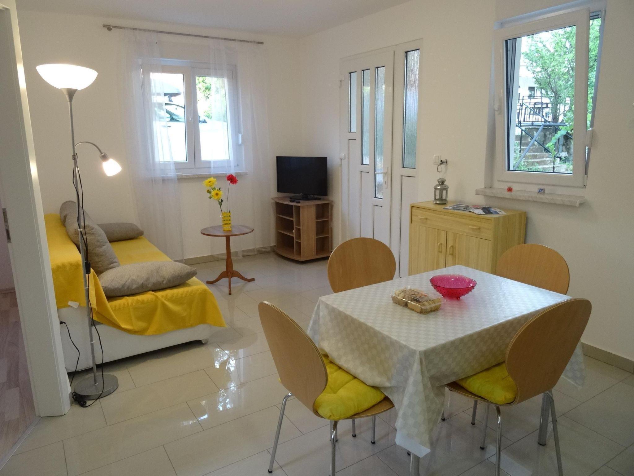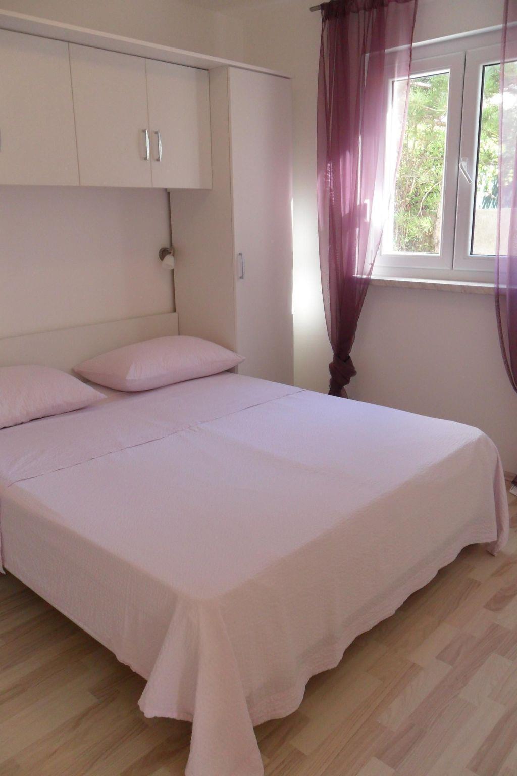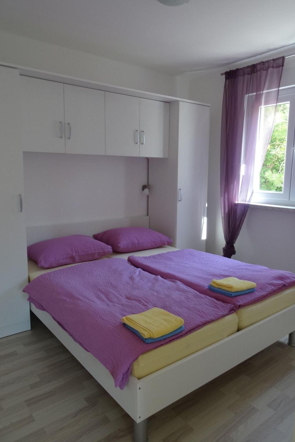 This 40m² quiet and cool apartment is on the ground floor. It was renovated in 2013, has a separate entrance and is suitable for two to three people, ideal for two adults with one or two small children or three adults. The apartment has a bedroom, a spacious living room with air conditioning, a well-equipped little kitchen and a bathroom. The bedroom is furnished with a double bed (160 x 200cm). Another adult or child can sleep on the sofa bed (130 x 200cm) in the living room, which invites you to relax during the day. There are also a dining space and a kitchen corner behind the dining space, equipped with a stove, oven, fridge, coffee machine, toaster, kettle, crockery and cutlery. The modern, tiled daylight bathroom has a shower, WC and a washbasin with a cupboard underneath and a mirror.