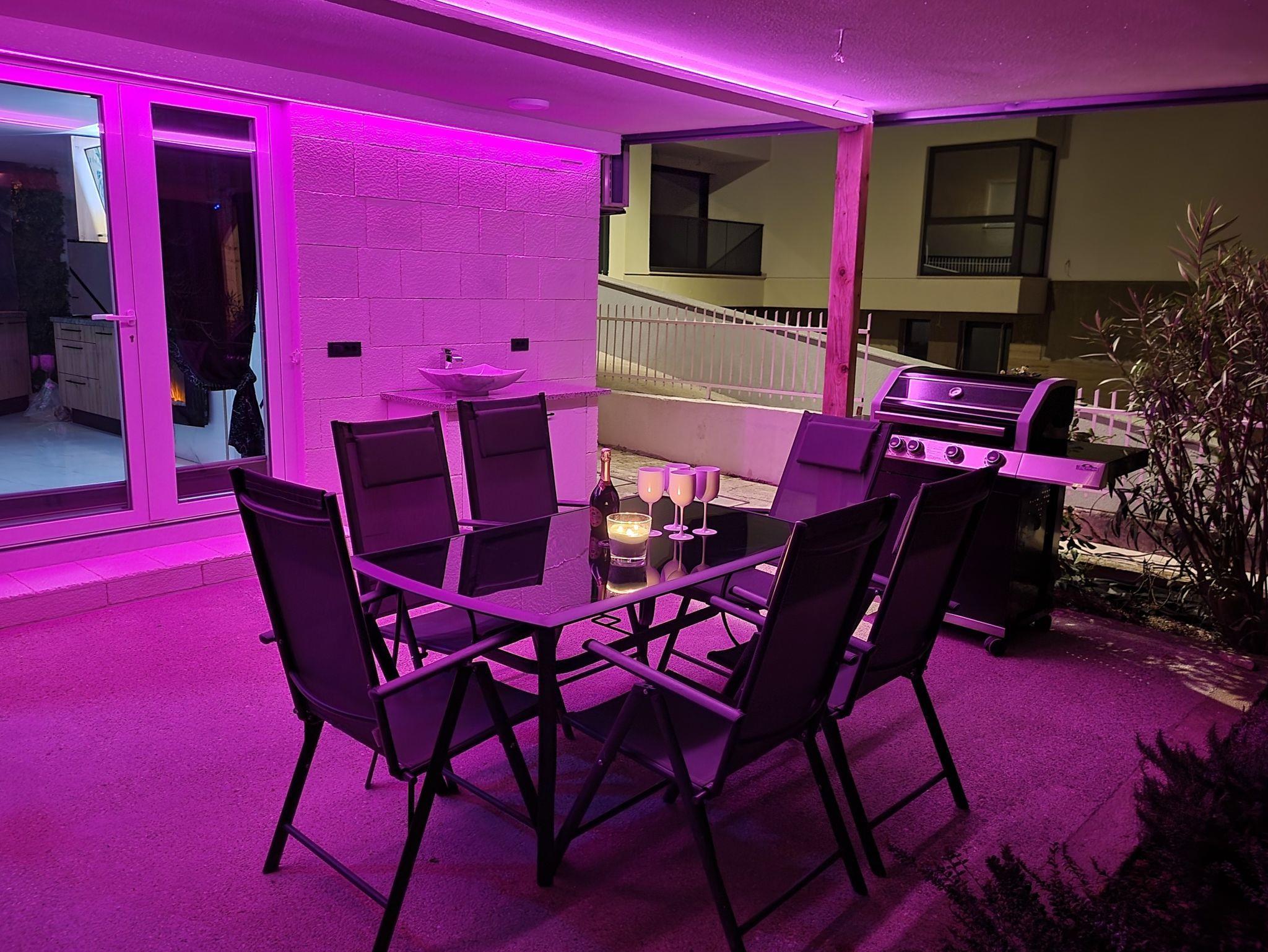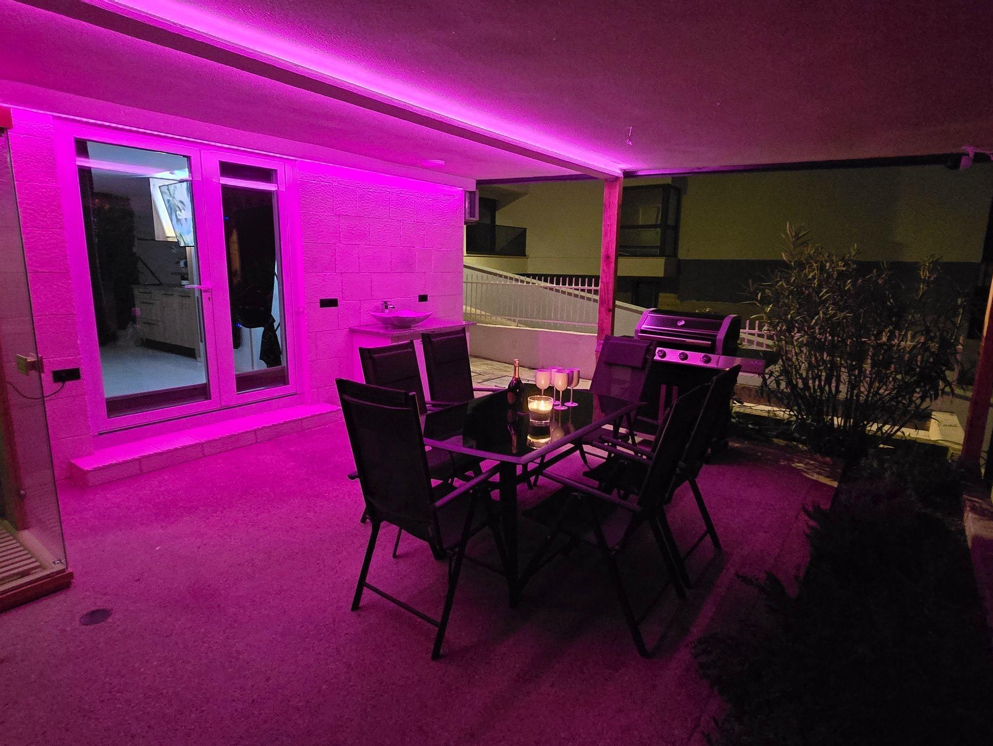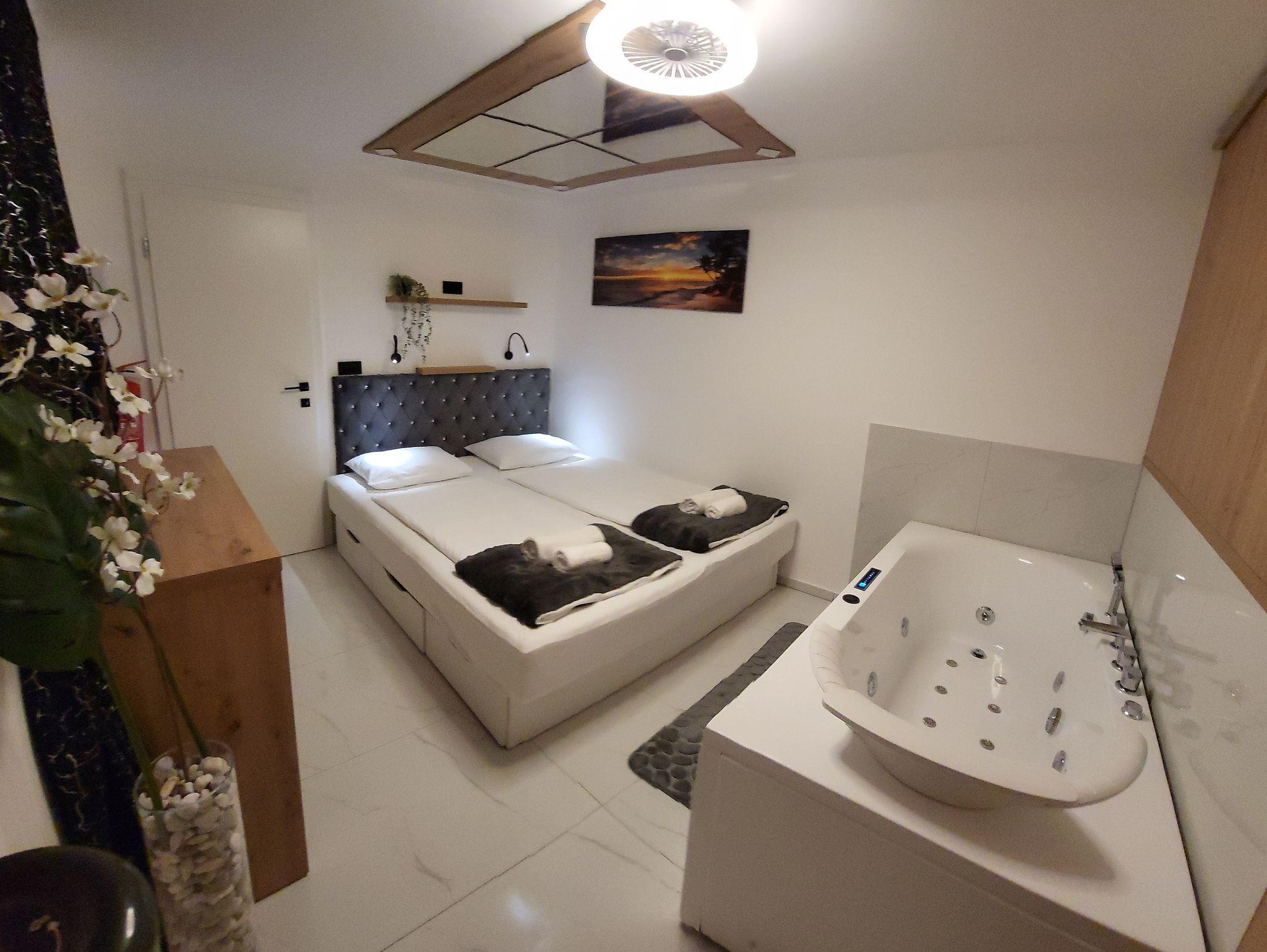 Ferienwohnung bietet Platz für 4 Gäste. Die Betten sind in Schlafzimmern, die es 1 gibt, und in Wohnzimmer, innerhalb einer Gesamtfläche von 47m2, angeordnet. Die Gäste haben eine eigene Terrasse zur Verfügung, auf der sie in warmen Sommernächten genießen können. Das Apartment bietet Meerblick. Es ist erlaubt, Speisen auf dem Gemeinschafts-Grill vorzubereiten. IM PREIS INBEGRIFFEN: Kurtaxe, Endreinigung, Klimatisierung, Zentralheizung, Parkplatz, Internet, Kinderbett, Bügeleisen, Bügelbrett, Föhn, tragbarer Grill. VERBINDLICHE ZUSÄTZLICHE KOSTEN: Aufzahlung für Kurzaufenthalte (prozentualer Zuschlag pro Nächtigungsanzahl: 30% - 1, 20% - 2, 10% - 3). UNVERBINDLICHE ZUSÄTZLICHE KOSTEN: Fahrrad (30,00 € täglich (pro Stück)). Die Verfügbarkeit zusätzlicher Dienstleistungen in Ihrem reservierten Termin und die Preise derselben (falls nicht aufgeführt) müssen im Voraus überprüft werden. Zusätzliche Dienstleistungen die in der Zahlungsaufforderung nicht aufgeführt sind werden direkt beim Vermieter bezahlt, angenommen der Gast nutzt auch diese. Ermäßigung auf den Grundpreis: Gratistag 14=13 (bei einem Aufenthalt von 14 Tagen oder mehr erhalten Sie einen Gratistag für den Aufenthalt bis 31.12.26).