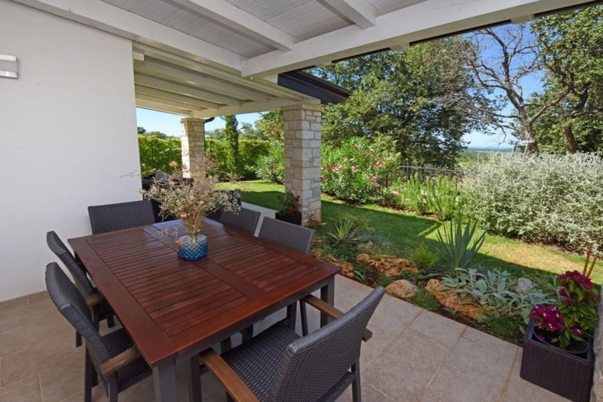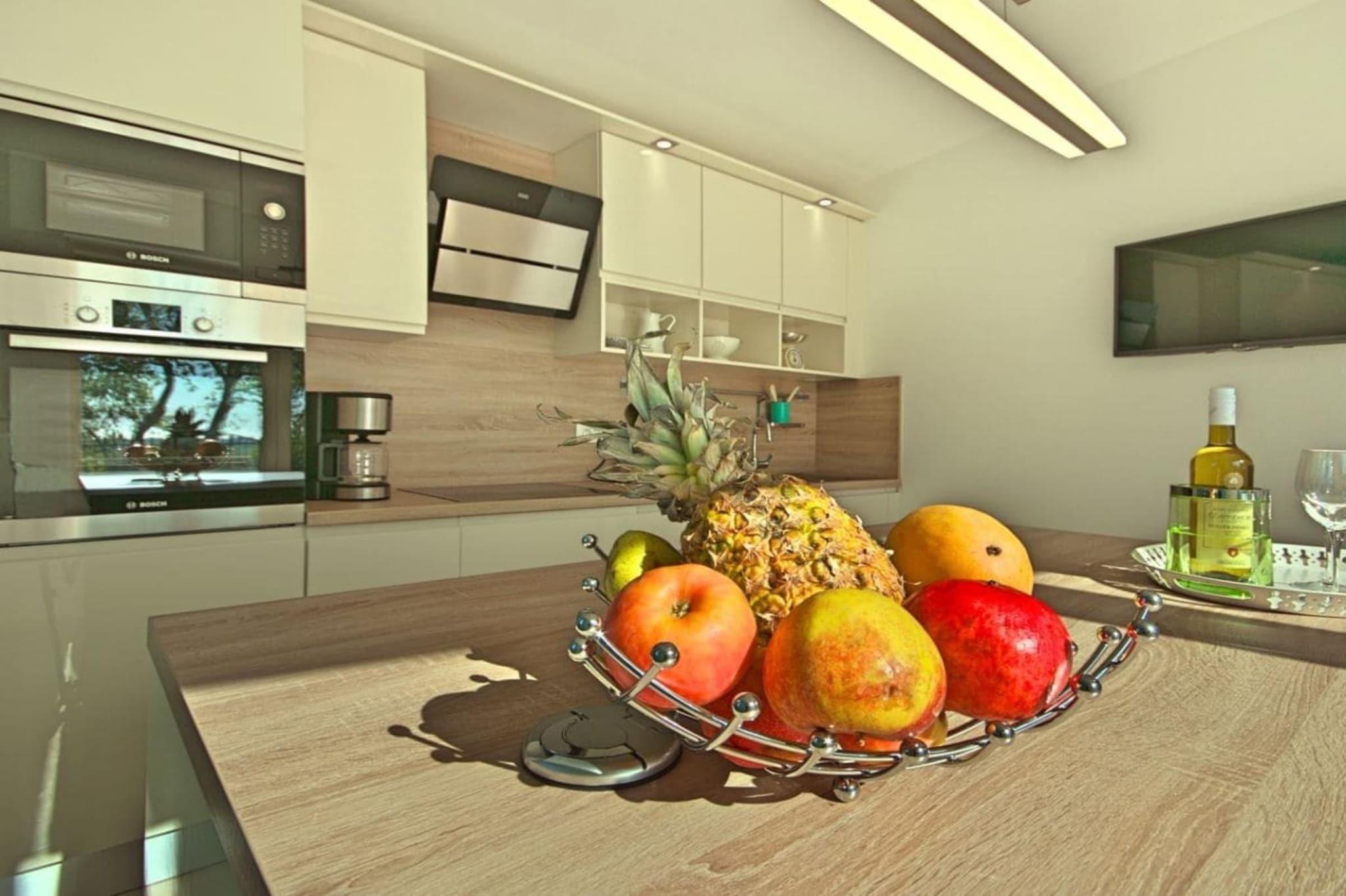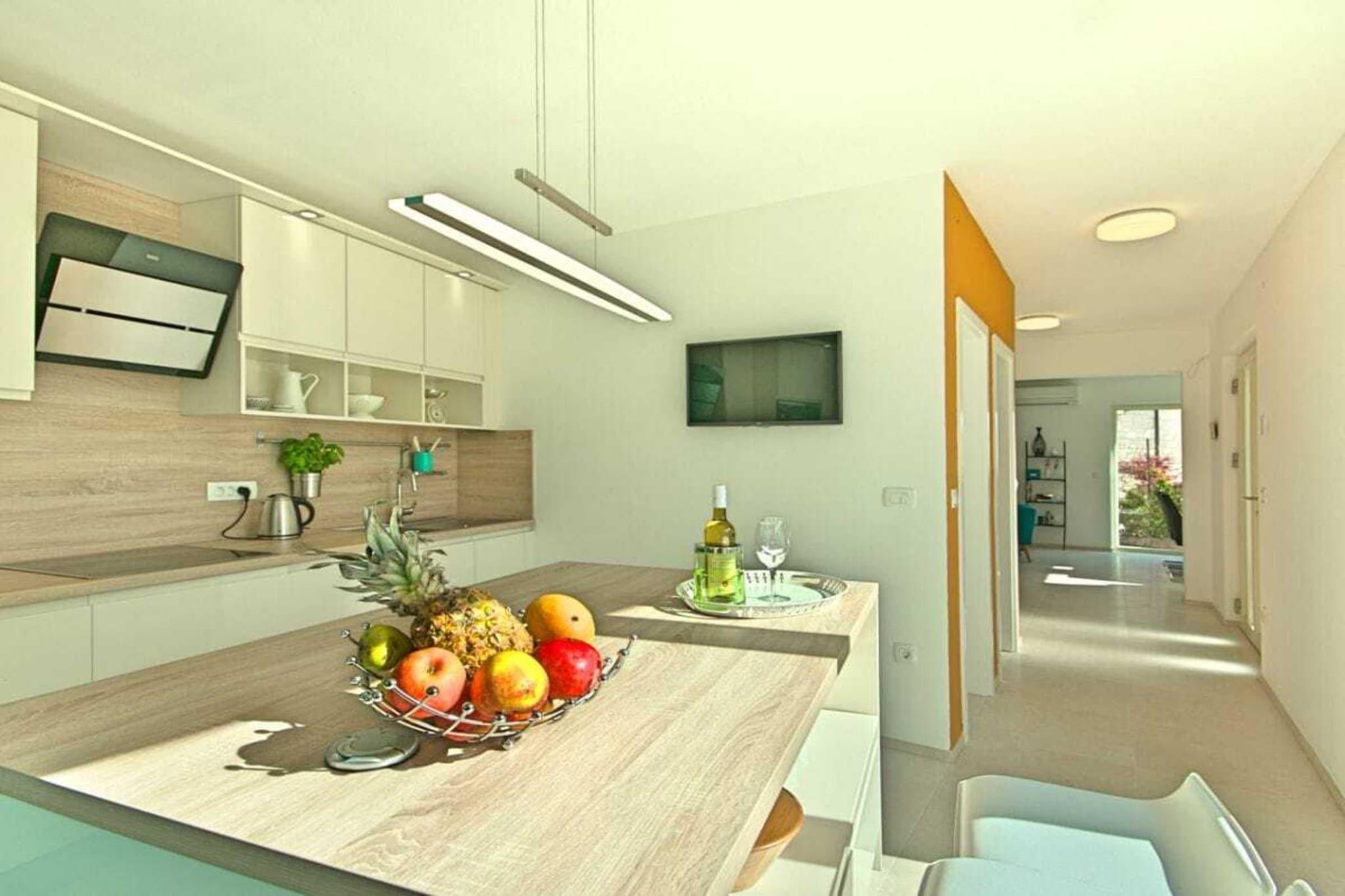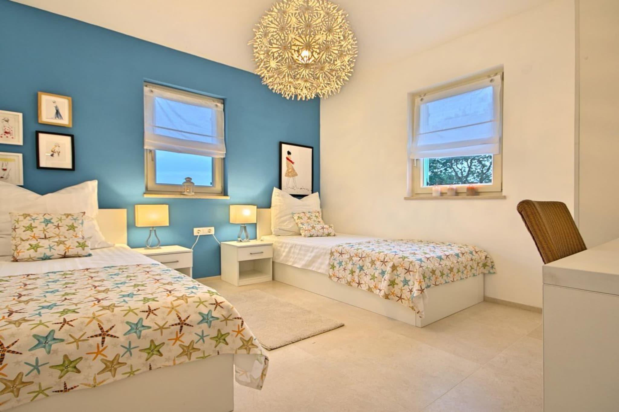 Villa Barbara, sehr schöne Einrichtung mit eingezäuntem, gefegtem Garten Im oberen Stockwerk des modernes Hauses befinden sich 3 Schlafzimmer, zwei mit Doppelbett und eine mit 2 Einzelbetten, auch als Doppelbett möglich.In jedem Zimmer gibt Fernsehen, Klimaanlge- auch mit der man heizen kann, Kleiderschrank. 3 Bäder, zwei im OG , 1 Bad im EG und extra Toilette. Die moderne Küche ist voll ausgestattet mit Kaffeemaschine, Spülmaschine, Herd, Toaster, Mikrowelle, Backofen, Kühlschrank, Gefrierschrank,Geschirrtücher. Vom hellen Wohn- Essbereich geht es auf die große Terrasse mit Meerblick von der es weiter zum eigenen beheiztem Pool 7X4 in den Garten geht, Grill. Im Hoff befinden sich Ihre privaten Autoabstellplätze.