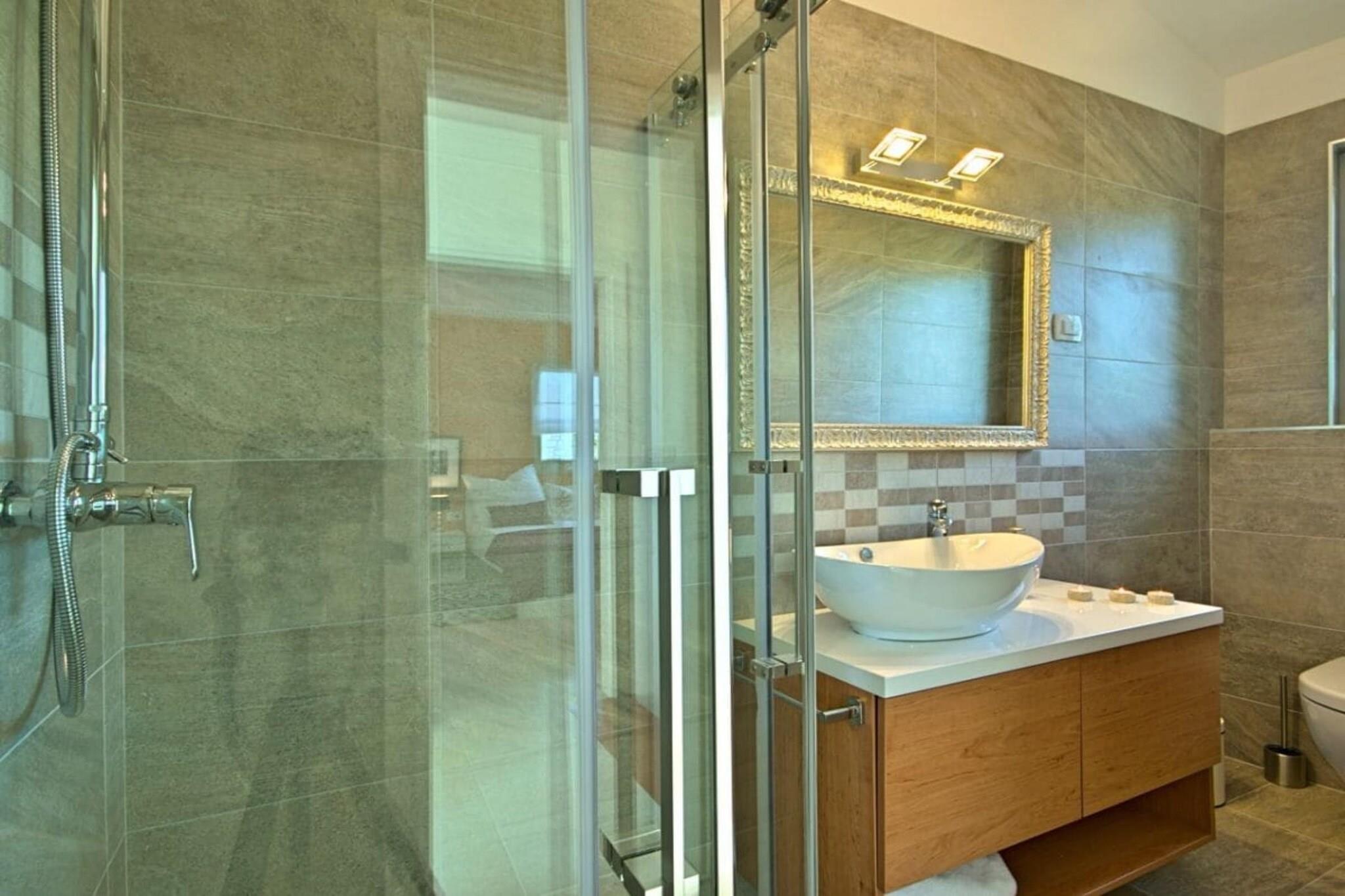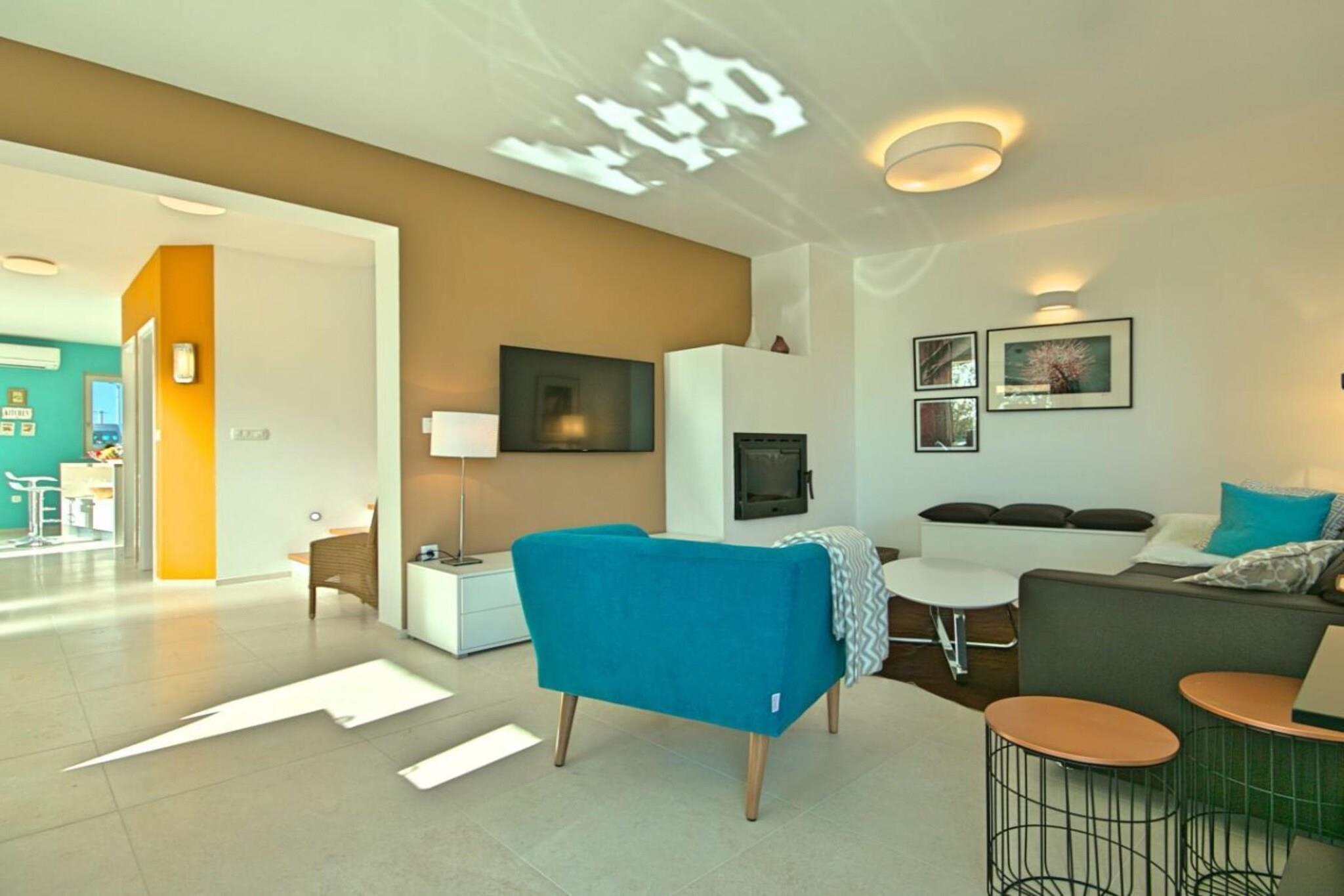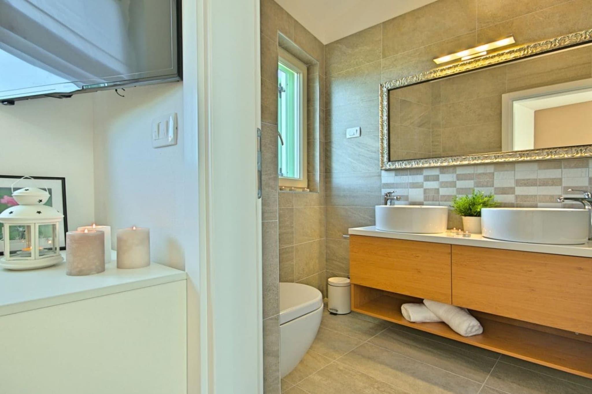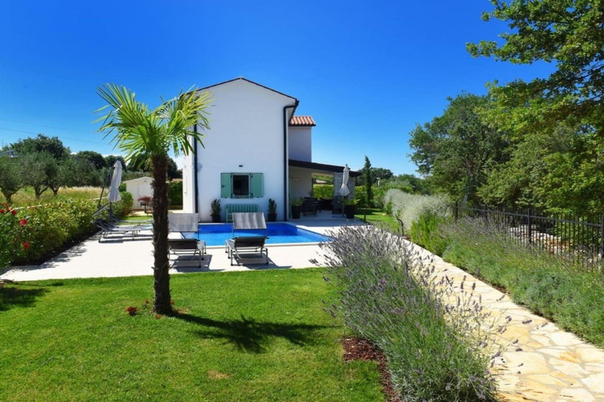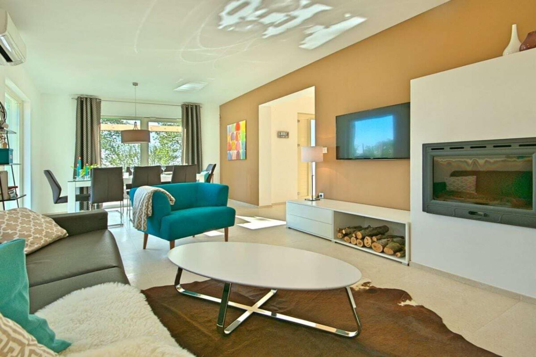 Villa Barbara, sehr schöne Einrichtung mit eingezäuntem, gefegtem Garten Im oberen Stockwerk des modernes Hauses befinden sich 3 Schlafzimmer, zwei mit Doppelbett und eine mit 2 Einzelbetten, auch als Doppelbett möglich.In jedem Zimmer gibt Fernsehen, Klimaanlge- auch mit der man heizen kann, Kleiderschrank. 3 Bäder, zwei im OG , 1 Bad im EG und extra Toilette. Die moderne Küche ist voll ausgestattet mit Kaffeemaschine, Spülmaschine, Herd, Toaster, Mikrowelle, Backofen, Kühlschrank, Gefrierschrank,Geschirrtücher. Vom hellen Wohn- Essbereich geht es auf die große Terrasse mit Meerblick von der es weiter zum eigenen beheiztem Pool 7X4 in den Garten geht, Grill. Im Hoff befinden sich Ihre privaten Autoabstellplätze.
