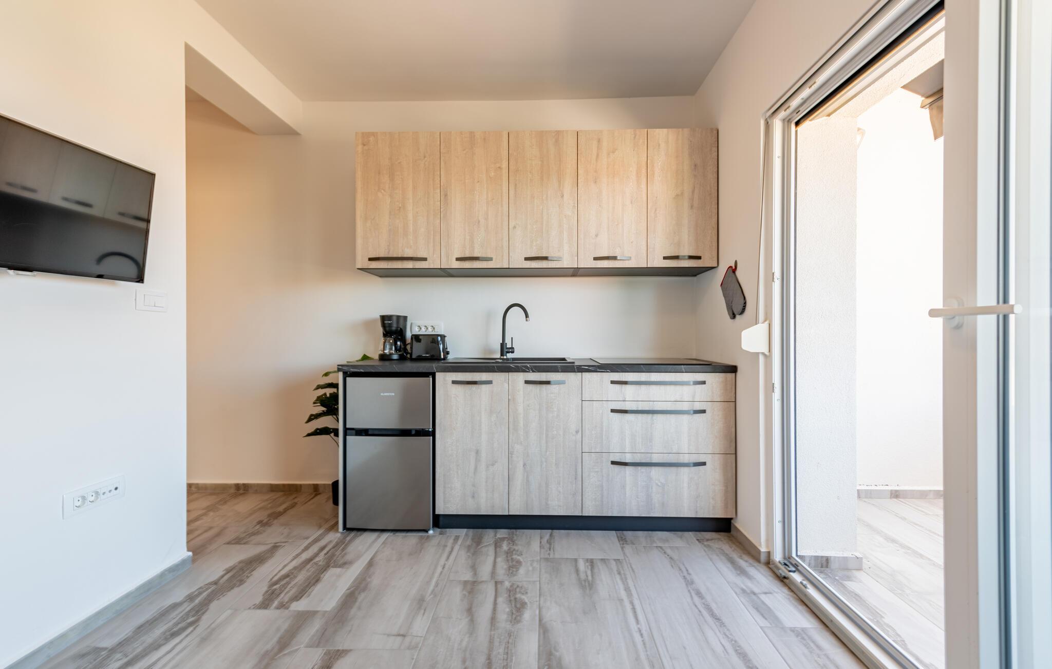 I en bygård med flere ferieleiligheter ligger denne pene leiligheten, som ønsker deg velkommen med innbydende komfort. De attraktive møblene er moderne og tiltalende, og i kombinasjon med det naturlige lyset som strømmer inn, kan du få mest mulig ut av ferien mens du lager mat, leker eller slapper av. Gå ut på balkongen fra stuen, hvor du kan nyte en dampende kopp kaffe om morgenen og se på havet eller solnedgangen om kvelden.