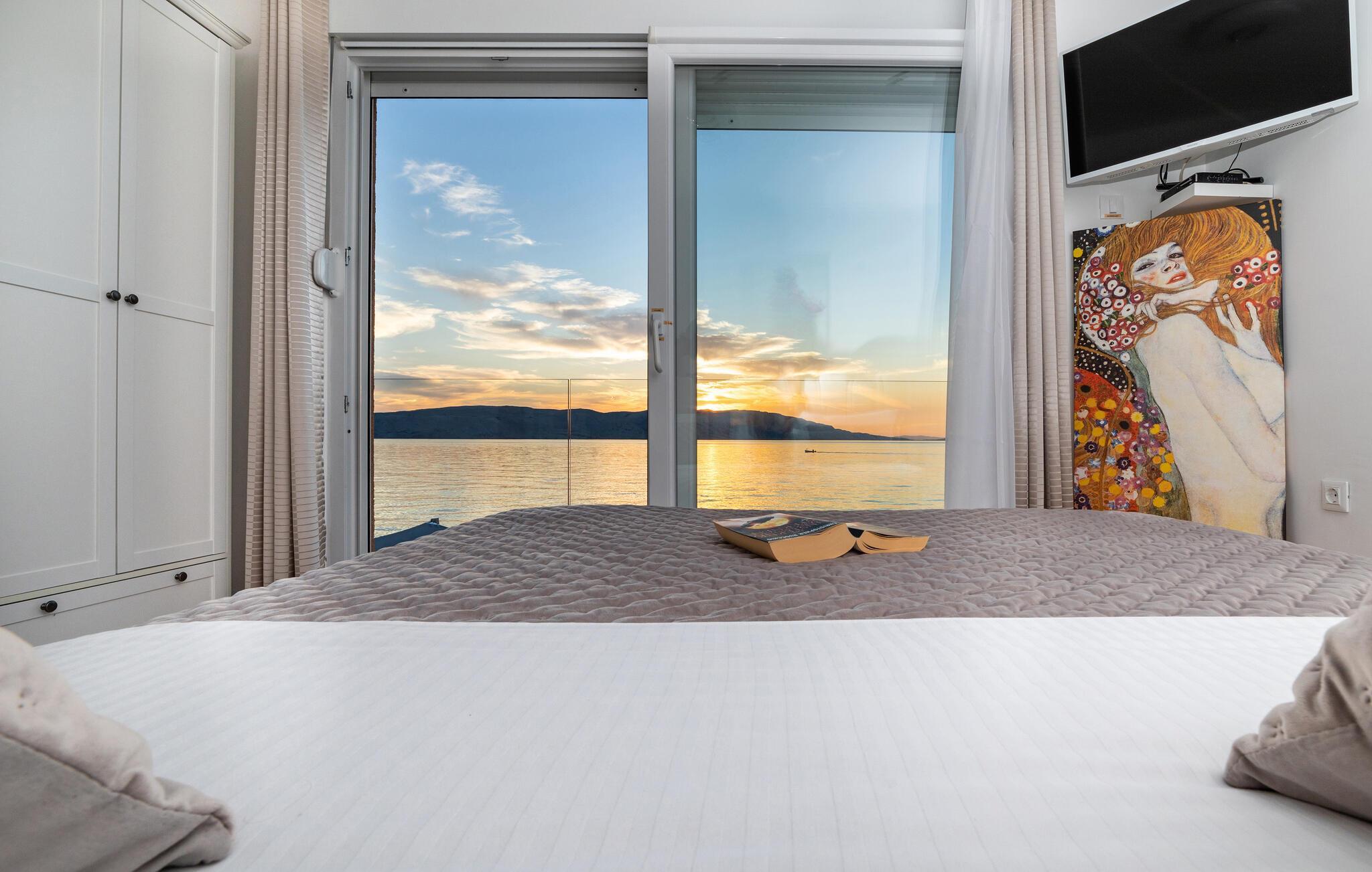 Opplev en luksuriøs ferievilla ved sjøen designet for din største fornøyelse. Villaen tilbyr fantastisk panoramautsikt fra alle rom. Slapp av på terrassen på baksiden eller nyt skjønnheten i bukten på de luksuriøse solsengene i solen. Villaen er utstyrt med underholdningsfasiliteter som bordfotball, dart, bordtennis og ulike brettspill for hele familien, og har en badstue for avslapning. Denne villaen er perfekt for deg som søker ro, stjernekikking og en fortryllende utsikt over landsbyen. Du kommer til villaen via en smal, svingete vei, og det er en eksklusiv parkeringsplass under et stort eiketre for å holde bilen beskyttet og kjølig.