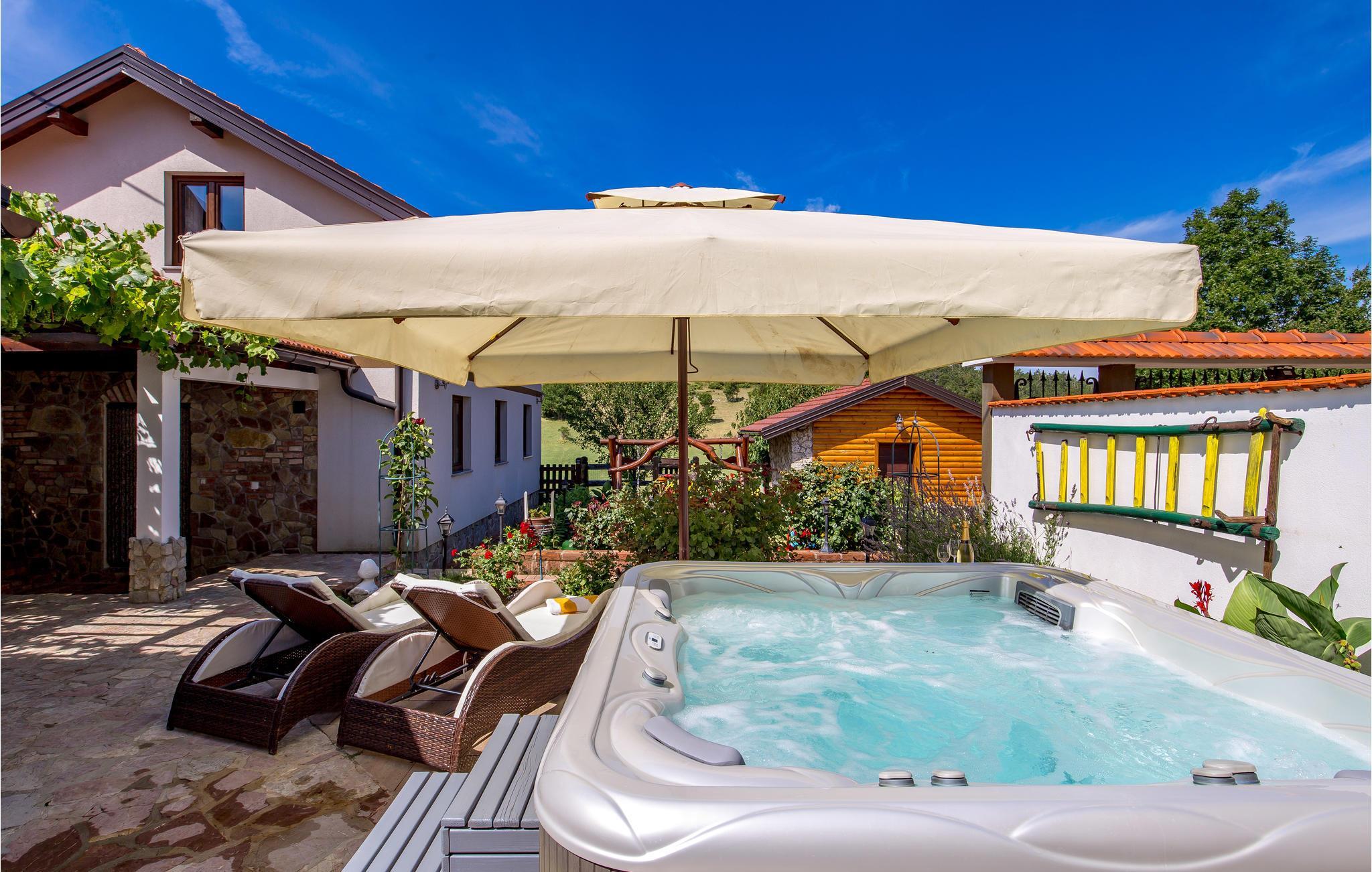 Utenfor kan du slappe av i boblebadet eller på hagestolene og beundre de mange detaljene i hagen. I mellomtiden kan barna leke på sklien og med lekeplassutstyret.