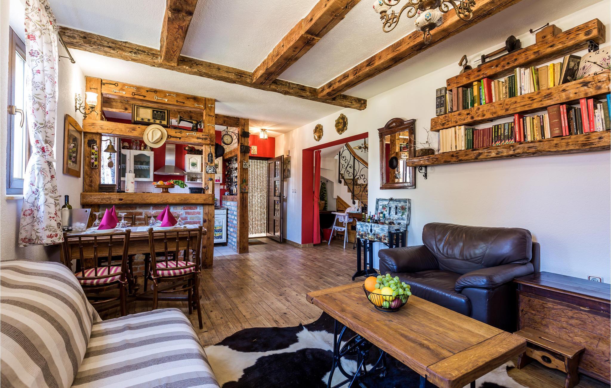Mye oppmerksomhet på detaljer venter deg i dette feriehuset. Interiøret i huset er innredet med mange detaljer i en rustikk og personlig stil. Husets hjerte er stuen med åpent kjøkken og spiseplass, hvor du kan tilbringe mange koselige timer med familien med å leke eller spise. Husets 2 soverom ligger i første etasje og kan nås via en trapp.