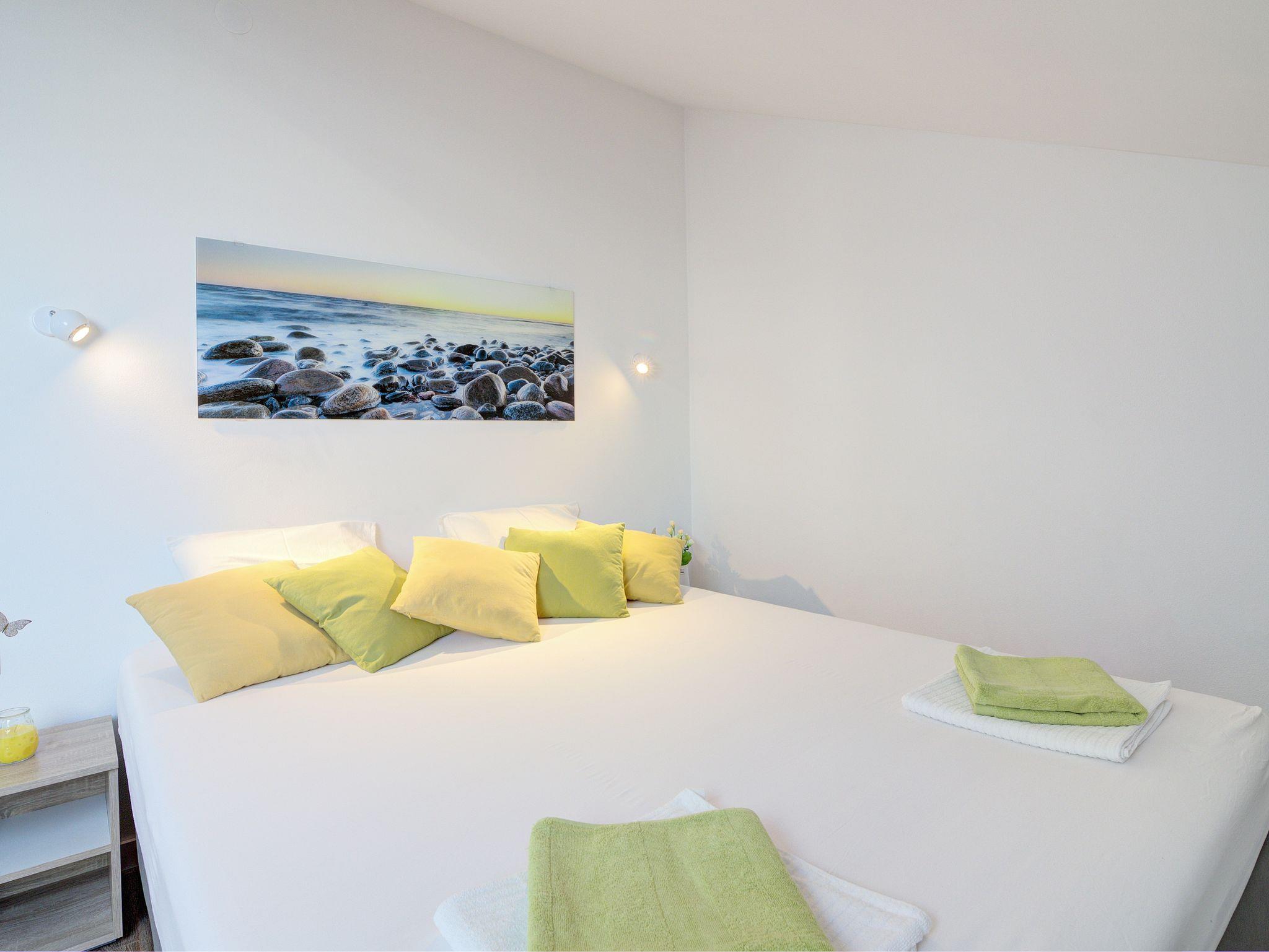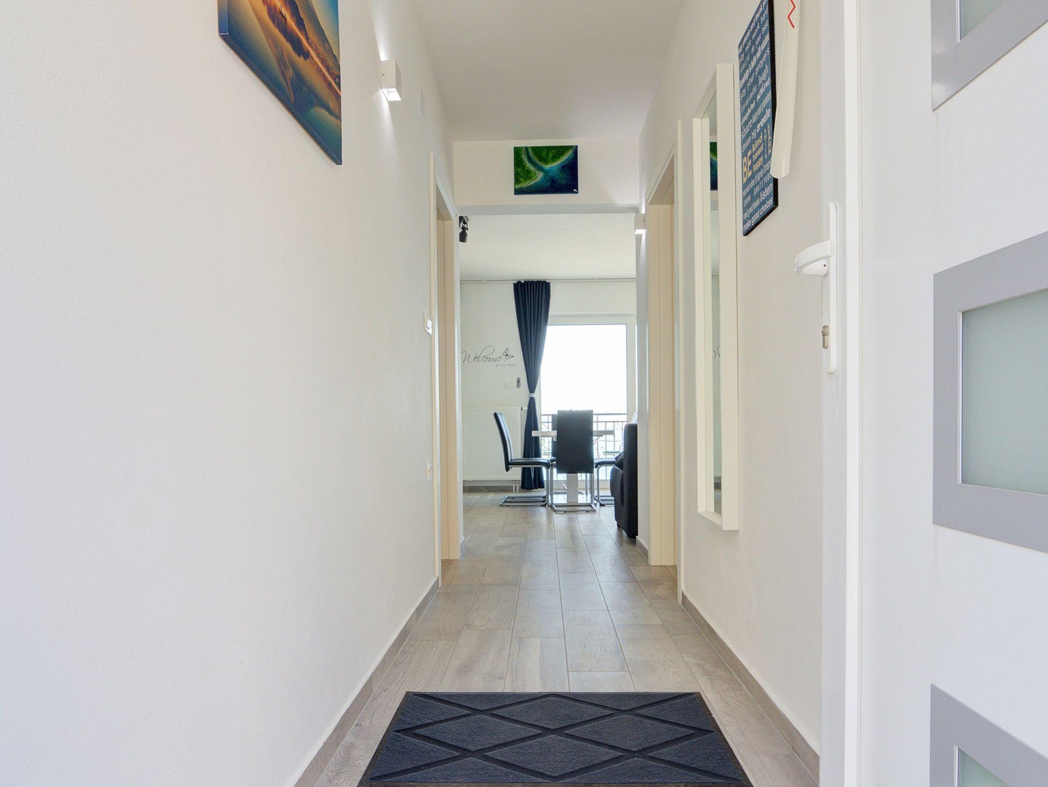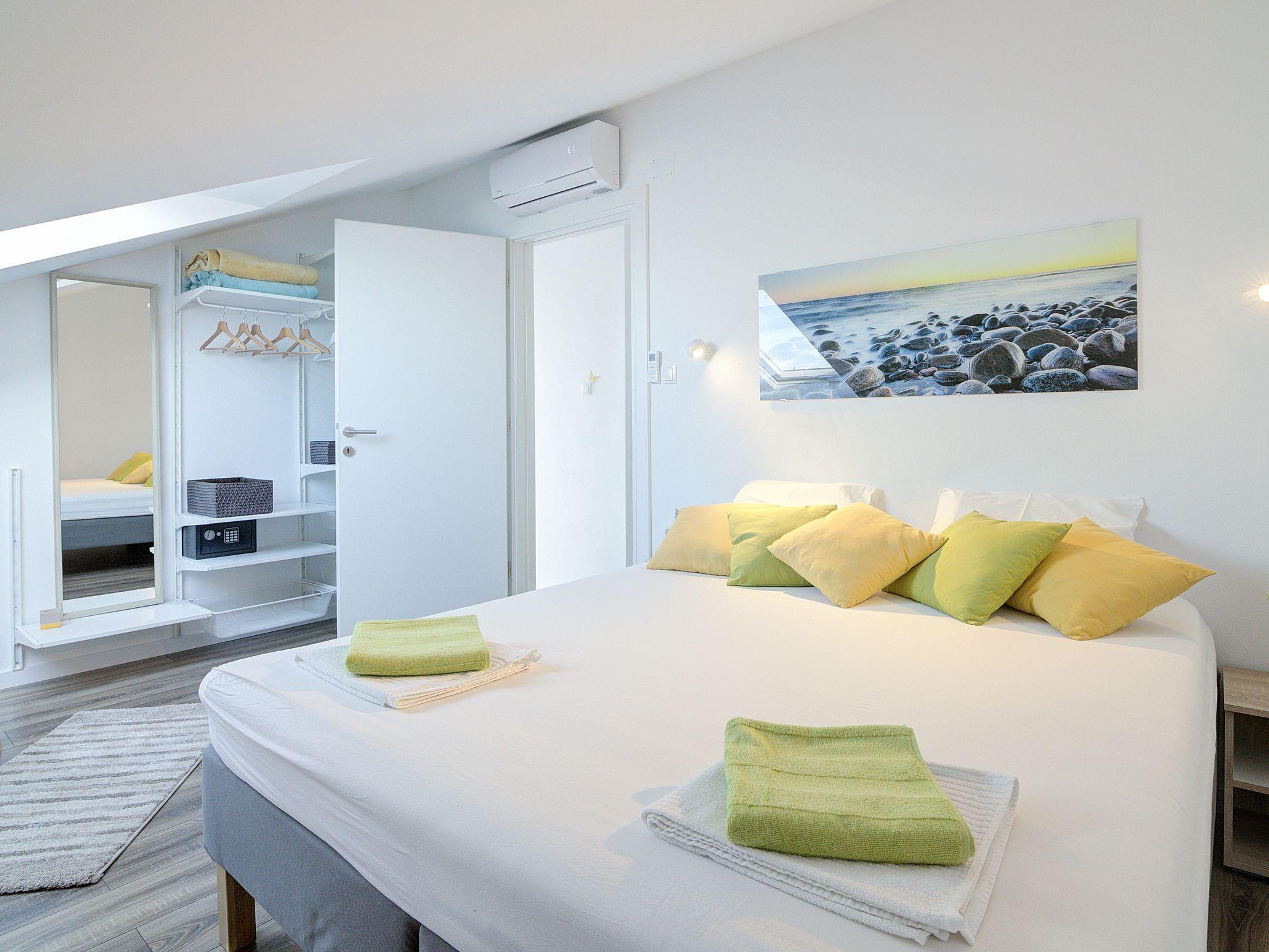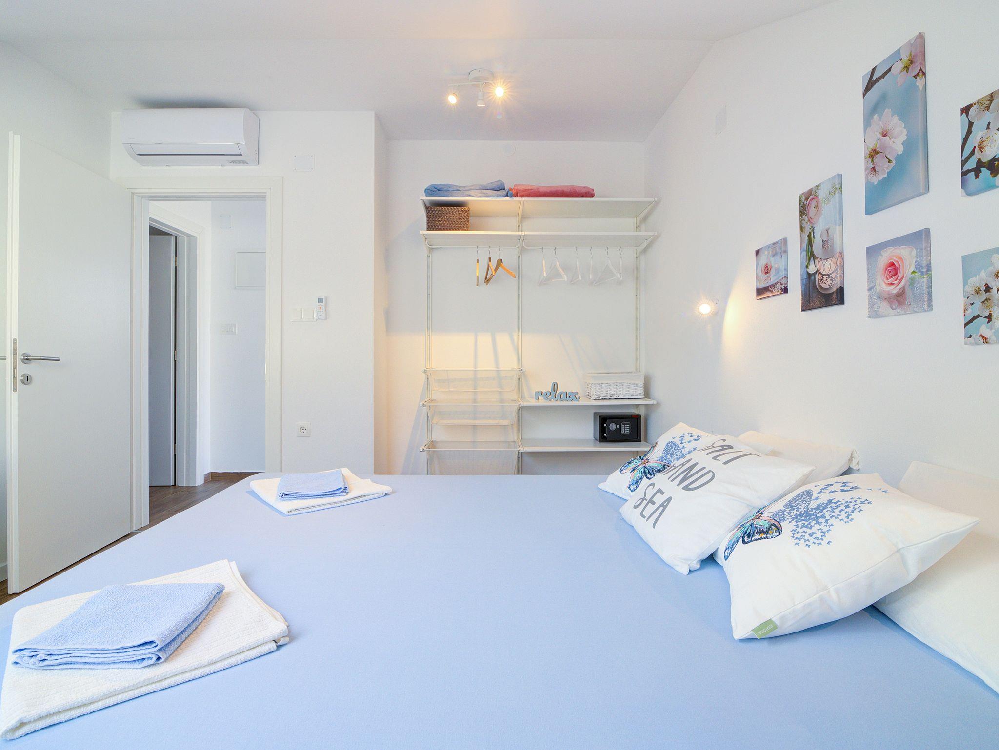 Ferienwohnung bietet Platz für 6 Gäste. Die Betten sind in Schlafzimmern, die es 2 gibt, und in Wohnzimmer, innerhalb einer Gesamtfläche von 70m2, angeordnet. Die Gäste haben einen eigenen Balkon zur Verfügung, auf der sie in warmen Sommernächten genießen können. Das Apartment bietet Meerblick. In der Unterkunftseinheit besteht die Möglichkeit des Mitbringens von Haustieren gegen Aufpreis. IM PREIS INBEGRIFFEN: Kurtaxe, Endreinigung, Klimatisierung, Zentralheizung, Internet, Kinderbett, Bügeleisen, Bügelbrett, Föhn. VERBINDLICHE ZUSÄTZLICHE KOSTEN: Aufzahlung für Kurzaufenthalte (prozentualer Zuschlag pro Nächtigungsanzahl: 30% - 1, 20% - 2, 10% - 3). UNVERBINDLICHE ZUSÄTZLICHE KOSTEN: Haustiere (5,00 € pro Nacht). Die Verfügbarkeit zusätzlicher Dienstleistungen in Ihrem reservierten Termin und die Preise derselben (falls nicht aufgeführt) müssen im Voraus überprüft werden. Zusätzliche Dienstleistungen die in der Zahlungsaufforderung nicht aufgeführt sind werden direkt beim Vermieter bezahlt, angenommen der Gast nutzt auch diese.