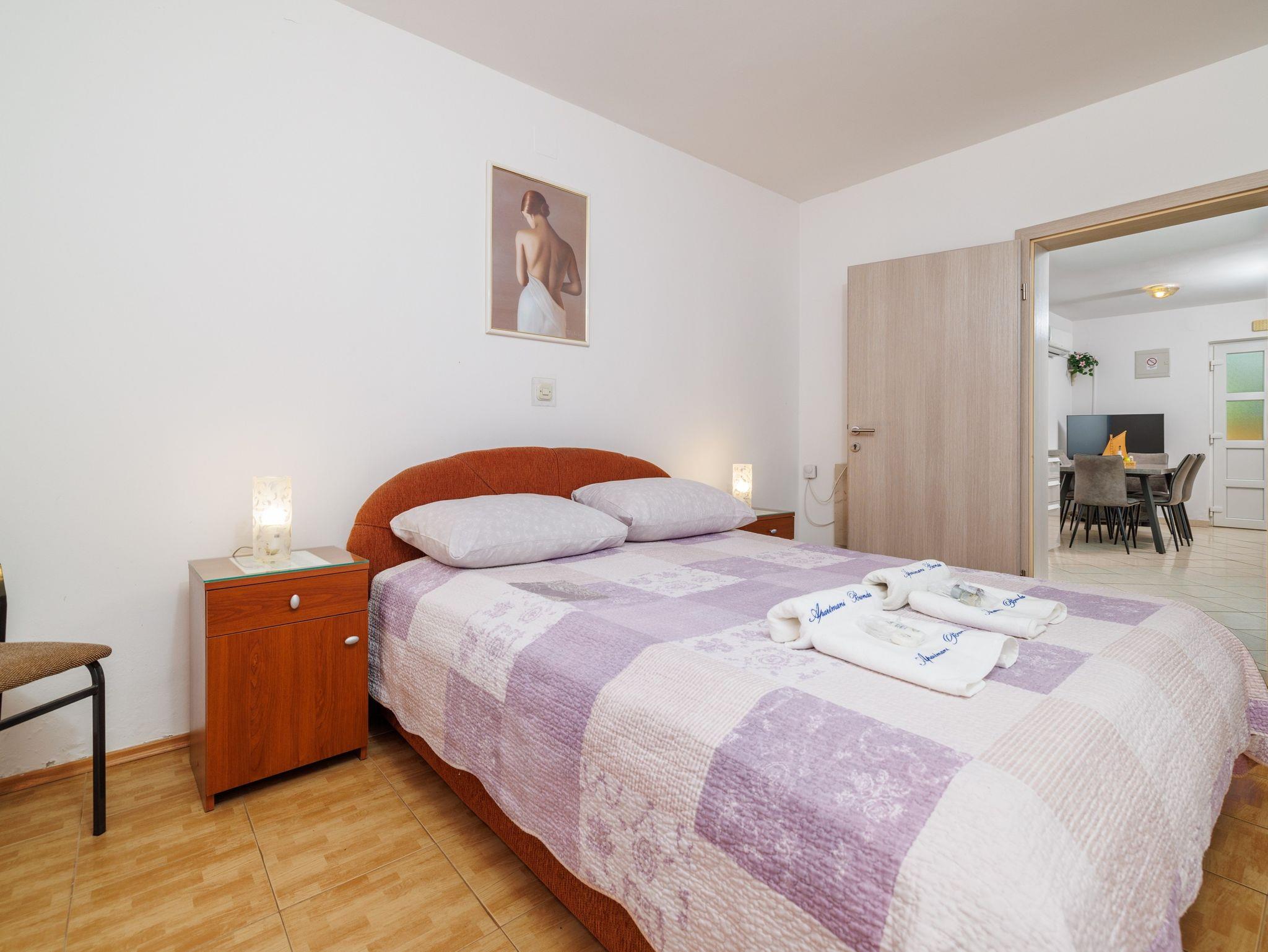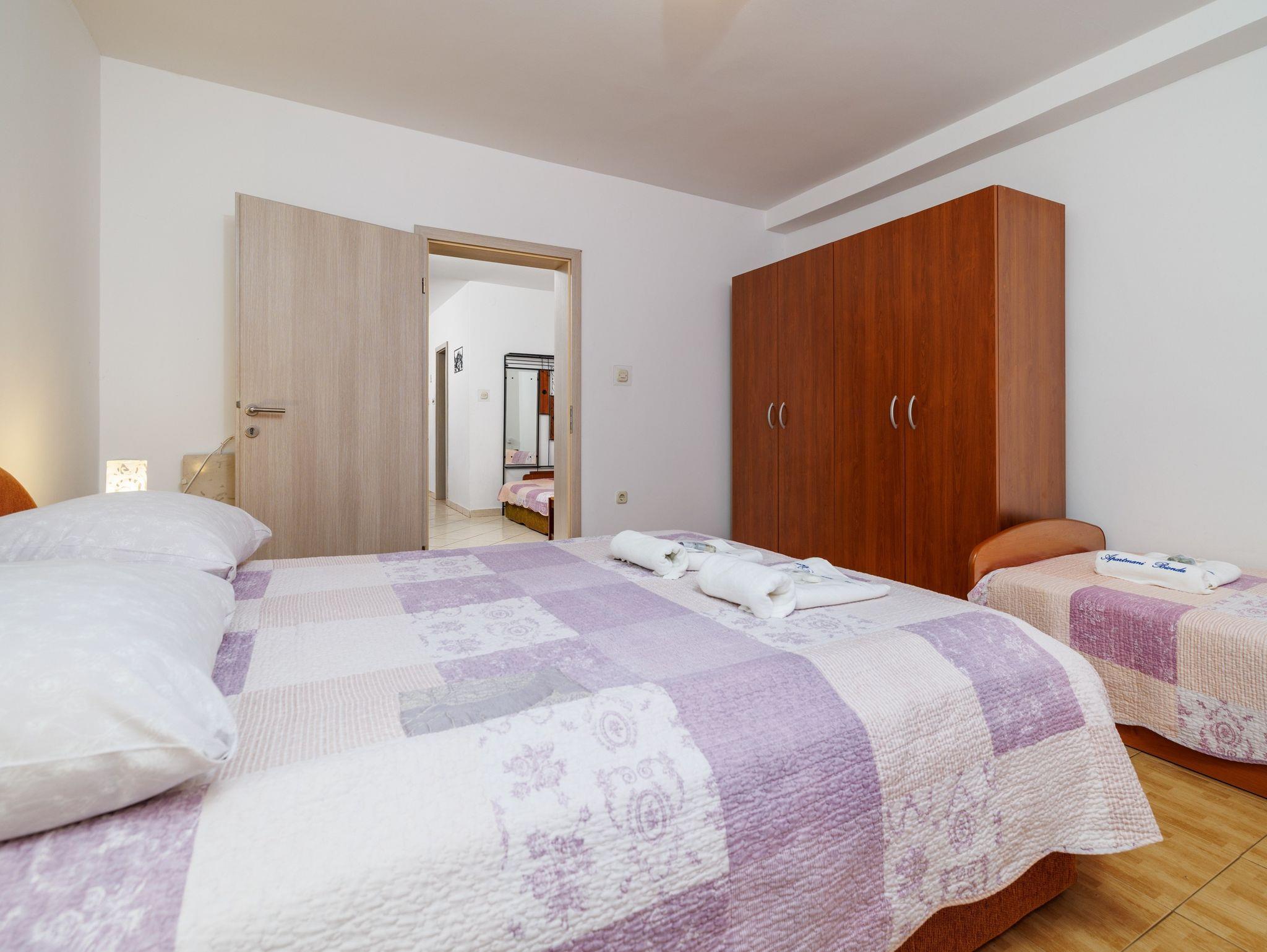 Ferienwohnung bietet Platz für 5 Gäste. Die Betten sind in Schlafzimmern, die es 1 gibt, und in Wohnzimmer, innerhalb einer Gesamtfläche von 39m2, angeordnet. Die Gäste haben eine eigene Terrasse zur Verfügung, auf der sie in warmen Sommernächten genießen können. Es ist erlaubt, Speisen auf dem Gemeinschafts-Grill vorzubereiten. IM PREIS INBEGRIFFEN: Kurtaxe, Endreinigung, Parkplatz, Internet, Bügeleisen. UNVERBINDLICHE ZUSÄTZLICHE KOSTEN: Klimatisierung (5,00 € pro Nacht), Wäschewaschen (5,00 € Waschen), Zusatzbett (7,00 € pro Nacht). Die Verfügbarkeit zusätzlicher Dienstleistungen in Ihrem reservierten Termin und die Preise derselben (falls nicht aufgeführt) müssen im Voraus überprüft werden. Zusätzliche Dienstleistungen die in der Zahlungsaufforderung nicht aufgeführt sind werden direkt beim Vermieter bezahlt, angenommen der Gast nutzt auch diese. Ermäßigung auf den Grundpreis: Gratistag 14=13 (bei einem Aufenthalt von 14 Tagen oder mehr erhalten Sie einen Gratistag für den Aufenthalt bis 31.12.26).