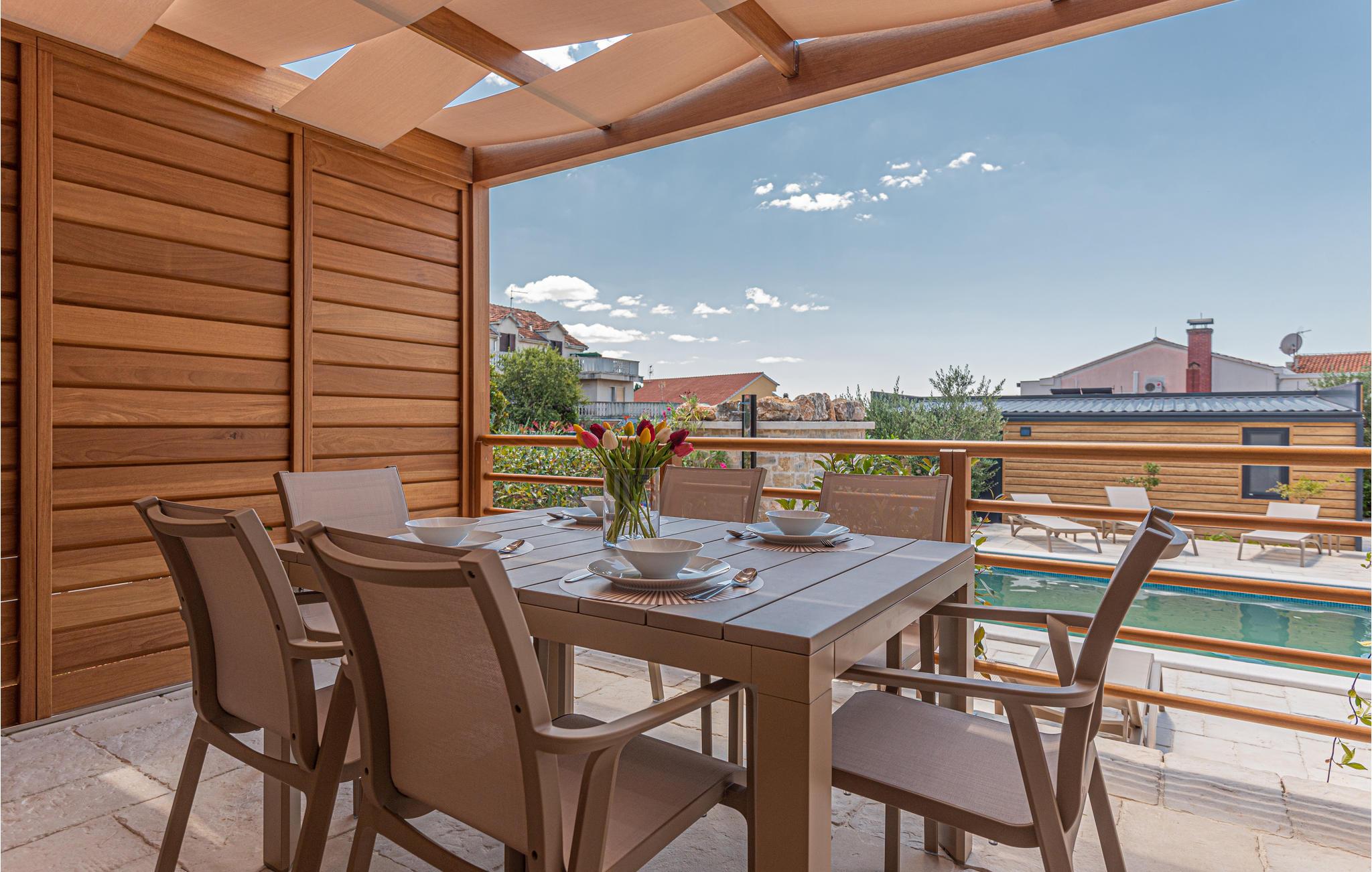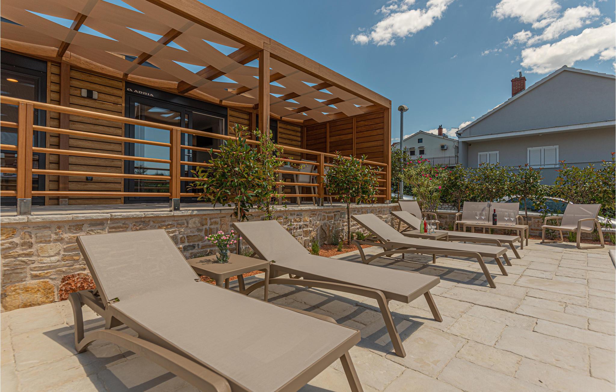 Tilbring en uforglemmelig ferie ikke langt fra havet. Den sjarmerende kystbyen Brodarica med denne vakre boligen er det perfekte stedet for en avslappende ferie. Gå inn i det kompakte huset, som er utstyrt med alt du trenger for å føle deg som hjemme. Det vennlige og lyse fargevalget og de komfortable møblene gir deg et flott helhetskonsept. Nyt den romslige terrassen med pergola, hvor du kan grille om kvelden eller sitte i en kurvstol med en bok. Et felles basseng er også tilgjengelig på eiendommen, og lover deg avkjøling og utsikt over havet.