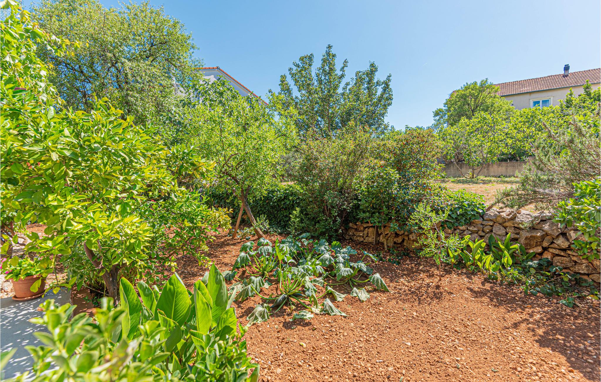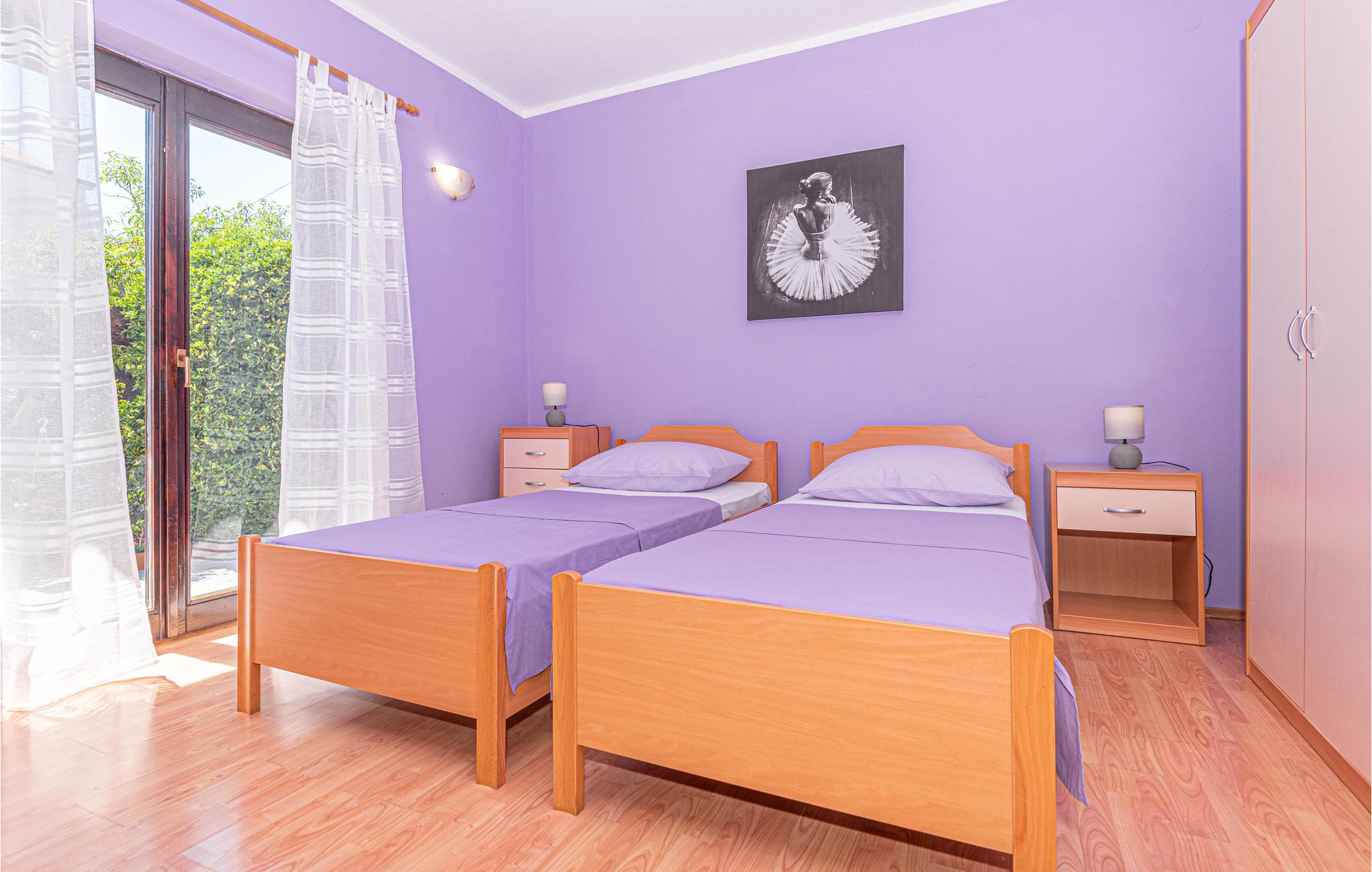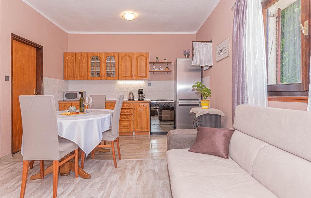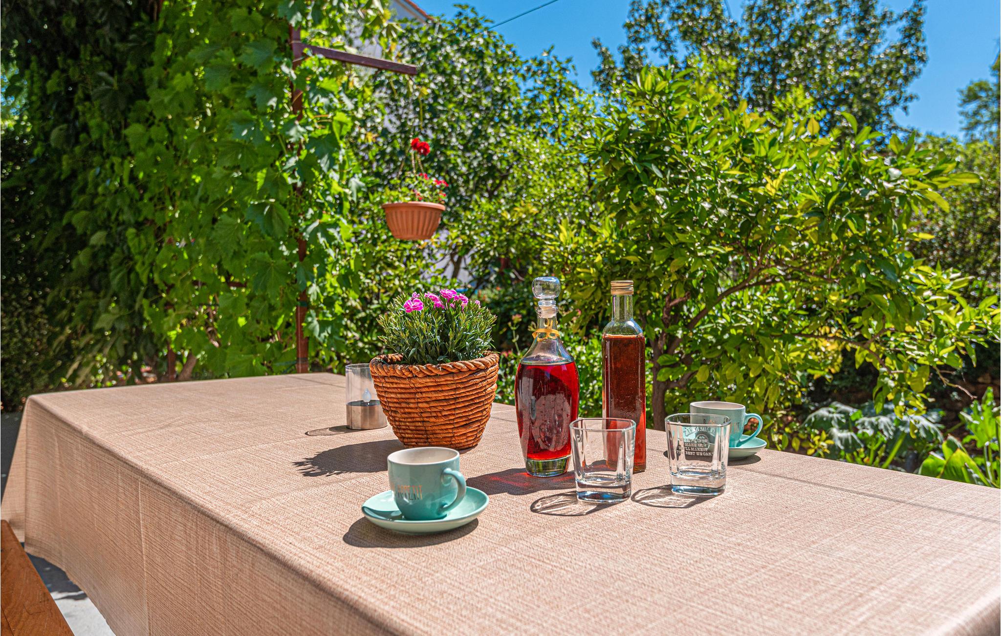 Kom og bo i denne fargerike ferieboligen og nyt en herlig ferie i Raslina. En romslig balkong står til din disposisjon. Her kan du nyte en herlig frokost i frisk luft før du går til stranden, som ligger bare noen få meter fra huset. Du kan også sitte ute i det grønne bak huset og nyte en deilig grillmat eller en hjemmelaget pizza fra steinovnen om kvelden.