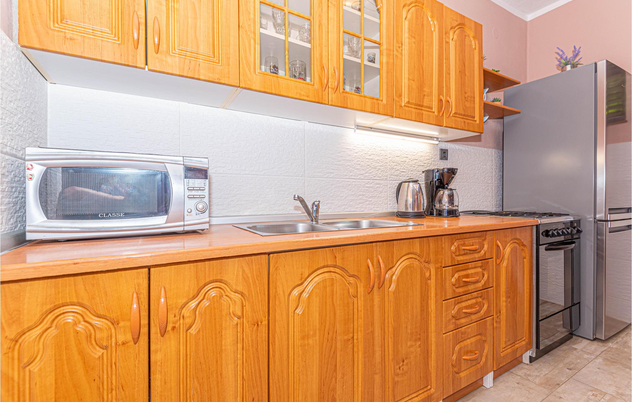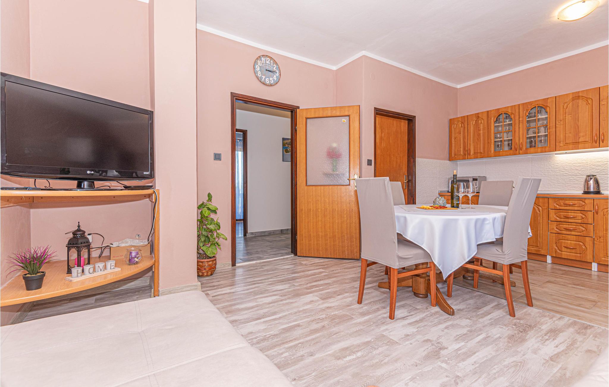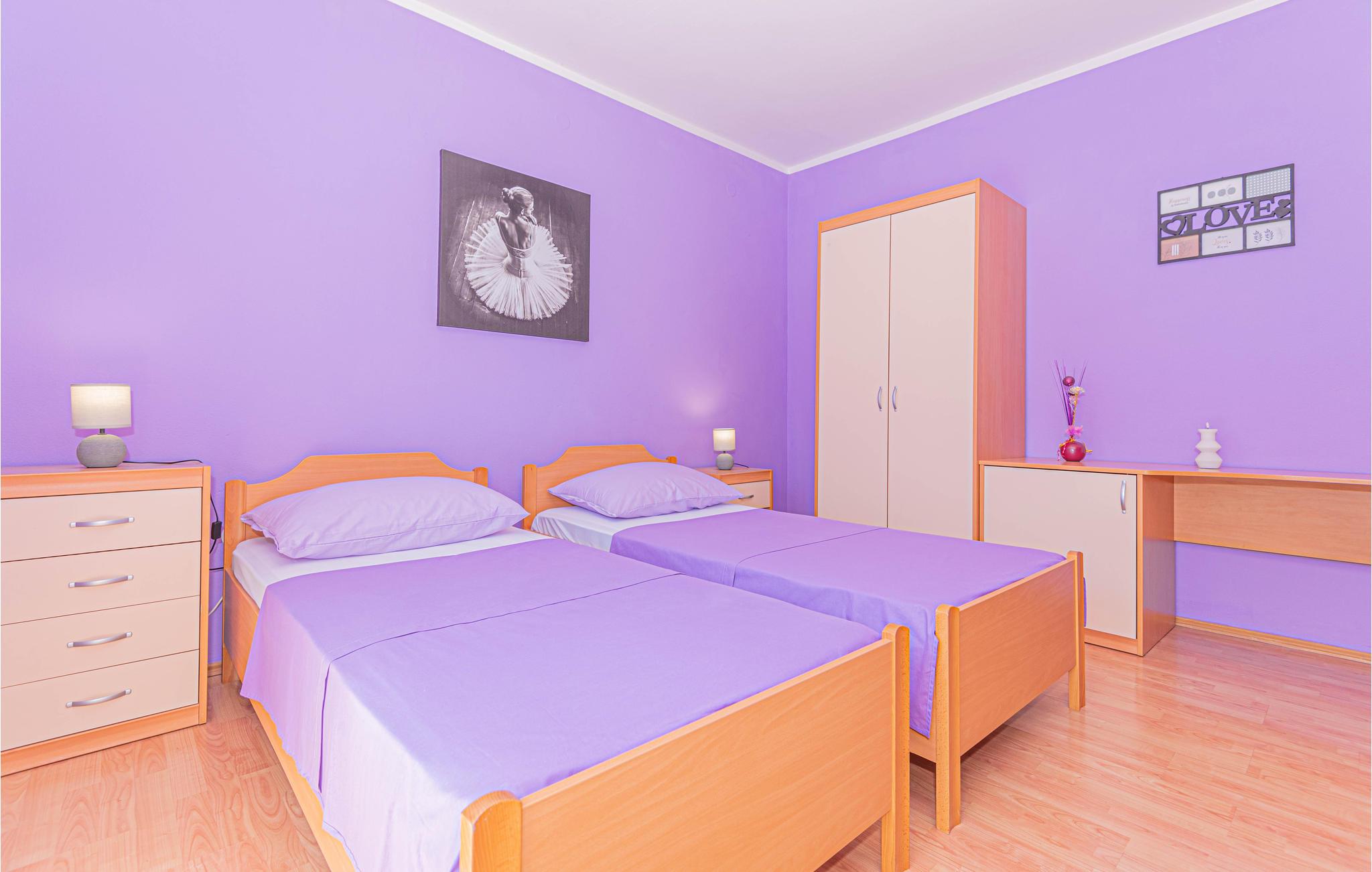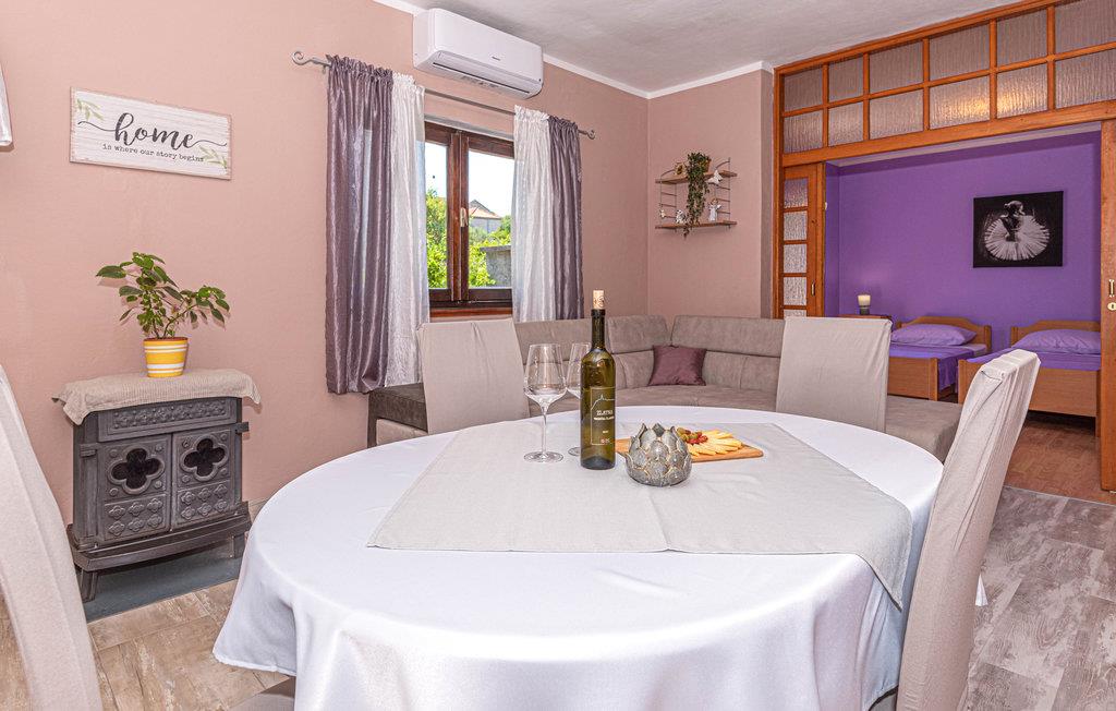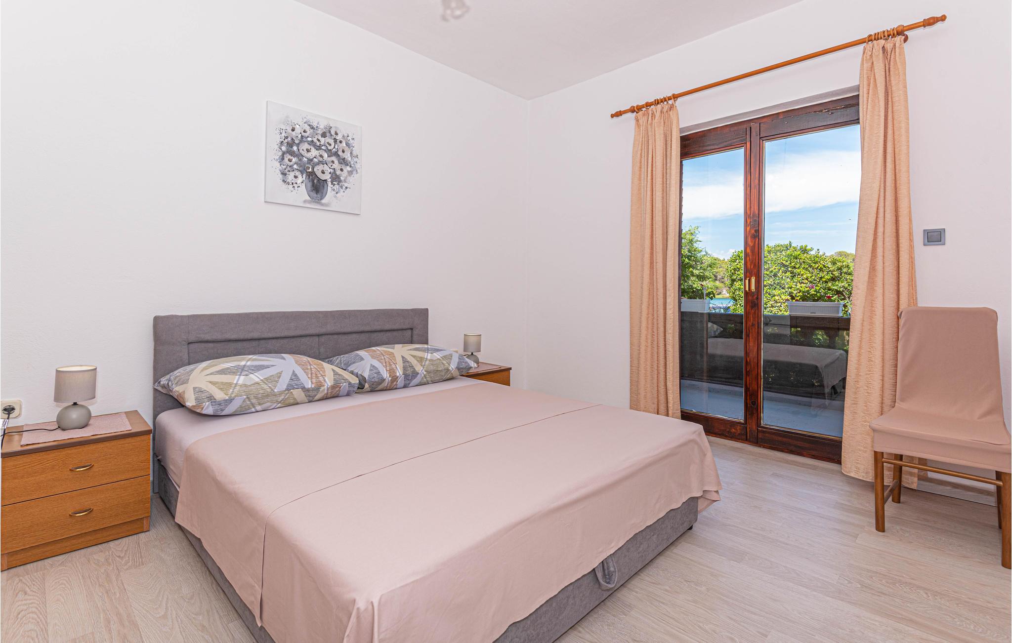 Kom og bo i denne fargerike ferieboligen og nyt en herlig ferie i Raslina. En romslig balkong står til din disposisjon. Her kan du nyte en herlig frokost i frisk luft før du går til stranden, som ligger bare noen få meter fra huset. Du kan også sitte ute i det grønne bak huset og nyte en deilig grillmat eller en hjemmelaget pizza fra steinovnen om kvelden.