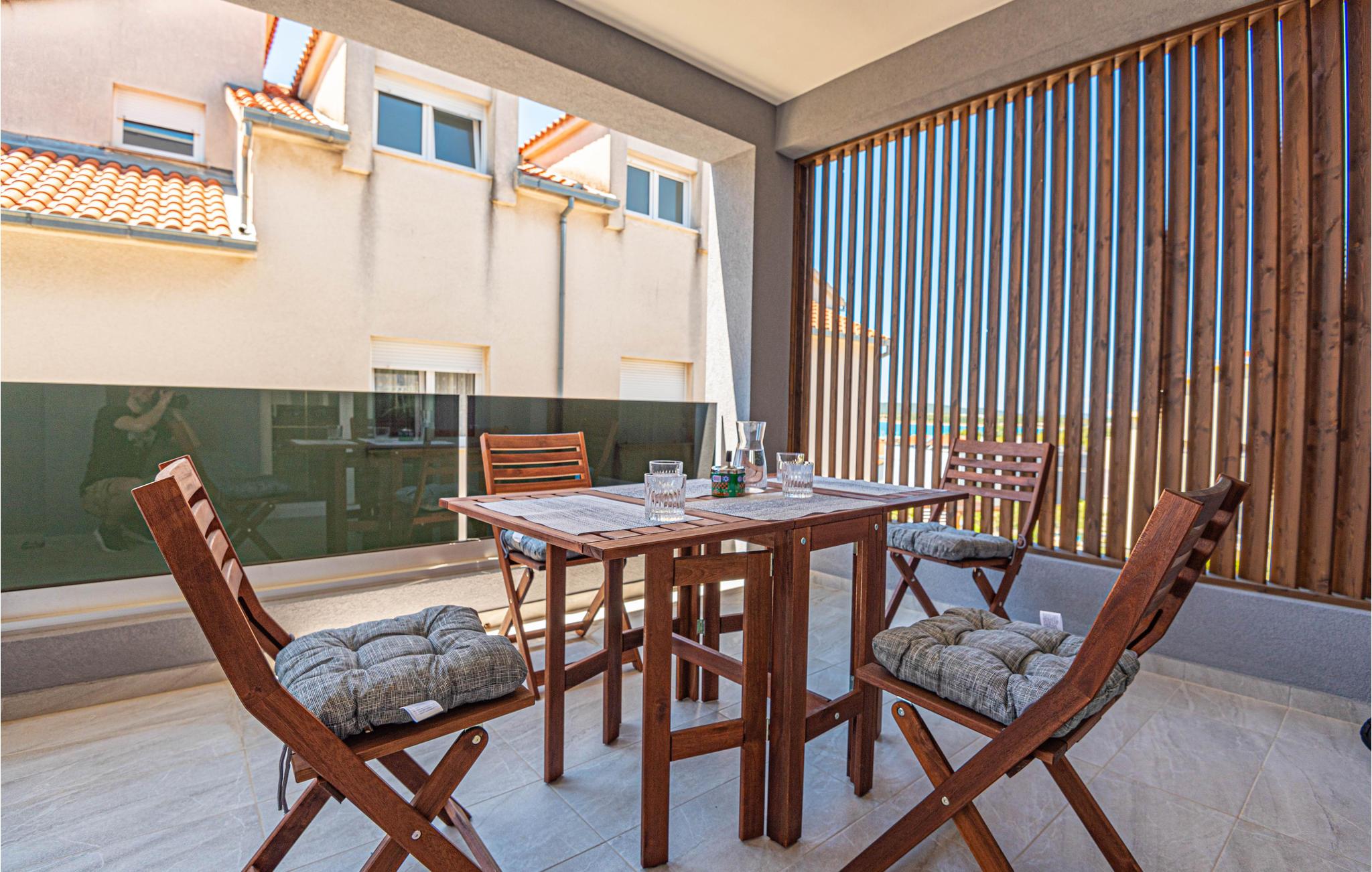 Leiligheten har også en overbygd terrasse hvor du kan tilbringe ferien med å lese eller spise måltider.