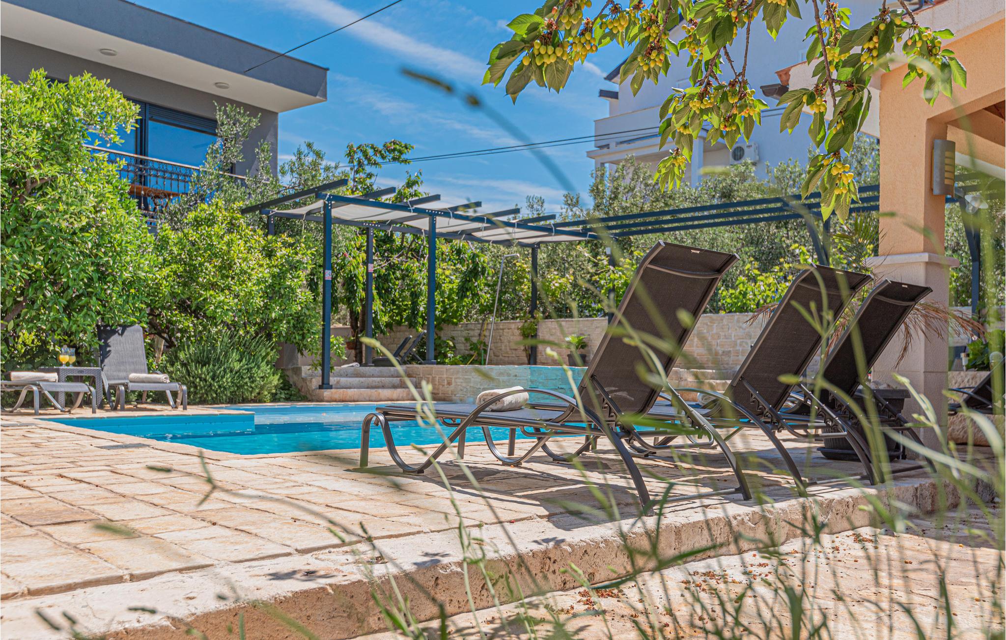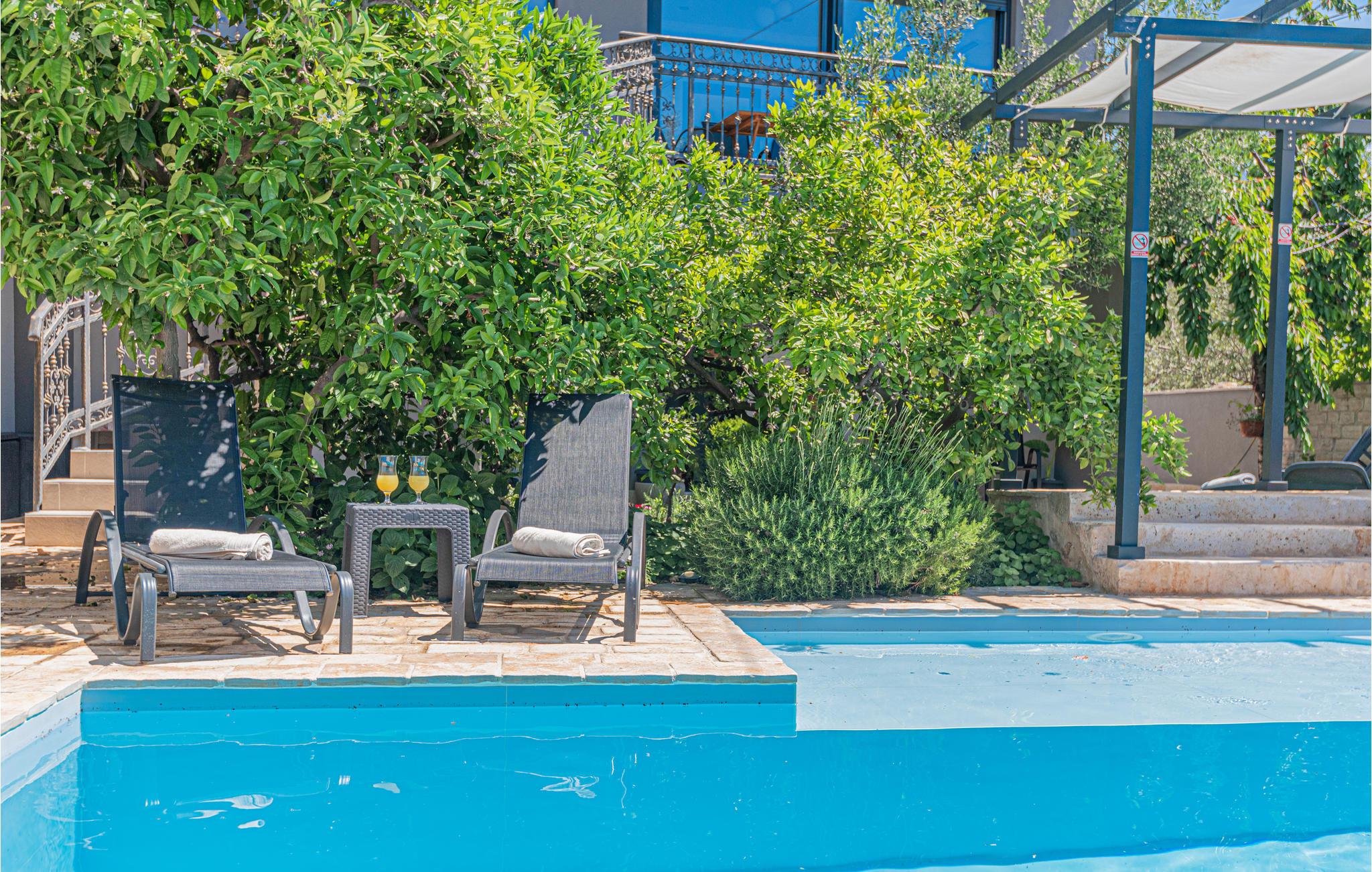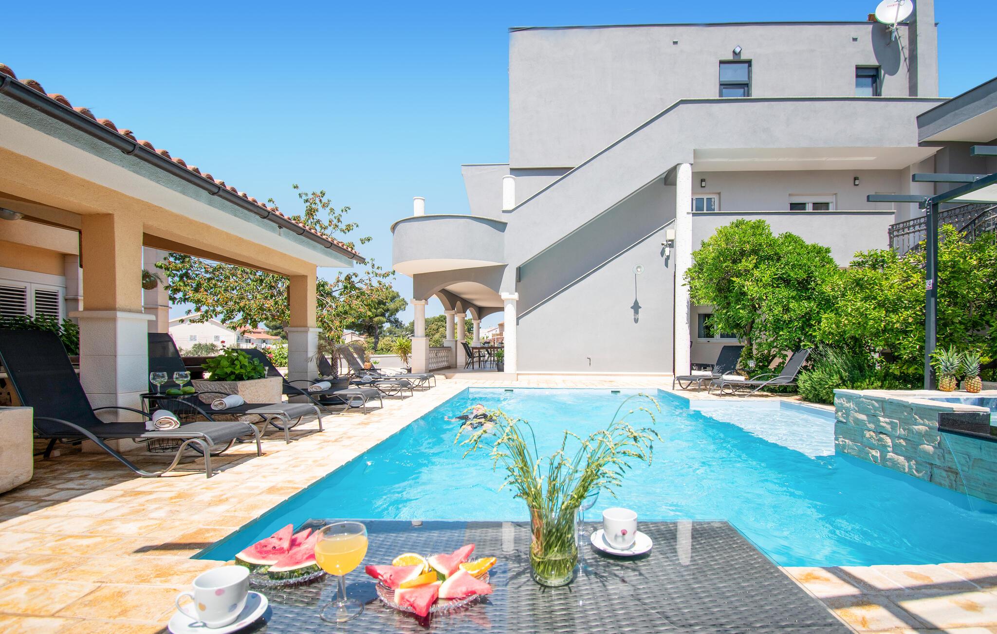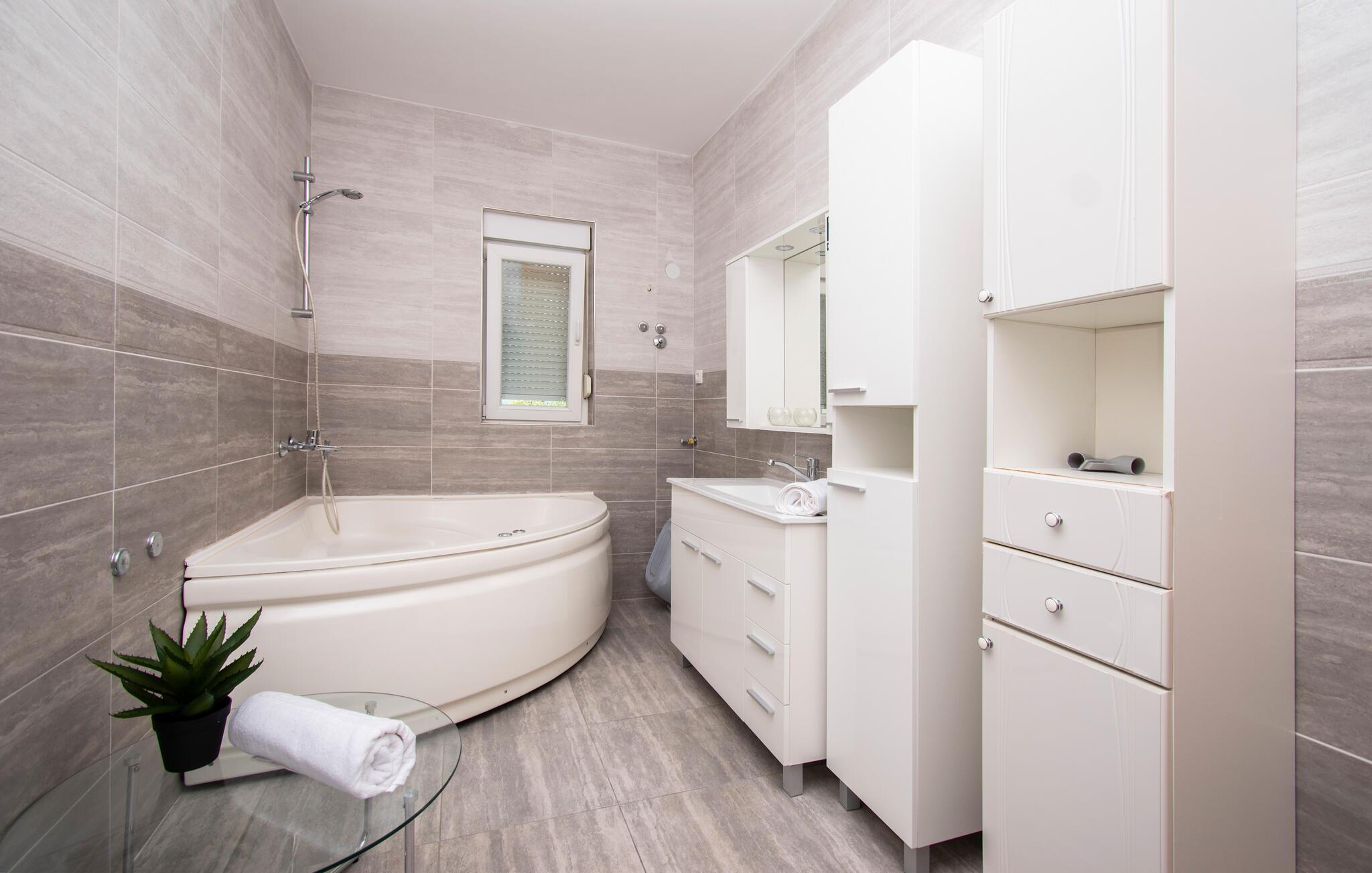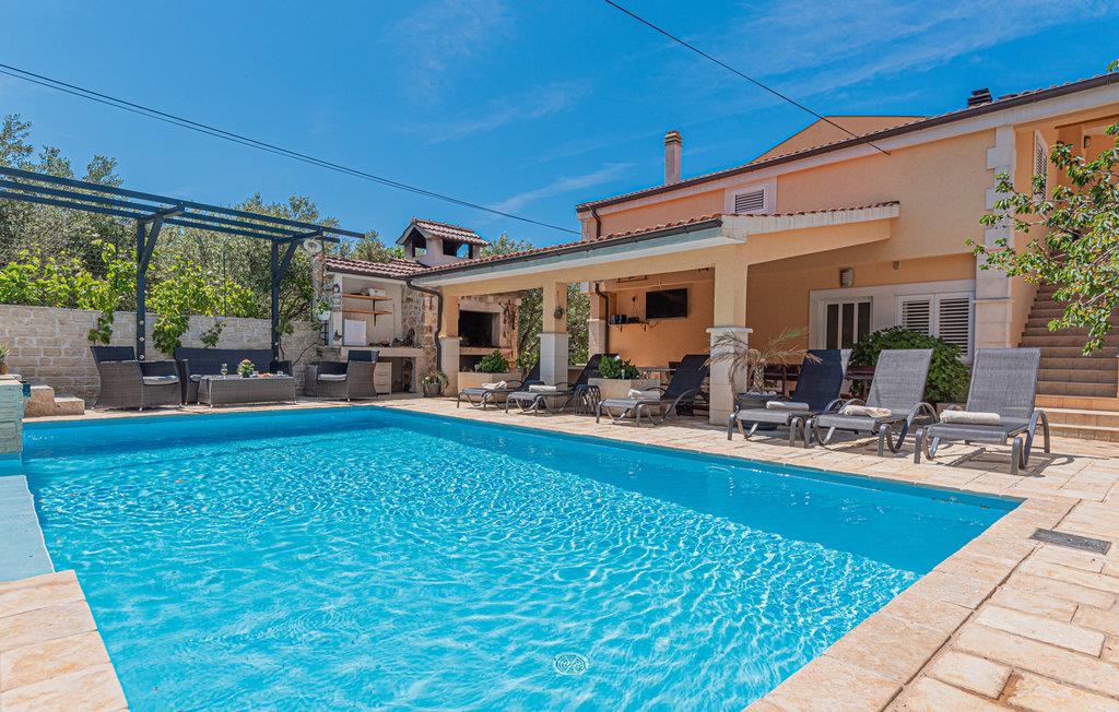 Dette komfortable feriehuset ligger i den lille turistlandsbyen Brodarica. Det er funksjonelt innredet og består av tre separate leiligheter fordelt på to etasjer og forbundet med utvendige trapper. På den smakfullt møblerte, inngjerdede gårdsplassen er det et romslig basseng, som deles med husets eier og gjestene i leilighet CDJ828. På den store og romslige terrassen i andre etasje er det et boblebad hvor du kan slappe av etter en dag med sightseeing.