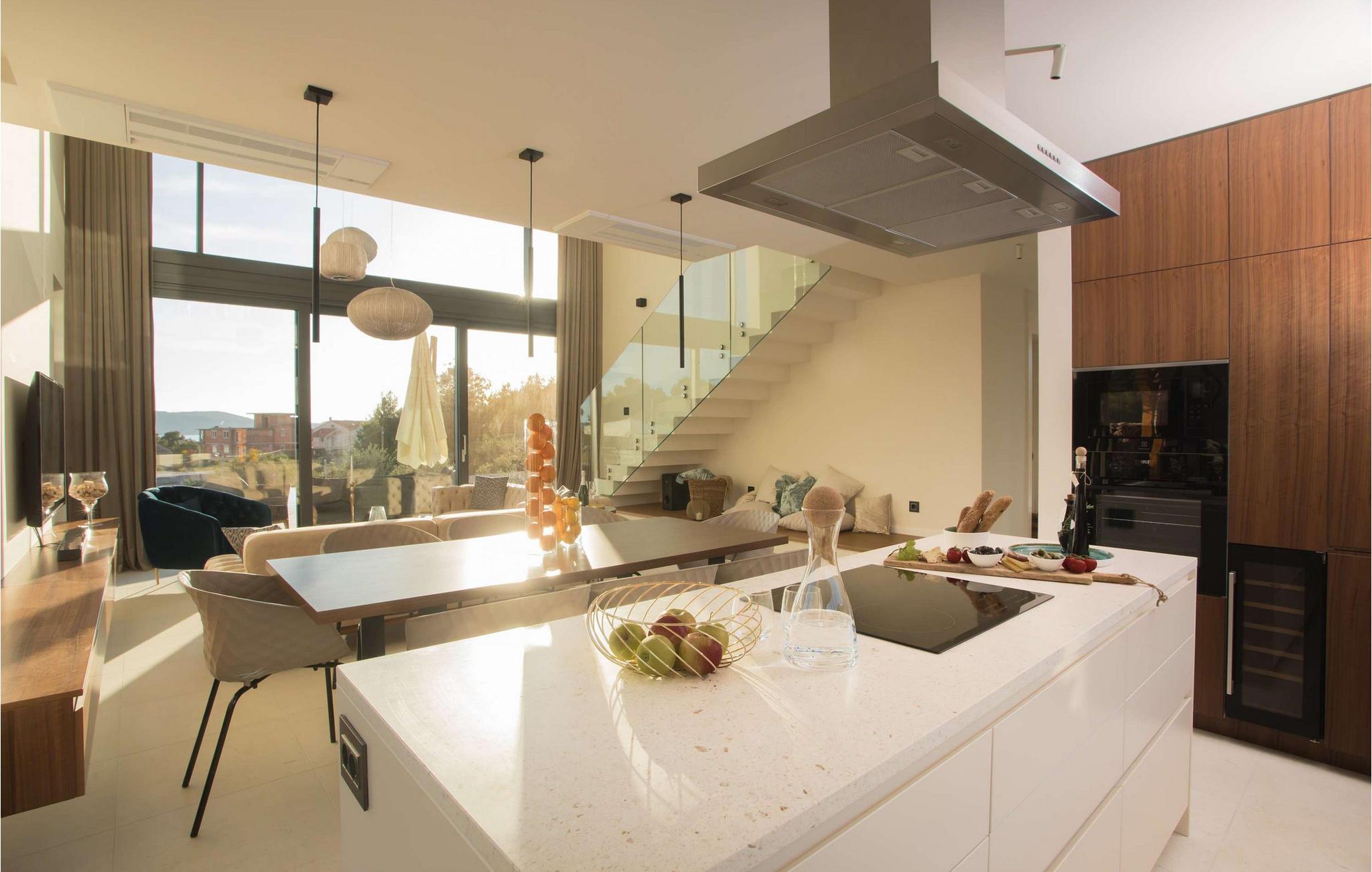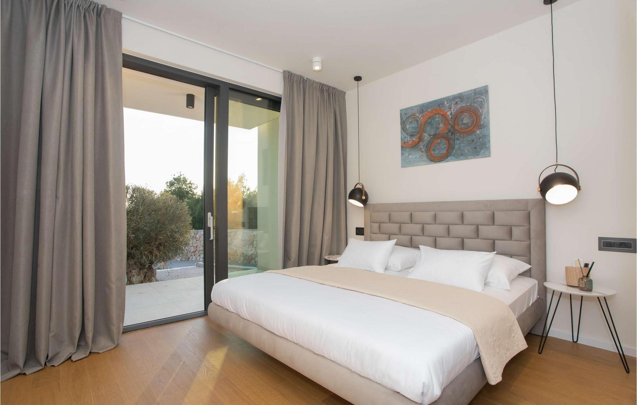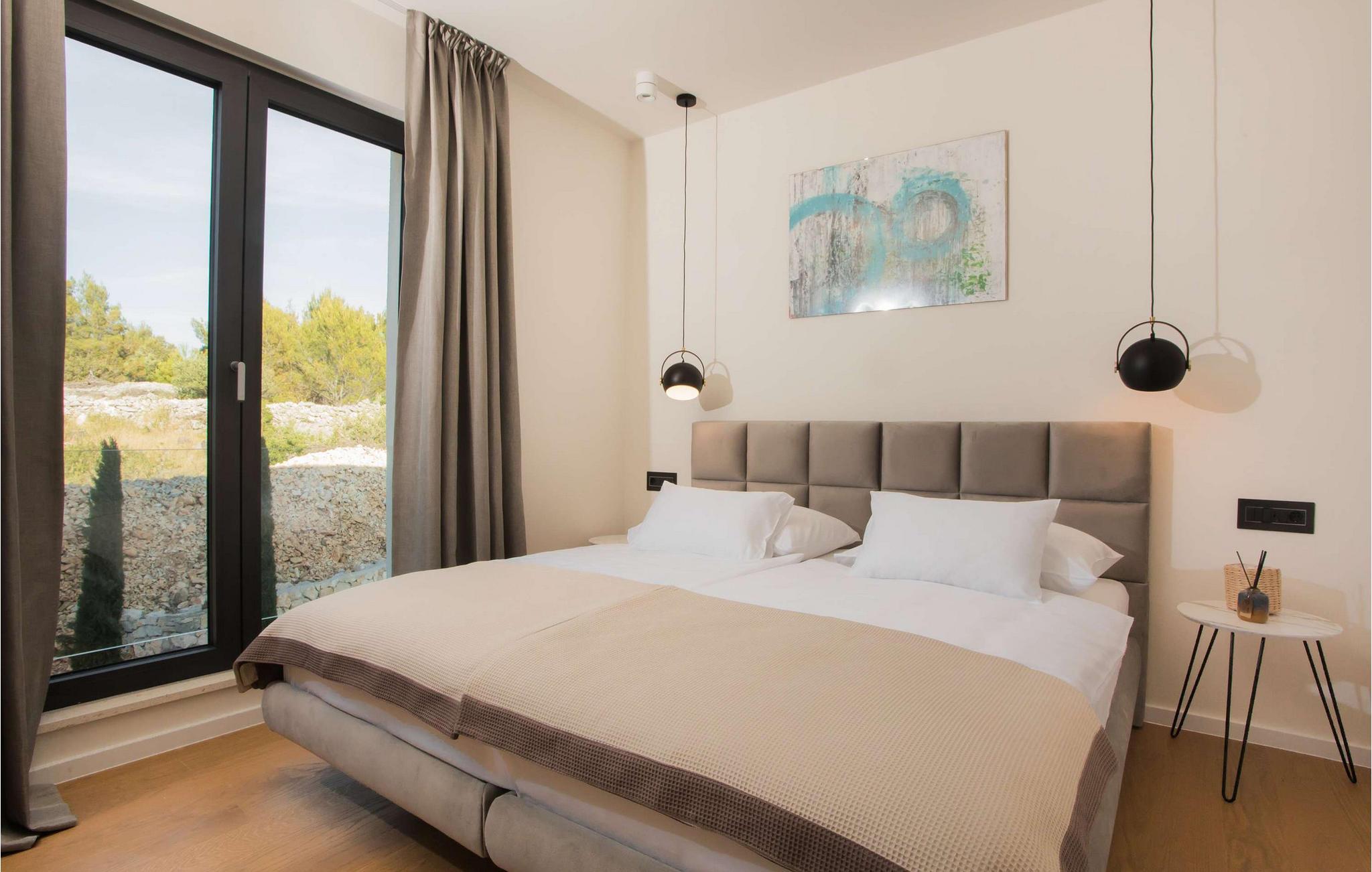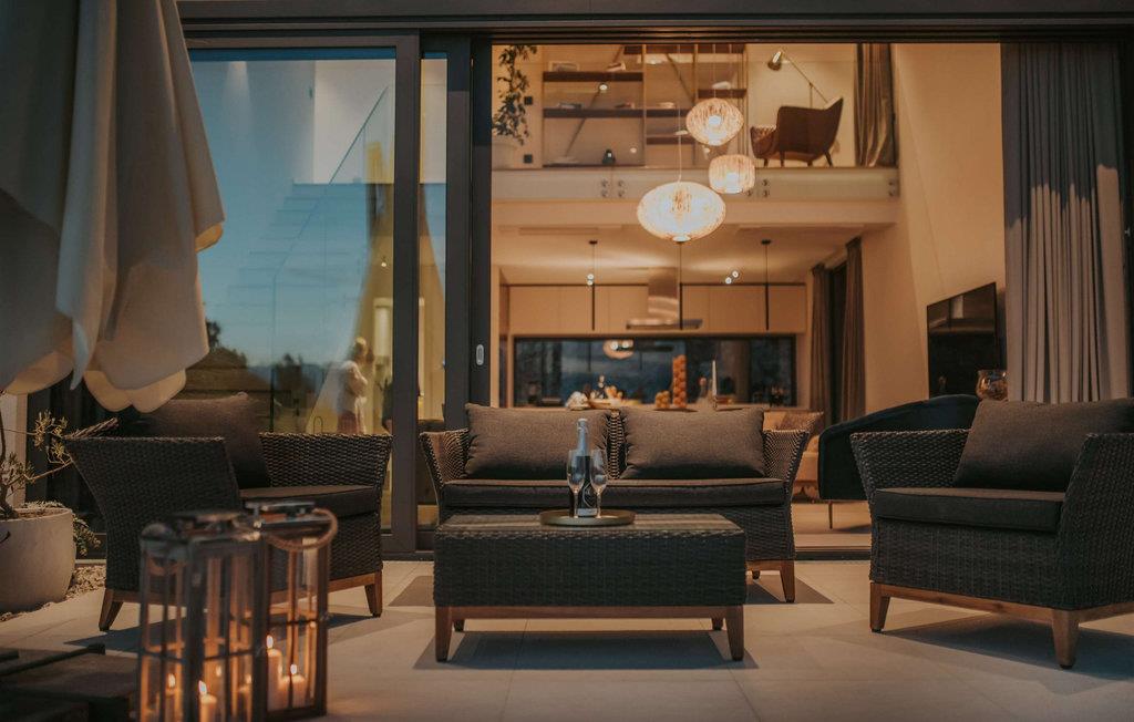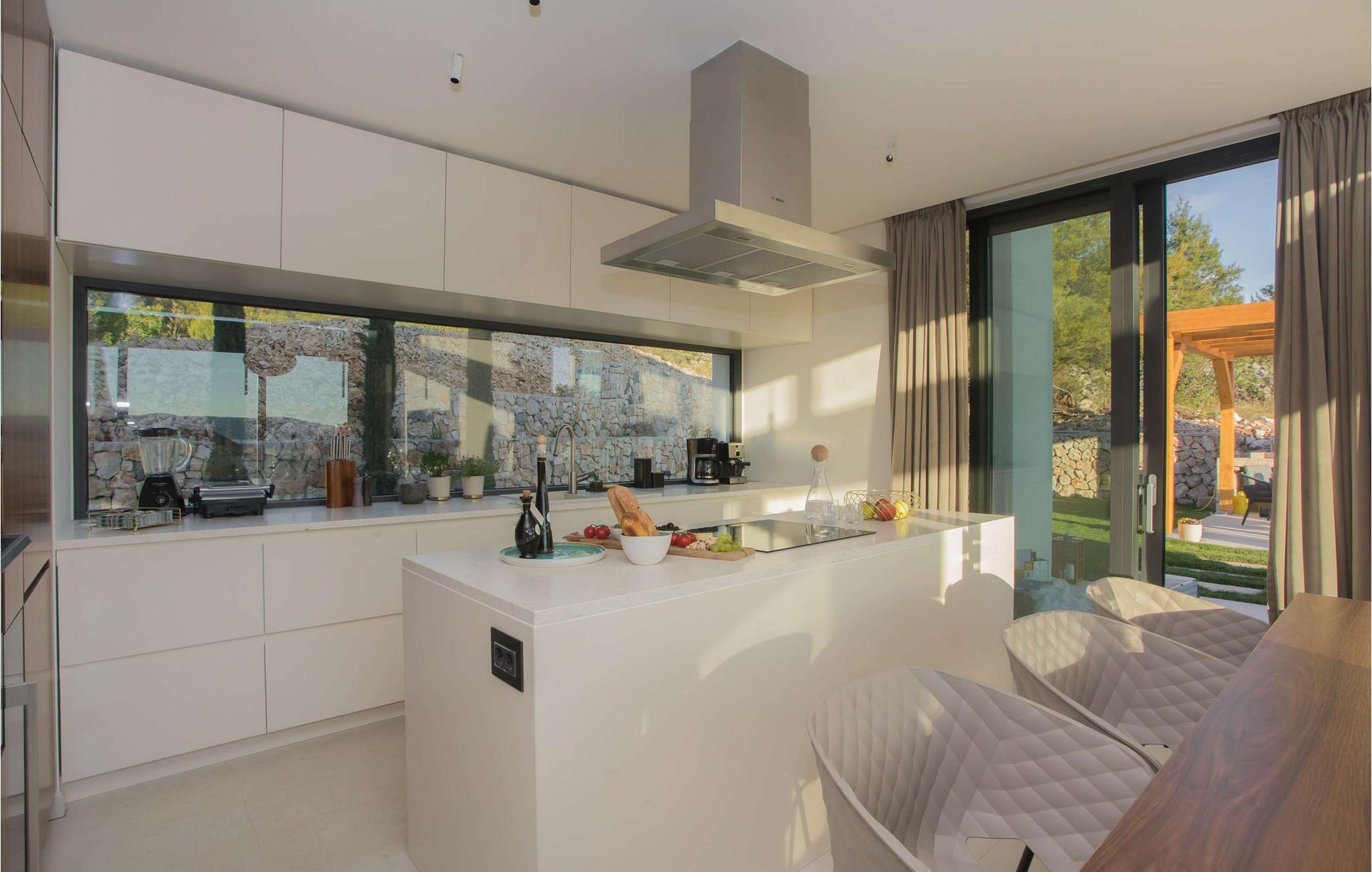 Den fantastiske Villa Maris ønsker deg velkommen bare en spasertur fra kysten og skjemmer deg bort med komfort på høyeste nivå og et romslig, stilfullt møblert interiør. Store vindusflater gir interiøret rikelig med naturlig dagslys og en fantastisk utsikt over havet og øyene. Gled deg til hyggelig matlaging i det fullt utstyrte, minimalistiske kjøkkenet og harmoniske måltider i en unik atmosfære. Etter en begivenhetsrik dag kan du slå av en prat i den innbydende stuen eller trekke deg tilbake til favorittstedet ditt med en god bok.