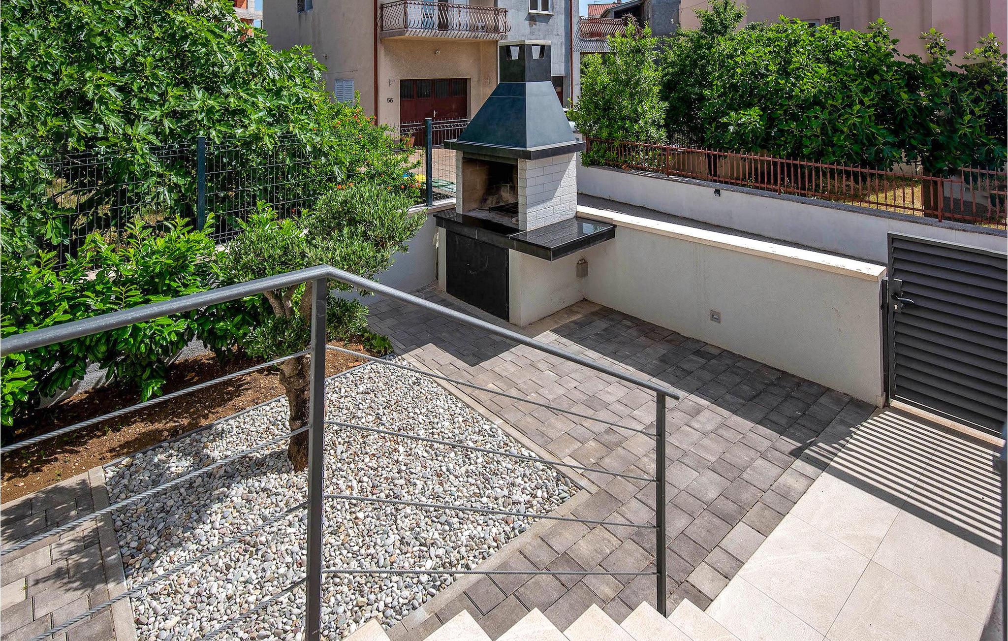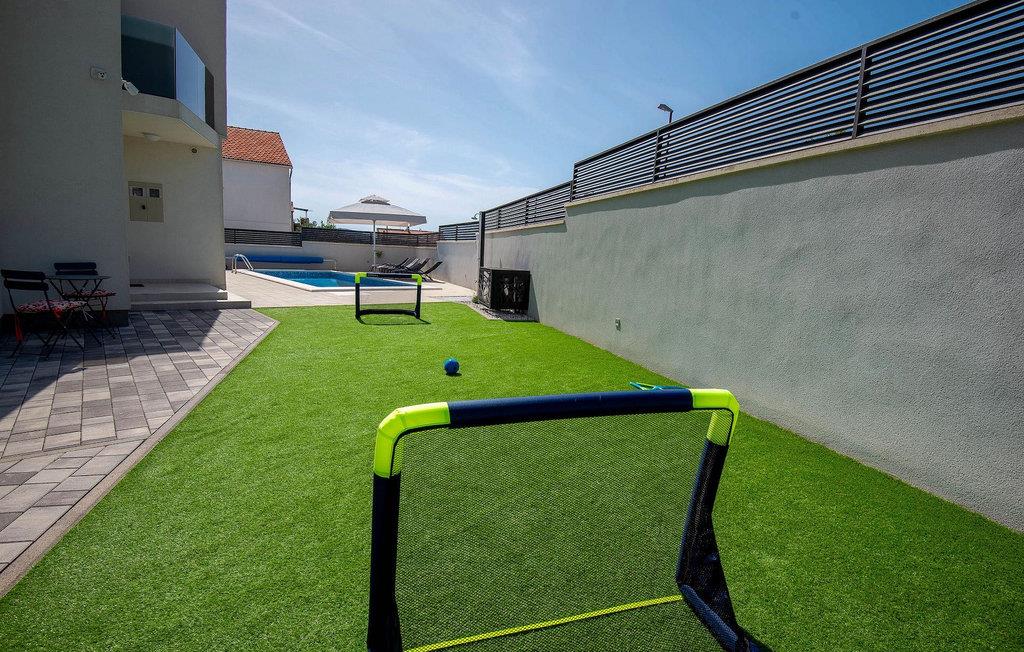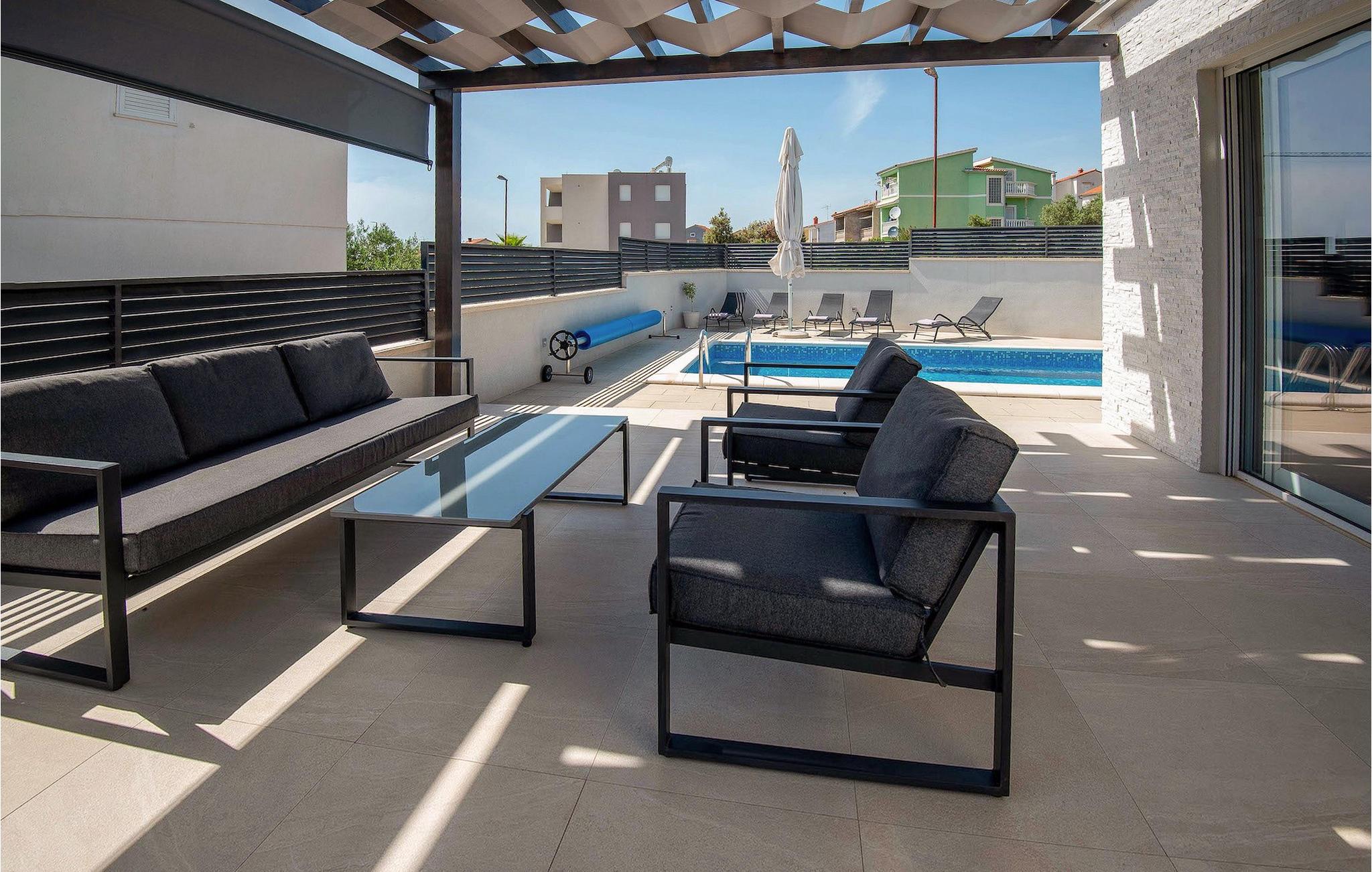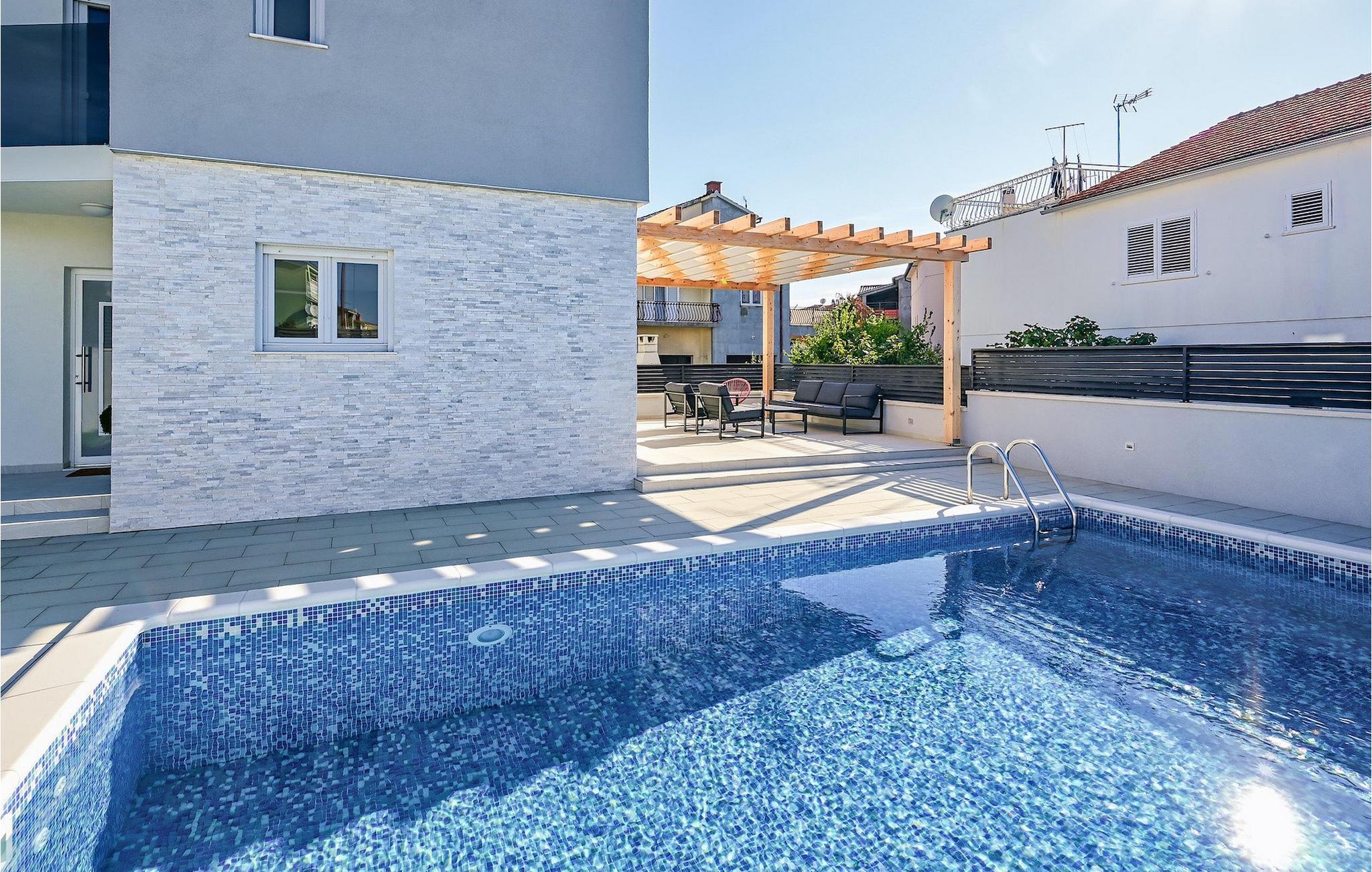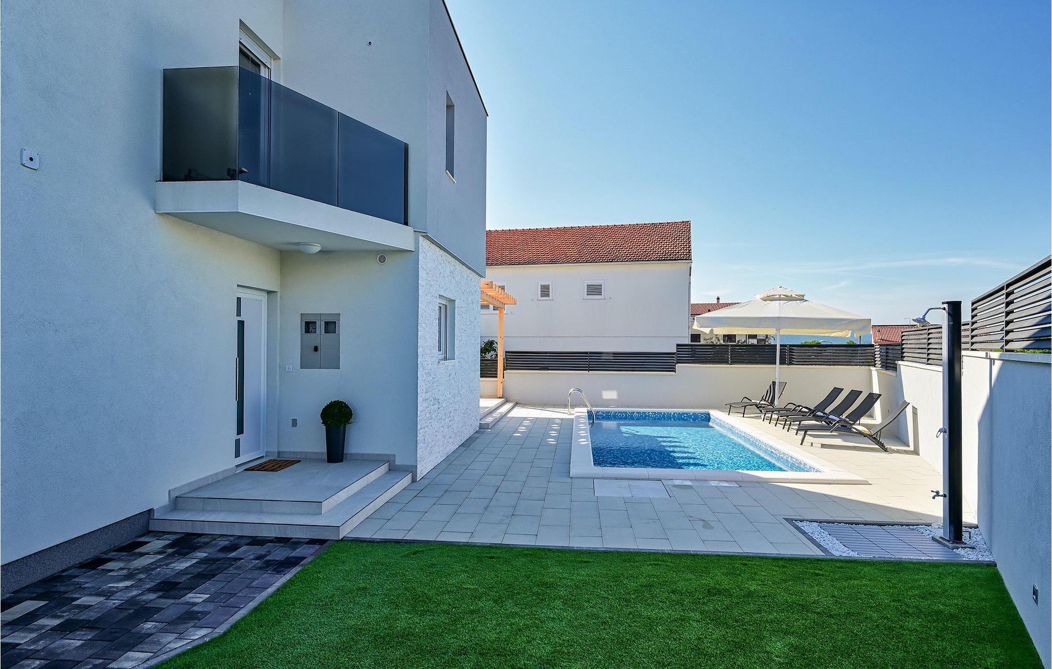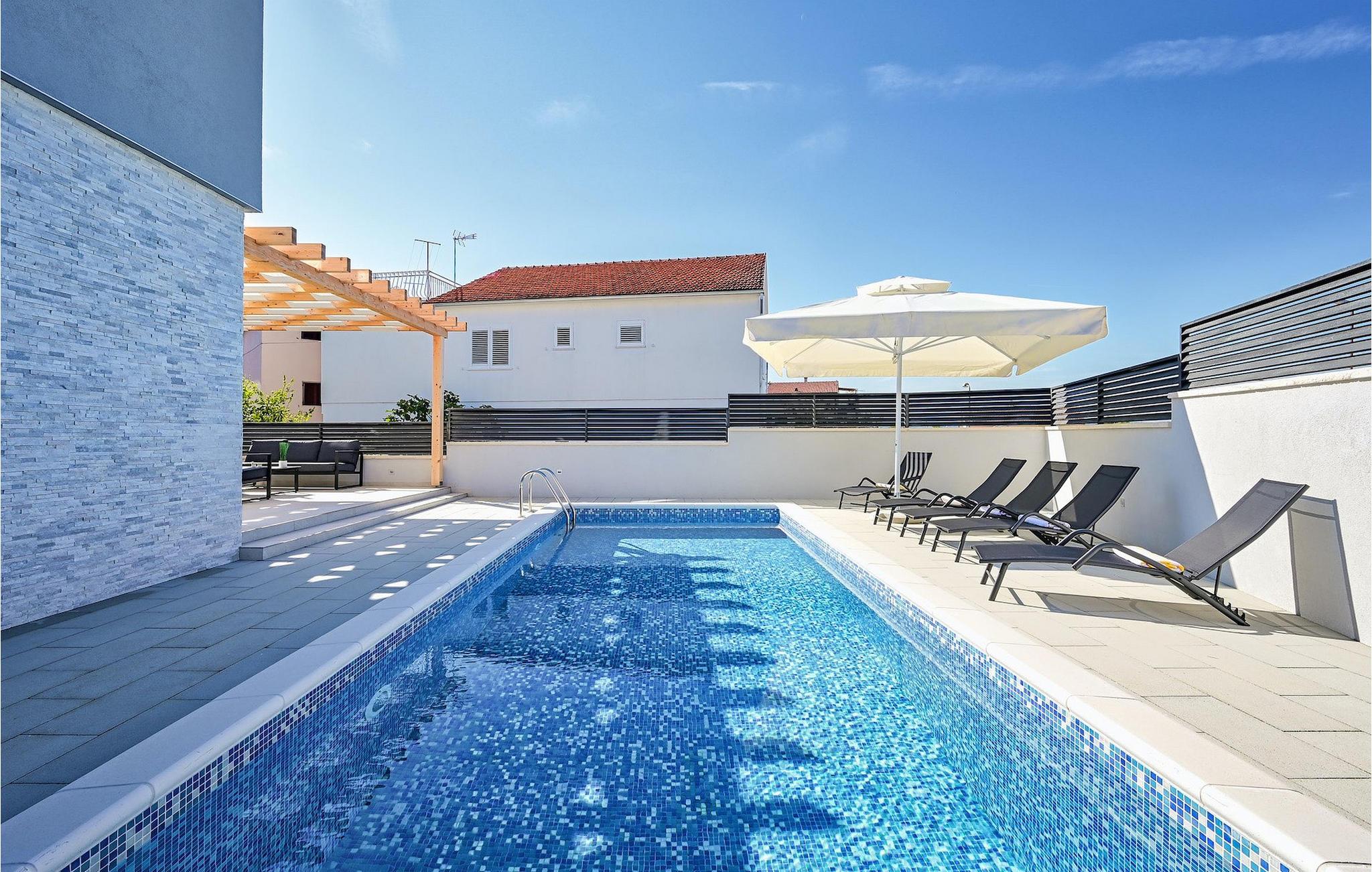 Fra første etasje har du direkte utgang til den inngjerdede hagen med privat basseng, grill og et herlig loungeområde. Det private bassenget er ideelt for forfriskninger på solfylte dager, omgitt av mange solsenger hvor du kan slappe av og sole deg mens barna leker. Ved siden av bassenget kan du også tilberede deilige måltider på grillen og nyte dem sammen med venner og familie.Brodarica er en ekte ferieoase på Sibenik-rivieraen. Den lille byen har en 4 km lang kystlinje med rullesteinstrender, butikker, restauranter og kafeer. Brodarica-stranden er en moderne, velutstyrt familiestrand med alle nødvendige fasiliteter. Stranden har blant annet sandvolleyballbane, lekeplass, utendørs treningsutstyr, basketballbane og strandpromenade.